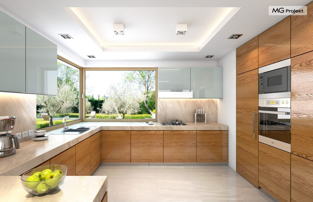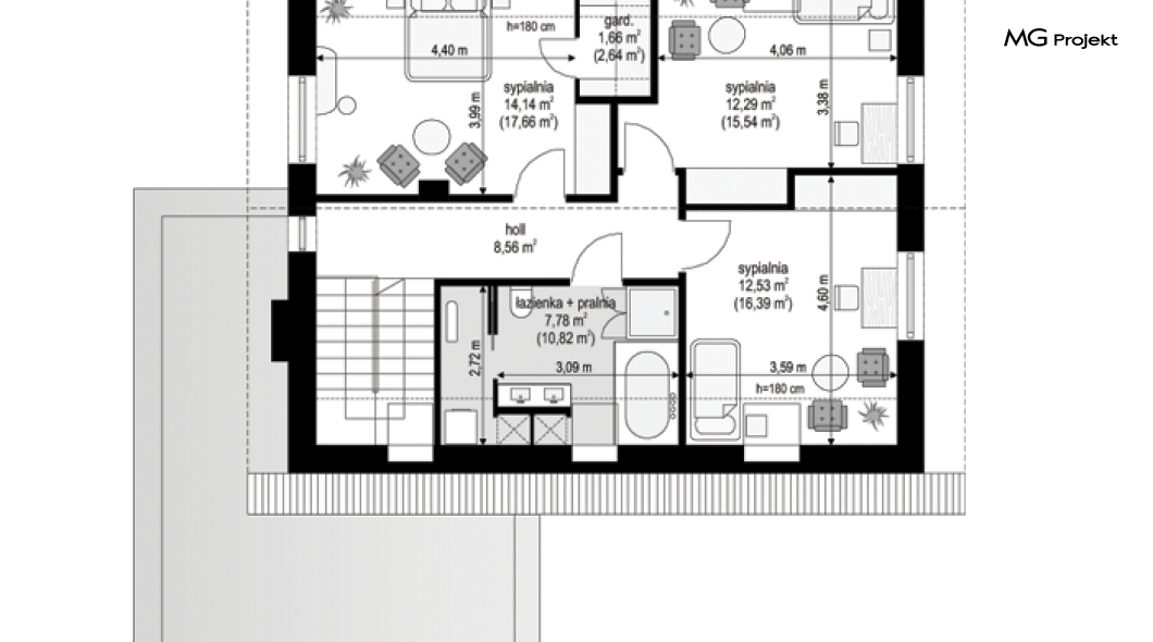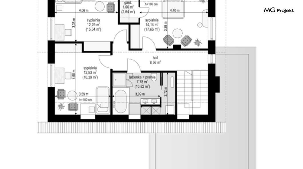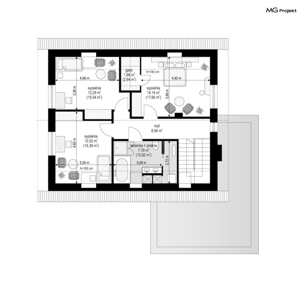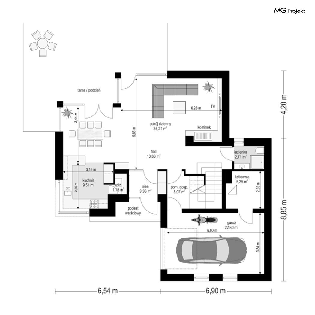 Projekt domu Viking 2 jest jednym z projektów z serii domów "Viking" - pomniejszoną wersją ze zwężoną bryłą główną i pojedynczym garażem. Budynek zaprojektowano na planie prostokąta, przykrytego dwuspadowym symetrycznym dachem, z dobudowanym parterowym garażem. Prosta nowoczesna architektura idzie w parze z funkcjonalnie zaprojektowanym wnętrzem. Front domu zaakcentowano szerokimi drzwiami wejściowym z bocznym naświetlem, umieszczonymi w podcieniu wejściowym, oraz narożnym dużym oknem kuchennym. Drzwi garażowe z boku pozwalają na stworzenie urokliwego placyku wjazdowego przed domem. Co więcej : dzięki temu projekt domu Viking 2 nadaje się zarówno na działkę z wjazdem od północy, jak i od strony południowej ( bramą garażową do drogi ). Podział elewacji na poziome pasy, okładziny z drewna i z płyt włókowo-cementowych urozmaicają sylwetkę domu. Od strony ogrodowej zaprojektowano duże przeszklenie z salonu i z jadalni, otwierające część dzienną na ogród, oraz ładny podcień zadaszający częściowo taras ogrodowy. Wnętrze : na parterze zaprojektowaliśmy jednoprzestrzenną powierzchnię z połączonych pomieszczeń salonu, jadalni, holu i kuchni ze spiżarnią. Przy schodach przechodzimy do części gospodarczej, z magazynem, kotłownią i garażem. Na poddaszu mamy trzy ładne sypialnie ( w tym sypialnię rodziców z garderobą ), oraz łazienkę z kącikiem na pralnię. Dom choć niewielki jest bardzo funkcjonalny. Projekt domu Viking 2 będzie wygodnym miejscem do życia dla 3-5cioosobowej rodziny. Prosta konstrukcja budynku, łatwa zwarta bryła bez żadnych udziwnień, nowoczesne technologie i dobre ocieplenia dają energooszczędny, niedrogi w budowie i późniejszym utrzymaniu dom. Pracownia oferuje też wersję domu w odbiciu lustrzanym, wersję bazową (projekt domu Viking), wersję najmniejszą bez garażu (projekt domu Viking 3), wersję o pow. użytkowej: 156.1 m2 (projekt domu Viking 4), oraz wersję największą (projekt domu Viking 5). Vikinga można bardzo łatwo dostosować do standardu NF40. Zapraszamy.