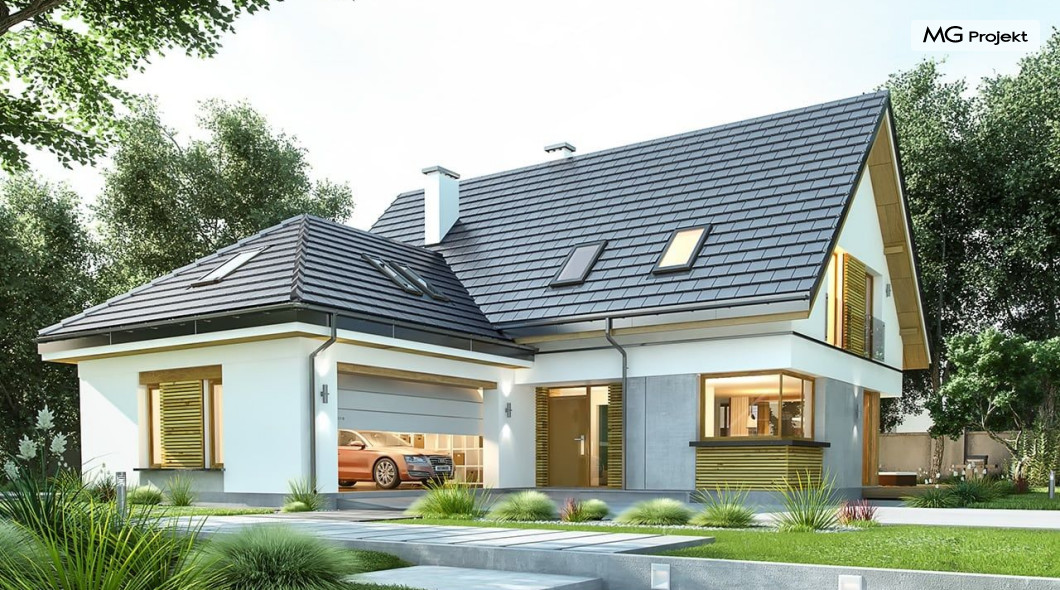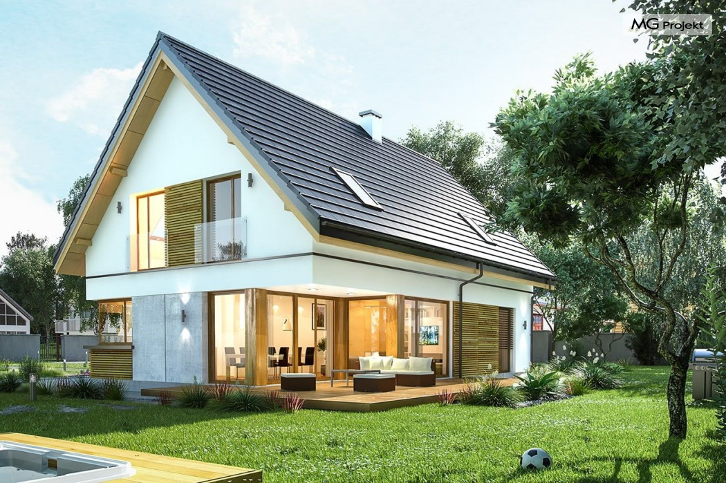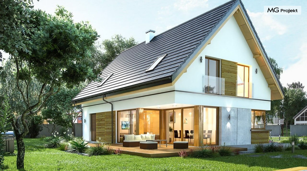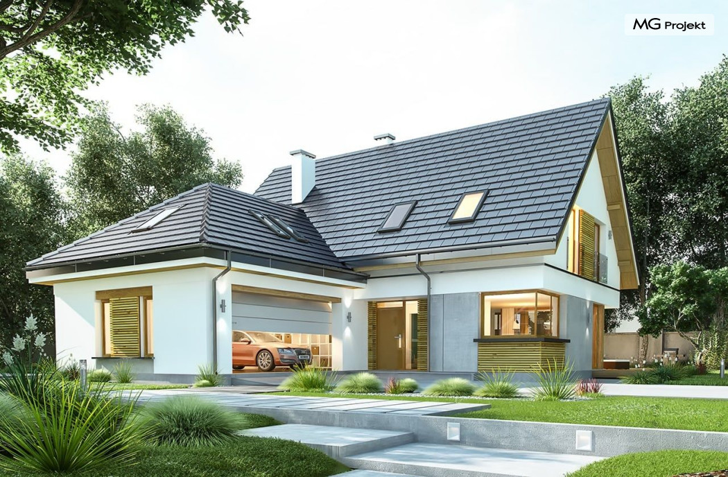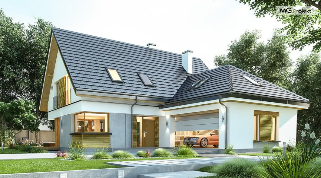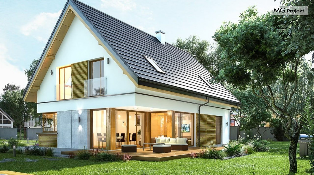 Projekt domu Viking 4 to jeden z naszych domów z kolekcji „Viking” - tym razem nieco powiększony w stosunku do bazowego projektu, z zadaszeniem nad garażem i poszerzoną bryłą. Parterowy dom z poddaszem użytkowym, zbudowany na planie prostokąta przykrytego dwuspadowym dachem, z garażem przykrytym trzyspadowym zadaszeniem. Budynek zaprojektowano jako wygodne miejsce do życia dla 4-6 osobowej rodziny. Nowoczesna architektura domu z atrakcyjną sylwetką idzie tutaj w parze z funkcjonalnym, komfortowym wnętrzem. Bryłę ozdobiono okładzinami ścian z drewna i płyt włóknowo-cementowych i wprowadzono podział na poziome pasy elewacji, co wprowadza ład, porządek i właściwe proporcje. Szerokie przeszklenia otwierają wnętrze domu na ogród i podkreślają nowoczesny design. Front domu zaakcentowano podcieniem wejściowym z szerokimi drzwiami z naświetlem, oraz narożnym oknem kuchennym. Kształt bryły tworzy frontowy reprezentacyjny placyk wjazdowy. Od strony ogrodu mamy piękne przeszklenia salonu i jadalni, oraz wygodny podcień zadaszający częściowo taras. Wnętrze : do domu wchodzimy przeszklonym, otwartym wizualnie przedsionkiem wprost do części dziennej holu, salonu i jadalni. Obok jadalni mieści się ładna kuchnia ze spiżarką. Z drugiej strony na parterze mamy dodatkowy pokój ( gabinet, lub sypialnię gościnną ), łazienkę, schody, oraz przejście do części gospodarczej, a tam z kolei : magazyn, kotłownię i podwójny garaż. Na poddasz domu Viking 4 zaprojektowano trzy przestronne sypialnie, z garderobami i szafami wbudowanymi, dwie łazienki, oraz pralnię. Sypialnia rodziców to oddzielny apartament z garderobami i łazienką. Z podestu schodów wchodzimy na strych nad garażem, mogący pełnić rolę domowego magazynu, albo dodatkowego pokoju. Prosta bryła, dość łatwa w budowie, oraz energooszczędne rozwiązania materiałów i ociepleń dają w rezultacie ekonomiczny budynek – zarówno w budowie jak i późniejszej eksploatacji. Przede wszystkim Projekt domu Viking 4 jest jednak urokliwym, nowoczesnym i komfortowym domem dla swoich przyszłych mieszkańców. W ofercie dostępne są również inne wersje tego projektu: wersja podstawowa (projekt domu Viking), z garażem jednostanowiskowym (projekt domu Viking 2), najmniejsza (projekt domu Viking 3), komfortowa (projekt domu Viking5) Vikinga 4 można łatwo dostosować do standardu NF40. Zapraszamy.