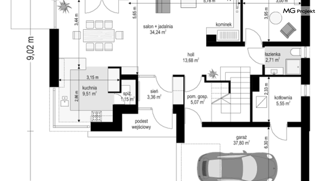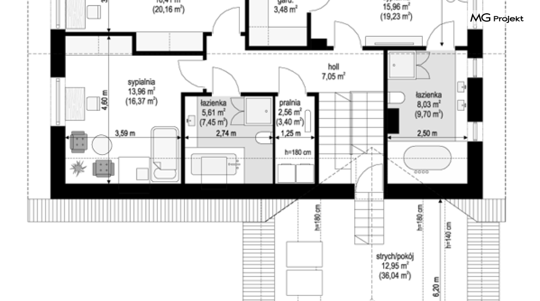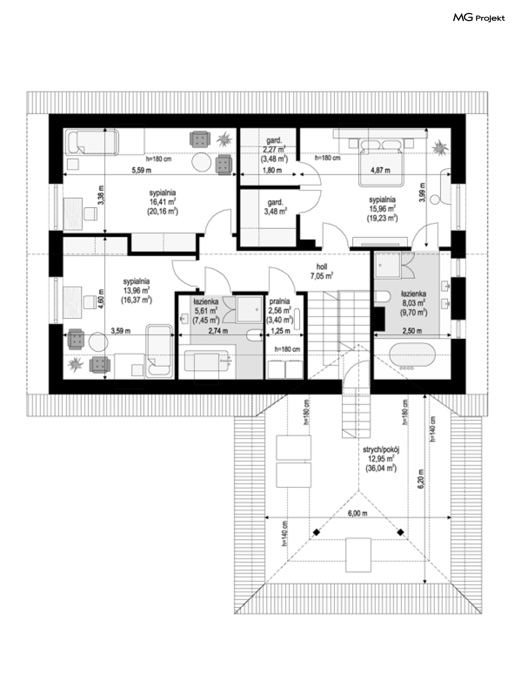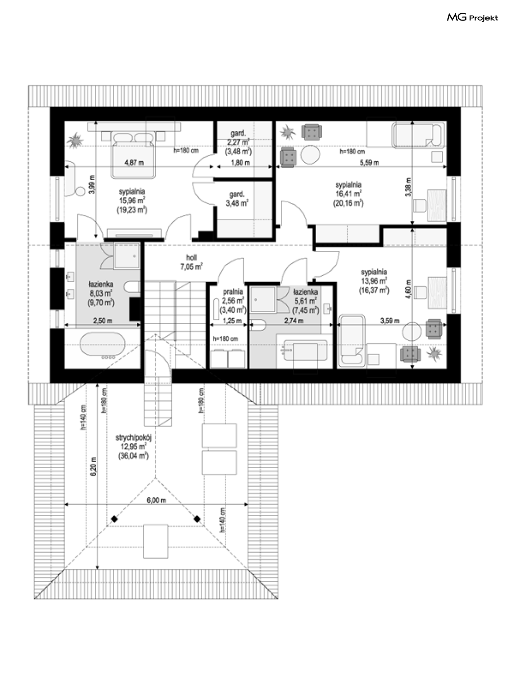 Projekt domu Viking 4 to jeden z naszych domów z kolekcji „Viking” - tym razem nieco powiększony w stosunku do bazowego projektu, z zadaszeniem nad garażem i poszerzoną bryłą. Parterowy dom z poddaszem użytkowym, zbudowany na planie prostokąta przykrytego dwuspadowym dachem, z garażem przykrytym trzyspadowym zadaszeniem. Budynek zaprojektowano jako wygodne miejsce do życia dla 4-6 osobowej rodziny. Nowoczesna architektura domu z atrakcyjną sylwetką idzie tutaj w parze z funkcjonalnym, komfortowym wnętrzem. Bryłę ozdobiono okładzinami ścian z drewna i płyt włóknowo-cementowych i wprowadzono podział na poziome pasy elewacji, co wprowadza ład, porządek i właściwe proporcje. Szerokie przeszklenia otwierają wnętrze domu na ogród i podkreślają nowoczesny design. Front domu zaakcentowano podcieniem wejściowym z szerokimi drzwiami z naświetlem, oraz narożnym oknem kuchennym. Kształt bryły tworzy frontowy reprezentacyjny placyk wjazdowy. Od strony ogrodu mamy piękne przeszklenia salonu i jadalni, oraz wygodny podcień zadaszający częściowo taras. Wnętrze : do domu wchodzimy przeszklonym, otwartym wizualnie przedsionkiem wprost do części dziennej holu, salonu i jadalni. Obok jadalni mieści się ładna kuchnia ze spiżarką. Z drugiej strony na parterze mamy dodatkowy pokój ( gabinet, lub sypialnię gościnną ), łazienkę, schody, oraz przejście do części gospodarczej, a tam z kolei : magazyn, kotłownię i podwójny garaż. Na poddasz domu Viking 4 zaprojektowano trzy przestronne sypialnie, z garderobami i szafami wbudowanymi, dwie łazienki, oraz pralnię. Sypialnia rodziców to oddzielny apartament z garderobami i łazienką. Z podestu schodów wchodzimy na strych nad garażem, mogący pełnić rolę domowego magazynu, albo dodatkowego pokoju. Prosta bryła, dość łatwa w budowie, oraz energooszczędne rozwiązania materiałów i ociepleń dają w rezultacie ekonomiczny budynek – zarówno w budowie jak i późniejszej eksploatacji. Przede wszystkim Projekt domu Viking 4 jest jednak urokliwym, nowoczesnym i komfortowym domem dla swoich przyszłych mieszkańców. W ofercie dostępne są również inne wersje tego projektu: wersja podstawowa (projekt domu Viking), z garażem jednostanowiskowym (projekt domu Viking 2), najmniejsza (projekt domu Viking 3), komfortowa (projekt domu Viking5) Vikinga 4 można łatwo dostosować do standardu NF40. Zapraszamy.