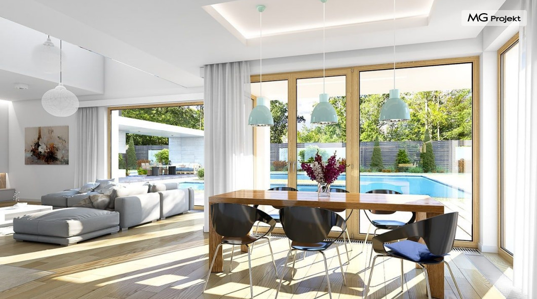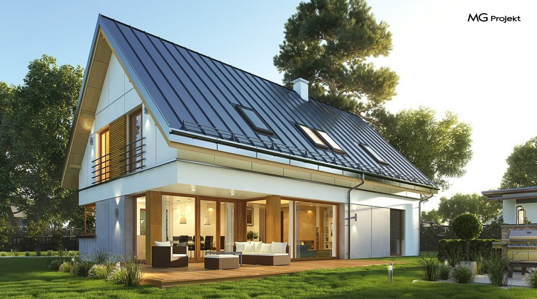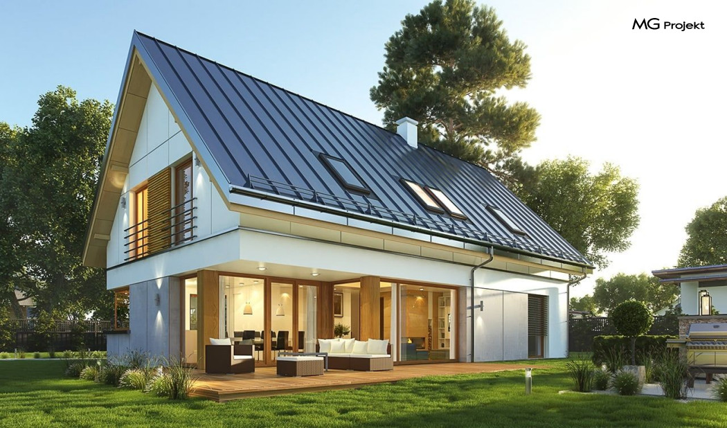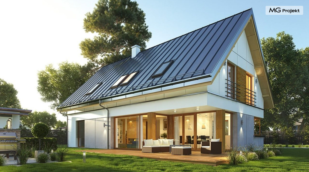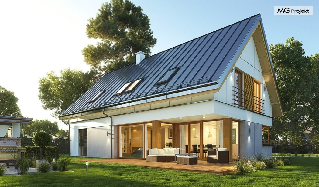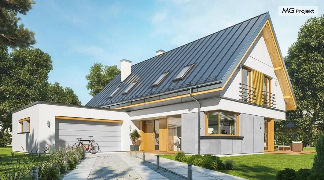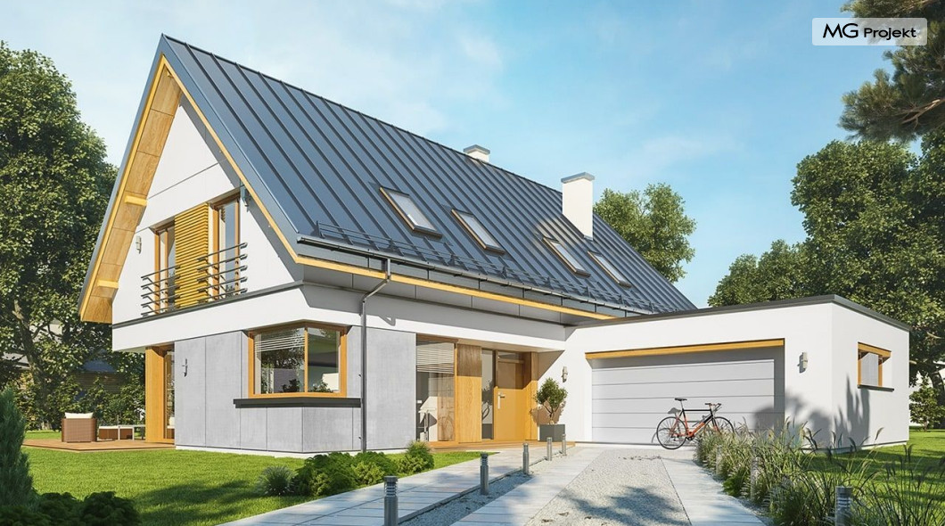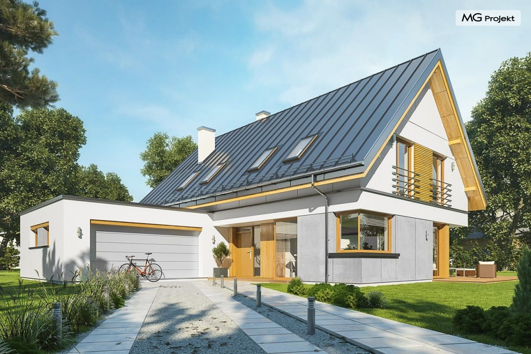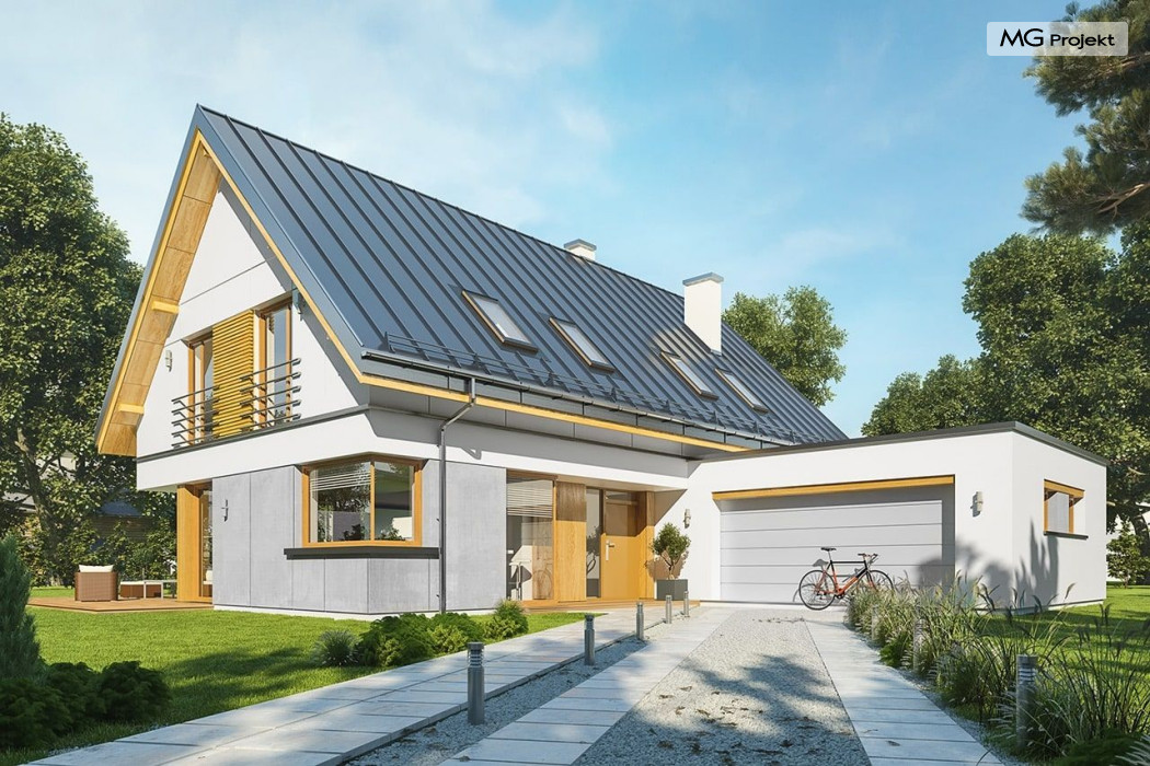 Projekt domu Viking 5 jest powiększoną wersją projektu z serii „Viking”, o wydłużonej bryle głównej, z większym salonem i pustką z antresolą nad częścią dzienną. Jest superkomfortową propozycją domu dla 4-6 osobowej rodziny - nowoczesnego, funkcjonalnego, o bardzo atrakcyjnej sylwetce i wnętrzu. Projekt domu Viking 5 został poszerzony w stosunku do bazowego projektu, przez co wygląda bardziej reprezentacyjnie i okazale. To komfortowa nowoczesna willa, z ciekawymi materiałami i detalami, oraz pięknymi szerokimi przeszkleniami otwierającymi wnętrze na ogród. Zastosowane materiały : pokrycie dachu z blachy na rąbek, okładziny ścian z drewna czy płyt włóknowo-cementowych, oraz podział elewacji na poziome pasy, dają atrakcyjny wygląd zewnętrzny budynku. Wnętrze : do domu wchodzimy przeszklonym otwartym przedsionkiem wprost do pokoju dziennego, łączącego hol, salon i jadalnię. Przed nami, dzięki szerokim oknom otwiera się od razu widok na ogród i taras. Dodatkowo atrakcyjności wnętrza dodaje pustka nad salonem z antresolą na poddaszu. Przy jadalni mamy ładną ustawną kuchnię ze spiżarnią, a z drugiej strony parteru dodatkowy pokój, łazienkę i pomieszczenia gospodarcze z garażem. Na poddaszu zaprojektowano trzy sypialnie : dwie dziecięce - równej wielkości, z szafami wbudowanymi i łazienką, oraz sypialnię rodziców z dwiema garderobami i własną łazienką. Część rodziców oddziela od części dzieci - jak mostem - pustka nad salonem, antresola, oraz pralnia. Dom nie należy do najmniejszych, ale nie jest też kilkusetmetrową rezydencją. Został zaprojektowany dla Inwestorów, którzy chcą mieszkać maksymalnie komfortowo, nowocześnie, ale nie zamierzają stać się niewolnikami swojego przyszłego domu. Wszystko z umiarem. Projekt domu Viking 5 dostarcza luksusowych doznań, spełnia marzenia, ale za rozsądną cenę. Dostaępna jest także wersja domu w odbiciu lustrzanym, wersja podstawowa (projekt domu Viking), pomniejszona z garażem jednostanowiskowym (projekt domu Viking 2), bez garażu (projekt domu Viking 3), z pomieszczeniem nad garażem ( projekt domu Viking 4). Do tego budynek jest energooszczędny i dość łatwy w budowie. Czego chcieć więcej. Vikinga można łatwo dostosować do standardu NF40. Zapraszamy.
