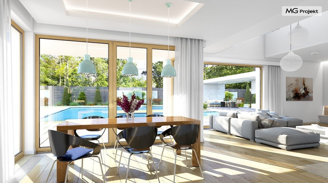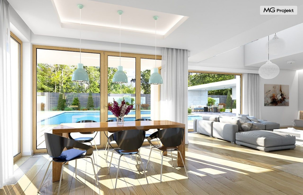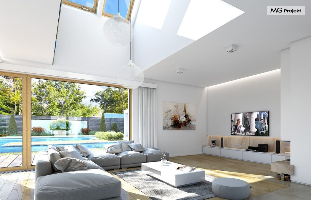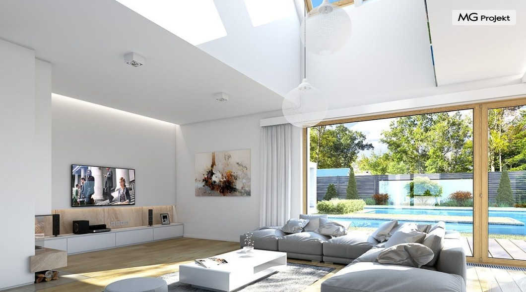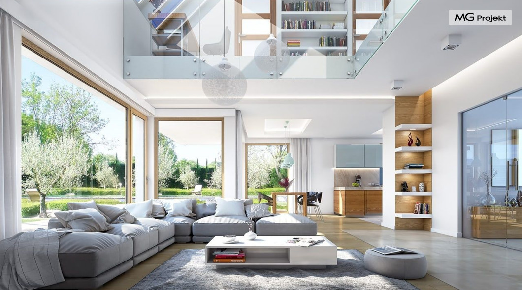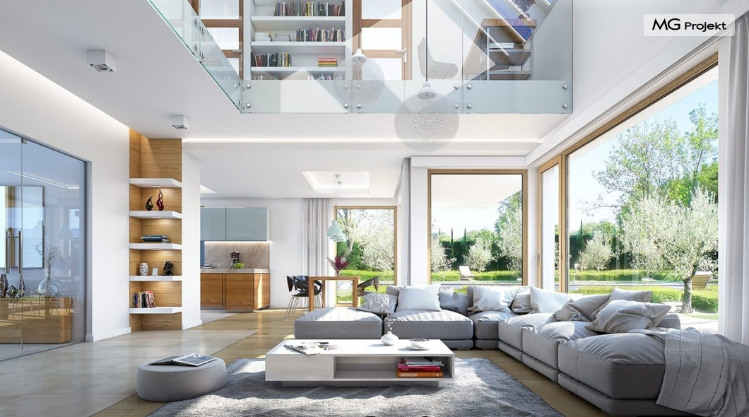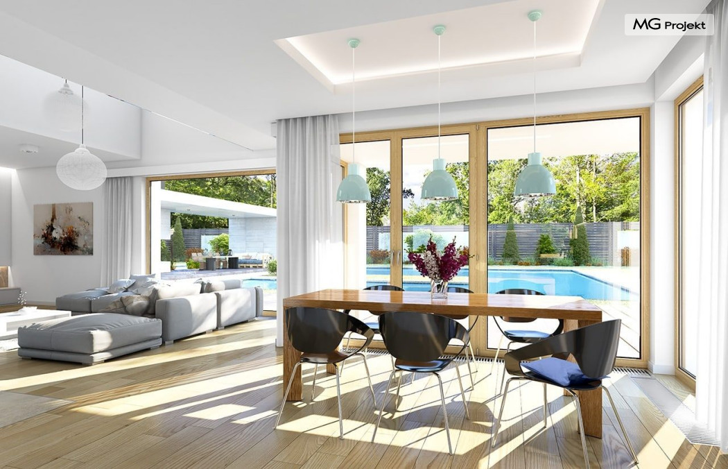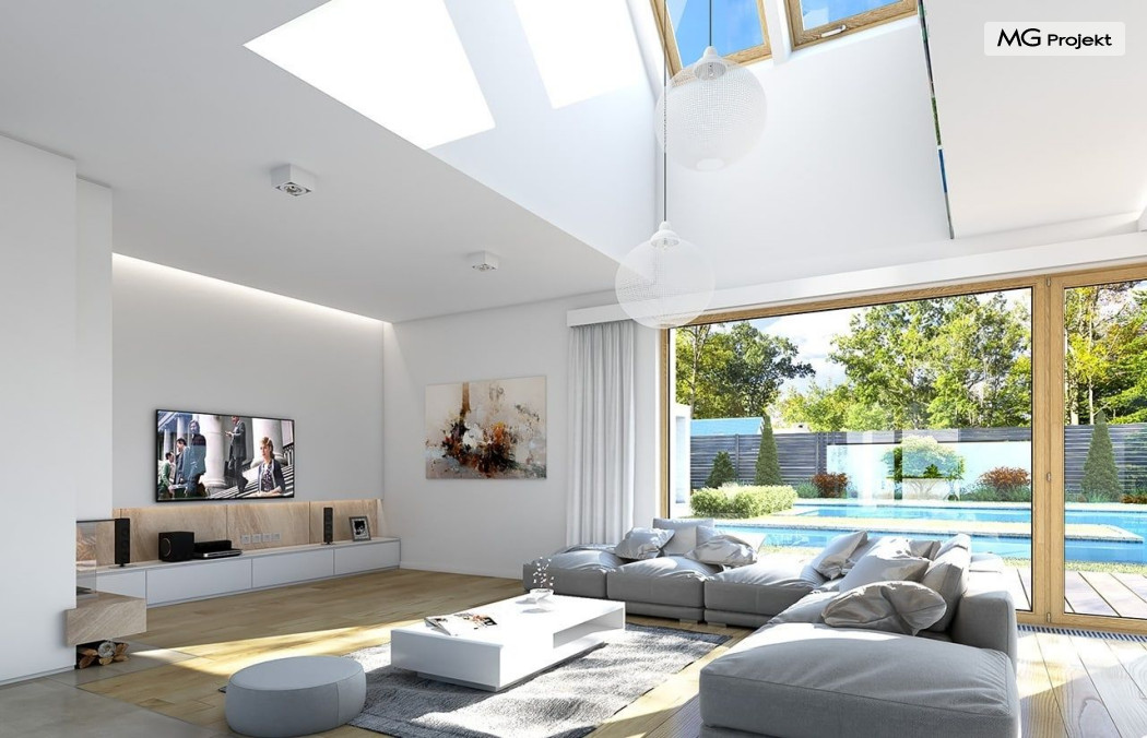 Projekt domu Viking 5 jest powiększoną wersją projektu z serii „Viking”, o wydłużonej bryle głównej, z większym salonem i pustką z antresolą nad częścią dzienną. Jest superkomfortową propozycją domu dla 4-6 osobowej rodziny - nowoczesnego, funkcjonalnego, o bardzo atrakcyjnej sylwetce i wnętrzu. Projekt domu Viking 5 został poszerzony w stosunku do bazowego projektu, przez co wygląda bardziej reprezentacyjnie i okazale. To komfortowa nowoczesna willa, z ciekawymi materiałami i detalami, oraz pięknymi szerokimi przeszkleniami otwierającymi wnętrze na ogród. Zastosowane materiały : pokrycie dachu z blachy na rąbek, okładziny ścian z drewna czy płyt włóknowo-cementowych, oraz podział elewacji na poziome pasy, dają atrakcyjny wygląd zewnętrzny budynku. Wnętrze : do domu wchodzimy przeszklonym otwartym przedsionkiem wprost do pokoju dziennego, łączącego hol, salon i jadalnię. Przed nami, dzięki szerokim oknom otwiera się od razu widok na ogród i taras. Dodatkowo atrakcyjności wnętrza dodaje pustka nad salonem z antresolą na poddaszu. Przy jadalni mamy ładną ustawną kuchnię ze spiżarnią, a z drugiej strony parteru dodatkowy pokój, łazienkę i pomieszczenia gospodarcze z garażem. Na poddaszu zaprojektowano trzy sypialnie : dwie dziecięce - równej wielkości, z szafami wbudowanymi i łazienką, oraz sypialnię rodziców z dwiema garderobami i własną łazienką. Część rodziców oddziela od części dzieci - jak mostem - pustka nad salonem, antresola, oraz pralnia. Dom nie należy do najmniejszych, ale nie jest też kilkusetmetrową rezydencją. Został zaprojektowany dla Inwestorów, którzy chcą mieszkać maksymalnie komfortowo, nowocześnie, ale nie zamierzają stać się niewolnikami swojego przyszłego domu. Wszystko z umiarem. Projekt domu Viking 5 dostarcza luksusowych doznań, spełnia marzenia, ale za rozsądną cenę. Dostaępna jest także wersja domu w odbiciu lustrzanym, wersja podstawowa (projekt domu Viking), pomniejszona z garażem jednostanowiskowym (projekt domu Viking 2), bez garażu (projekt domu Viking 3), z pomieszczeniem nad garażem ( projekt domu Viking 4). Do tego budynek jest energooszczędny i dość łatwy w budowie. Czego chcieć więcej. Vikinga można łatwo dostosować do standardu NF40. Zapraszamy.