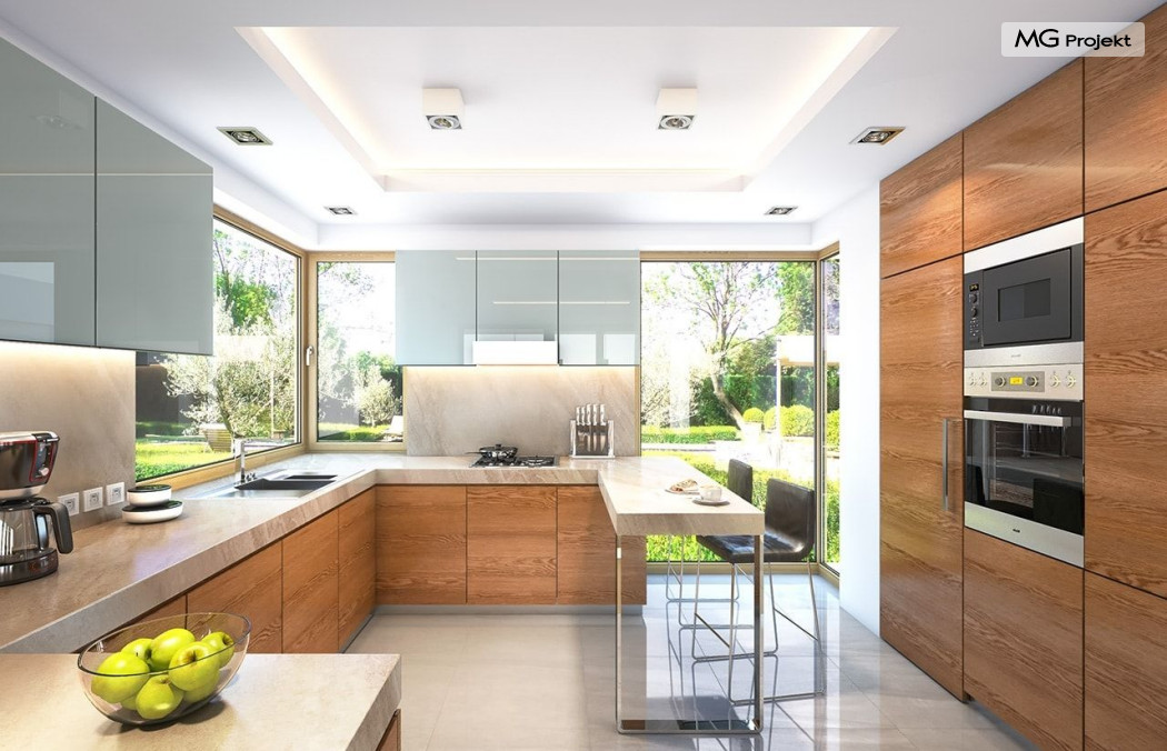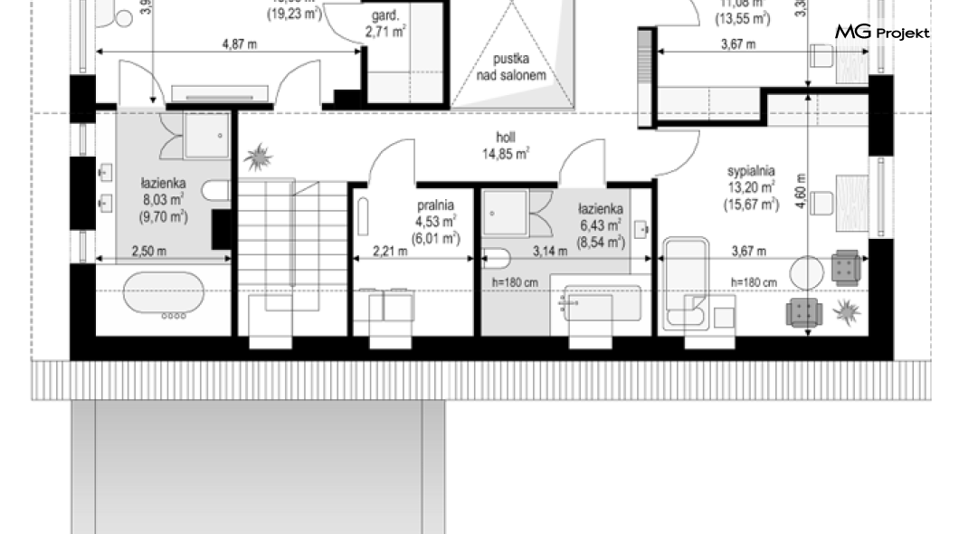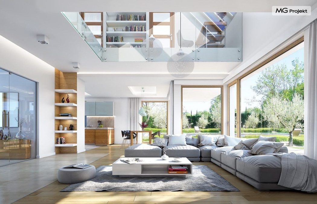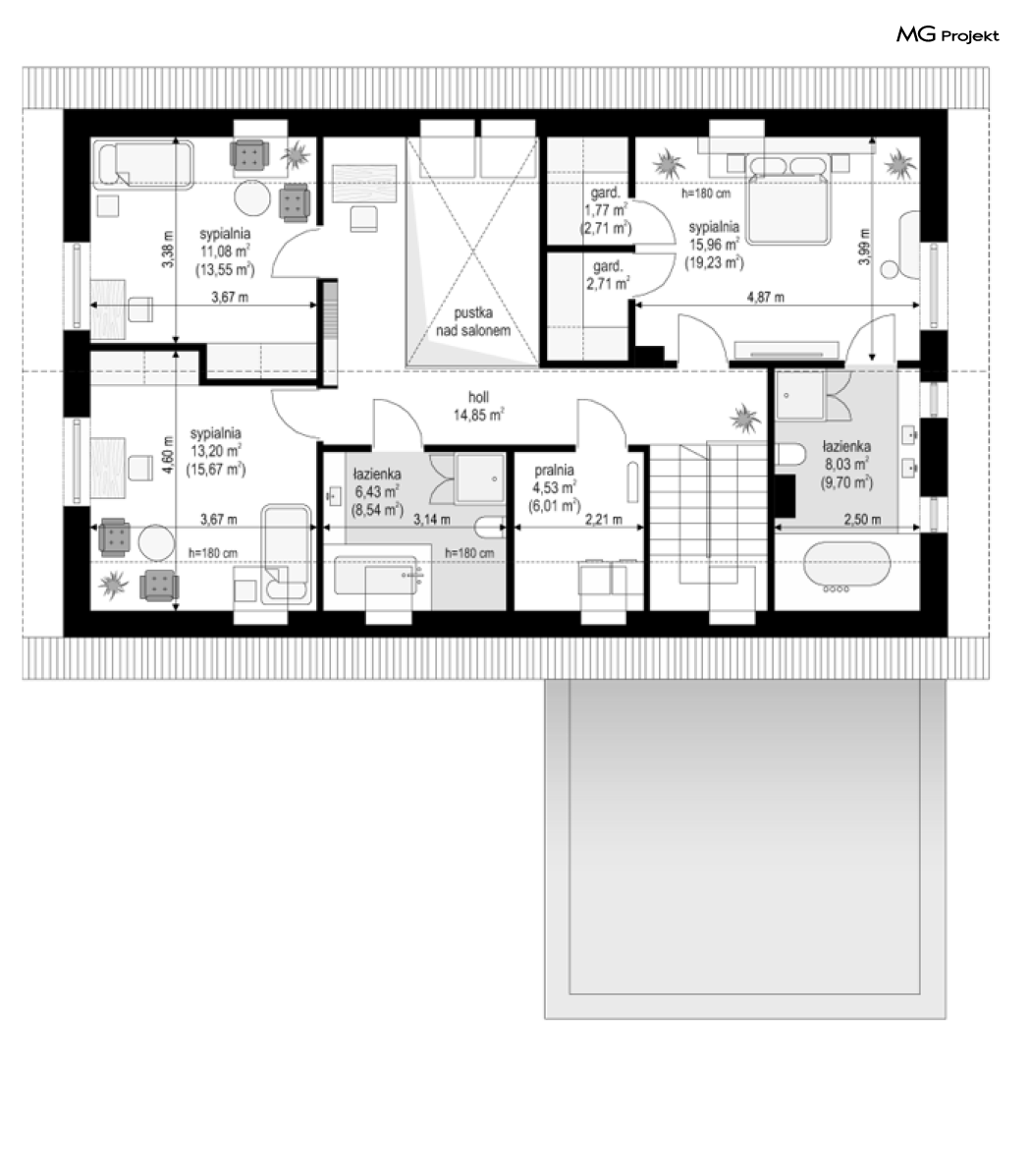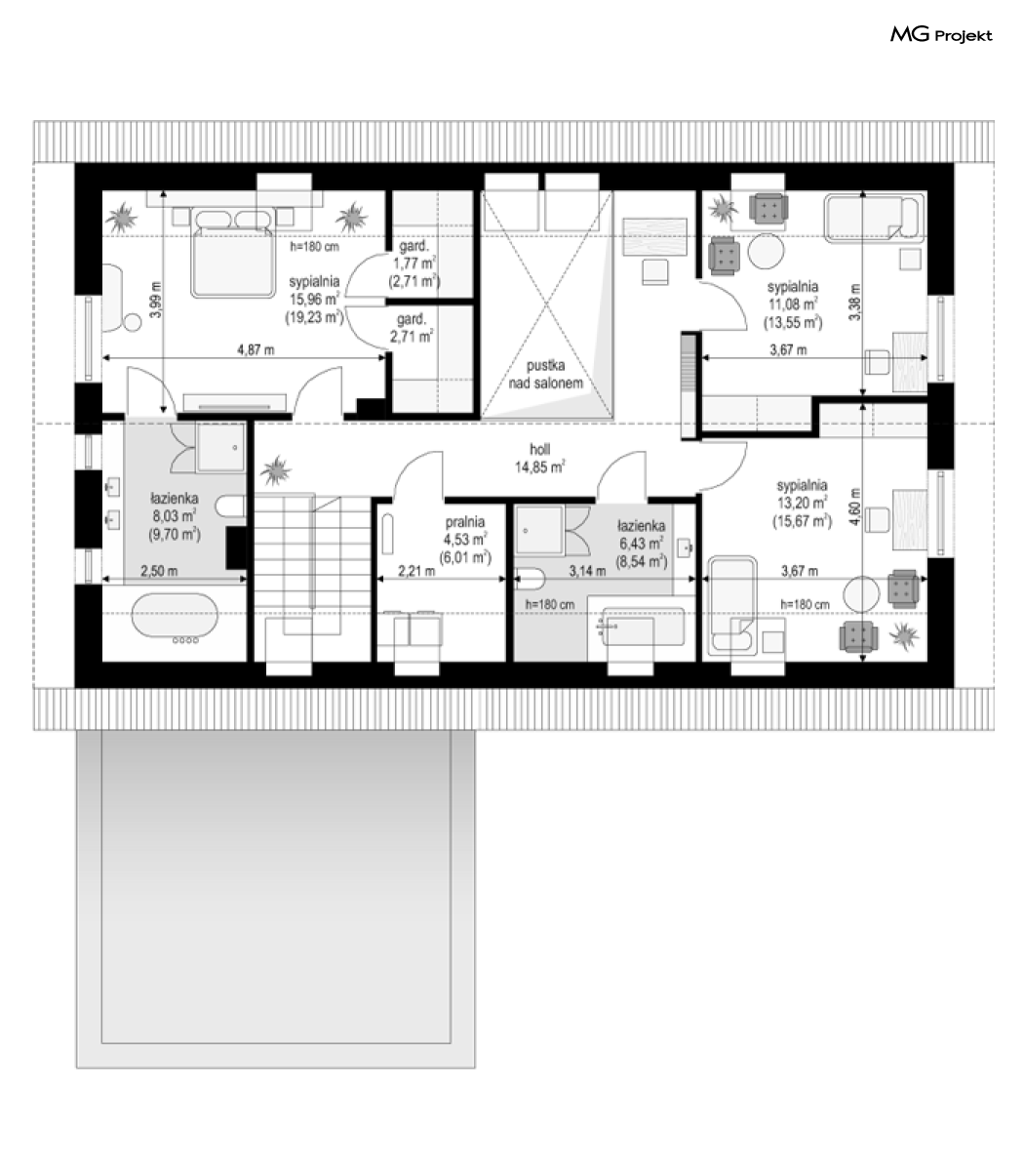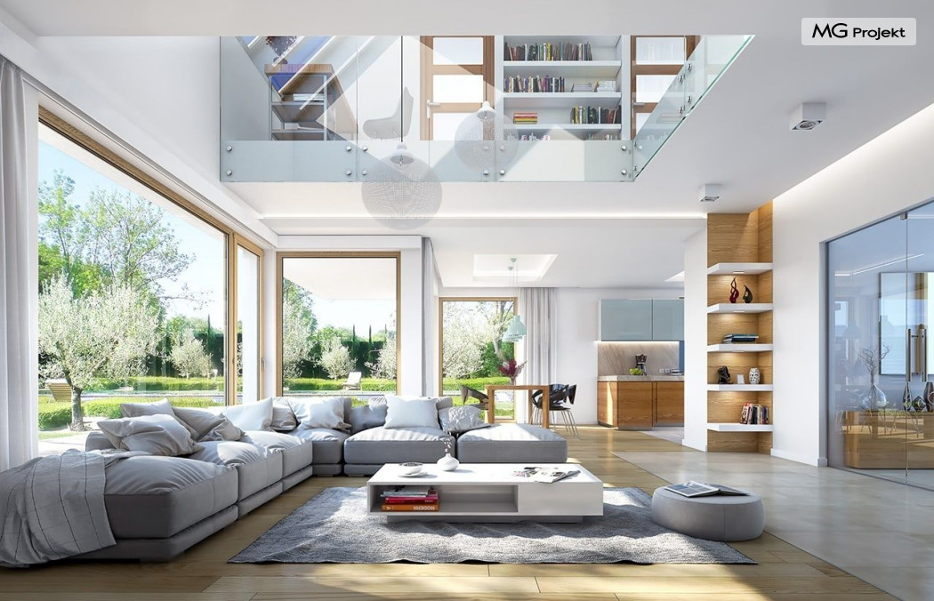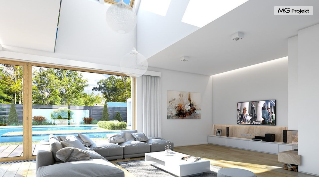 Projekt domu Viking 5 jest powiększoną wersją projektu z serii „Viking”, o wydłużonej bryle głównej, z większym salonem i pustką z antresolą nad częścią dzienną. Jest superkomfortową propozycją domu dla 4-6 osobowej rodziny - nowoczesnego, funkcjonalnego, o bardzo atrakcyjnej sylwetce i wnętrzu. Projekt domu Viking 5 został poszerzony w stosunku do bazowego projektu, przez co wygląda bardziej reprezentacyjnie i okazale. To komfortowa nowoczesna willa, z ciekawymi materiałami i detalami, oraz pięknymi szerokimi przeszkleniami otwierającymi wnętrze na ogród. Zastosowane materiały : pokrycie dachu z blachy na rąbek, okładziny ścian z drewna czy płyt włóknowo-cementowych, oraz podział elewacji na poziome pasy, dają atrakcyjny wygląd zewnętrzny budynku. Wnętrze : do domu wchodzimy przeszklonym otwartym przedsionkiem wprost do pokoju dziennego, łączącego hol, salon i jadalnię. Przed nami, dzięki szerokim oknom otwiera się od razu widok na ogród i taras. Dodatkowo atrakcyjności wnętrza dodaje pustka nad salonem z antresolą na poddaszu. Przy jadalni mamy ładną ustawną kuchnię ze spiżarnią, a z drugiej strony parteru dodatkowy pokój, łazienkę i pomieszczenia gospodarcze z garażem. Na poddaszu zaprojektowano trzy sypialnie : dwie dziecięce - równej wielkości, z szafami wbudowanymi i łazienką, oraz sypialnię rodziców z dwiema garderobami i własną łazienką. Część rodziców oddziela od części dzieci - jak mostem - pustka nad salonem, antresola, oraz pralnia. Dom nie należy do najmniejszych, ale nie jest też kilkusetmetrową rezydencją. Został zaprojektowany dla Inwestorów, którzy chcą mieszkać maksymalnie komfortowo, nowocześnie, ale nie zamierzają stać się niewolnikami swojego przyszłego domu. Wszystko z umiarem. Projekt domu Viking 5 dostarcza luksusowych doznań, spełnia marzenia, ale za rozsądną cenę. Dostaępna jest także wersja domu w odbiciu lustrzanym, wersja podstawowa (projekt domu Viking), pomniejszona z garażem jednostanowiskowym (projekt domu Viking 2), bez garażu (projekt domu Viking 3), z pomieszczeniem nad garażem ( projekt domu Viking 4). Do tego budynek jest energooszczędny i dość łatwy w budowie. Czego chcieć więcej. Vikinga można łatwo dostosować do standardu NF40. Zapraszamy.