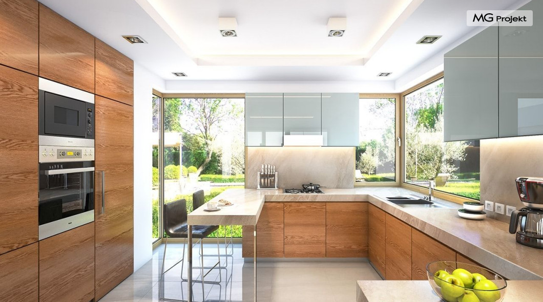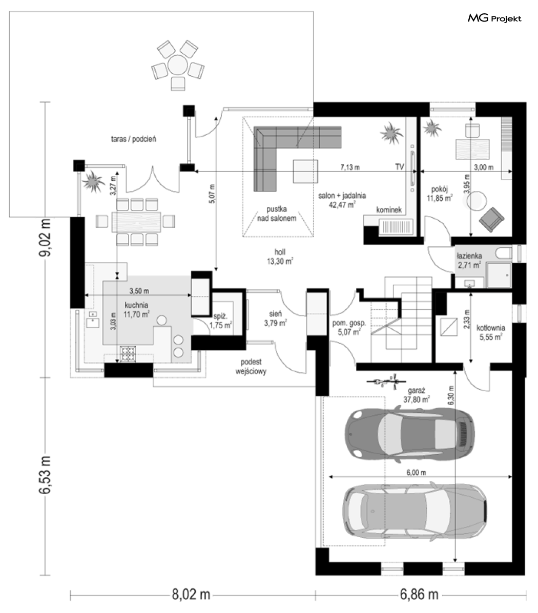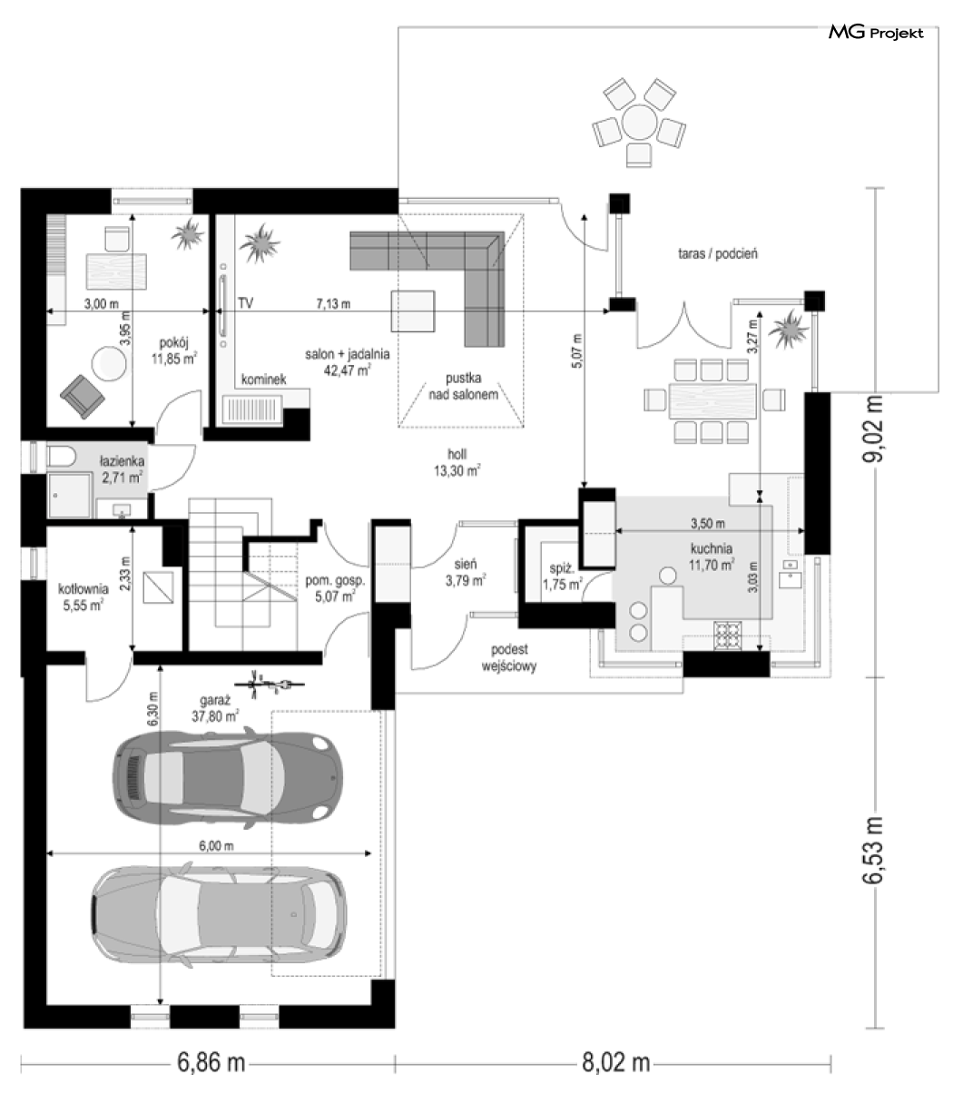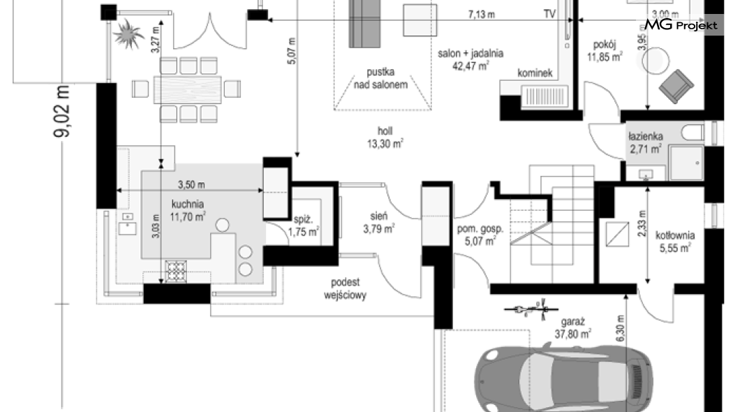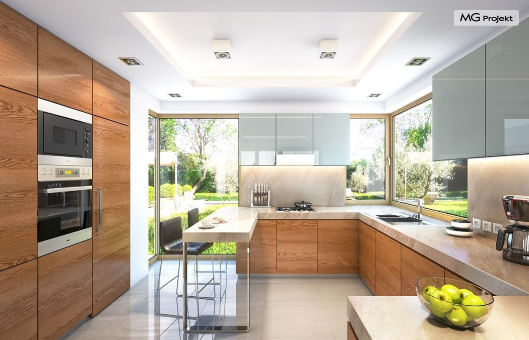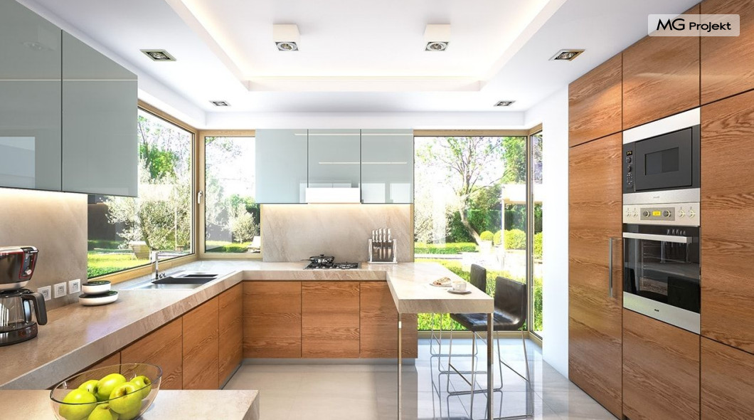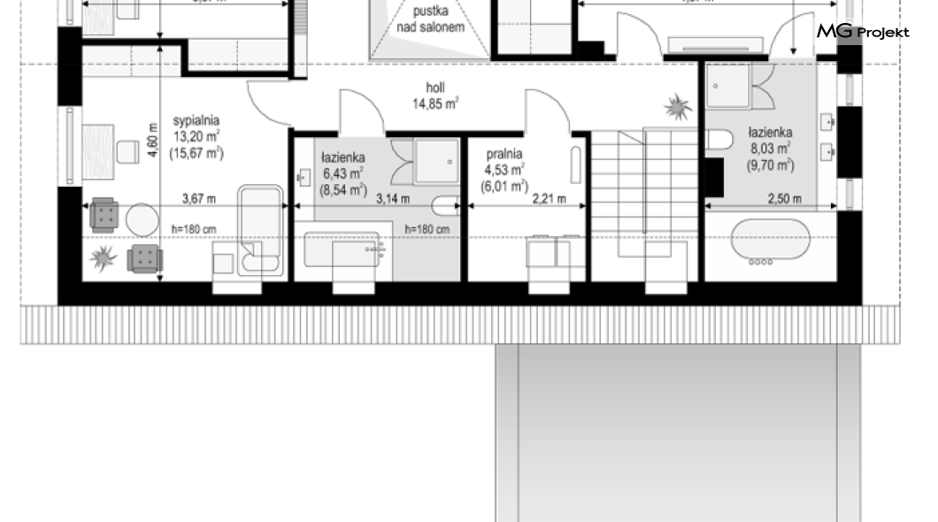 Projekt domu Viking 5 jest powiększoną wersją projektu z serii „Viking”, o wydłużonej bryle głównej, z większym salonem i pustką z antresolą nad częścią dzienną. Jest superkomfortową propozycją domu dla 4-6 osobowej rodziny - nowoczesnego, funkcjonalnego, o bardzo atrakcyjnej sylwetce i wnętrzu. Projekt domu Viking 5 został poszerzony w stosunku do bazowego projektu, przez co wygląda bardziej reprezentacyjnie i okazale. To komfortowa nowoczesna willa, z ciekawymi materiałami i detalami, oraz pięknymi szerokimi przeszkleniami otwierającymi wnętrze na ogród. Zastosowane materiały : pokrycie dachu z blachy na rąbek, okładziny ścian z drewna czy płyt włóknowo-cementowych, oraz podział elewacji na poziome pasy, dają atrakcyjny wygląd zewnętrzny budynku. Wnętrze : do domu wchodzimy przeszklonym otwartym przedsionkiem wprost do pokoju dziennego, łączącego hol, salon i jadalnię. Przed nami, dzięki szerokim oknom otwiera się od razu widok na ogród i taras. Dodatkowo atrakcyjności wnętrza dodaje pustka nad salonem z antresolą na poddaszu. Przy jadalni mamy ładną ustawną kuchnię ze spiżarnią, a z drugiej strony parteru dodatkowy pokój, łazienkę i pomieszczenia gospodarcze z garażem. Na poddaszu zaprojektowano trzy sypialnie : dwie dziecięce - równej wielkości, z szafami wbudowanymi i łazienką, oraz sypialnię rodziców z dwiema garderobami i własną łazienką. Część rodziców oddziela od części dzieci - jak mostem - pustka nad salonem, antresola, oraz pralnia. Dom nie należy do najmniejszych, ale nie jest też kilkusetmetrową rezydencją. Został zaprojektowany dla Inwestorów, którzy chcą mieszkać maksymalnie komfortowo, nowocześnie, ale nie zamierzają stać się niewolnikami swojego przyszłego domu. Wszystko z umiarem. Projekt domu Viking 5 dostarcza luksusowych doznań, spełnia marzenia, ale za rozsądną cenę. Dostaępna jest także wersja domu w odbiciu lustrzanym, wersja podstawowa (projekt domu Viking), pomniejszona z garażem jednostanowiskowym (projekt domu Viking 2), bez garażu (projekt domu Viking 3), z pomieszczeniem nad garażem ( projekt domu Viking 4). Do tego budynek jest energooszczędny i dość łatwy w budowie. Czego chcieć więcej. Vikinga można łatwo dostosować do standardu NF40. Zapraszamy.