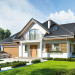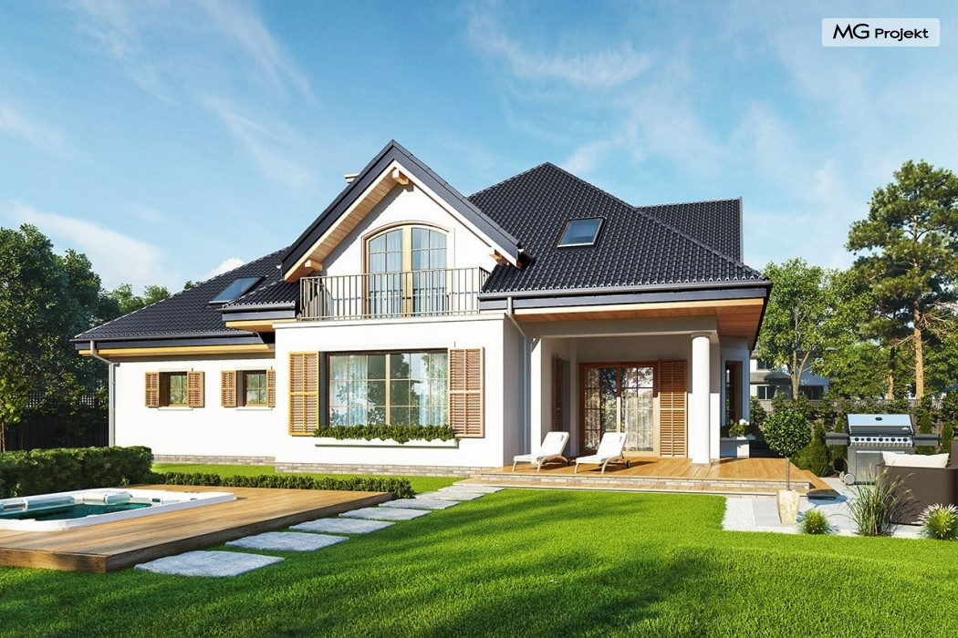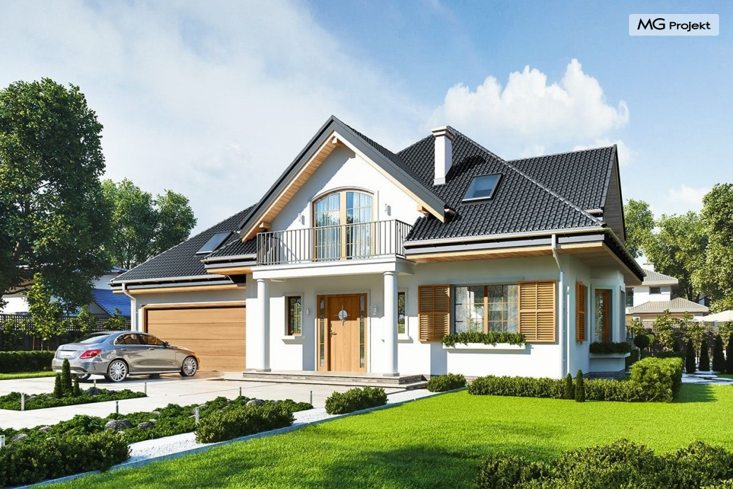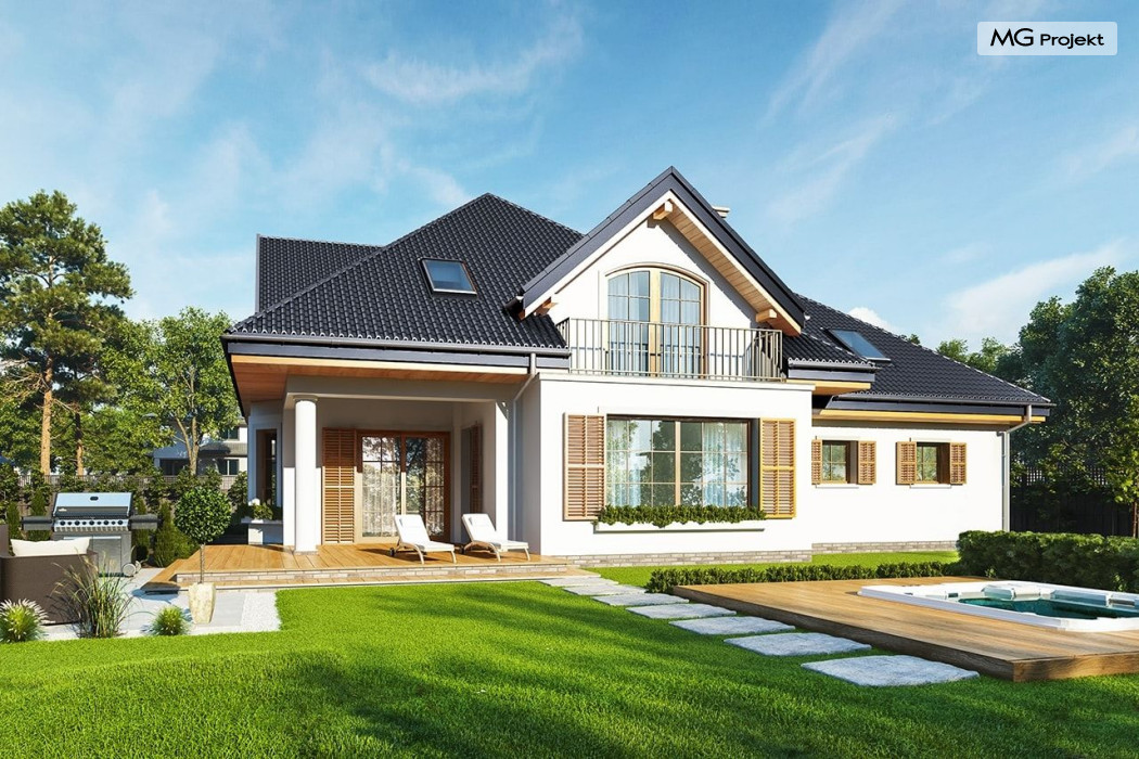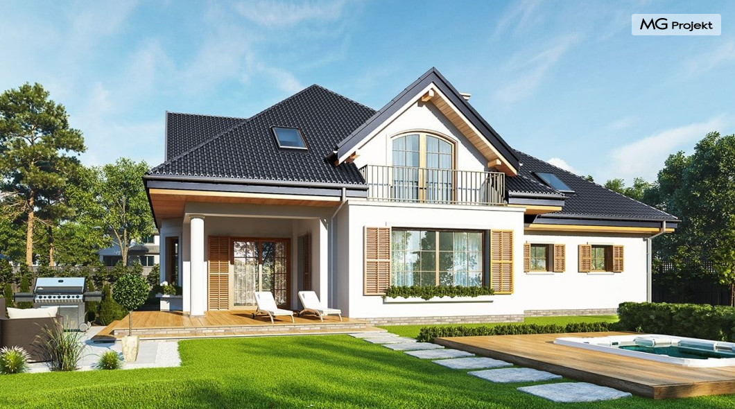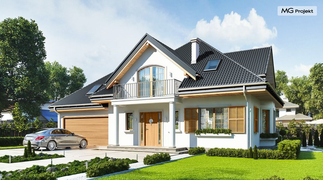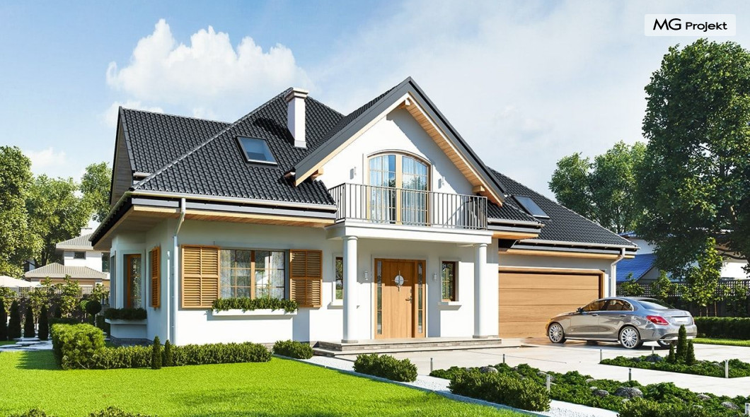 Willa Julia 2 to dom z poddaszem użytkowym, z dobudowaną częścią garażową z obszernym podwójnym garażem. Dom Willa Julia 2 łączy w sobie nowoczesne materiały, detale i technologie, z klasyczną tradycyjną formą. Czterospadowy dach projektu Willa Julia 2 urozmaicony szerokimi lukarnami, w połączeniu ze ścianami tworzy proporcjonalny budynek o właściwej skali. Do budynku Willa Julia 2 wchodzimy przez podcień wejściowy z balkonem na poddaszu, z kolumnami po bokach. Przez szerokie drzwi z naświetlami przechodzimy do wnętrza. Elewacja ogrodowa projektu Willa Julia 2 ozdobiona jest lukarną z balkonem, wykuszem salonu z pięknym dużym oknem, oraz podcieniem w narożniku budynku, zadaszającym część tarasu. Czarny dach i białe elewacje nadają budynkowi czystości i nowoczesnego wyrazu. We wnętrzu projektu Willa Julia 2 zaplanowano na parterze dużą otwartą przestrzeń dzienną, z salonem, jadalnią, holem z wyeksponowanymi schodami, oraz kuchnią. Przy przedsionku zmieszczono przydatną szatnię, a po drugiej stronie dodatkowy pokój na parterze – biuro domowe, lub sypialnię gościnną. Pod schodami przechodzimy do dużego podwójnego garażu z dodatkową przestrzenią gospodarczą, oraz kotłowni. W projekcie domku Willa Julia 2 na poddaszu mamy aż cztery pokoje, w tym sypialnię rodziców z garderobą, dużą łazienkę, oraz pralnię –suszarnię. Willa Julia 2 jest budynkiem energooszczędnym, bardzo dobrze ocieplonym, o zwartej bryle, dzięki czemu koszt budowy domu jest niski. Gotowy projekt domku Willa Julia 2 będzie też prosty w budowie i niedrogi w późniejszym utrzymaniu. Projekt Willa Julia 2 można również zamówić w odbiciu lustrzanym. Zapraszamy również do obejrzenia projektu domu Willa Julia 1.
