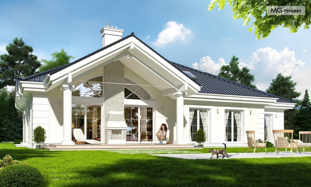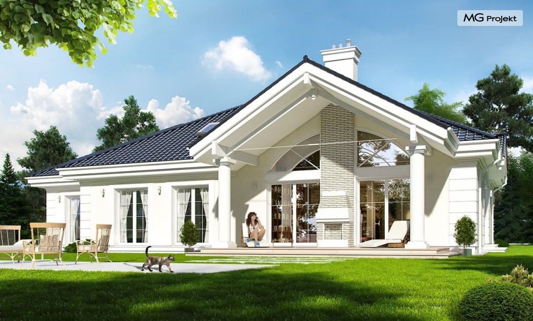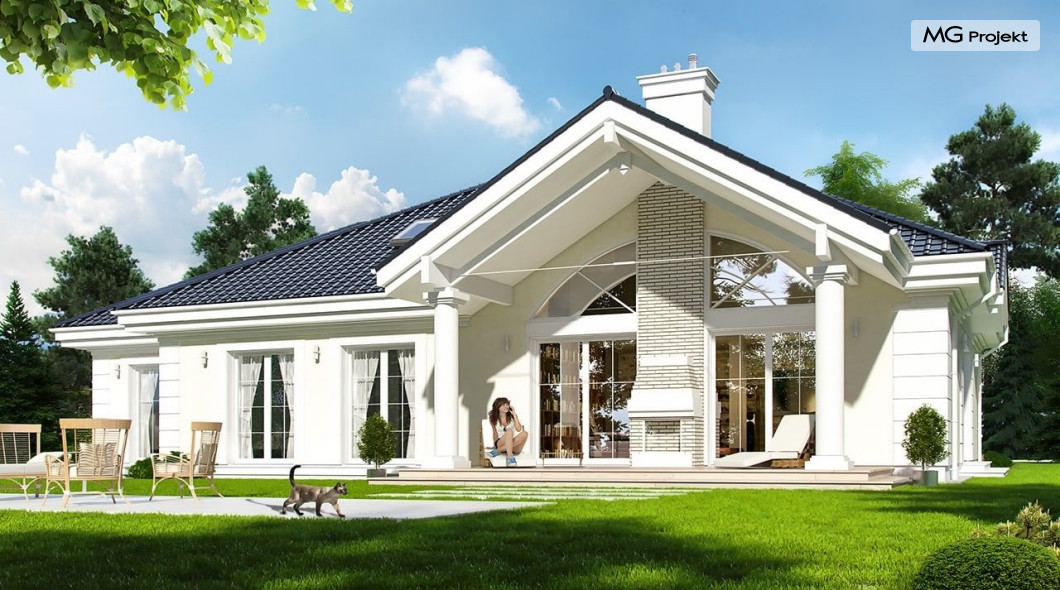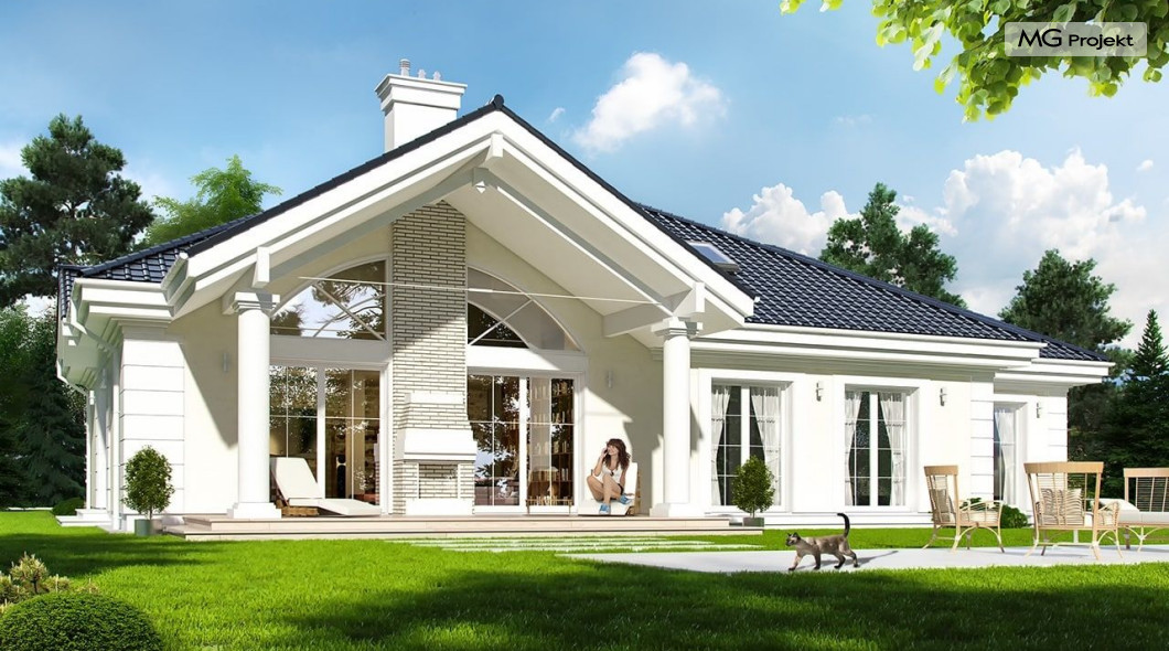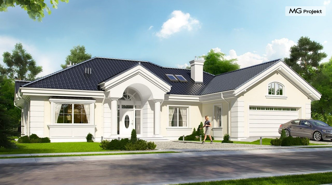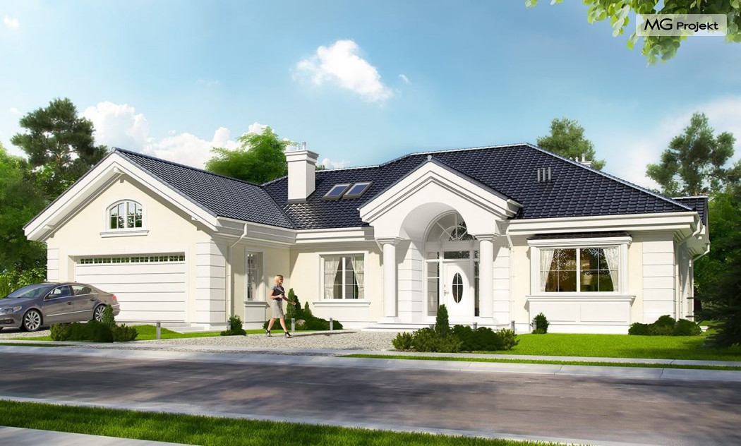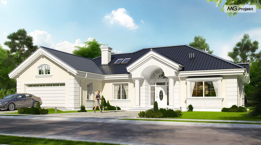 Elewację frontową domostwa ozdabia reprezentacyjny portyk wejściowy z kolumnami. Projekt parterowego domu jednorodzinnego Willa Parkowa utrzymany jest w stylistyce podmiejskiej rezydencji. Detale architektoniczne podkreślają klasyczny styl projektu domu Willa Parkowa.