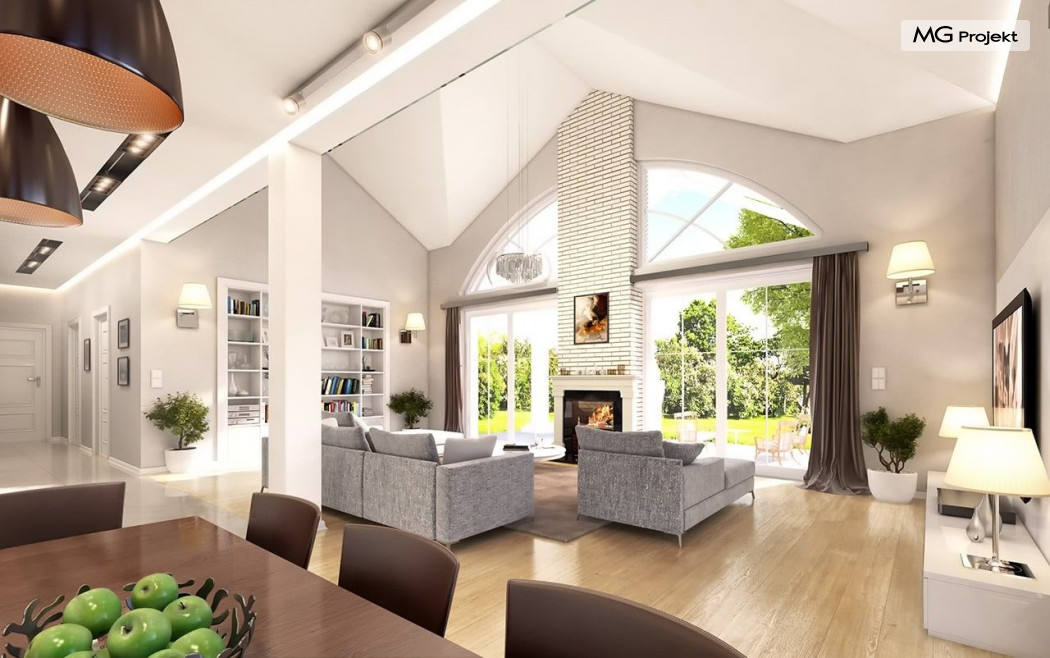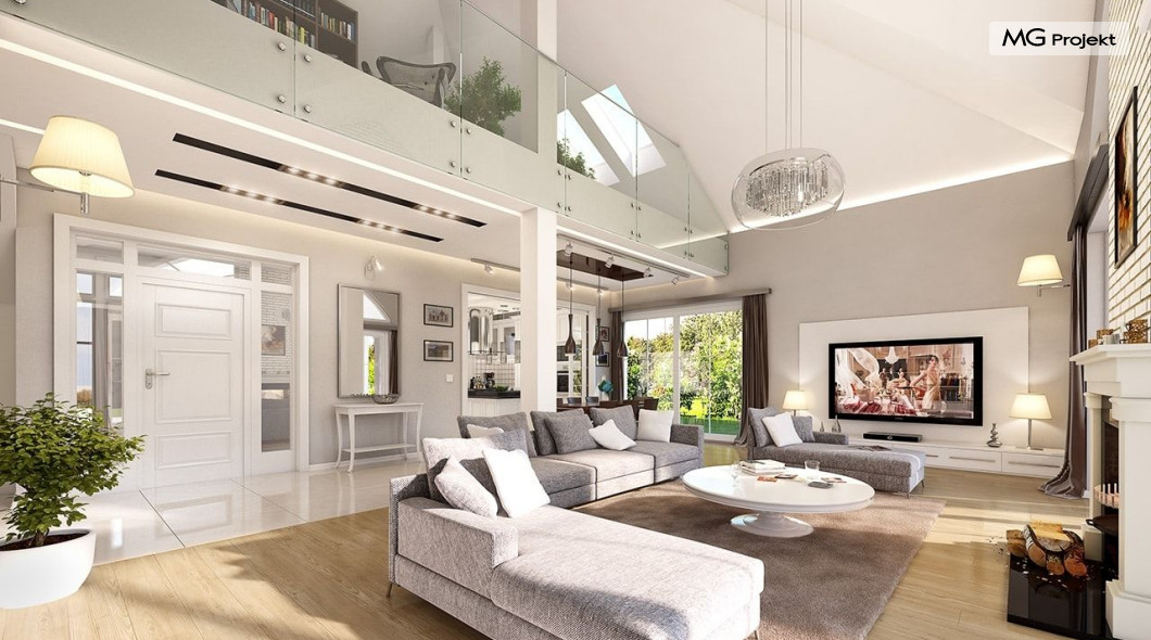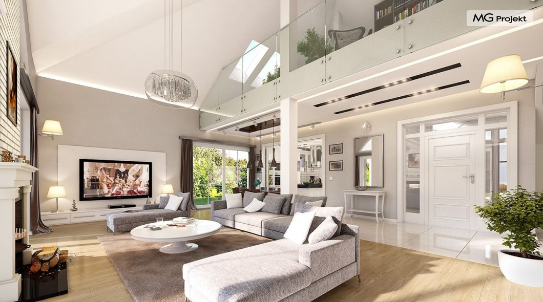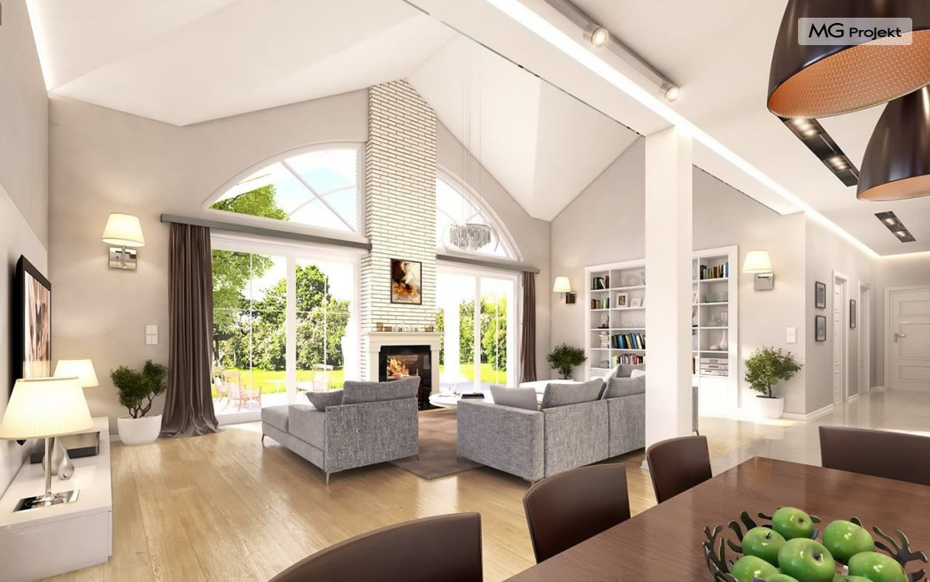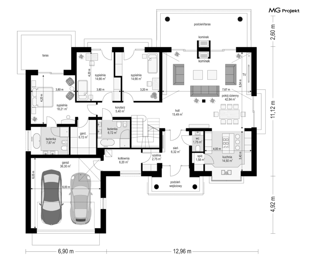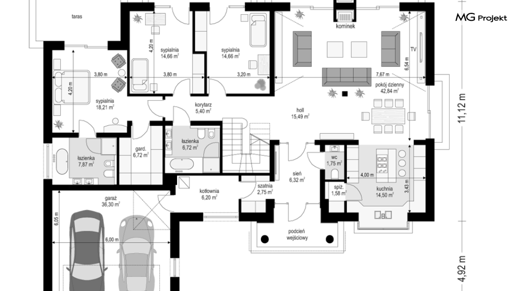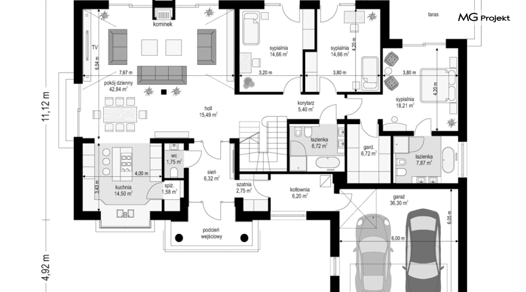W części gospodarczej projektanci MGProjekt zaplanowali kotłownię i dwustanowiskowy garaż. Staraliśmy się oszczędnie gospodarować przestrzenią i "wycisnąć" z niej jak najwięcej. Dzięki temu projekt Willa Parkowa to komfortowy, ale jednocześnie ekonomiczny budynek, z którego przyszli domownicy będą dumni. Willa Parkowa to dom, który nie zrujnuje na całe życie kosztami budowy i utrzymania.