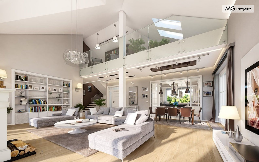 Wnętrze Willi Parkowej zaprojektowano nowocześnie i funkcjonalnie. Część dzienna to jednoprzestrzenna powierzchnia uzytkowa salonu, jadalni, holu i kuchni. Nad częścią salonu zaprojektowano otwarcie przestrzenne - pustkę. W domu Willa Parkowa nad salonem przewidziano antresolę. Z holu i salonu widzimy reprezentacyjne zabiegowe schody na poddasze.