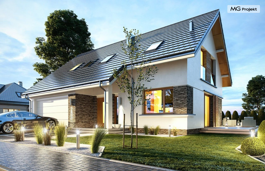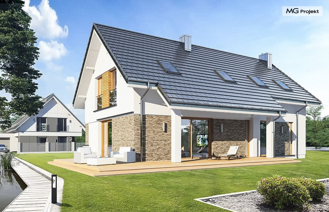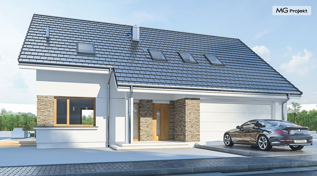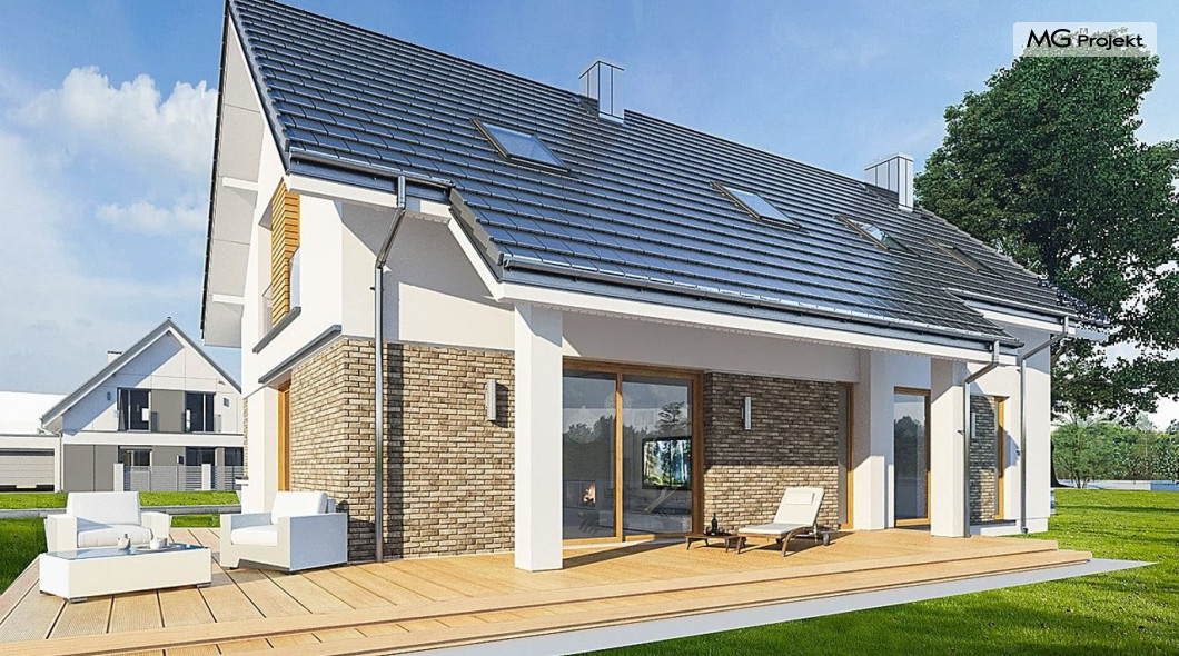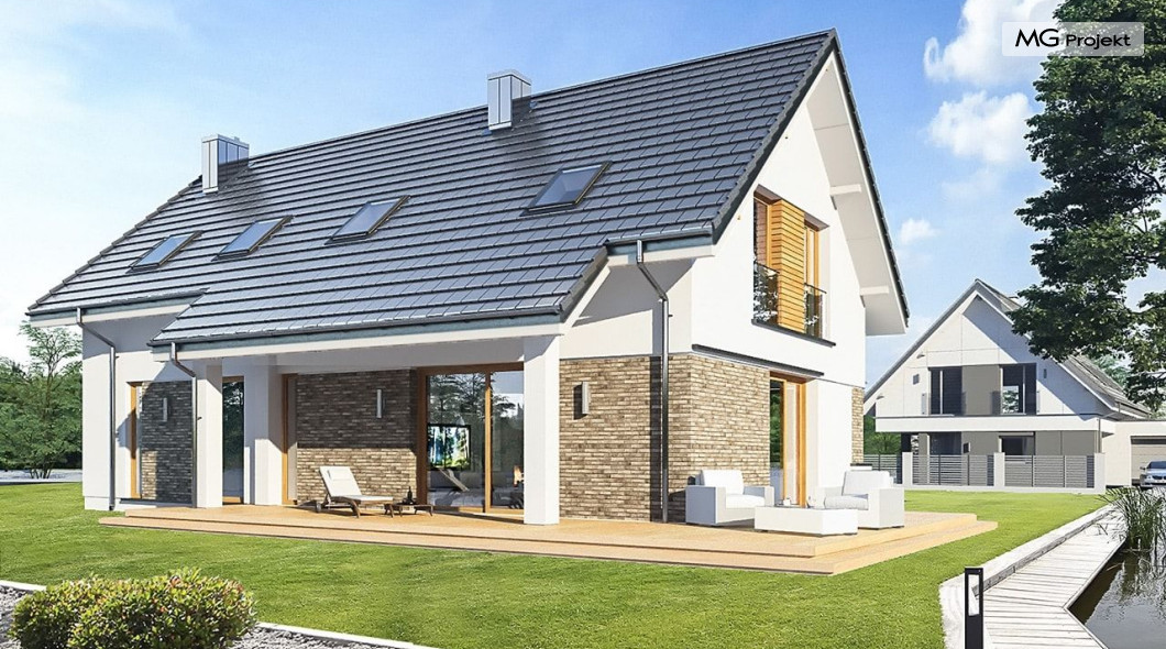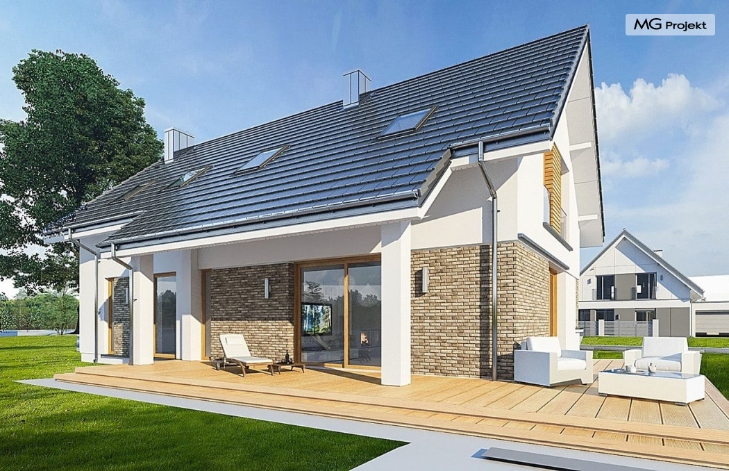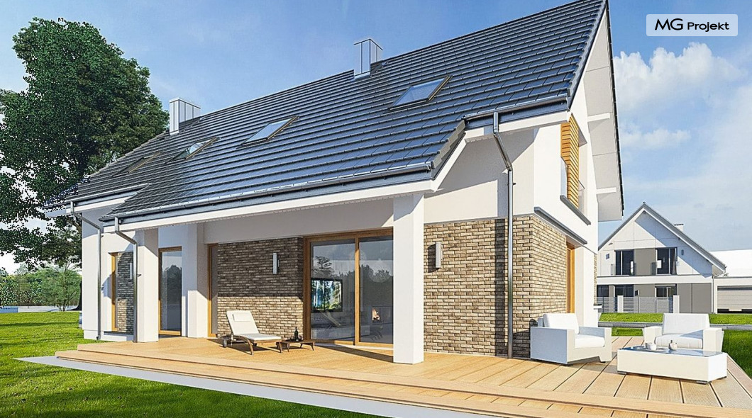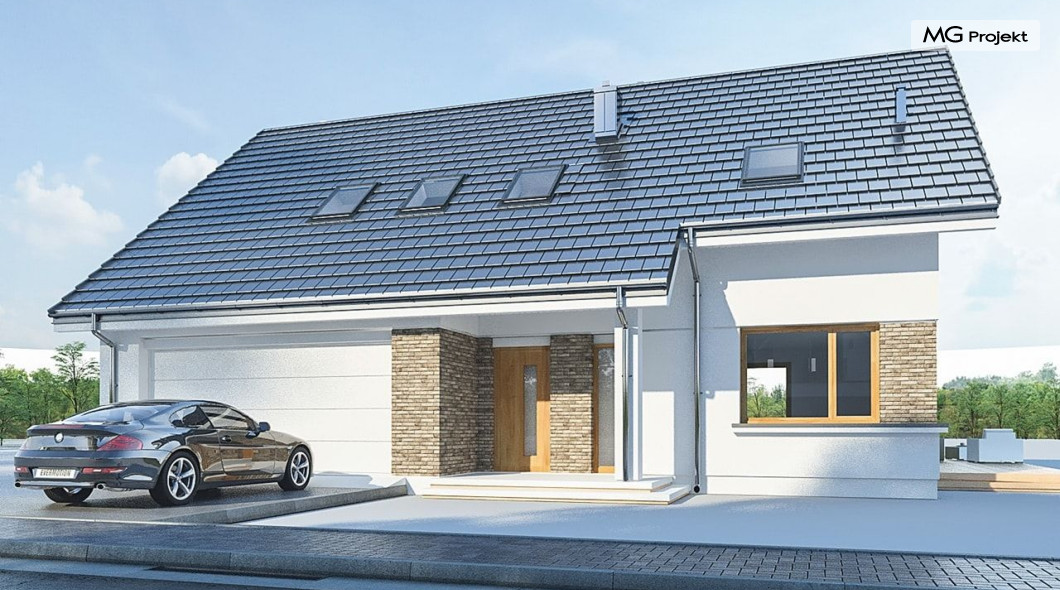 Projekt domu Biba jest kolejną wersją projektu z kolekcji „roztańczonych” domów. Jest on wariantową wersją projektu Party, z dachami spadzistymi nad wystającymi z głównej bryły domu: garażem i zadaszeniem tarasu. Projekt domu Biba pasuje na działkę gdzie plan miejscowy zakazuje stosowania daszków płaskich. Biba - to dom jednorodzinny, parterowy z poddaszem użytkowym, dla cztero-pięcioosobowej rodziny. Ze względu na dodatkowy pokój z łazienką na parterze, może być też odpowiedni dla rodziny trzypokoleniowej, z seniorami. W sensowniej, nie za dużej powierzchni udało się zmieścić cały program użytkowy - wszystkie potrzebne pomieszczenia. W projekcie domu Biba na parterze mamy dużą otwartą przestrzeń dzienną, łączącą salon ze ścianą kominkowo-telewizyjną, kącik na stół jadalny, kuchnię, oraz holl z reprezentacyjnymi schodami. Obok kuchni zaprojektowano spiżarnię z miejscem na dodatkową lodówkę. Wejście do domu zaplanowano przez obszerny przedsionek z szafami, połączony z garażem. Do przedsionka wchodzimy z dużego podcienia wejściowego, a następnie do holu szerokimi szklanymi drzwiami. Nieco na uboczu mamy dodatkowy pokój - gabinet lub sypialnię, oraz łazienkę z natryskiem i przydatnym schowkiem porządkowym pod podestem schodów. Na parterze przewidziano także duży dwustanowiskowy garaż i kotłownię. Na poddaszu mamy układ trzech sypialni, z komfortowym apartamentem rodziców, z własną łazienką i naprawdę ładną garderobą, oraz dwiema sypialniami dziecięcymi z szafami wbudowanymi, łazienką i pralnią dostępną z holu. Na samej górze mamy jeszcze nisty stryszek - domowy magazyn. Biorąc pod uwagę nieprzesadzoną powierzchnię użytkową, w domu udało się zaprojektować naprawdę komfortowe wnętrze. Architektura domu : dosyć prosta bryła z dwuspadowym dachem zyskała nowoczesny acz nie awangardowy wygląd dzięki dużym przeszkleniom połączonym z okładzinami klinkierowymi i drewnianymi. Dom doskonale wpasuje się w dowolne otoczenie, a jego architektura z pewnością będzie ponadczasowa i szybko się nie znudzi. W prostocie tkwi siła. Koszty : także w prostocie tkwią oszczędności. Dzięki nieskomplikowanym kształtom dom będzie łatwy i niedrogi w budowie, a potem w utrzymaniu. Budynek zaprojektowano jako energooszczędny, także koszty ogrzewania również nie zrujnują właścicieli. Projekt domu Biba to dobra solidna propozycja domu jednorodzinnego dla Klientów szukających rozsądnego projektu. Zapraszamy do zapoznania się z całą serią "roztańczonych domów": https://www.mgprojekt.com.pl/makarena, https://www.mgprojekt.com.pl/bolero, https://www.mgprojekt.com.pl/lambada, https://www.mgprojekt.com.pl/party, https://www.mgprojekt.com.pl/party-2, https://www.mgprojekt.com.pl/biba, https://www.mgprojekt.com.pl/tango, https://www.mgprojekt.com.pl/salsa, https://www.mgprojekt.com.pl/rumba, https://www.mgprojekt.com.pl/mambo, https://www.mgprojekt.com.pl/mambo, https://www.mgprojekt.com.pl/fokstrot, https://www.mgprojekt.com.pl/samba.
