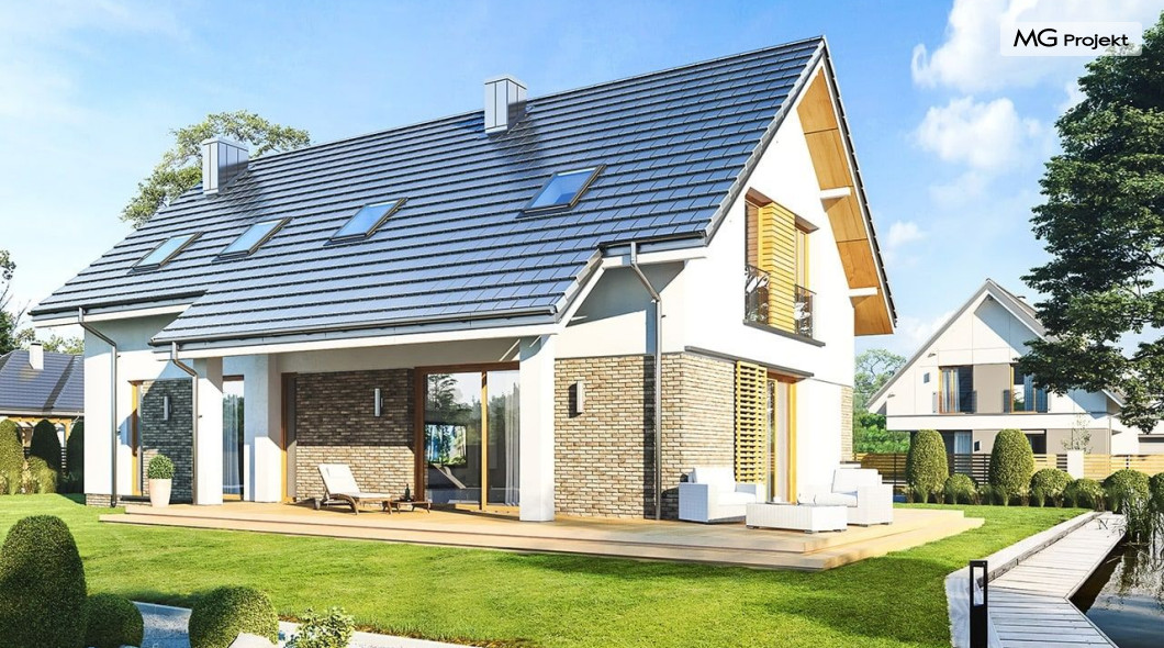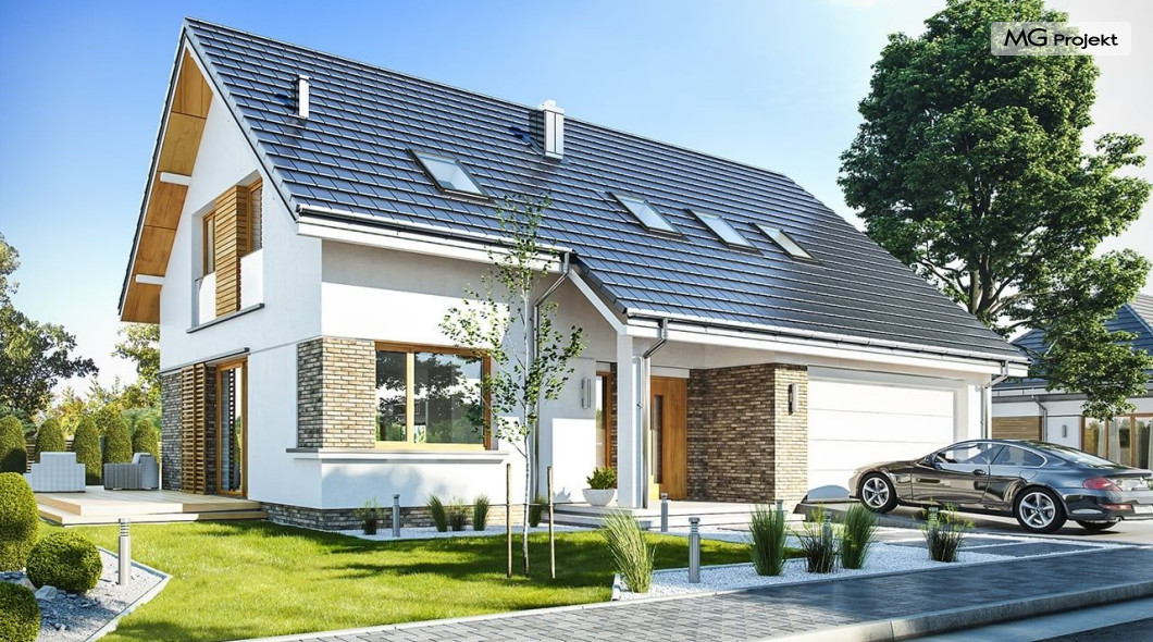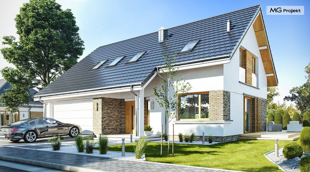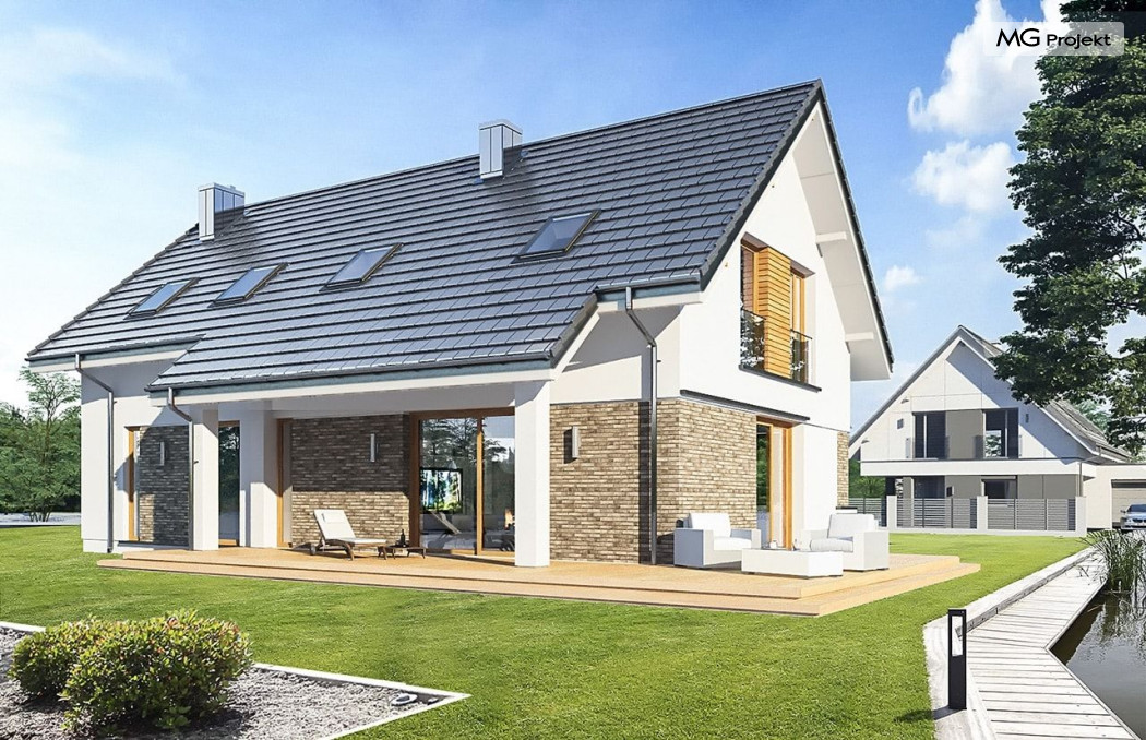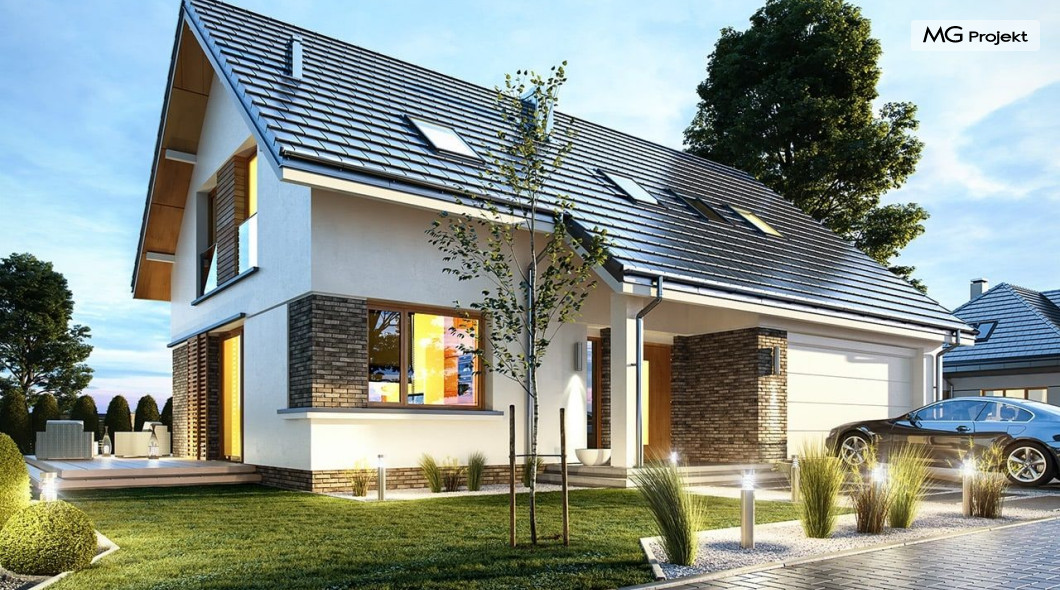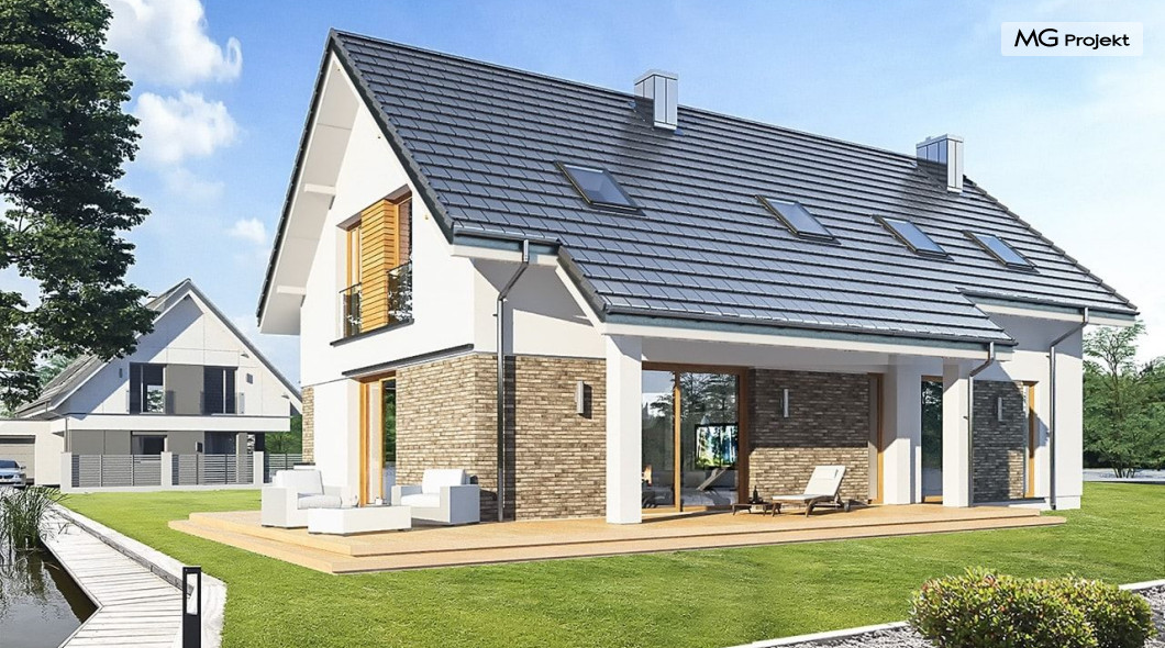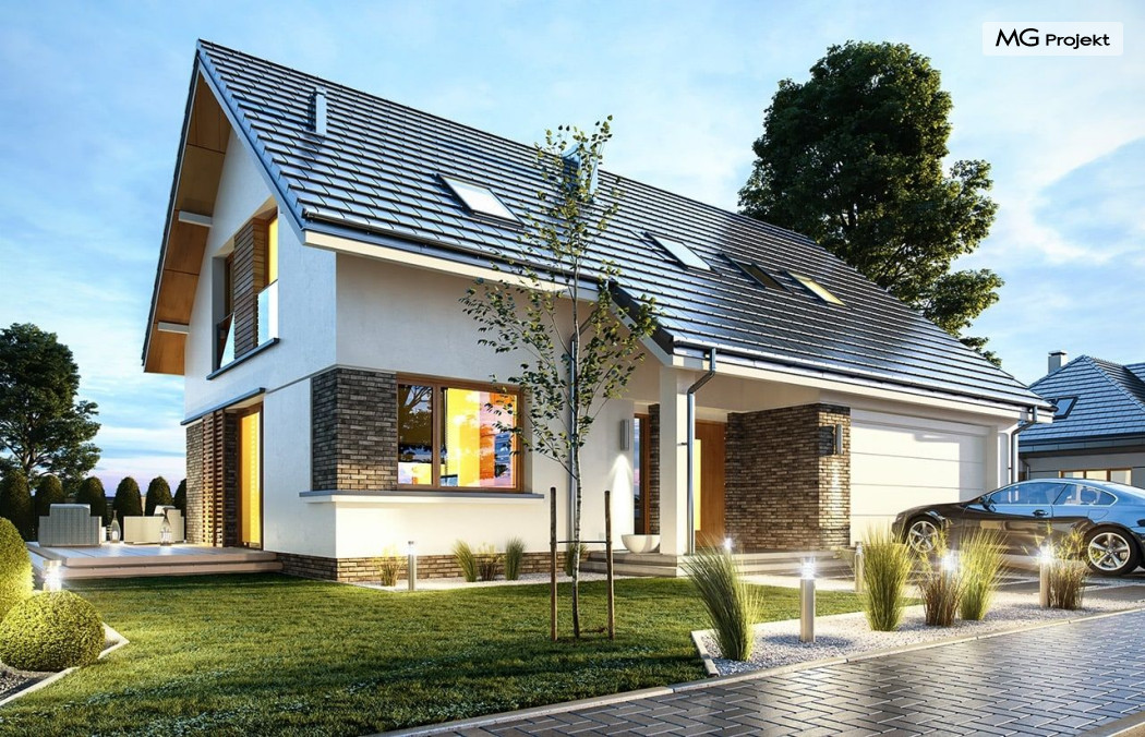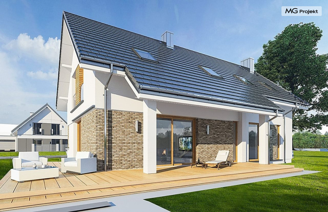 Projekt domu Biba jest kolejną wersją projektu z kolekcji „roztańczonych” domów. Jest on wariantową wersją projektu Party, z dachami spadzistymi nad wystającymi z głównej bryły domu: garażem i zadaszeniem tarasu. Projekt domu Biba pasuje na działkę gdzie plan miejscowy zakazuje stosowania daszków płaskich. Biba - to dom jednorodzinny, parterowy z poddaszem użytkowym, dla cztero-pięcioosobowej rodziny. Ze względu na dodatkowy pokój z łazienką na parterze, może być też odpowiedni dla rodziny trzypokoleniowej, z seniorami. W sensowniej, nie za dużej powierzchni udało się zmieścić cały program użytkowy - wszystkie potrzebne pomieszczenia. W projekcie domu Biba na parterze mamy dużą otwartą przestrzeń dzienną, łączącą salon ze ścianą kominkowo-telewizyjną, kącik na stół jadalny, kuchnię, oraz holl z reprezentacyjnymi schodami. Obok kuchni zaprojektowano spiżarnię z miejscem na dodatkową lodówkę. Wejście do domu zaplanowano przez obszerny przedsionek z szafami, połączony z garażem. Do przedsionka wchodzimy z dużego podcienia wejściowego, a następnie do holu szerokimi szklanymi drzwiami. Nieco na uboczu mamy dodatkowy pokój - gabinet lub sypialnię, oraz łazienkę z natryskiem i przydatnym schowkiem porządkowym pod podestem schodów. Na parterze przewidziano także duży dwustanowiskowy garaż i kotłownię. Na poddaszu mamy układ trzech sypialni, z komfortowym apartamentem rodziców, z własną łazienką i naprawdę ładną garderobą, oraz dwiema sypialniami dziecięcymi z szafami wbudowanymi, łazienką i pralnią dostępną z holu. Na samej górze mamy jeszcze nisty stryszek - domowy magazyn. Biorąc pod uwagę nieprzesadzoną powierzchnię użytkową, w domu udało się zaprojektować naprawdę komfortowe wnętrze. Architektura domu : dosyć prosta bryła z dwuspadowym dachem zyskała nowoczesny acz nie awangardowy wygląd dzięki dużym przeszkleniom połączonym z okładzinami klinkierowymi i drewnianymi. Dom doskonale wpasuje się w dowolne otoczenie, a jego architektura z pewnością będzie ponadczasowa i szybko się nie znudzi. W prostocie tkwi siła. Koszty : także w prostocie tkwią oszczędności. Dzięki nieskomplikowanym kształtom dom będzie łatwy i niedrogi w budowie, a potem w utrzymaniu. Budynek zaprojektowano jako energooszczędny, także koszty ogrzewania również nie zrujnują właścicieli. Projekt domu Biba to dobra solidna propozycja domu jednorodzinnego dla Klientów szukających rozsądnego projektu. Zapraszamy do zapoznania się z całą serią "roztańczonych domów": https://www.mgprojekt.com.pl/makarena, https://www.mgprojekt.com.pl/bolero, https://www.mgprojekt.com.pl/lambada, https://www.mgprojekt.com.pl/party, https://www.mgprojekt.com.pl/party-2, https://www.mgprojekt.com.pl/biba, https://www.mgprojekt.com.pl/tango, https://www.mgprojekt.com.pl/salsa, https://www.mgprojekt.com.pl/rumba, https://www.mgprojekt.com.pl/mambo, https://www.mgprojekt.com.pl/mambo, https://www.mgprojekt.com.pl/fokstrot, https://www.mgprojekt.com.pl/samba.