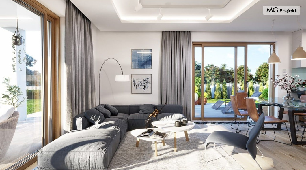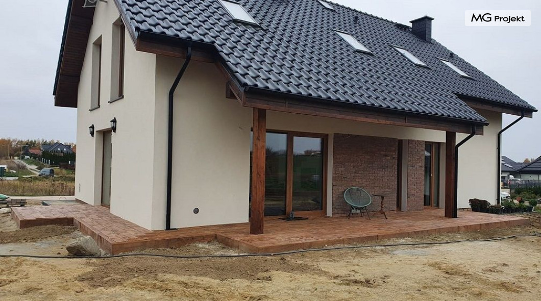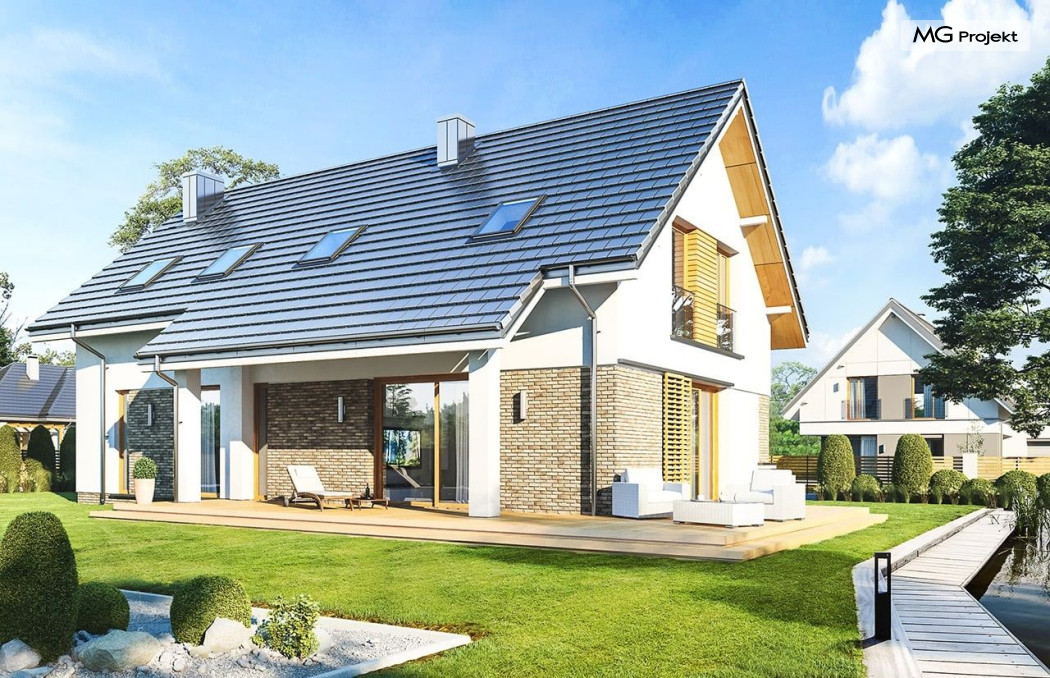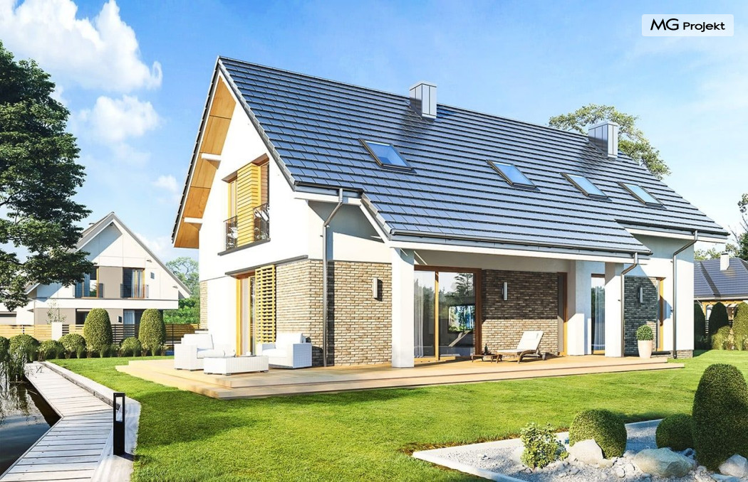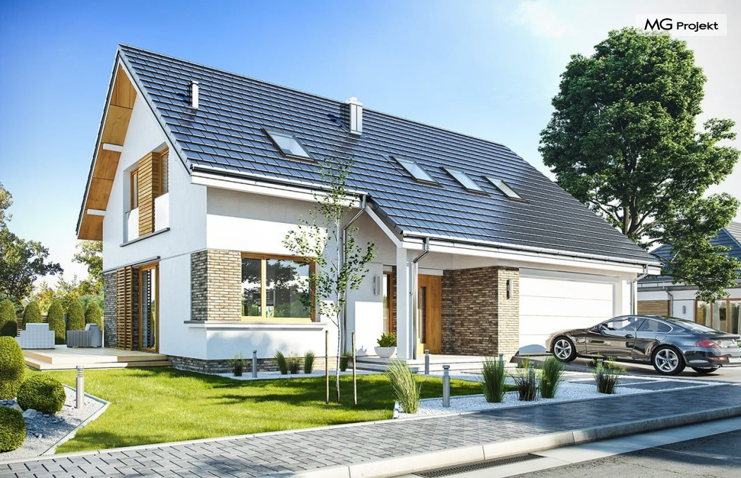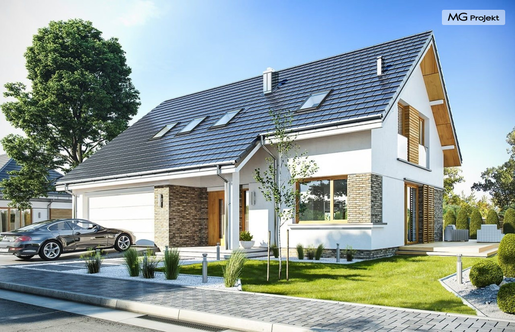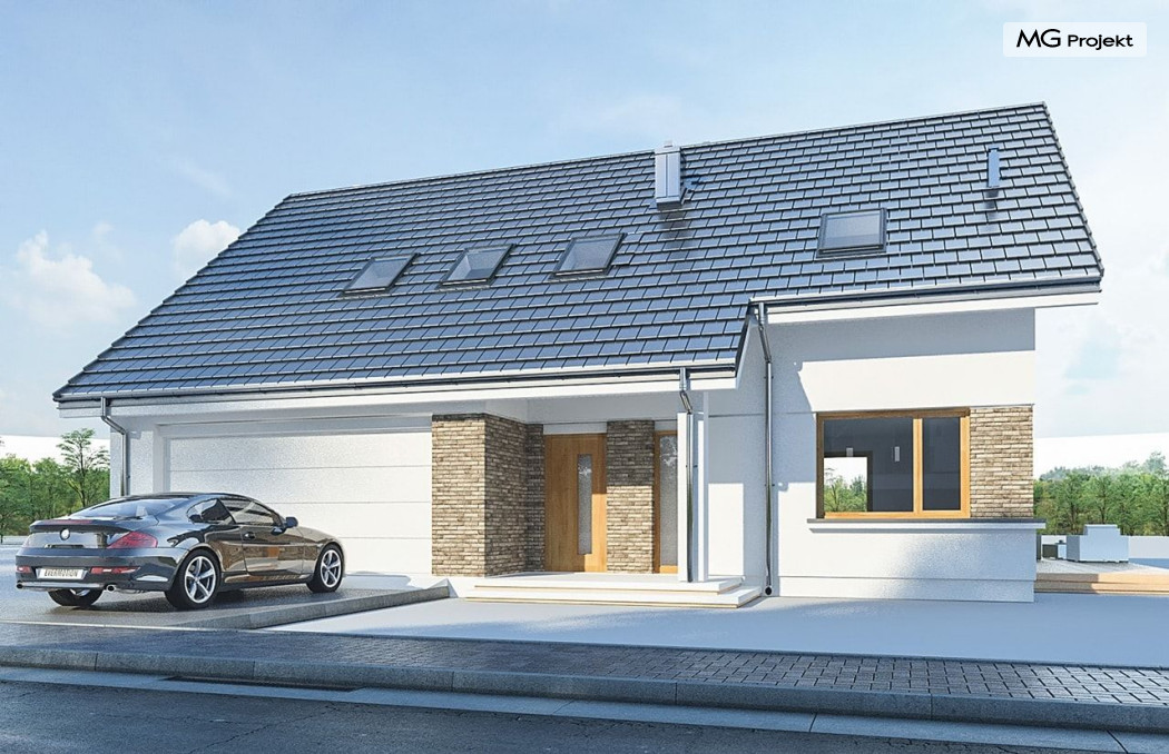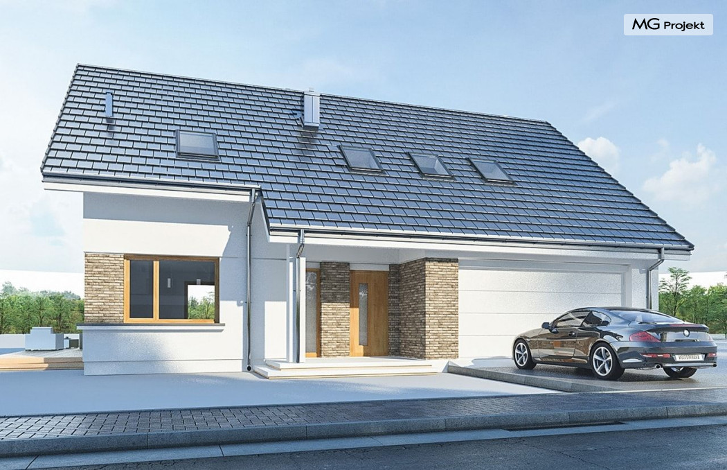 Projekt domu Biba jest kolejną wersją projektu z kolekcji „roztańczonych” domów. Jest on wariantową wersją projektu Party, z dachami spadzistymi nad wystającymi z głównej bryły domu: garażem i zadaszeniem tarasu. Projekt domu Biba pasuje na działkę gdzie plan miejscowy zakazuje stosowania daszków płaskich. Biba - to dom jednorodzinny, parterowy z poddaszem użytkowym, dla cztero-pięcioosobowej rodziny. Ze względu na dodatkowy pokój z łazienką na parterze, może być też odpowiedni dla rodziny trzypokoleniowej, z seniorami. W sensowniej, nie za dużej powierzchni udało się zmieścić cały program użytkowy - wszystkie potrzebne pomieszczenia. W projekcie domu Biba na parterze mamy dużą otwartą przestrzeń dzienną, łączącą salon ze ścianą kominkowo-telewizyjną, kącik na stół jadalny, kuchnię, oraz holl z reprezentacyjnymi schodami. Obok kuchni zaprojektowano spiżarnię z miejscem na dodatkową lodówkę. Wejście do domu zaplanowano przez obszerny przedsionek z szafami, połączony z garażem. Do przedsionka wchodzimy z dużego podcienia wejściowego, a następnie do holu szerokimi szklanymi drzwiami. Nieco na uboczu mamy dodatkowy pokój - gabinet lub sypialnię, oraz łazienkę z natryskiem i przydatnym schowkiem porządkowym pod podestem schodów. Na parterze przewidziano także duży dwustanowiskowy garaż i kotłownię. Na poddaszu mamy układ trzech sypialni, z komfortowym apartamentem rodziców, z własną łazienką i naprawdę ładną garderobą, oraz dwiema sypialniami dziecięcymi z szafami wbudowanymi, łazienką i pralnią dostępną z holu. Na samej górze mamy jeszcze nisty stryszek - domowy magazyn. Biorąc pod uwagę nieprzesadzoną powierzchnię użytkową, w domu udało się zaprojektować naprawdę komfortowe wnętrze. Architektura domu : dosyć prosta bryła z dwuspadowym dachem zyskała nowoczesny acz nie awangardowy wygląd dzięki dużym przeszkleniom połączonym z okładzinami klinkierowymi i drewnianymi. Dom doskonale wpasuje się w dowolne otoczenie, a jego architektura z pewnością będzie ponadczasowa i szybko się nie znudzi. W prostocie tkwi siła. Koszty : także w prostocie tkwią oszczędności. Dzięki nieskomplikowanym kształtom dom będzie łatwy i niedrogi w budowie, a potem w utrzymaniu. Budynek zaprojektowano jako energooszczędny, także koszty ogrzewania również nie zrujnują właścicieli. Projekt domu Biba to dobra solidna propozycja domu jednorodzinnego dla Klientów szukających rozsądnego projektu. Zapraszamy do zapoznania się z całą serią "roztańczonych domów": https://www.mgprojekt.com.pl/makarena, https://www.mgprojekt.com.pl/bolero, https://www.mgprojekt.com.pl/lambada, https://www.mgprojekt.com.pl/party, https://www.mgprojekt.com.pl/party-2, https://www.mgprojekt.com.pl/biba, https://www.mgprojekt.com.pl/tango, https://www.mgprojekt.com.pl/salsa, https://www.mgprojekt.com.pl/rumba, https://www.mgprojekt.com.pl/mambo, https://www.mgprojekt.com.pl/mambo, https://www.mgprojekt.com.pl/fokstrot, https://www.mgprojekt.com.pl/samba.