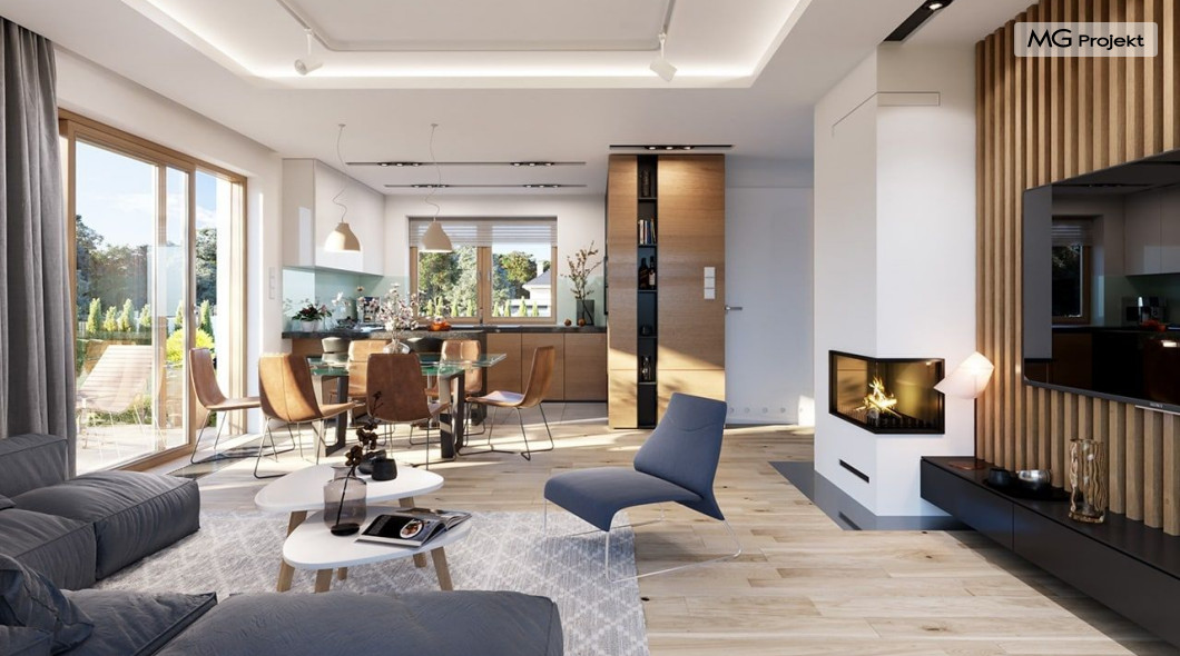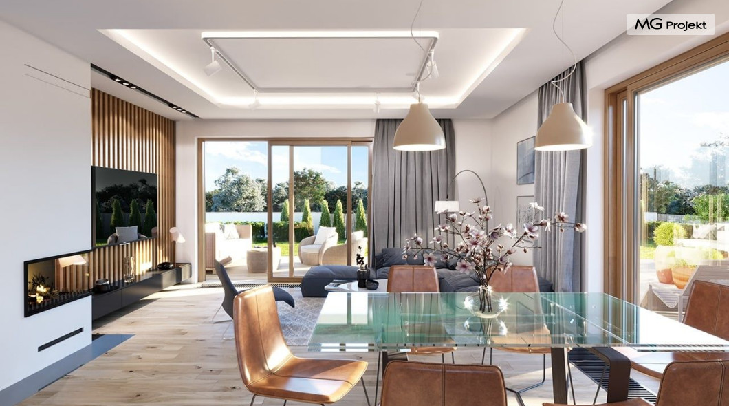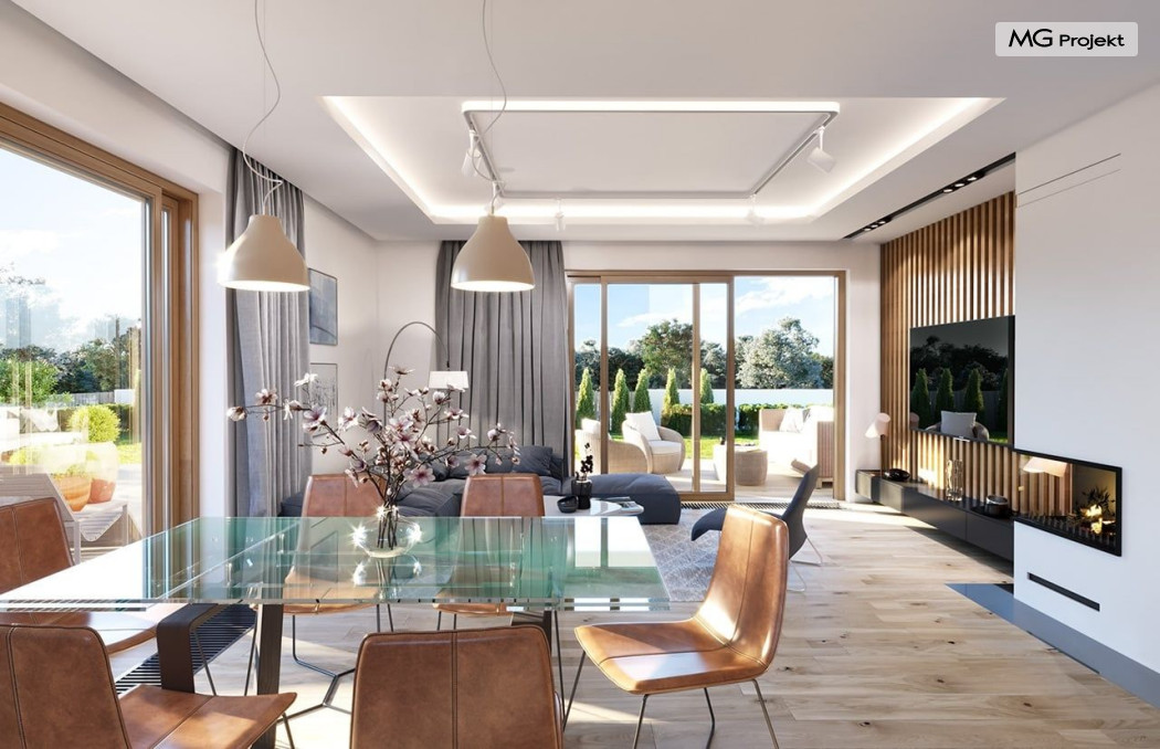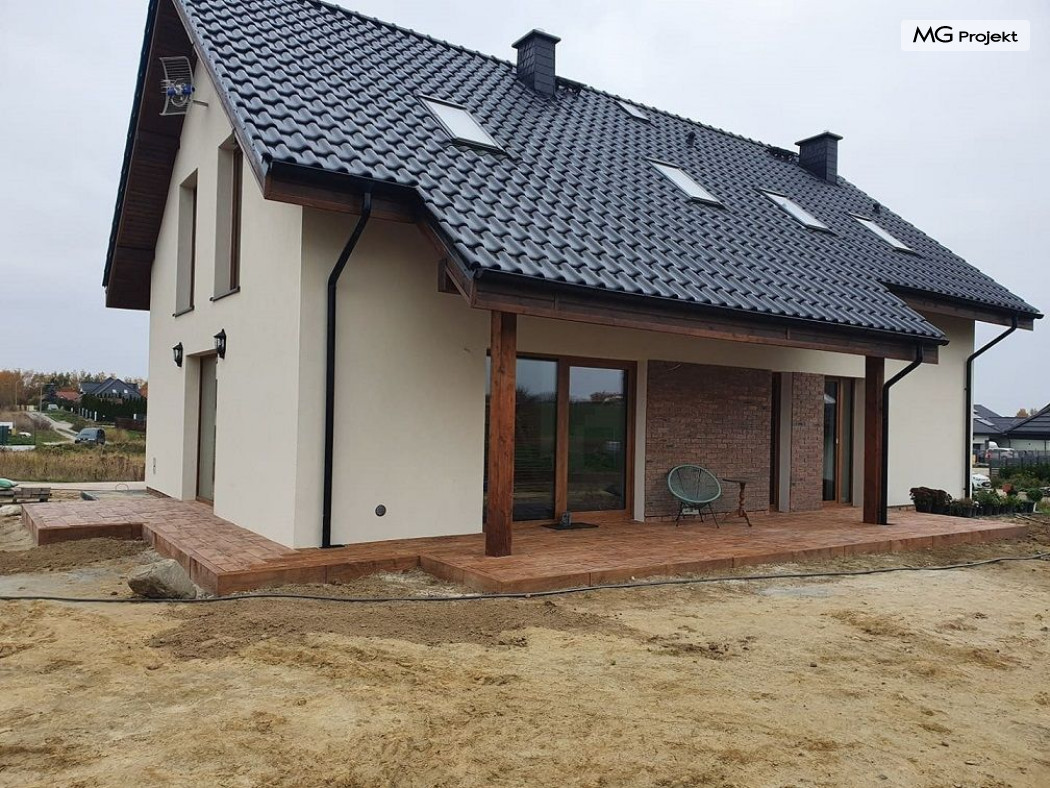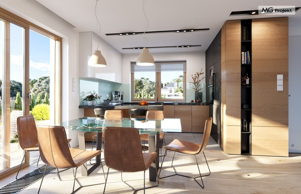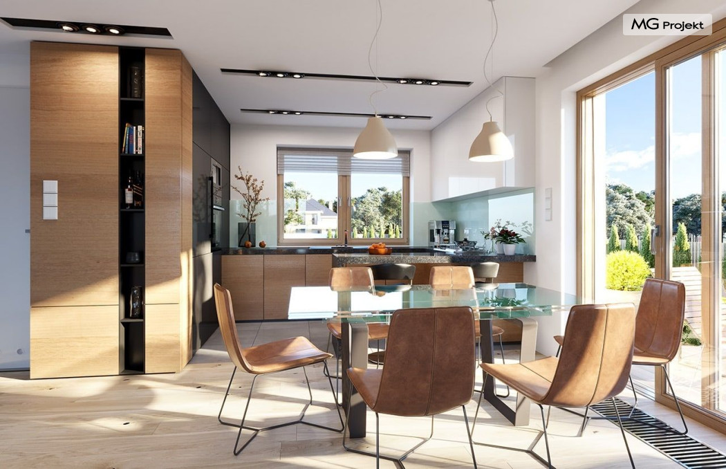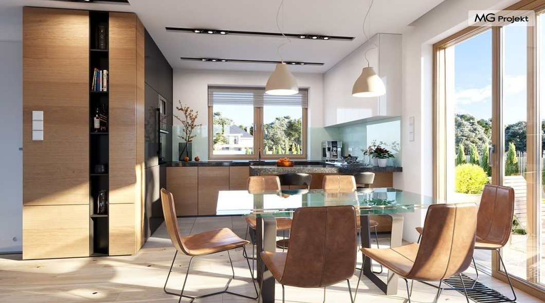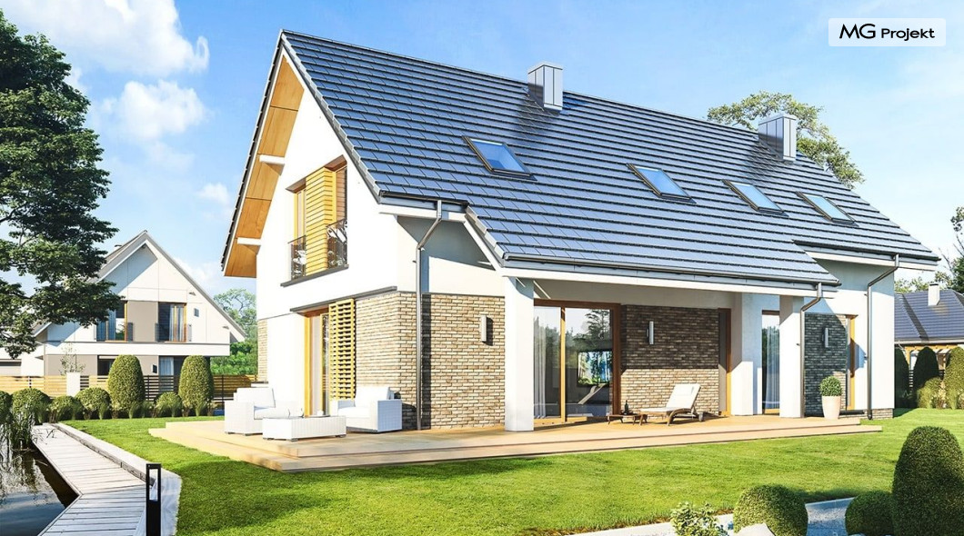 Projekt domu Biba jest kolejną wersją projektu z kolekcji „roztańczonych” domów. Jest on wariantową wersją projektu Party, z dachami spadzistymi nad wystającymi z głównej bryły domu: garażem i zadaszeniem tarasu. Projekt domu Biba pasuje na działkę gdzie plan miejscowy zakazuje stosowania daszków płaskich. Biba - to dom jednorodzinny, parterowy z poddaszem użytkowym, dla cztero-pięcioosobowej rodziny. Ze względu na dodatkowy pokój z łazienką na parterze, może być też odpowiedni dla rodziny trzypokoleniowej, z seniorami. W sensowniej, nie za dużej powierzchni udało się zmieścić cały program użytkowy - wszystkie potrzebne pomieszczenia. W projekcie domu Biba na parterze mamy dużą otwartą przestrzeń dzienną, łączącą salon ze ścianą kominkowo-telewizyjną, kącik na stół jadalny, kuchnię, oraz holl z reprezentacyjnymi schodami. Obok kuchni zaprojektowano spiżarnię z miejscem na dodatkową lodówkę. Wejście do domu zaplanowano przez obszerny przedsionek z szafami, połączony z garażem. Do przedsionka wchodzimy z dużego podcienia wejściowego, a następnie do holu szerokimi szklanymi drzwiami. Nieco na uboczu mamy dodatkowy pokój - gabinet lub sypialnię, oraz łazienkę z natryskiem i przydatnym schowkiem porządkowym pod podestem schodów. Na parterze przewidziano także duży dwustanowiskowy garaż i kotłownię. Na poddaszu mamy układ trzech sypialni, z komfortowym apartamentem rodziców, z własną łazienką i naprawdę ładną garderobą, oraz dwiema sypialniami dziecięcymi z szafami wbudowanymi, łazienką i pralnią dostępną z holu. Na samej górze mamy jeszcze nisty stryszek - domowy magazyn. Biorąc pod uwagę nieprzesadzoną powierzchnię użytkową, w domu udało się zaprojektować naprawdę komfortowe wnętrze. Architektura domu : dosyć prosta bryła z dwuspadowym dachem zyskała nowoczesny acz nie awangardowy wygląd dzięki dużym przeszkleniom połączonym z okładzinami klinkierowymi i drewnianymi. Dom doskonale wpasuje się w dowolne otoczenie, a jego architektura z pewnością będzie ponadczasowa i szybko się nie znudzi. W prostocie tkwi siła. Koszty : także w prostocie tkwią oszczędności. Dzięki nieskomplikowanym kształtom dom będzie łatwy i niedrogi w budowie, a potem w utrzymaniu. Budynek zaprojektowano jako energooszczędny, także koszty ogrzewania również nie zrujnują właścicieli. Projekt domu Biba to dobra solidna propozycja domu jednorodzinnego dla Klientów szukających rozsądnego projektu. Zapraszamy do zapoznania się z całą serią "roztańczonych domów": https://www.mgprojekt.com.pl/makarena, https://www.mgprojekt.com.pl/bolero, https://www.mgprojekt.com.pl/lambada, https://www.mgprojekt.com.pl/party, https://www.mgprojekt.com.pl/party-2, https://www.mgprojekt.com.pl/biba, https://www.mgprojekt.com.pl/tango, https://www.mgprojekt.com.pl/salsa, https://www.mgprojekt.com.pl/rumba, https://www.mgprojekt.com.pl/mambo, https://www.mgprojekt.com.pl/mambo, https://www.mgprojekt.com.pl/fokstrot, https://www.mgprojekt.com.pl/samba.