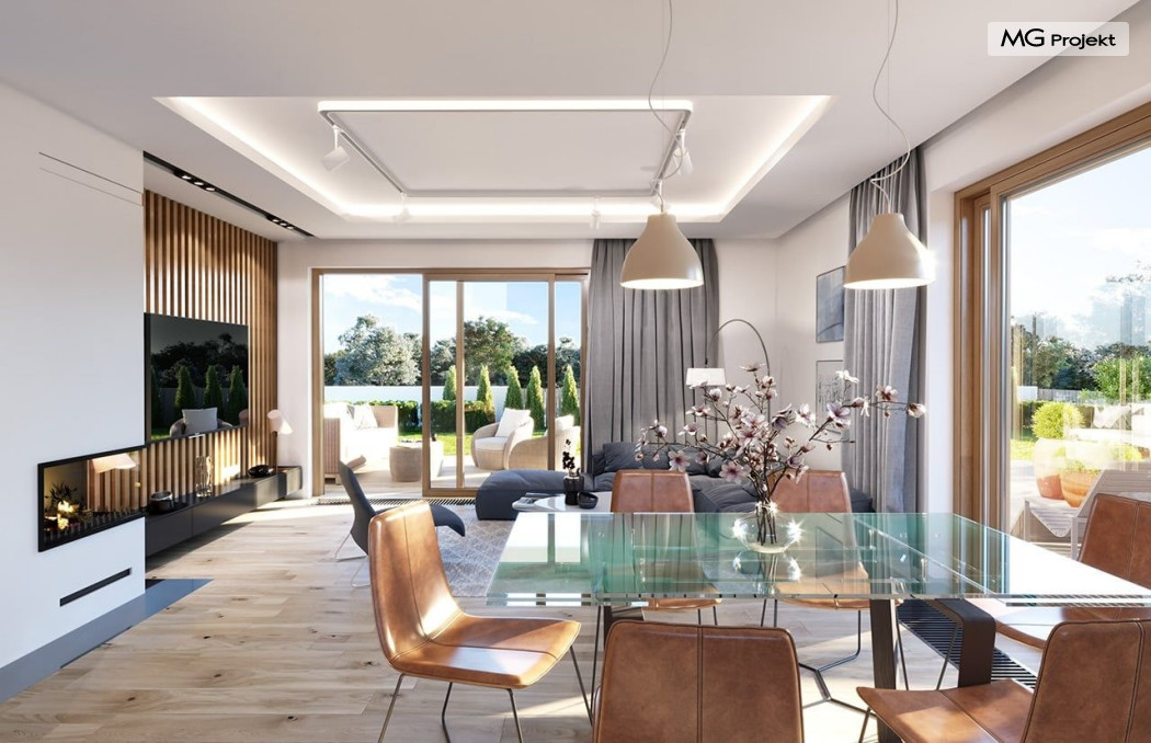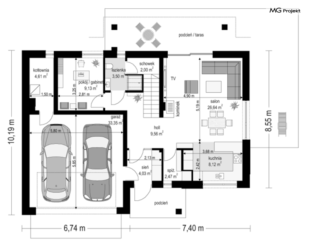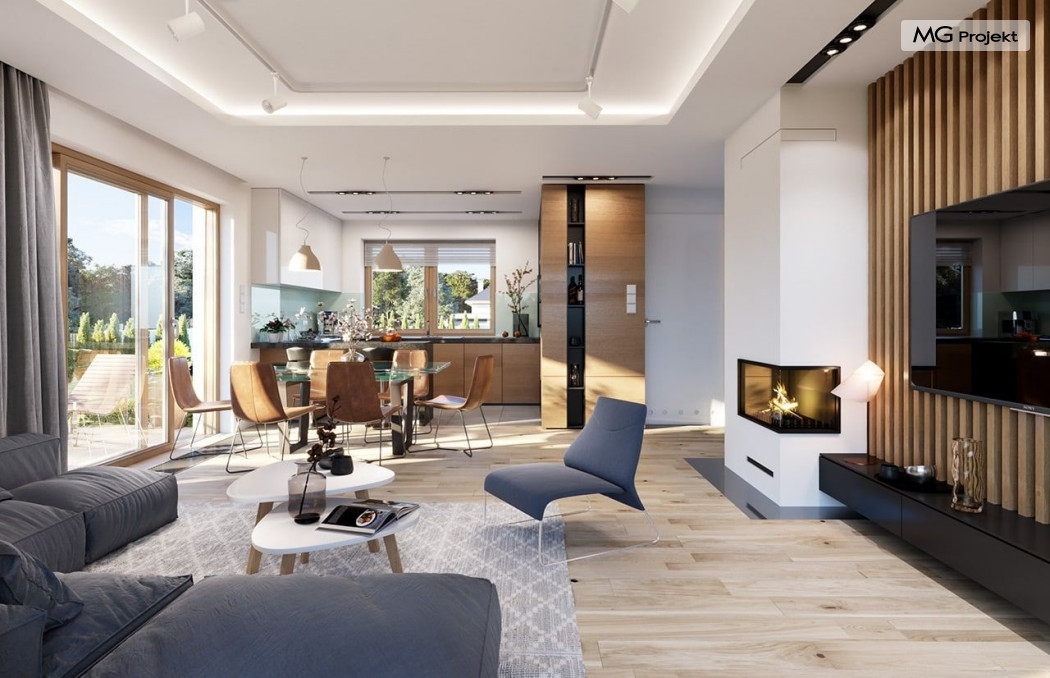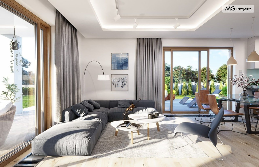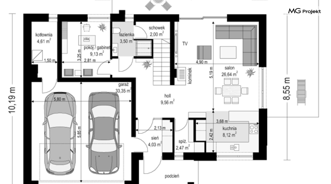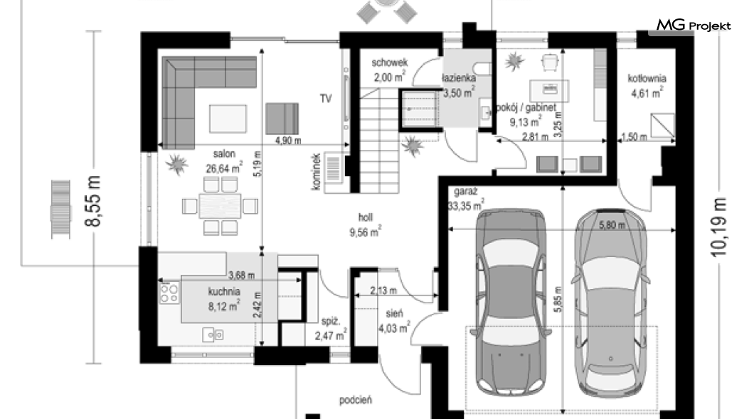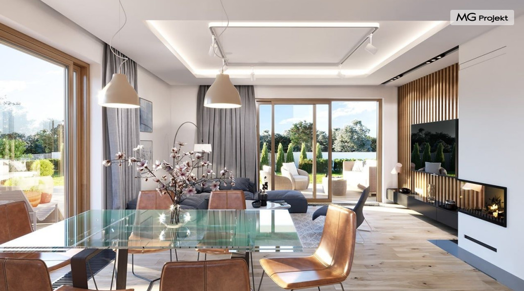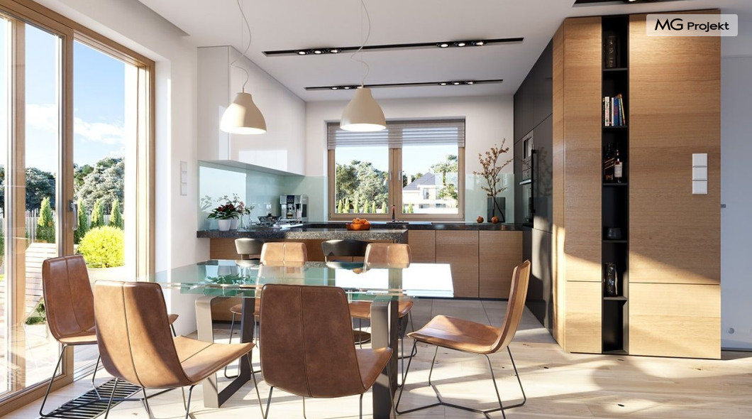 Projekt domu Biba jest kolejną wersją projektu z kolekcji „roztańczonych” domów. Jest on wariantową wersją projektu Party, z dachami spadzistymi nad wystającymi z głównej bryły domu: garażem i zadaszeniem tarasu. Projekt domu Biba pasuje na działkę gdzie plan miejscowy zakazuje stosowania daszków płaskich. Biba - to dom jednorodzinny, parterowy z poddaszem użytkowym, dla cztero-pięcioosobowej rodziny. Ze względu na dodatkowy pokój z łazienką na parterze, może być też odpowiedni dla rodziny trzypokoleniowej, z seniorami. W sensowniej, nie za dużej powierzchni udało się zmieścić cały program użytkowy - wszystkie potrzebne pomieszczenia. W projekcie domu Biba na parterze mamy dużą otwartą przestrzeń dzienną, łączącą salon ze ścianą kominkowo-telewizyjną, kącik na stół jadalny, kuchnię, oraz holl z reprezentacyjnymi schodami. Obok kuchni zaprojektowano spiżarnię z miejscem na dodatkową lodówkę. Wejście do domu zaplanowano przez obszerny przedsionek z szafami, połączony z garażem. Do przedsionka wchodzimy z dużego podcienia wejściowego, a następnie do holu szerokimi szklanymi drzwiami. Nieco na uboczu mamy dodatkowy pokój - gabinet lub sypialnię, oraz łazienkę z natryskiem i przydatnym schowkiem porządkowym pod podestem schodów. Na parterze przewidziano także duży dwustanowiskowy garaż i kotłownię. Na poddaszu mamy układ trzech sypialni, z komfortowym apartamentem rodziców, z własną łazienką i naprawdę ładną garderobą, oraz dwiema sypialniami dziecięcymi z szafami wbudowanymi, łazienką i pralnią dostępną z holu. Na samej górze mamy jeszcze nisty stryszek - domowy magazyn. Biorąc pod uwagę nieprzesadzoną powierzchnię użytkową, w domu udało się zaprojektować naprawdę komfortowe wnętrze. Architektura domu : dosyć prosta bryła z dwuspadowym dachem zyskała nowoczesny acz nie awangardowy wygląd dzięki dużym przeszkleniom połączonym z okładzinami klinkierowymi i drewnianymi. Dom doskonale wpasuje się w dowolne otoczenie, a jego architektura z pewnością będzie ponadczasowa i szybko się nie znudzi. W prostocie tkwi siła. Koszty : także w prostocie tkwią oszczędności. Dzięki nieskomplikowanym kształtom dom będzie łatwy i niedrogi w budowie, a potem w utrzymaniu. Budynek zaprojektowano jako energooszczędny, także koszty ogrzewania również nie zrujnują właścicieli. Projekt domu Biba to dobra solidna propozycja domu jednorodzinnego dla Klientów szukających rozsądnego projektu. Zapraszamy do zapoznania się z całą serią "roztańczonych domów": https://www.mgprojekt.com.pl/makarena, https://www.mgprojekt.com.pl/bolero, https://www.mgprojekt.com.pl/lambada, https://www.mgprojekt.com.pl/party, https://www.mgprojekt.com.pl/party-2, https://www.mgprojekt.com.pl/biba, https://www.mgprojekt.com.pl/tango, https://www.mgprojekt.com.pl/salsa, https://www.mgprojekt.com.pl/rumba, https://www.mgprojekt.com.pl/mambo, https://www.mgprojekt.com.pl/mambo, https://www.mgprojekt.com.pl/fokstrot, https://www.mgprojekt.com.pl/samba.