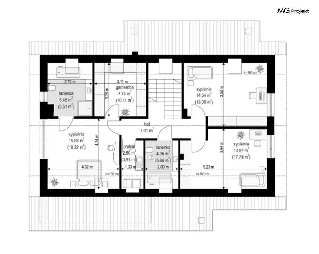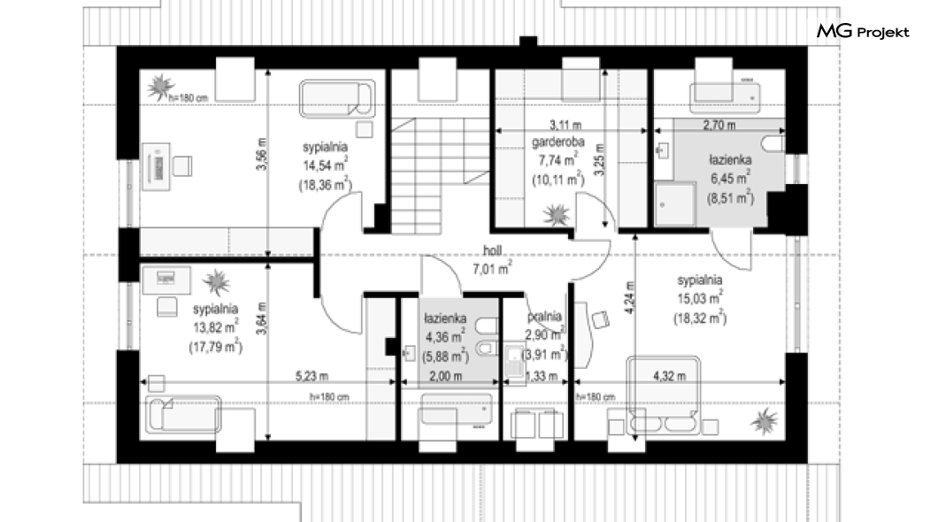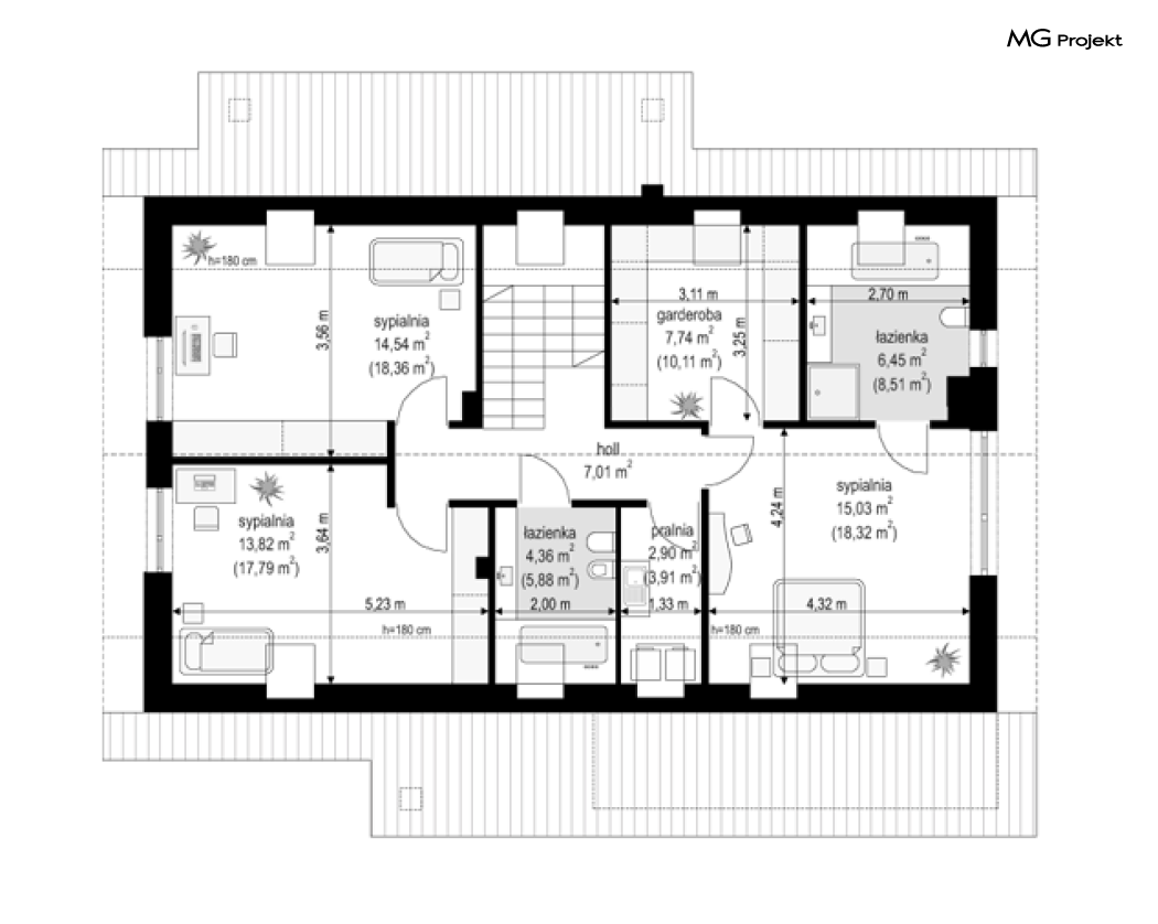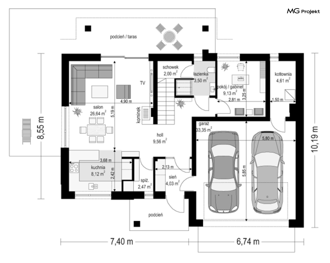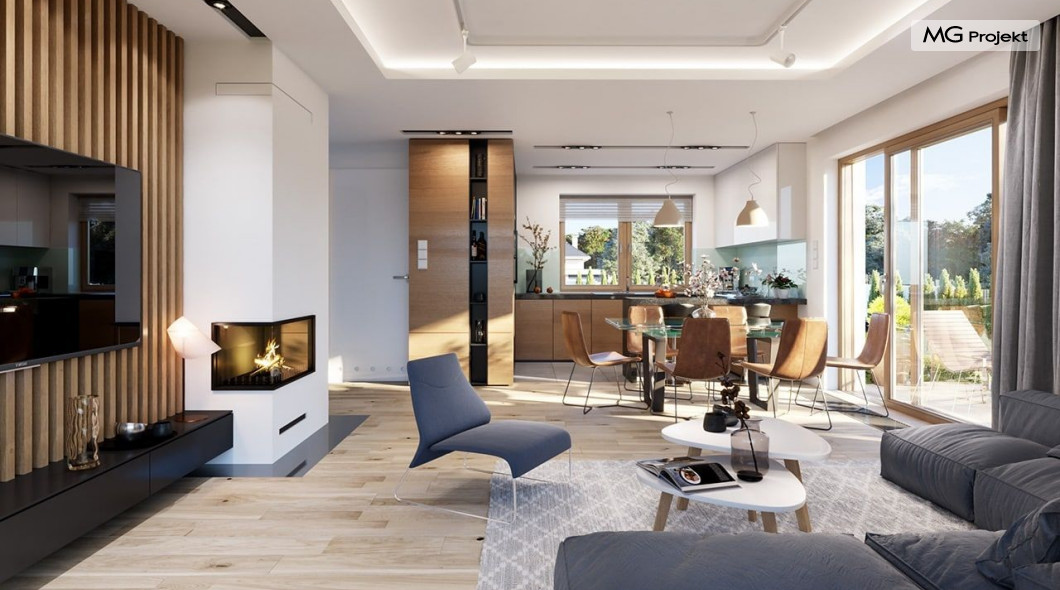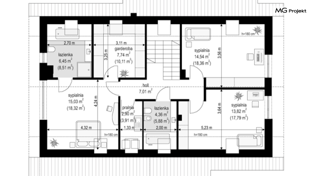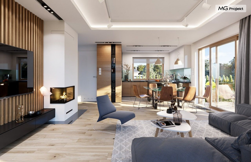 Projekt domu Biba jest kolejną wersją projektu z kolekcji „roztańczonych” domów. Jest on wariantową wersją projektu Party, z dachami spadzistymi nad wystającymi z głównej bryły domu: garażem i zadaszeniem tarasu. Projekt domu Biba pasuje na działkę gdzie plan miejscowy zakazuje stosowania daszków płaskich. Biba - to dom jednorodzinny, parterowy z poddaszem użytkowym, dla cztero-pięcioosobowej rodziny. Ze względu na dodatkowy pokój z łazienką na parterze, może być też odpowiedni dla rodziny trzypokoleniowej, z seniorami. W sensowniej, nie za dużej powierzchni udało się zmieścić cały program użytkowy - wszystkie potrzebne pomieszczenia. W projekcie domu Biba na parterze mamy dużą otwartą przestrzeń dzienną, łączącą salon ze ścianą kominkowo-telewizyjną, kącik na stół jadalny, kuchnię, oraz holl z reprezentacyjnymi schodami. Obok kuchni zaprojektowano spiżarnię z miejscem na dodatkową lodówkę. Wejście do domu zaplanowano przez obszerny przedsionek z szafami, połączony z garażem. Do przedsionka wchodzimy z dużego podcienia wejściowego, a następnie do holu szerokimi szklanymi drzwiami. Nieco na uboczu mamy dodatkowy pokój - gabinet lub sypialnię, oraz łazienkę z natryskiem i przydatnym schowkiem porządkowym pod podestem schodów. Na parterze przewidziano także duży dwustanowiskowy garaż i kotłownię. Na poddaszu mamy układ trzech sypialni, z komfortowym apartamentem rodziców, z własną łazienką i naprawdę ładną garderobą, oraz dwiema sypialniami dziecięcymi z szafami wbudowanymi, łazienką i pralnią dostępną z holu. Na samej górze mamy jeszcze nisty stryszek - domowy magazyn. Biorąc pod uwagę nieprzesadzoną powierzchnię użytkową, w domu udało się zaprojektować naprawdę komfortowe wnętrze. Architektura domu : dosyć prosta bryła z dwuspadowym dachem zyskała nowoczesny acz nie awangardowy wygląd dzięki dużym przeszkleniom połączonym z okładzinami klinkierowymi i drewnianymi. Dom doskonale wpasuje się w dowolne otoczenie, a jego architektura z pewnością będzie ponadczasowa i szybko się nie znudzi. W prostocie tkwi siła. Koszty : także w prostocie tkwią oszczędności. Dzięki nieskomplikowanym kształtom dom będzie łatwy i niedrogi w budowie, a potem w utrzymaniu. Budynek zaprojektowano jako energooszczędny, także koszty ogrzewania również nie zrujnują właścicieli. Projekt domu Biba to dobra solidna propozycja domu jednorodzinnego dla Klientów szukających rozsądnego projektu. Zapraszamy do zapoznania się z całą serią "roztańczonych domów": https://www.mgprojekt.com.pl/makarena, https://www.mgprojekt.com.pl/bolero, https://www.mgprojekt.com.pl/lambada, https://www.mgprojekt.com.pl/party, https://www.mgprojekt.com.pl/party-2, https://www.mgprojekt.com.pl/biba, https://www.mgprojekt.com.pl/tango, https://www.mgprojekt.com.pl/salsa, https://www.mgprojekt.com.pl/rumba, https://www.mgprojekt.com.pl/mambo, https://www.mgprojekt.com.pl/mambo, https://www.mgprojekt.com.pl/fokstrot, https://www.mgprojekt.com.pl/samba.
