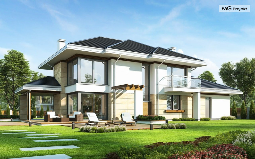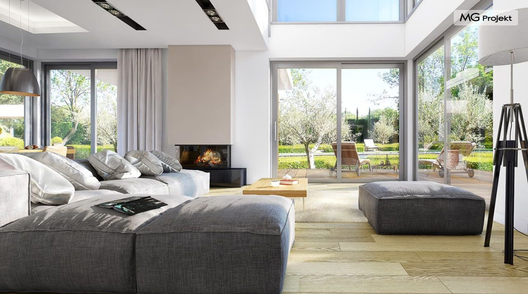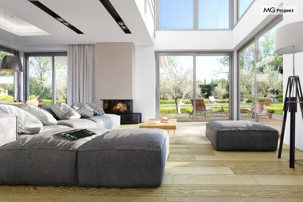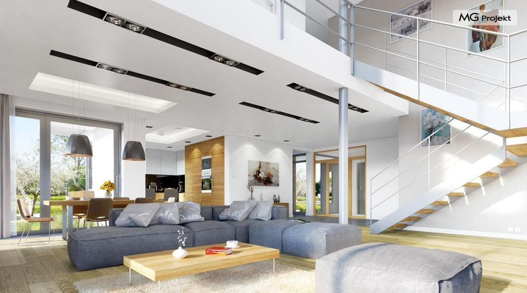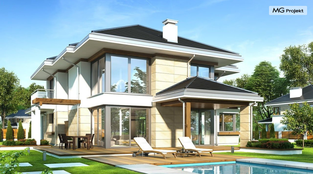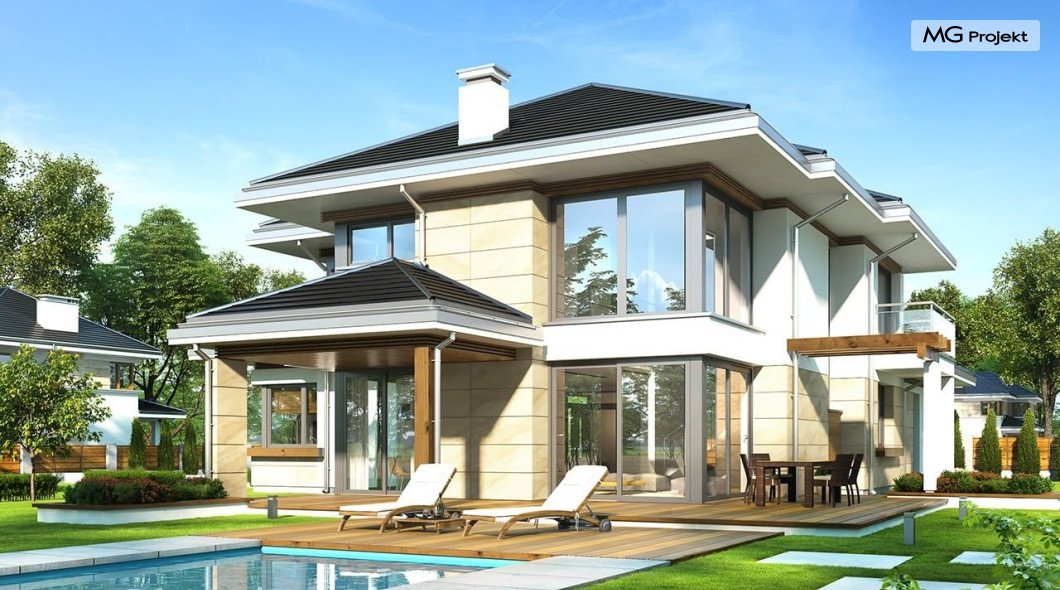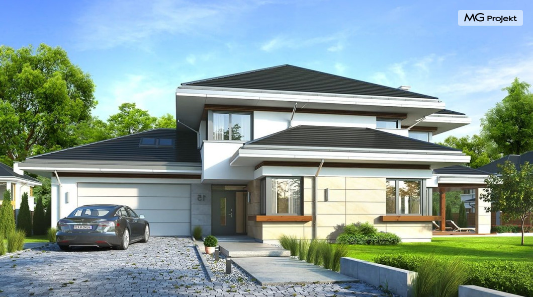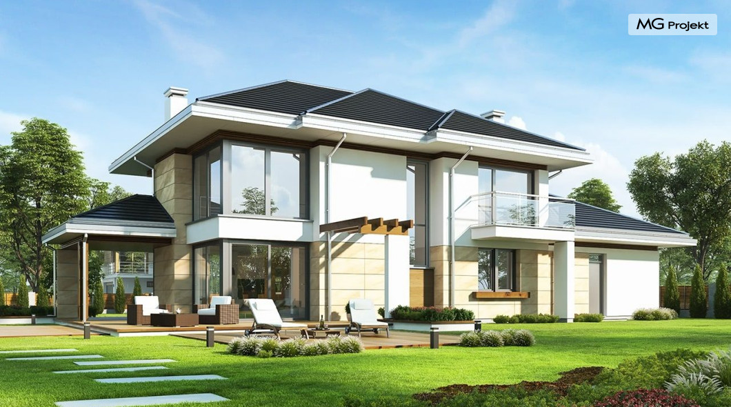 Projekt domu Dom z widokiem 6 jest kolejną wersją popularnego projektu Dom z widokiem. To wariant o zupełnie inaczej zaprojektowanym wnętrzu. Mianowicie część dzienna, salon i tarasy umieszczono tu w tylnej części domu. W związku z tym dom doskonale nadaje się na klasyczną działkę z ogrodem za domem i wejściem i wjazdem na działkę od nienasłonecznionej części działki. Projekt domu Dom z widokiem 6 to wyjątkowy projekt. Łączy w sobie wszystkie ciekawe elementy swoich poprzedników, ale ma też dodatkowe atrakcje, dające razem udaną propozycję pięknej nowoczesnej willi. Tak jak w pozostałych Domach z widokiem piętrowy rdzeń domu obudowany jest tutaj parterowymi mniejszymi bryłami. Cały budynek przykryty jest wielospadowymi łagodnymi dachami z szerokimi okapami. Motywem przewodnim są narożne duże okna - przeszklenia salonu, jadalni, kuchni. Szklany dwukondygnacyjny narożnik salonu z pustką ozdabia tym razem elewację tylną - ogrodową. Dom urozmaicony jest kamiennymi i drewnianymi okładzinami ścian, oraz daszkami, balkonami i pergolą nad tarasem. I choć w bryle domu nie brakuje „atrakcji”, to wszystkie elementy tworzą spójną i elegancką całość. Równie ciekawie prezentuje się wnętrze Domu z widokiem 6. Centralną część parteru stanowi piękny salon, z pustką nad jego fragmentem, oraz nad schodami będącymi ozdobą wnętrza. Z antresoli na piętrze możemy podziwiać pokój dzienny i widok na ogród. Do domu dostajemy się przeszklonym narożnym wejściem do przedsionka, a stąd do holu i pokoju dziennego. Przy wejściu mamy dodatkowy pokój – gabinet, a po przeciwległej stronie holu łazienkę z pralnią. Z przedsionka możemy przejść do garażu i pomieszczeń gospodarczych z kotłownią. Ładna kuchnia z dodatkową spiżarnią dostępna jest od strony holu i jadalni. Tarasy wokół przestrzeni dziennej układają się w literę L - część tarasu jest zadaszona. Piętro domu to trzy sypialnie i duża centralna łazienka. Sypialnia rodziców i jedna sypialni dziecięcych ma garderobę. Druga sypialnia dzieci - szafę wbudowaną. Część powierzchni piętra zajmuje malownicza antresola i otwarcie przestrzenne na parter. Nad garażem znajduje się stryszek gospodarczy dostępny z holu. Projekt domu Dom z widokiem 6 jest nieco mniejszy od swoich poprzedników, ale dzięki temu tańszy w realizacji. Jednocześnie dom nie traci na swojej atrakcyjności i na poczuciu przestronności jego wnętrza. Projekt domu Dom z widokiem 6 jest doskonałą propozycją dla inwestorów marzących o reprezentacyjnym, eleganckim, piętrowym domu, o nowoczesnej architekturze, oraz funkcjonalnym i oryginalnym wnętrzu. Zapraszamy do zapoznania się z pełną ofertą pracowni MG Projekt tej serii: Dom z widokiem, Dom z widokiem 2, Dom z widokiem 2C, Dom z widokiem 3, Dom z widokiem 3F, Dom z widokiem 4, Dom z widokiem 5, Dom z widokiem 6B, Dom z widokiem B, Dom z widokiem E.