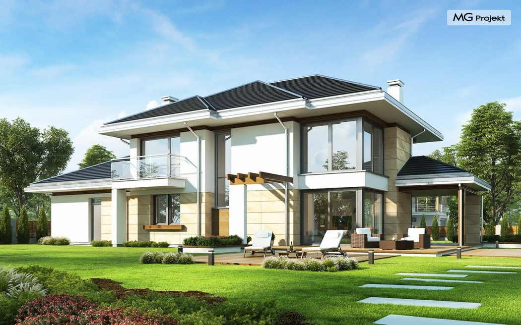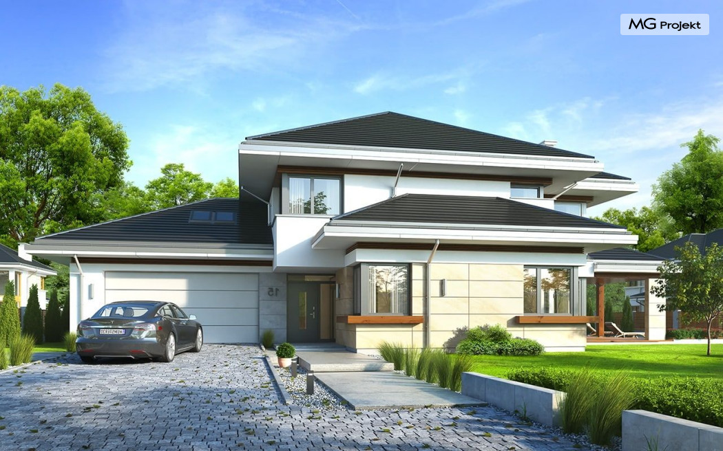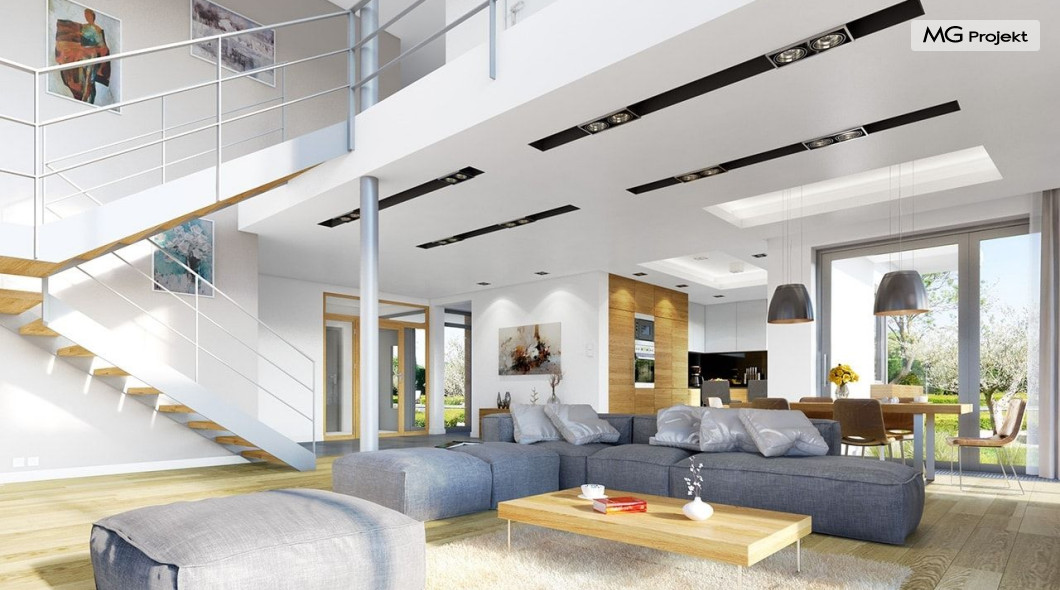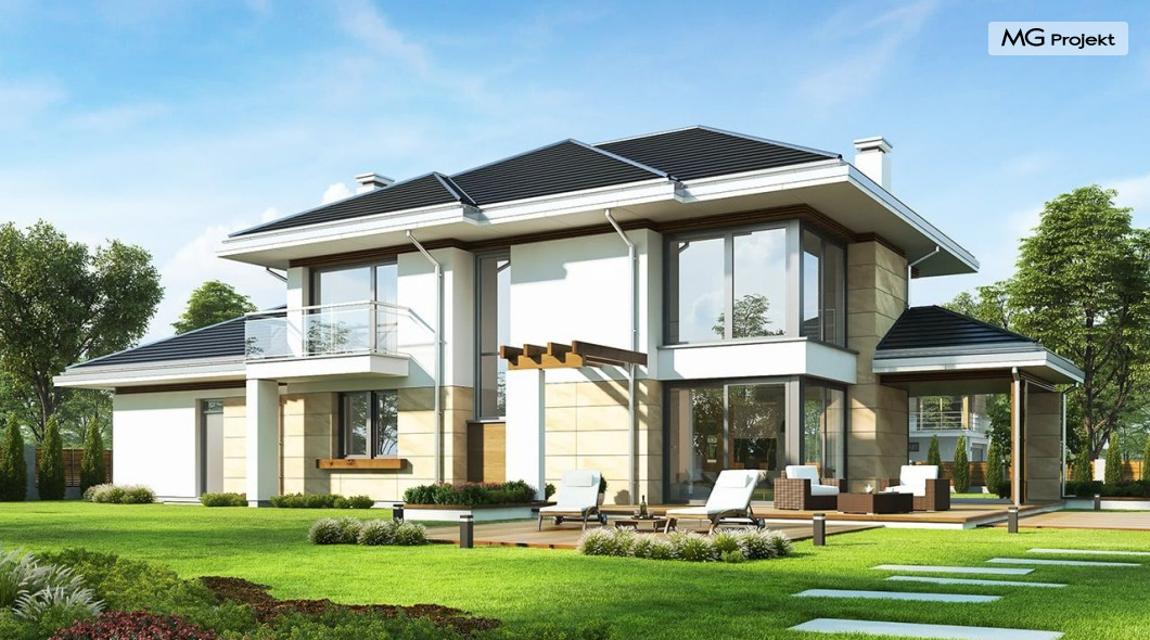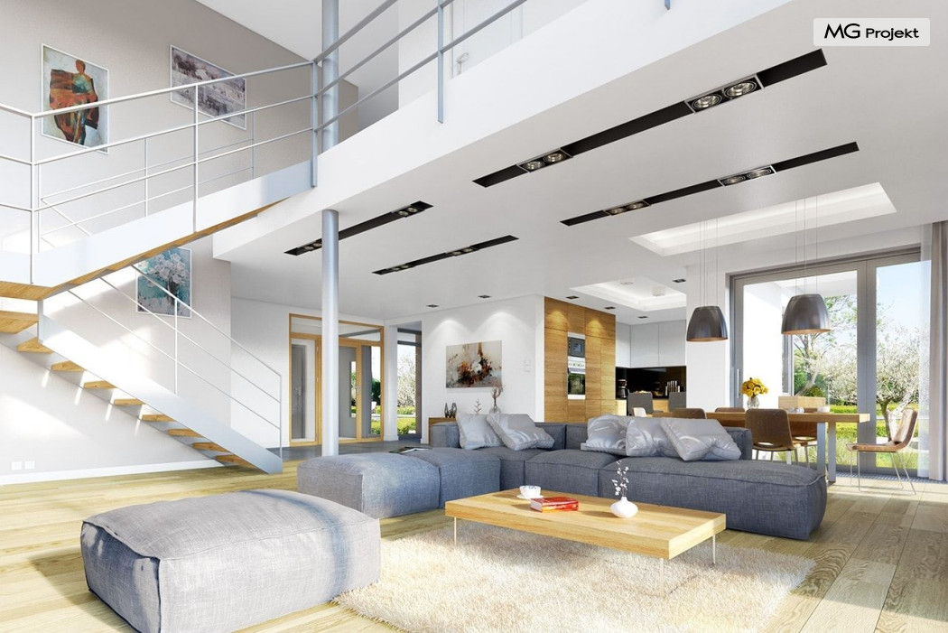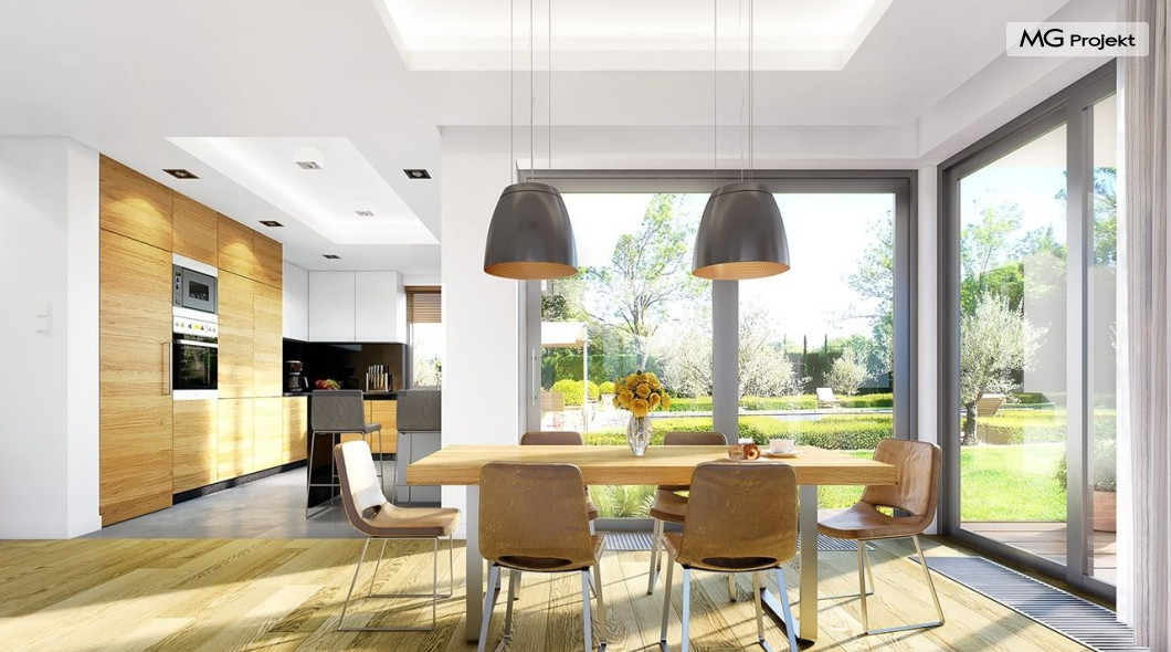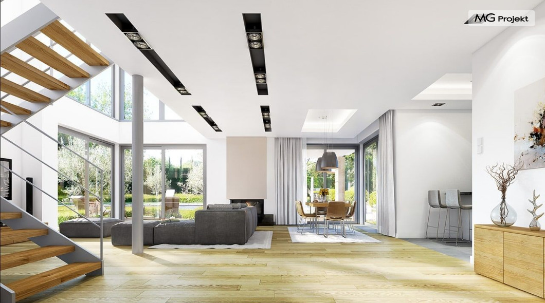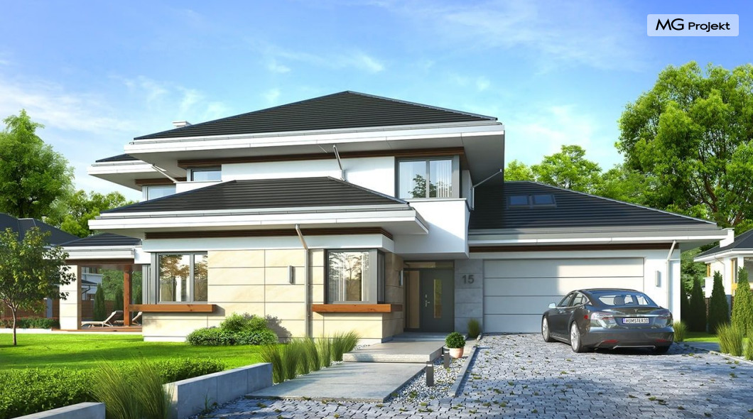 Projekt domu Dom z widokiem 6 jest kolejną wersją popularnego projektu Dom z widokiem. To wariant o zupełnie inaczej zaprojektowanym wnętrzu. Mianowicie część dzienna, salon i tarasy umieszczono tu w tylnej części domu. W związku z tym dom doskonale nadaje się na klasyczną działkę z ogrodem za domem i wejściem i wjazdem na działkę od nienasłonecznionej części działki. Projekt domu Dom z widokiem 6 to wyjątkowy projekt. Łączy w sobie wszystkie ciekawe elementy swoich poprzedników, ale ma też dodatkowe atrakcje, dające razem udaną propozycję pięknej nowoczesnej willi. Tak jak w pozostałych Domach z widokiem piętrowy rdzeń domu obudowany jest tutaj parterowymi mniejszymi bryłami. Cały budynek przykryty jest wielospadowymi łagodnymi dachami z szerokimi okapami. Motywem przewodnim są narożne duże okna - przeszklenia salonu, jadalni, kuchni. Szklany dwukondygnacyjny narożnik salonu z pustką ozdabia tym razem elewację tylną - ogrodową. Dom urozmaicony jest kamiennymi i drewnianymi okładzinami ścian, oraz daszkami, balkonami i pergolą nad tarasem. I choć w bryle domu nie brakuje „atrakcji”, to wszystkie elementy tworzą spójną i elegancką całość. Równie ciekawie prezentuje się wnętrze Domu z widokiem 6. Centralną część parteru stanowi piękny salon, z pustką nad jego fragmentem, oraz nad schodami będącymi ozdobą wnętrza. Z antresoli na piętrze możemy podziwiać pokój dzienny i widok na ogród. Do domu dostajemy się przeszklonym narożnym wejściem do przedsionka, a stąd do holu i pokoju dziennego. Przy wejściu mamy dodatkowy pokój – gabinet, a po przeciwległej stronie holu łazienkę z pralnią. Z przedsionka możemy przejść do garażu i pomieszczeń gospodarczych z kotłownią. Ładna kuchnia z dodatkową spiżarnią dostępna jest od strony holu i jadalni. Tarasy wokół przestrzeni dziennej układają się w literę L - część tarasu jest zadaszona. Piętro domu to trzy sypialnie i duża centralna łazienka. Sypialnia rodziców i jedna sypialni dziecięcych ma garderobę. Druga sypialnia dzieci - szafę wbudowaną. Część powierzchni piętra zajmuje malownicza antresola i otwarcie przestrzenne na parter. Nad garażem znajduje się stryszek gospodarczy dostępny z holu. Projekt domu Dom z widokiem 6 jest nieco mniejszy od swoich poprzedników, ale dzięki temu tańszy w realizacji. Jednocześnie dom nie traci na swojej atrakcyjności i na poczuciu przestronności jego wnętrza. Projekt domu Dom z widokiem 6 jest doskonałą propozycją dla inwestorów marzących o reprezentacyjnym, eleganckim, piętrowym domu, o nowoczesnej architekturze, oraz funkcjonalnym i oryginalnym wnętrzu. Zapraszamy do zapoznania się z pełną ofertą pracowni MG Projekt tej serii: Dom z widokiem, Dom z widokiem 2, Dom z widokiem 2C, Dom z widokiem 3, Dom z widokiem 3F, Dom z widokiem 4, Dom z widokiem 5, Dom z widokiem 6B, Dom z widokiem B, Dom z widokiem E.