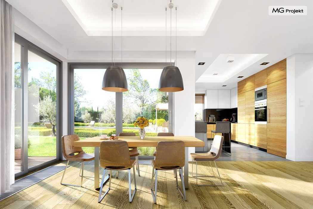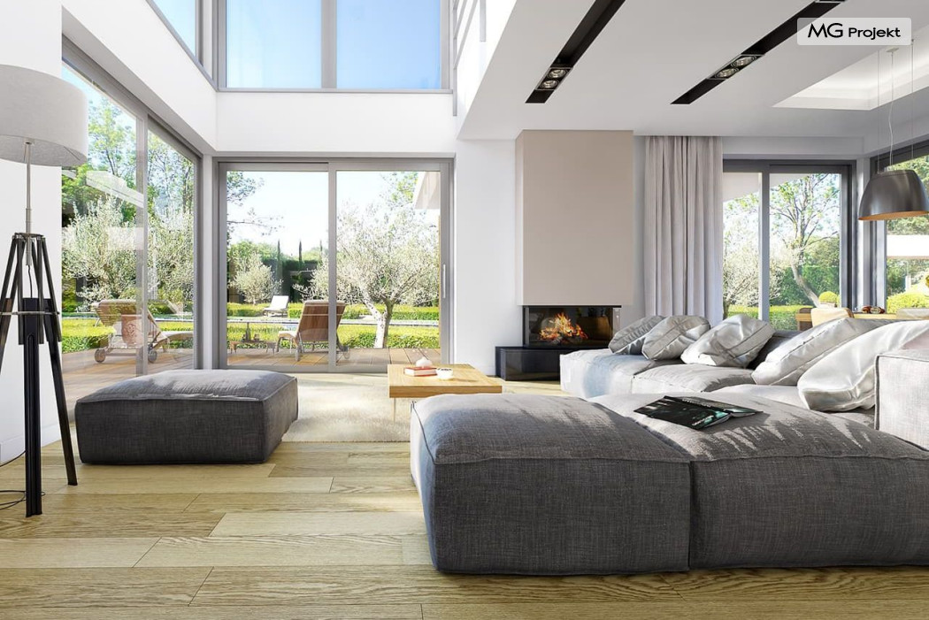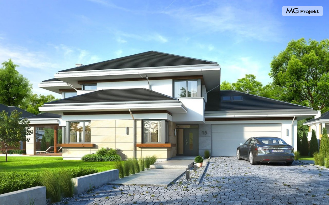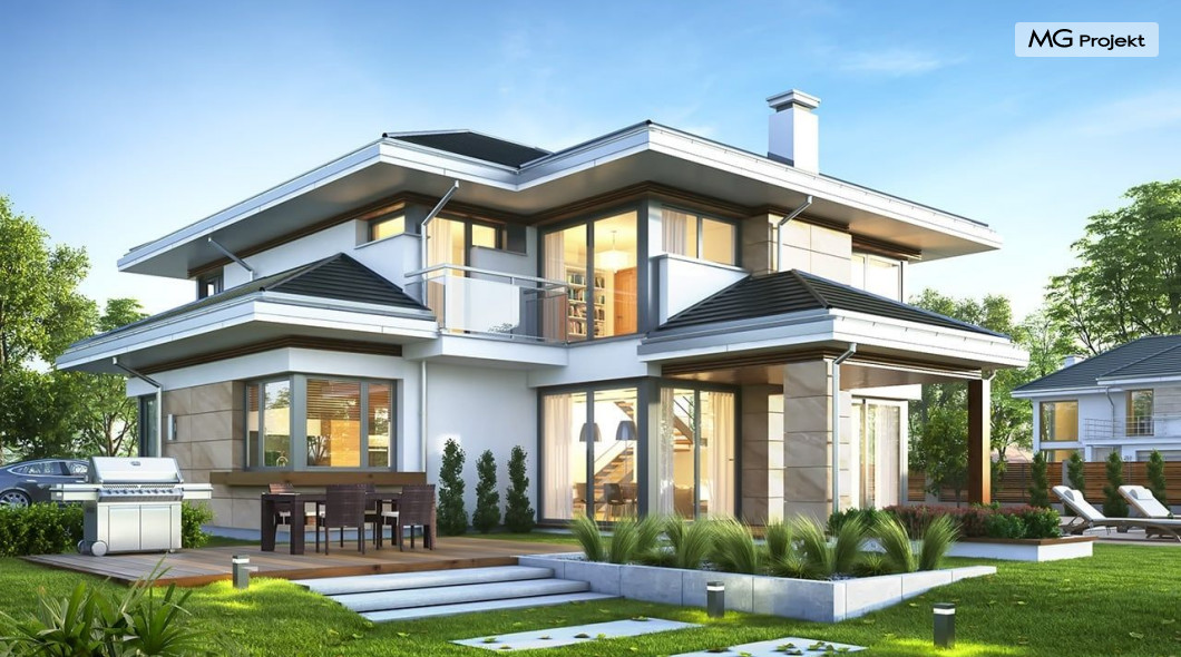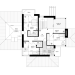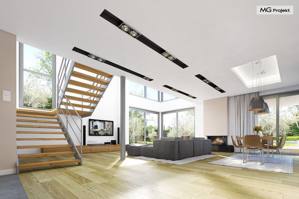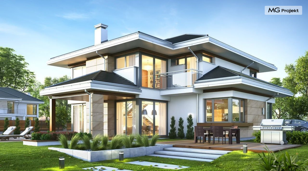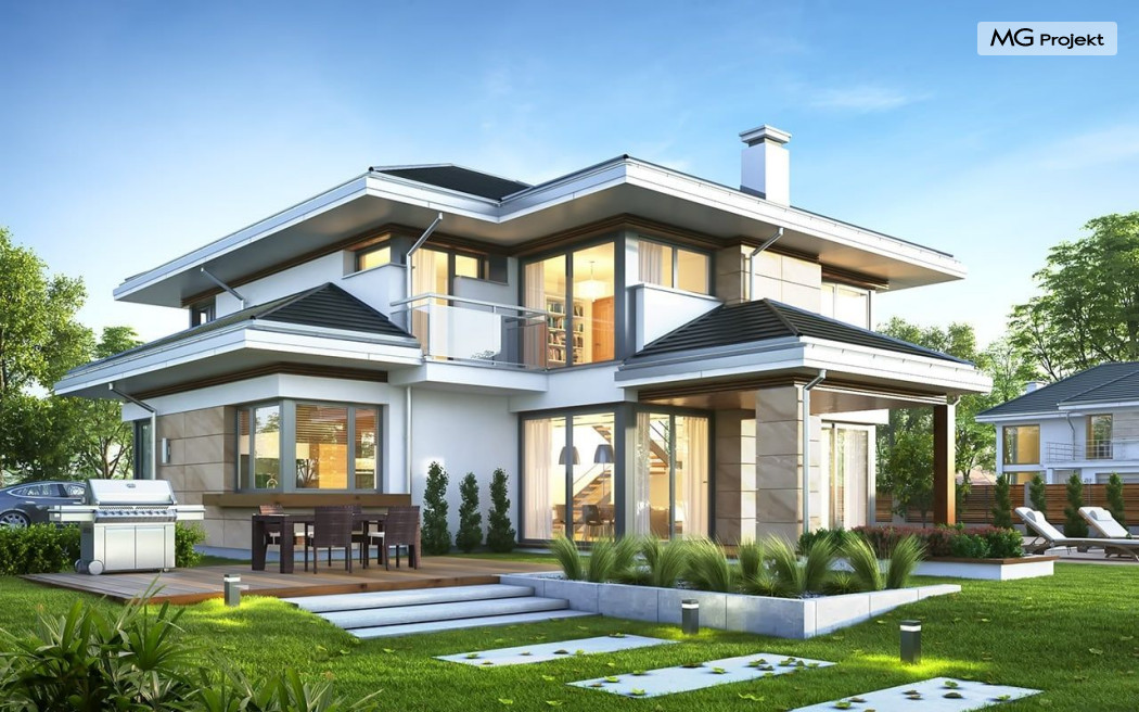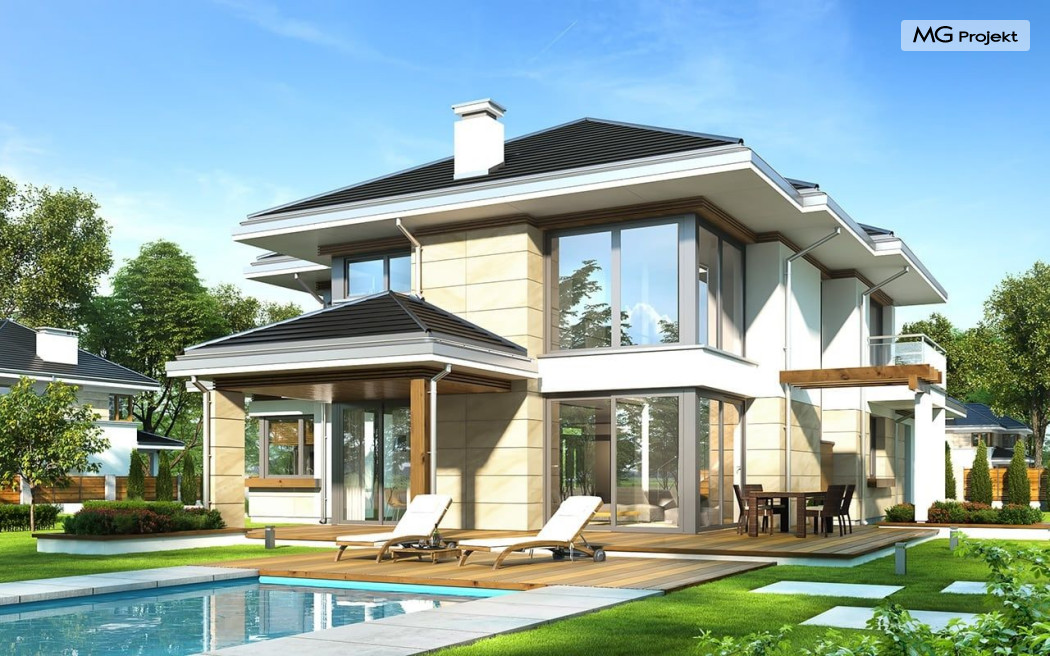 Projekt domu Dom z widokiem 6 jest kolejną wersją popularnego projektu Dom z widokiem. To wariant o zupełnie inaczej zaprojektowanym wnętrzu. Mianowicie część dzienna, salon i tarasy umieszczono tu w tylnej części domu. W związku z tym dom doskonale nadaje się na klasyczną działkę z ogrodem za domem i wejściem i wjazdem na działkę od nienasłonecznionej części działki. Projekt domu Dom z widokiem 6 to wyjątkowy projekt. Łączy w sobie wszystkie ciekawe elementy swoich poprzedników, ale ma też dodatkowe atrakcje, dające razem udaną propozycję pięknej nowoczesnej willi. Tak jak w pozostałych Domach z widokiem piętrowy rdzeń domu obudowany jest tutaj parterowymi mniejszymi bryłami. Cały budynek przykryty jest wielospadowymi łagodnymi dachami z szerokimi okapami. Motywem przewodnim są narożne duże okna - przeszklenia salonu, jadalni, kuchni. Szklany dwukondygnacyjny narożnik salonu z pustką ozdabia tym razem elewację tylną - ogrodową. Dom urozmaicony jest kamiennymi i drewnianymi okładzinami ścian, oraz daszkami, balkonami i pergolą nad tarasem. I choć w bryle domu nie brakuje „atrakcji”, to wszystkie elementy tworzą spójną i elegancką całość. Równie ciekawie prezentuje się wnętrze Domu z widokiem 6. Centralną część parteru stanowi piękny salon, z pustką nad jego fragmentem, oraz nad schodami będącymi ozdobą wnętrza. Z antresoli na piętrze możemy podziwiać pokój dzienny i widok na ogród. Do domu dostajemy się przeszklonym narożnym wejściem do przedsionka, a stąd do holu i pokoju dziennego. Przy wejściu mamy dodatkowy pokój – gabinet, a po przeciwległej stronie holu łazienkę z pralnią. Z przedsionka możemy przejść do garażu i pomieszczeń gospodarczych z kotłownią. Ładna kuchnia z dodatkową spiżarnią dostępna jest od strony holu i jadalni. Tarasy wokół przestrzeni dziennej układają się w literę L - część tarasu jest zadaszona. Piętro domu to trzy sypialnie i duża centralna łazienka. Sypialnia rodziców i jedna sypialni dziecięcych ma garderobę. Druga sypialnia dzieci - szafę wbudowaną. Część powierzchni piętra zajmuje malownicza antresola i otwarcie przestrzenne na parter. Nad garażem znajduje się stryszek gospodarczy dostępny z holu. Projekt domu Dom z widokiem 6 jest nieco mniejszy od swoich poprzedników, ale dzięki temu tańszy w realizacji. Jednocześnie dom nie traci na swojej atrakcyjności i na poczuciu przestronności jego wnętrza. Projekt domu Dom z widokiem 6 jest doskonałą propozycją dla inwestorów marzących o reprezentacyjnym, eleganckim, piętrowym domu, o nowoczesnej architekturze, oraz funkcjonalnym i oryginalnym wnętrzu. Zapraszamy do zapoznania się z pełną ofertą pracowni MG Projekt tej serii: Dom z widokiem, Dom z widokiem 2, Dom z widokiem 2C, Dom z widokiem 3, Dom z widokiem 3F, Dom z widokiem 4, Dom z widokiem 5, Dom z widokiem 6B, Dom z widokiem B, Dom z widokiem E.