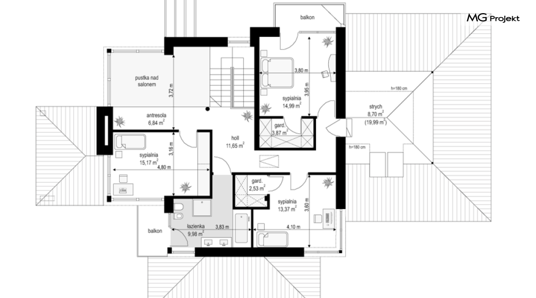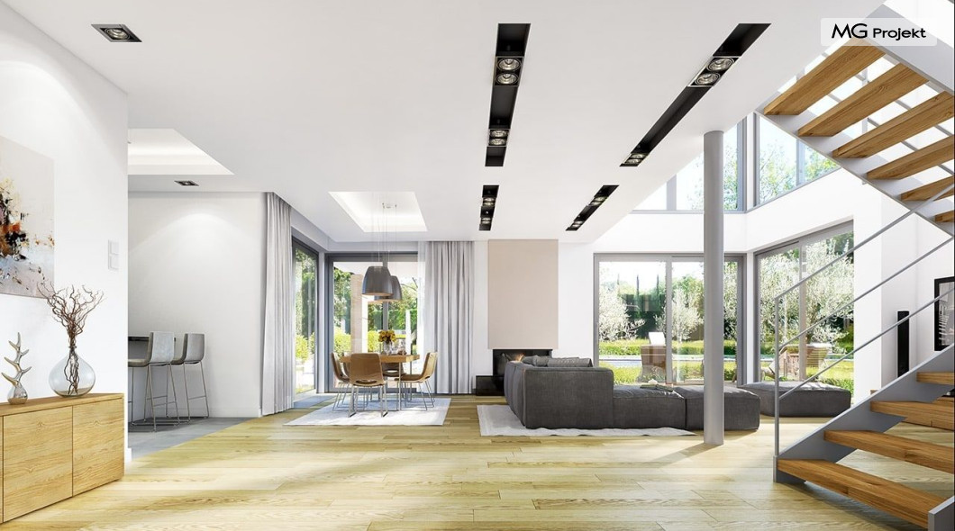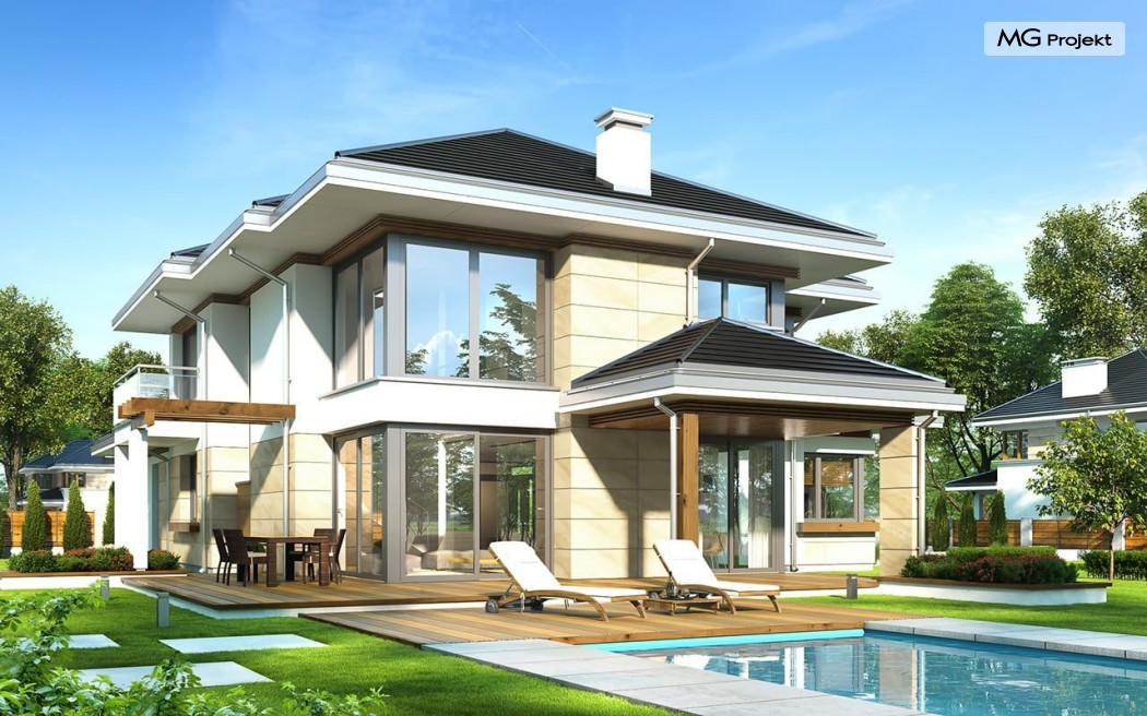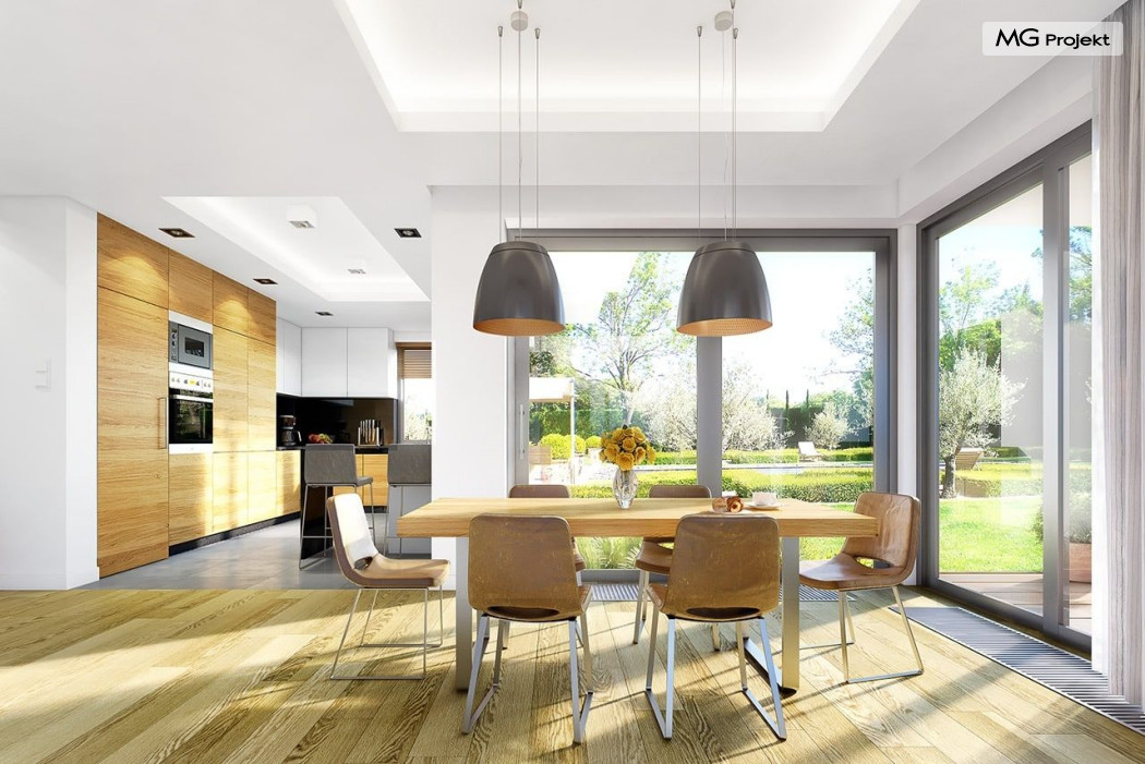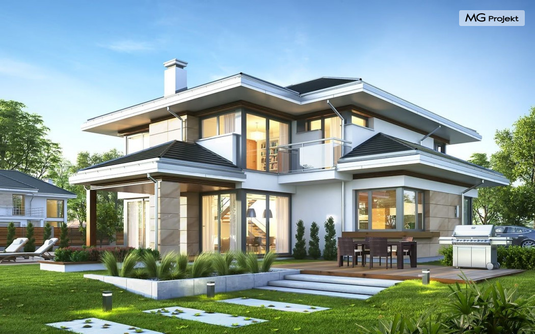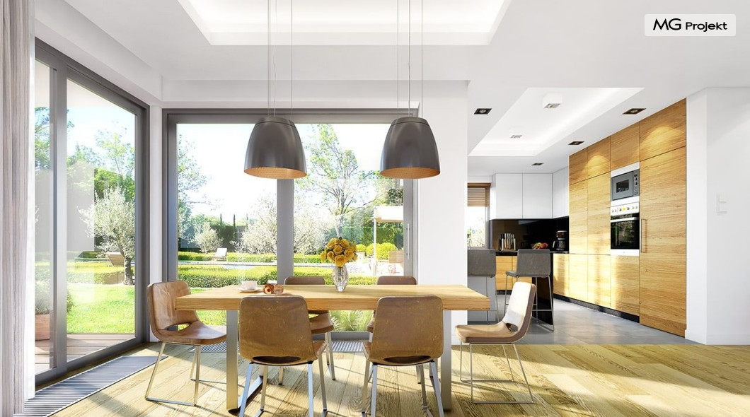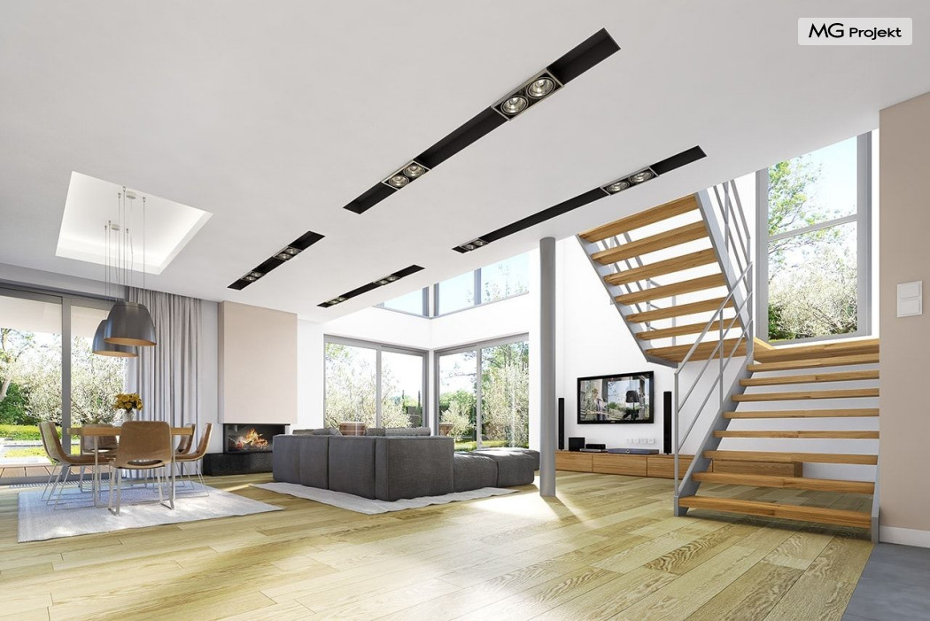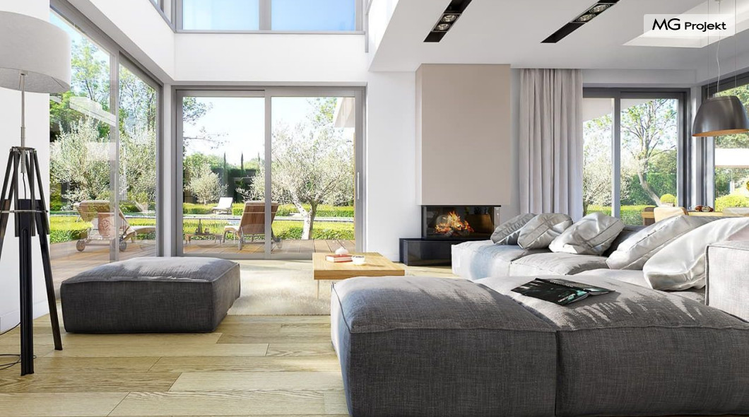 Projekt domu Dom z widokiem 6 jest kolejną wersją popularnego projektu Dom z widokiem. To wariant o zupełnie inaczej zaprojektowanym wnętrzu. Mianowicie część dzienna, salon i tarasy umieszczono tu w tylnej części domu. W związku z tym dom doskonale nadaje się na klasyczną działkę z ogrodem za domem i wejściem i wjazdem na działkę od nienasłonecznionej części działki. Projekt domu Dom z widokiem 6 to wyjątkowy projekt. Łączy w sobie wszystkie ciekawe elementy swoich poprzedników, ale ma też dodatkowe atrakcje, dające razem udaną propozycję pięknej nowoczesnej willi. Tak jak w pozostałych Domach z widokiem piętrowy rdzeń domu obudowany jest tutaj parterowymi mniejszymi bryłami. Cały budynek przykryty jest wielospadowymi łagodnymi dachami z szerokimi okapami. Motywem przewodnim są narożne duże okna - przeszklenia salonu, jadalni, kuchni. Szklany dwukondygnacyjny narożnik salonu z pustką ozdabia tym razem elewację tylną - ogrodową. Dom urozmaicony jest kamiennymi i drewnianymi okładzinami ścian, oraz daszkami, balkonami i pergolą nad tarasem. I choć w bryle domu nie brakuje „atrakcji”, to wszystkie elementy tworzą spójną i elegancką całość. Równie ciekawie prezentuje się wnętrze Domu z widokiem 6. Centralną część parteru stanowi piękny salon, z pustką nad jego fragmentem, oraz nad schodami będącymi ozdobą wnętrza. Z antresoli na piętrze możemy podziwiać pokój dzienny i widok na ogród. Do domu dostajemy się przeszklonym narożnym wejściem do przedsionka, a stąd do holu i pokoju dziennego. Przy wejściu mamy dodatkowy pokój – gabinet, a po przeciwległej stronie holu łazienkę z pralnią. Z przedsionka możemy przejść do garażu i pomieszczeń gospodarczych z kotłownią. Ładna kuchnia z dodatkową spiżarnią dostępna jest od strony holu i jadalni. Tarasy wokół przestrzeni dziennej układają się w literę L - część tarasu jest zadaszona. Piętro domu to trzy sypialnie i duża centralna łazienka. Sypialnia rodziców i jedna sypialni dziecięcych ma garderobę. Druga sypialnia dzieci - szafę wbudowaną. Część powierzchni piętra zajmuje malownicza antresola i otwarcie przestrzenne na parter. Nad garażem znajduje się stryszek gospodarczy dostępny z holu. Projekt domu Dom z widokiem 6 jest nieco mniejszy od swoich poprzedników, ale dzięki temu tańszy w realizacji. Jednocześnie dom nie traci na swojej atrakcyjności i na poczuciu przestronności jego wnętrza. Projekt domu Dom z widokiem 6 jest doskonałą propozycją dla inwestorów marzących o reprezentacyjnym, eleganckim, piętrowym domu, o nowoczesnej architekturze, oraz funkcjonalnym i oryginalnym wnętrzu. Zapraszamy do zapoznania się z pełną ofertą pracowni MG Projekt tej serii: Dom z widokiem, Dom z widokiem 2, Dom z widokiem 2C, Dom z widokiem 3, Dom z widokiem 3F, Dom z widokiem 4, Dom z widokiem 5, Dom z widokiem 6B, Dom z widokiem B, Dom z widokiem E.
