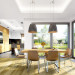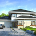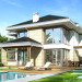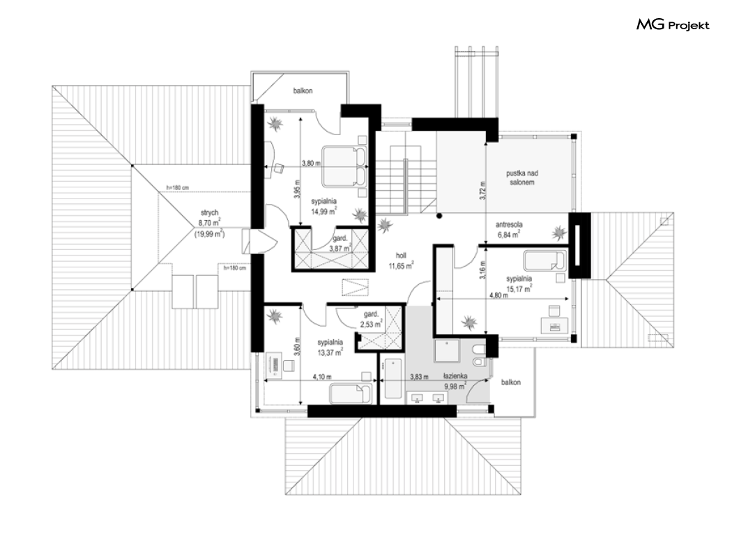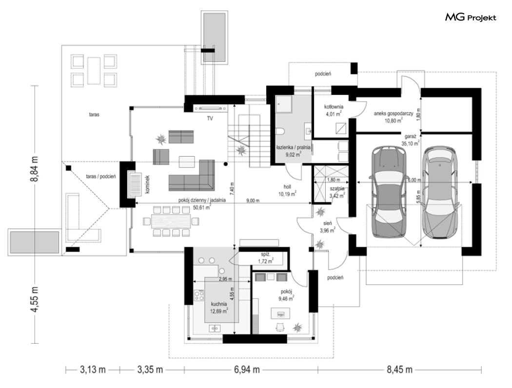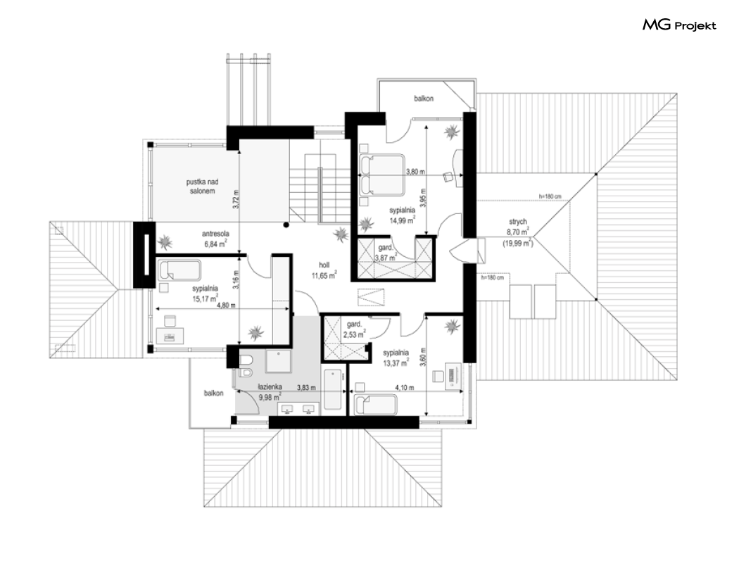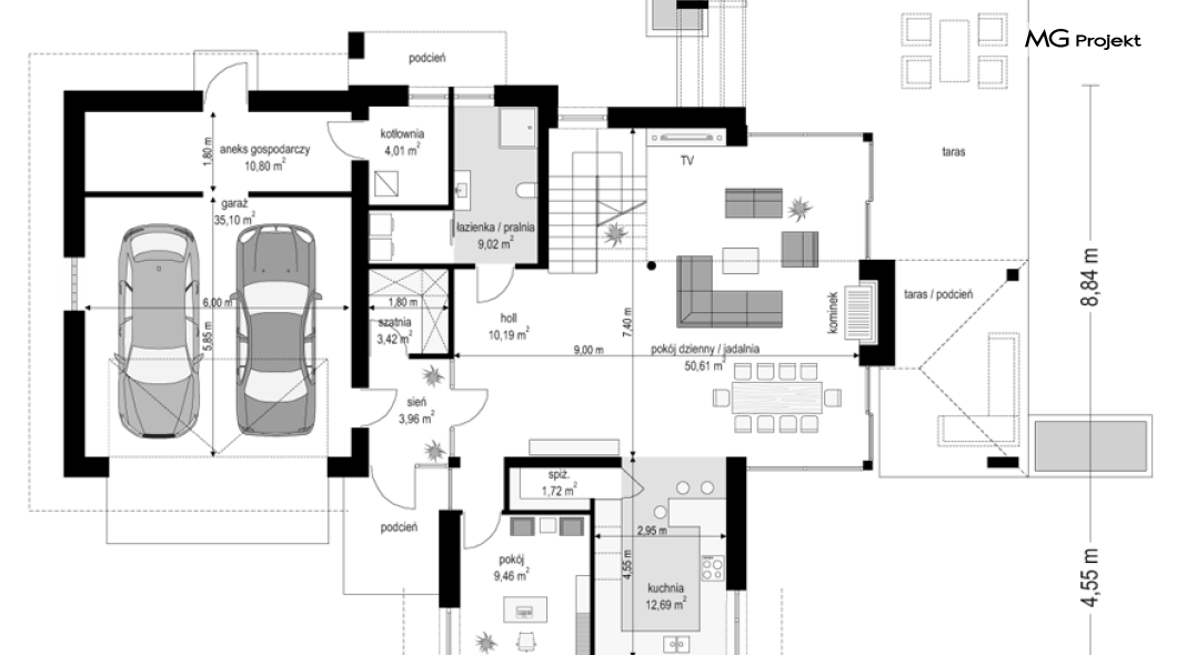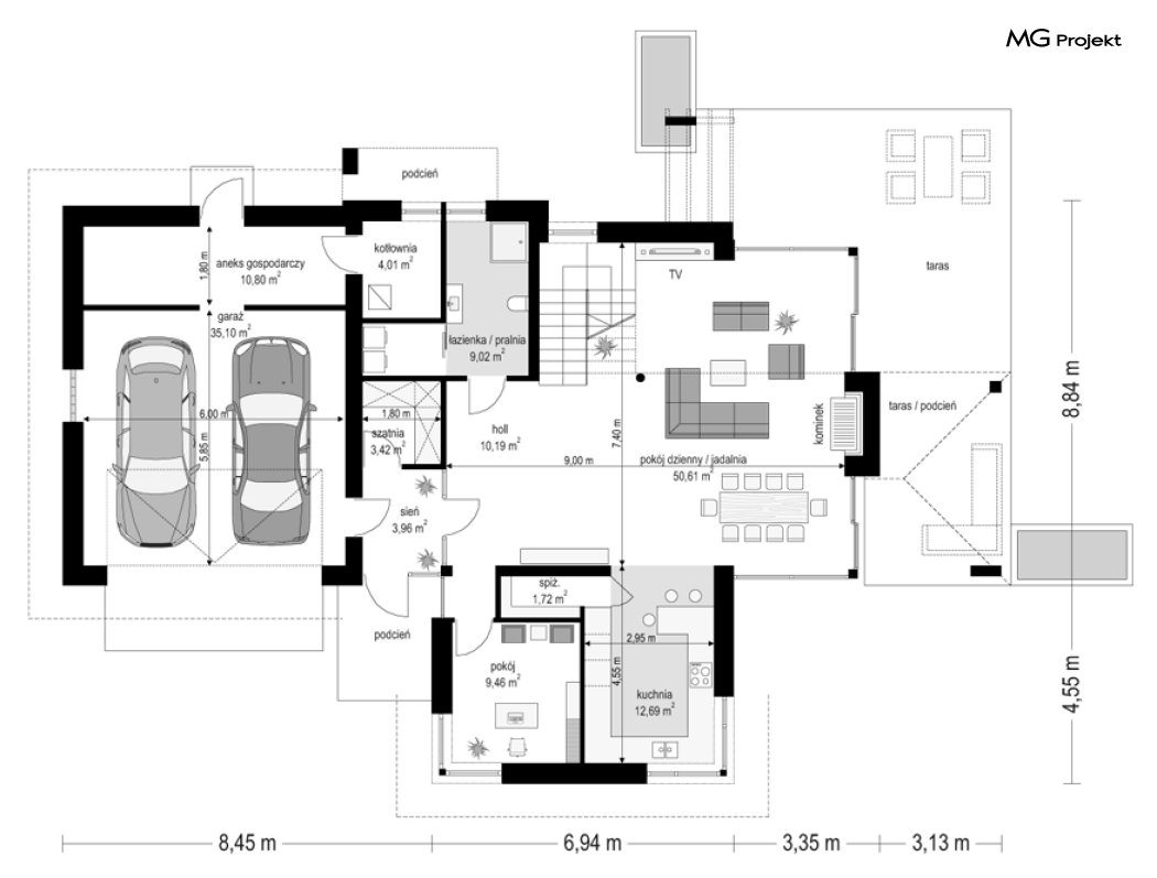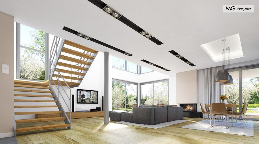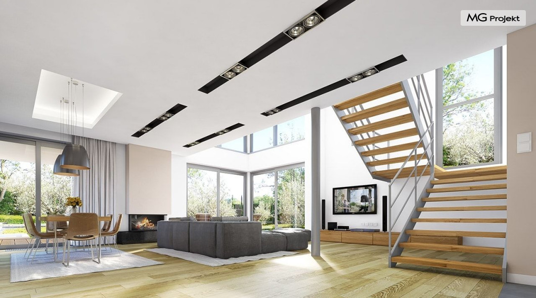 Projekt domu Dom z widokiem 6 jest kolejną wersją popularnego projektu Dom z widokiem. To wariant o zupełnie inaczej zaprojektowanym wnętrzu. Mianowicie część dzienna, salon i tarasy umieszczono tu w tylnej części domu. W związku z tym dom doskonale nadaje się na klasyczną działkę z ogrodem za domem i wejściem i wjazdem na działkę od nienasłonecznionej części działki. Projekt domu Dom z widokiem 6 to wyjątkowy projekt. Łączy w sobie wszystkie ciekawe elementy swoich poprzedników, ale ma też dodatkowe atrakcje, dające razem udaną propozycję pięknej nowoczesnej willi. Tak jak w pozostałych Domach z widokiem piętrowy rdzeń domu obudowany jest tutaj parterowymi mniejszymi bryłami. Cały budynek przykryty jest wielospadowymi łagodnymi dachami z szerokimi okapami. Motywem przewodnim są narożne duże okna - przeszklenia salonu, jadalni, kuchni. Szklany dwukondygnacyjny narożnik salonu z pustką ozdabia tym razem elewację tylną - ogrodową. Dom urozmaicony jest kamiennymi i drewnianymi okładzinami ścian, oraz daszkami, balkonami i pergolą nad tarasem. I choć w bryle domu nie brakuje „atrakcji”, to wszystkie elementy tworzą spójną i elegancką całość. Równie ciekawie prezentuje się wnętrze Domu z widokiem 6. Centralną część parteru stanowi piękny salon, z pustką nad jego fragmentem, oraz nad schodami będącymi ozdobą wnętrza. Z antresoli na piętrze możemy podziwiać pokój dzienny i widok na ogród. Do domu dostajemy się przeszklonym narożnym wejściem do przedsionka, a stąd do holu i pokoju dziennego. Przy wejściu mamy dodatkowy pokój – gabinet, a po przeciwległej stronie holu łazienkę z pralnią. Z przedsionka możemy przejść do garażu i pomieszczeń gospodarczych z kotłownią. Ładna kuchnia z dodatkową spiżarnią dostępna jest od strony holu i jadalni. Tarasy wokół przestrzeni dziennej układają się w literę L - część tarasu jest zadaszona. Piętro domu to trzy sypialnie i duża centralna łazienka. Sypialnia rodziców i jedna sypialni dziecięcych ma garderobę. Druga sypialnia dzieci - szafę wbudowaną. Część powierzchni piętra zajmuje malownicza antresola i otwarcie przestrzenne na parter. Nad garażem znajduje się stryszek gospodarczy dostępny z holu. Projekt domu Dom z widokiem 6 jest nieco mniejszy od swoich poprzedników, ale dzięki temu tańszy w realizacji. Jednocześnie dom nie traci na swojej atrakcyjności i na poczuciu przestronności jego wnętrza. Projekt domu Dom z widokiem 6 jest doskonałą propozycją dla inwestorów marzących o reprezentacyjnym, eleganckim, piętrowym domu, o nowoczesnej architekturze, oraz funkcjonalnym i oryginalnym wnętrzu. Zapraszamy do zapoznania się z pełną ofertą pracowni MG Projekt tej serii: Dom z widokiem, Dom z widokiem 2, Dom z widokiem 2C, Dom z widokiem 3, Dom z widokiem 3F, Dom z widokiem 4, Dom z widokiem 5, Dom z widokiem 6B, Dom z widokiem B, Dom z widokiem E.