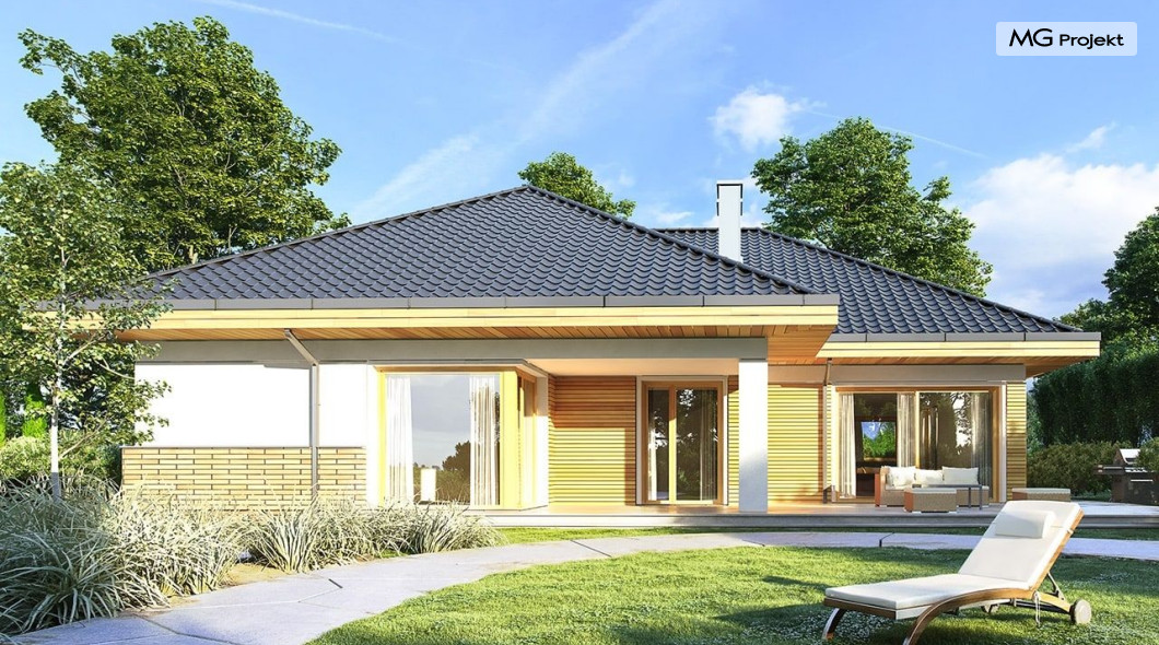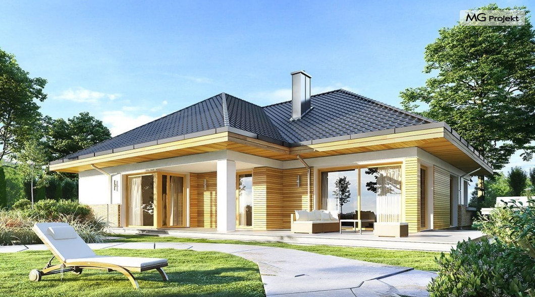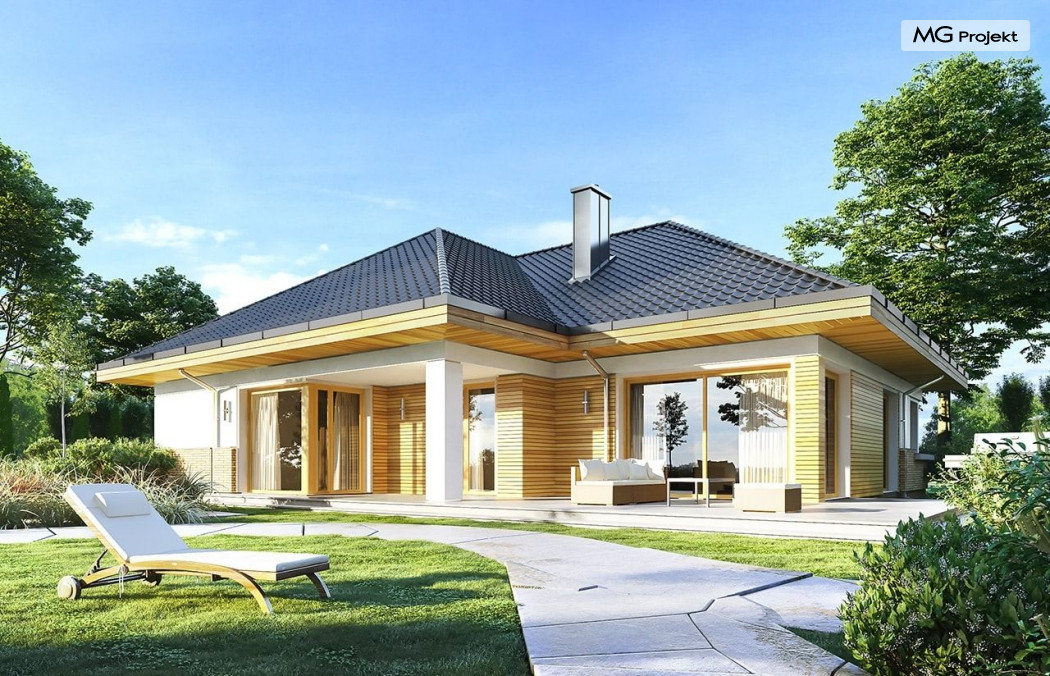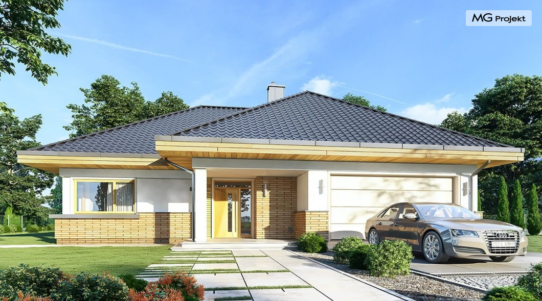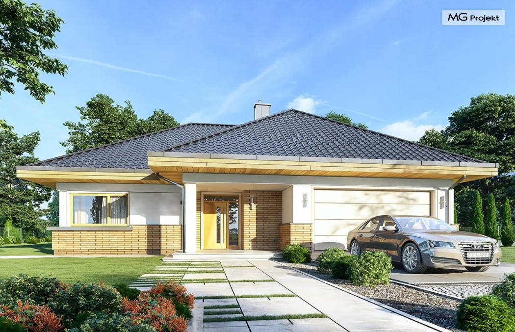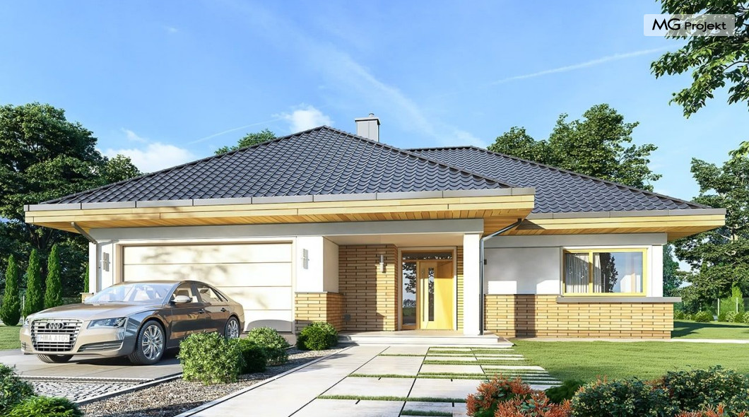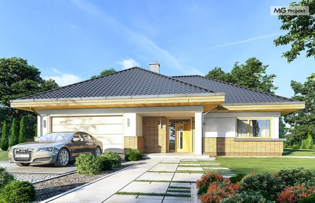 Projekt domu Doskonały 2 B jest wersją wariantową projektu parterowego domku jednorodzinnego z serii „Doskonały”. Projekt przeznaczony jest dla cztero-pięcioosobowej rodziny. Od projektów wersji 1 i 2 różni się wysokością dachu, wyglądem zewnętrznym i częściowo rozwiązaniami funkcjonalnymi wnętrza. Dom to doskonała :) propozycja dla osób pragnących wybudować komfortowy parterowy dom. Bryła budynku zaprojektowana została na planie litery T. Elewację frontową zdobi szeroki podcień wejściowy z reprezentacyjnymi drzwiami z naświetlem. Od strony elewacji ogrodowej dom urozmaicony jest pięknymi przeszkleniami okien, oraz podcieniem przykrywającym część tarasu. Elewacje dzielą trzy poziome pasy : pas dolny - klinkierowy, pas okien i najwyżej nad nadprożami okien biały pas tynku okalający budynek, kontrastujący z drewnianymi podbitkami. Płaska szara dachówka dodaje domowi nowoczesnego wyglądu i przełamuje delikatną rustykalność drewnianych okładzin ścian. Architektura domu to mix nowoczesności z naturalnymi materiałami wykończeniowymi i kolorystyką. Dom doskonale wpasuje się w otaczającą zieleń działki. Wnętrze domu zaprojektowano dzieląc je na część dzienną, gospodarczą i prywatną z sypialniami. W tym wariancie projektu mamy cztery pełnoprawne sypialnie, także dom z powodzeniem nadaje się dla rodziny z trójką dzieci. Część gospodarcza to podwójny garaż i kotłownia, połączone z przedsionkiem. Na prawo od wejścia mamy salon z jadalnią i otwartą ładną kuchnią. W części prywatnej domowników zaprojektowano sypialnię rodziców z niewielką łazienką i garderobą, oraz trzy sypialnie dzieci z dużą łazienką i osobnym wc dostępnym z holu. Nad parterem domu znajduje się strych, który można wykorzystać jako domowy gospodarczy magazyn. Projekt jest świetną propozycją dla osób marzących o parterowym komfortowym domu, ze wszystkimi pomieszczeniami na jednym poziomie, z bliskim kontaktem z otaczającym ogrodem. Zapraszamy do zapoznania się z pełną ofertą pracowni MG Projekt: Doskonały i Doskonały 2.