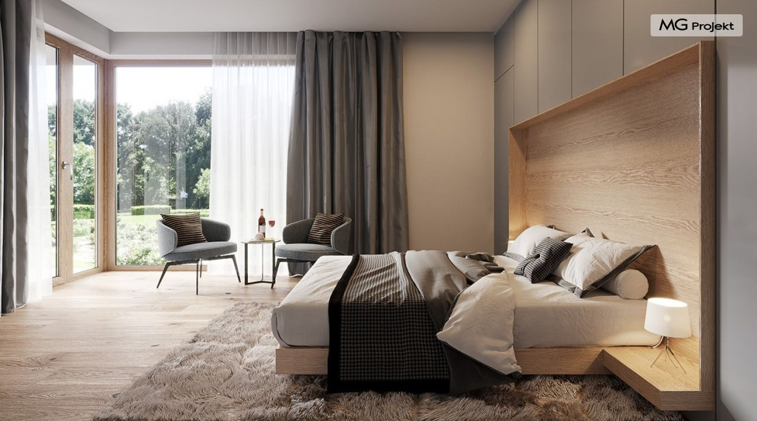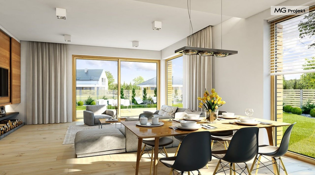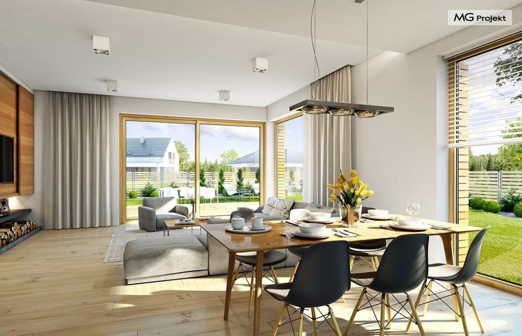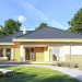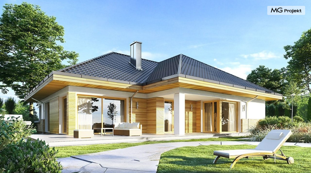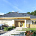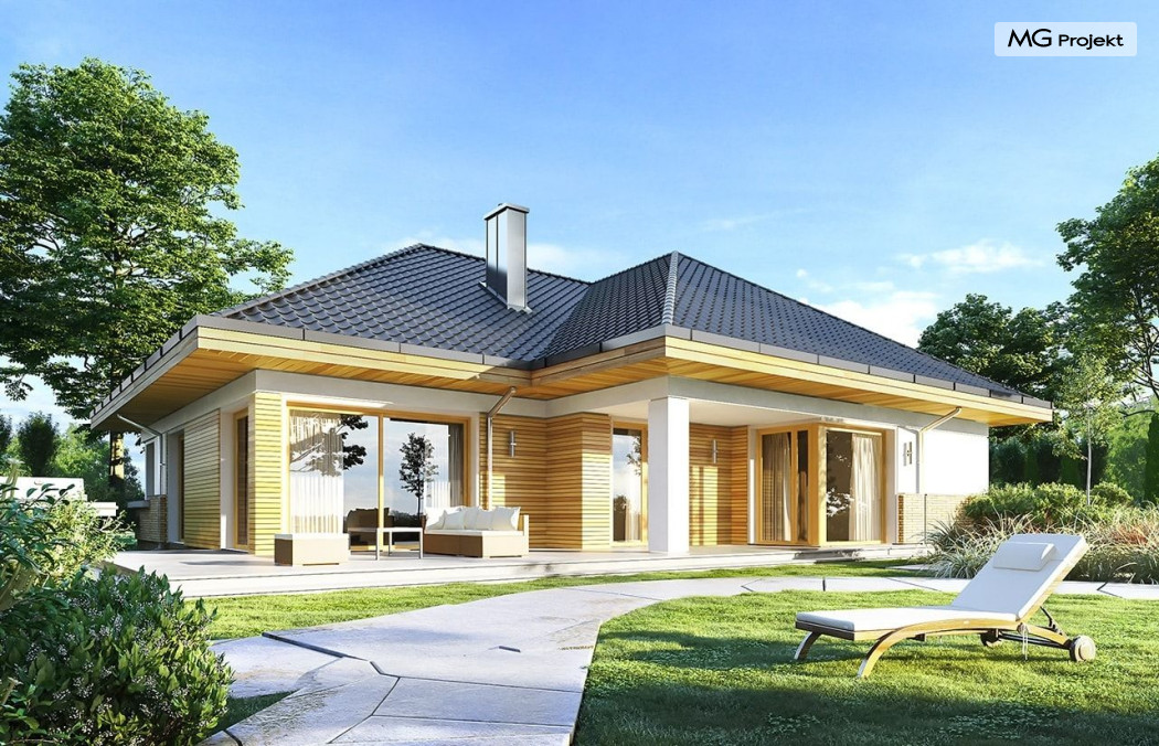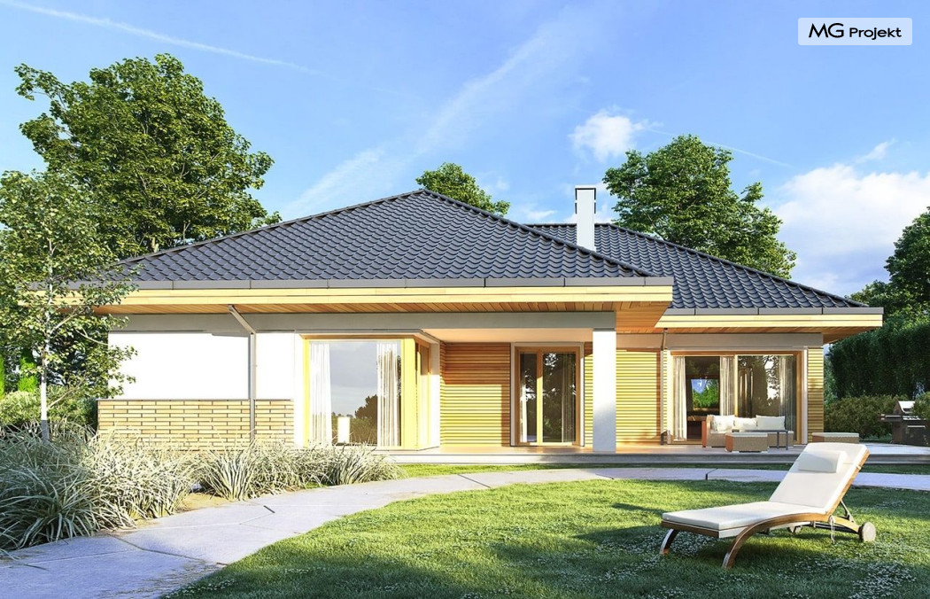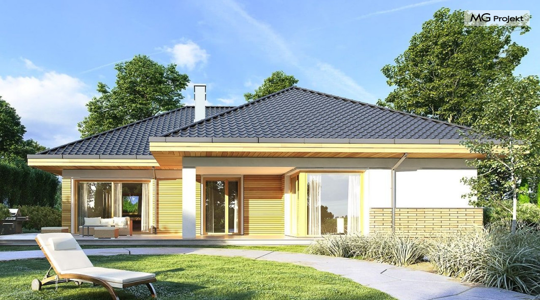 Projekt domu Doskonały 2 B jest wersją wariantową projektu parterowego domku jednorodzinnego z serii „Doskonały”. Projekt przeznaczony jest dla cztero-pięcioosobowej rodziny. Od projektów wersji 1 i 2 różni się wysokością dachu, wyglądem zewnętrznym i częściowo rozwiązaniami funkcjonalnymi wnętrza. Dom to doskonała :) propozycja dla osób pragnących wybudować komfortowy parterowy dom. Bryła budynku zaprojektowana została na planie litery T. Elewację frontową zdobi szeroki podcień wejściowy z reprezentacyjnymi drzwiami z naświetlem. Od strony elewacji ogrodowej dom urozmaicony jest pięknymi przeszkleniami okien, oraz podcieniem przykrywającym część tarasu. Elewacje dzielą trzy poziome pasy : pas dolny - klinkierowy, pas okien i najwyżej nad nadprożami okien biały pas tynku okalający budynek, kontrastujący z drewnianymi podbitkami. Płaska szara dachówka dodaje domowi nowoczesnego wyglądu i przełamuje delikatną rustykalność drewnianych okładzin ścian. Architektura domu to mix nowoczesności z naturalnymi materiałami wykończeniowymi i kolorystyką. Dom doskonale wpasuje się w otaczającą zieleń działki. Wnętrze domu zaprojektowano dzieląc je na część dzienną, gospodarczą i prywatną z sypialniami. W tym wariancie projektu mamy cztery pełnoprawne sypialnie, także dom z powodzeniem nadaje się dla rodziny z trójką dzieci. Część gospodarcza to podwójny garaż i kotłownia, połączone z przedsionkiem. Na prawo od wejścia mamy salon z jadalnią i otwartą ładną kuchnią. W części prywatnej domowników zaprojektowano sypialnię rodziców z niewielką łazienką i garderobą, oraz trzy sypialnie dzieci z dużą łazienką i osobnym wc dostępnym z holu. Nad parterem domu znajduje się strych, który można wykorzystać jako domowy gospodarczy magazyn. Projekt jest świetną propozycją dla osób marzących o parterowym komfortowym domu, ze wszystkimi pomieszczeniami na jednym poziomie, z bliskim kontaktem z otaczającym ogrodem. Zapraszamy do zapoznania się z pełną ofertą pracowni MG Projekt: Doskonały i Doskonały 2.