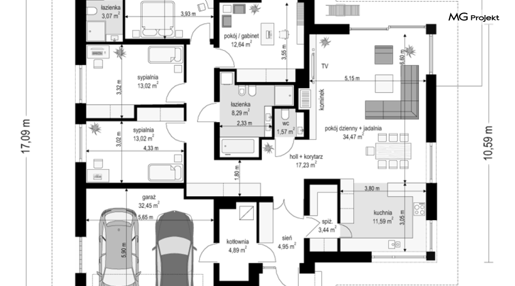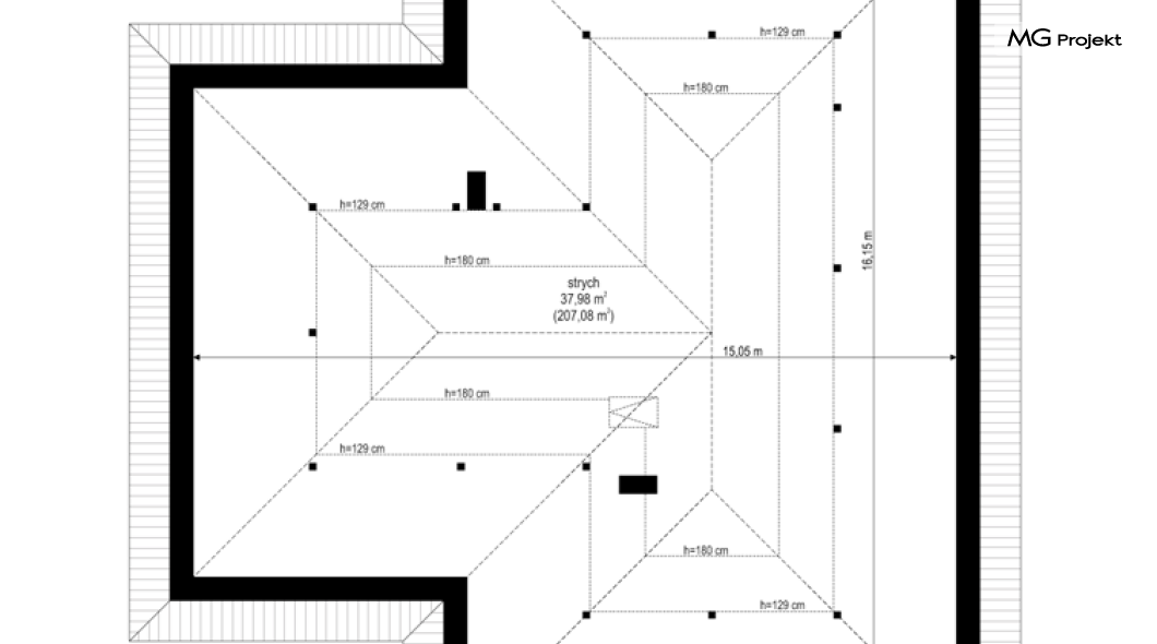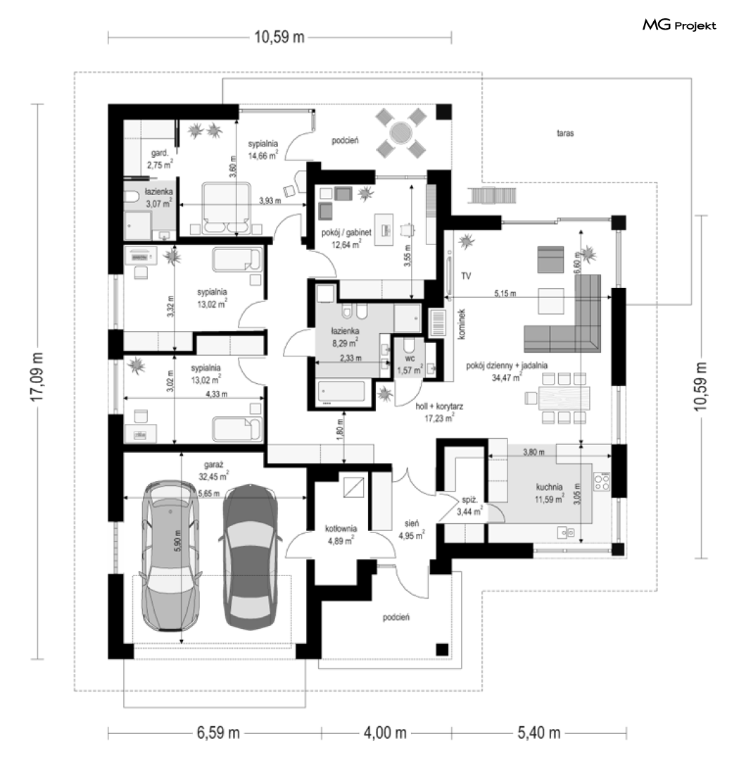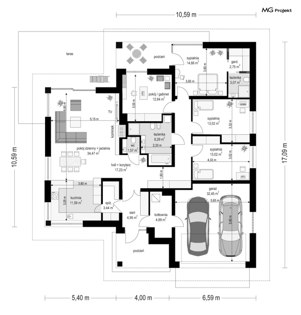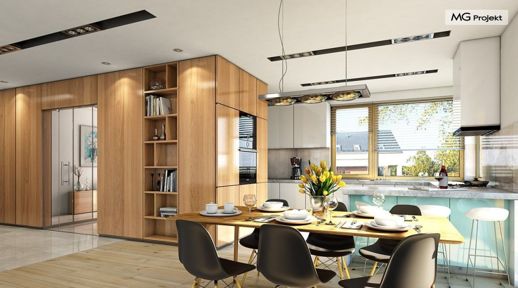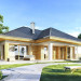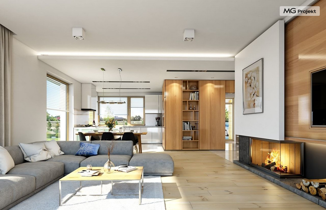 Projekt domu Doskonały 2 B jest wersją wariantową projektu parterowego domku jednorodzinnego z serii „Doskonały”. Projekt przeznaczony jest dla cztero-pięcioosobowej rodziny. Od projektów wersji 1 i 2 różni się wysokością dachu, wyglądem zewnętrznym i częściowo rozwiązaniami funkcjonalnymi wnętrza. Dom to doskonała :) propozycja dla osób pragnących wybudować komfortowy parterowy dom. Bryła budynku zaprojektowana została na planie litery T. Elewację frontową zdobi szeroki podcień wejściowy z reprezentacyjnymi drzwiami z naświetlem. Od strony elewacji ogrodowej dom urozmaicony jest pięknymi przeszkleniami okien, oraz podcieniem przykrywającym część tarasu. Elewacje dzielą trzy poziome pasy : pas dolny - klinkierowy, pas okien i najwyżej nad nadprożami okien biały pas tynku okalający budynek, kontrastujący z drewnianymi podbitkami. Płaska szara dachówka dodaje domowi nowoczesnego wyglądu i przełamuje delikatną rustykalność drewnianych okładzin ścian. Architektura domu to mix nowoczesności z naturalnymi materiałami wykończeniowymi i kolorystyką. Dom doskonale wpasuje się w otaczającą zieleń działki. Wnętrze domu zaprojektowano dzieląc je na część dzienną, gospodarczą i prywatną z sypialniami. W tym wariancie projektu mamy cztery pełnoprawne sypialnie, także dom z powodzeniem nadaje się dla rodziny z trójką dzieci. Część gospodarcza to podwójny garaż i kotłownia, połączone z przedsionkiem. Na prawo od wejścia mamy salon z jadalnią i otwartą ładną kuchnią. W części prywatnej domowników zaprojektowano sypialnię rodziców z niewielką łazienką i garderobą, oraz trzy sypialnie dzieci z dużą łazienką i osobnym wc dostępnym z holu. Nad parterem domu znajduje się strych, który można wykorzystać jako domowy gospodarczy magazyn. Projekt jest świetną propozycją dla osób marzących o parterowym komfortowym domu, ze wszystkimi pomieszczeniami na jednym poziomie, z bliskim kontaktem z otaczającym ogrodem. Zapraszamy do zapoznania się z pełną ofertą pracowni MG Projekt: Doskonały i Doskonały 2.