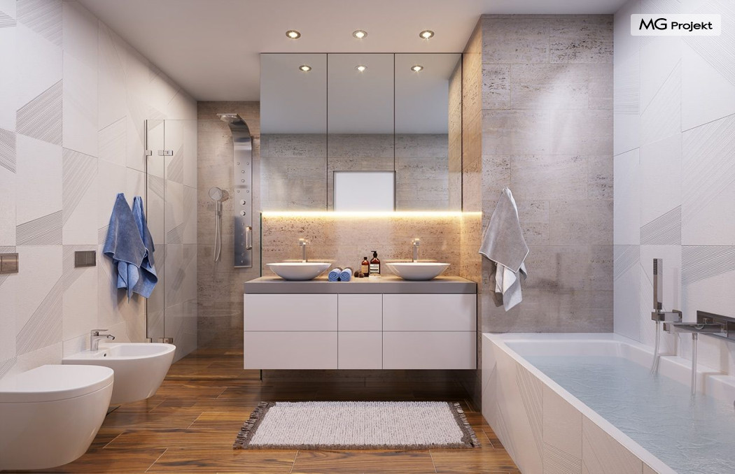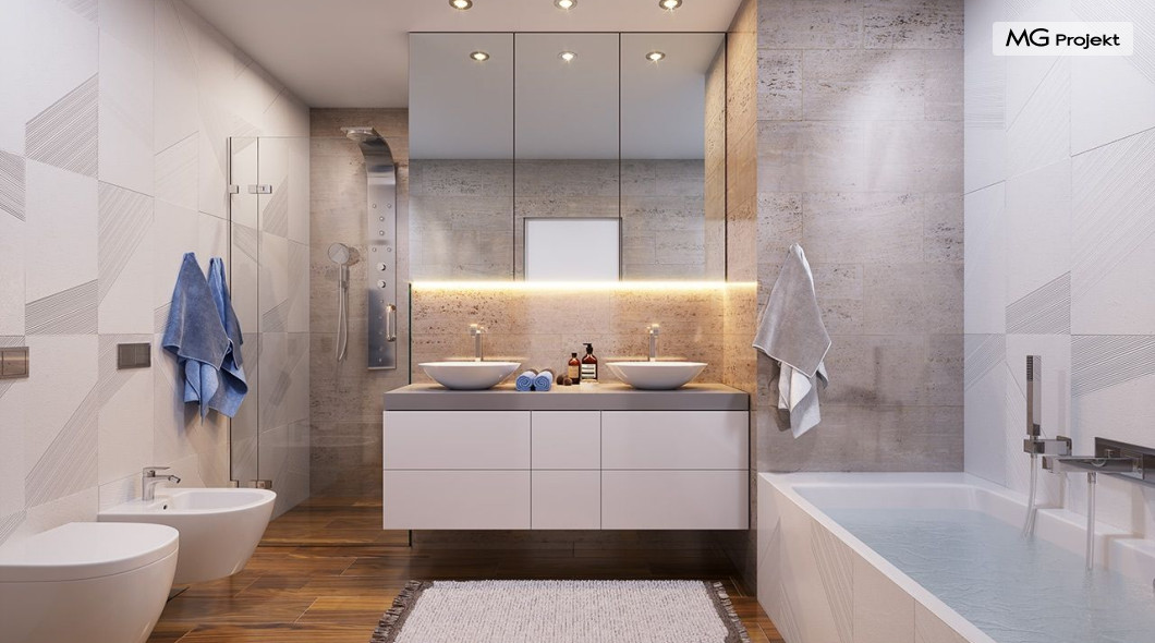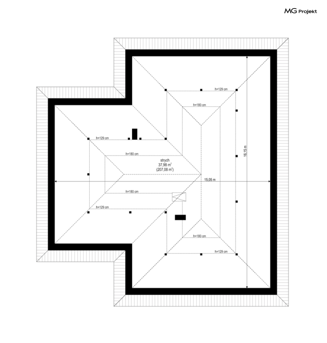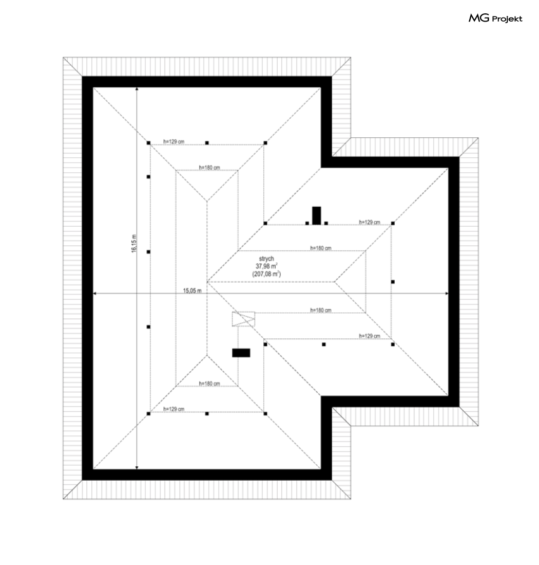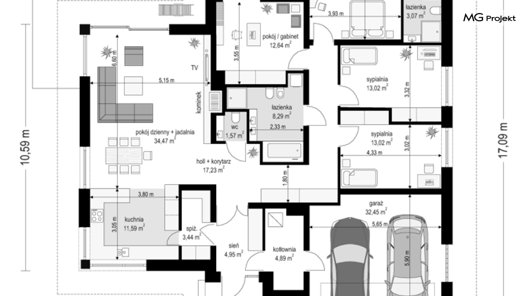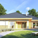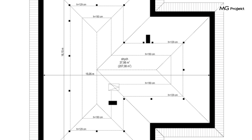 Projekt domu Doskonały 2 B jest wersją wariantową projektu parterowego domku jednorodzinnego z serii „Doskonały”. Projekt przeznaczony jest dla cztero-pięcioosobowej rodziny. Od projektów wersji 1 i 2 różni się wysokością dachu, wyglądem zewnętrznym i częściowo rozwiązaniami funkcjonalnymi wnętrza. Dom to doskonała :) propozycja dla osób pragnących wybudować komfortowy parterowy dom. Bryła budynku zaprojektowana została na planie litery T. Elewację frontową zdobi szeroki podcień wejściowy z reprezentacyjnymi drzwiami z naświetlem. Od strony elewacji ogrodowej dom urozmaicony jest pięknymi przeszkleniami okien, oraz podcieniem przykrywającym część tarasu. Elewacje dzielą trzy poziome pasy : pas dolny - klinkierowy, pas okien i najwyżej nad nadprożami okien biały pas tynku okalający budynek, kontrastujący z drewnianymi podbitkami. Płaska szara dachówka dodaje domowi nowoczesnego wyglądu i przełamuje delikatną rustykalność drewnianych okładzin ścian. Architektura domu to mix nowoczesności z naturalnymi materiałami wykończeniowymi i kolorystyką. Dom doskonale wpasuje się w otaczającą zieleń działki. Wnętrze domu zaprojektowano dzieląc je na część dzienną, gospodarczą i prywatną z sypialniami. W tym wariancie projektu mamy cztery pełnoprawne sypialnie, także dom z powodzeniem nadaje się dla rodziny z trójką dzieci. Część gospodarcza to podwójny garaż i kotłownia, połączone z przedsionkiem. Na prawo od wejścia mamy salon z jadalnią i otwartą ładną kuchnią. W części prywatnej domowników zaprojektowano sypialnię rodziców z niewielką łazienką i garderobą, oraz trzy sypialnie dzieci z dużą łazienką i osobnym wc dostępnym z holu. Nad parterem domu znajduje się strych, który można wykorzystać jako domowy gospodarczy magazyn. Projekt jest świetną propozycją dla osób marzących o parterowym komfortowym domu, ze wszystkimi pomieszczeniami na jednym poziomie, z bliskim kontaktem z otaczającym ogrodem. Zapraszamy do zapoznania się z pełną ofertą pracowni MG Projekt: Doskonały i Doskonały 2.