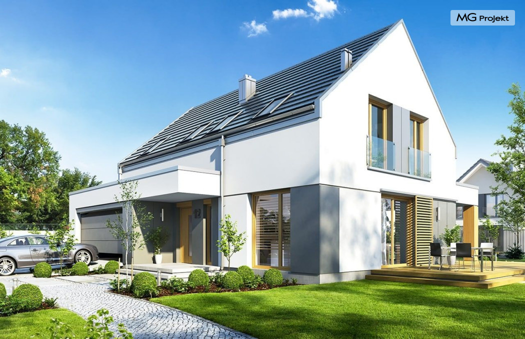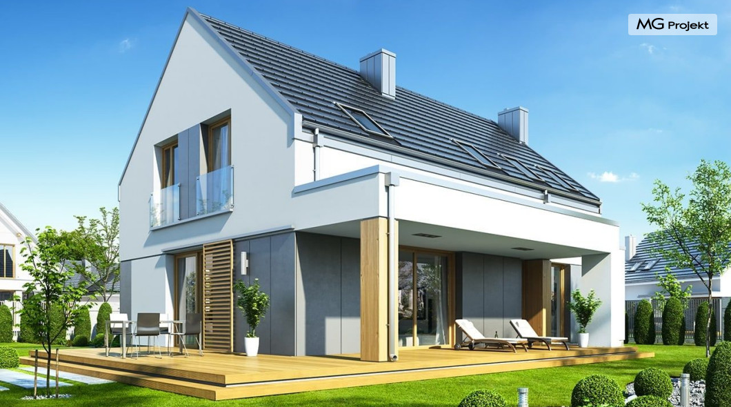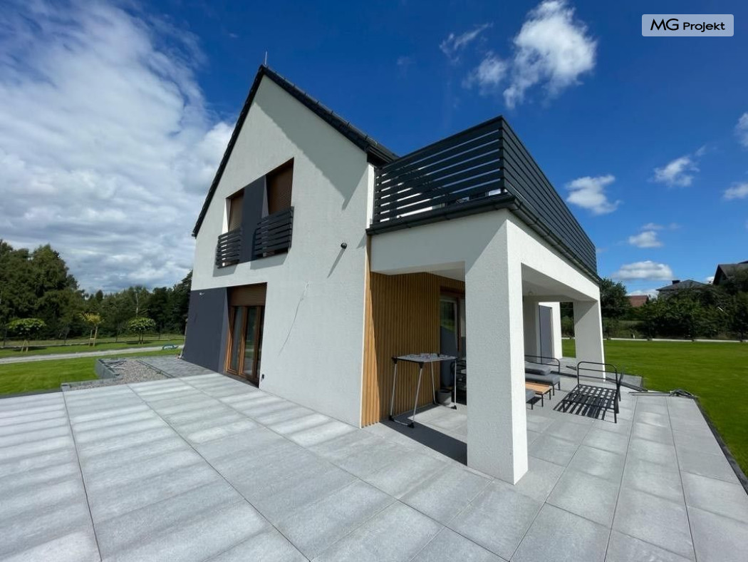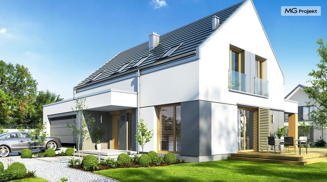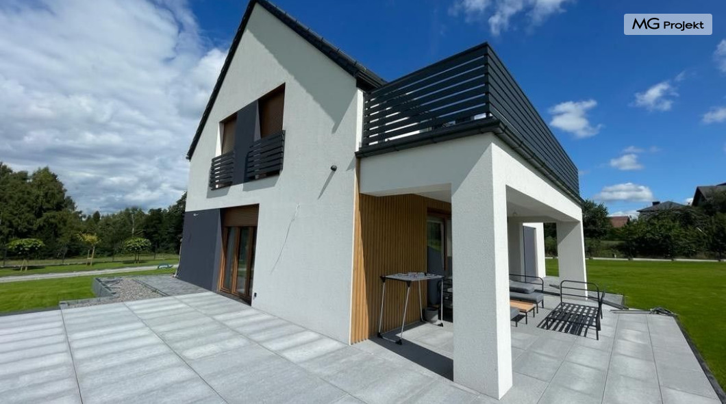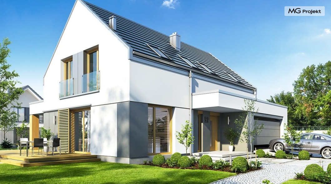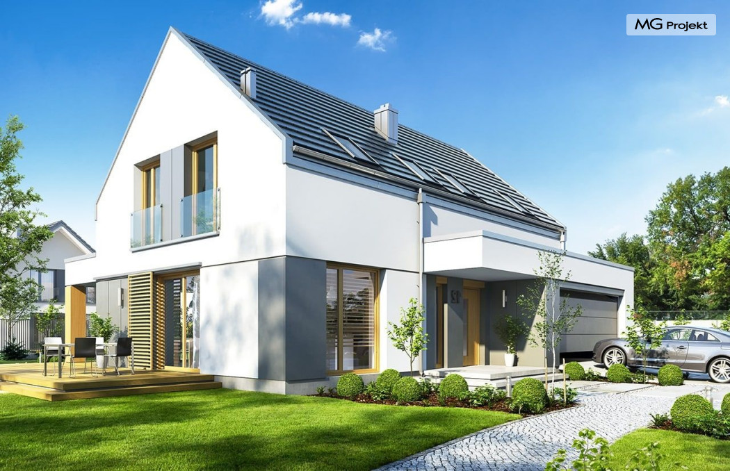Projekt domu Fokstrot jest kolejną wersją projektu z kolekcji „roztańczonych” domów. Jest to kolejna odsłona popularnego projektu Party, ale w nowocześniejszym ujęciu - domu typu „stodoła”, bez okapów, z parterowymi dobudówkami, z płaskimi daszkami otaczającymi zasadniczą bryłę. Projekt domu Fokstrot jest propozycją dla Klientów lubiących nowoczesną architekturę i życie w takiej oprawie. Główna bryła domu to prostopadłościan przykryty dwuspadowym dachem. Z przodu dom urozmaica wystający garaż i zadaszenie wejścia. Od strony ogrodu natomiast podcień - zadaszenie tarasu. Bryła została podzielona poziomymi pasami. Dolny pas parteru wypełniono dużymi oknami do podłogi i szarymi płytami (z betonu architektonicznego, płyt włókowo-cementowych, lub z tynku o innym kolorze i strukturze imitującego płyty). W ścianach szczytowych poddasza zaprojektowano zestawy okien balkonowych połączonych kontrastującymi środkowymi słupkami. Pozostała cześć elewacji domu jest biała. Dach przykryto płaską grafitową dachówką. W dachu po obu stronach umieszczono rzędy okien połaciowych. Architektura domu jest nowoczesna, prosta, czysta. Budynek doskonale wpasuje się w dowolne otoczenie. Wnętrze : na parterze zaprojektowaliśmy jednoprzestrzenne wnętrze pomieszczeń salonu, kuchni i holu. Kuchnia z wyspą, ścianą w pełnej zabudowie, z pięknym przeszkleniem do podłogi i sąsiadującą spiżarnią będzie doskonałym miejscem do krótkich spotkań domowników. Salon ze ścianą kominkowo-telewizyjną otwiera się szerokimi przeszkleniami na otaczający ogród i częściowo zadaszony taras. Na parterze mamy też dodatkowy pokój, łazienkę z prysznicem i schowkiem porządkowym, dwustanowiskowy garaż i kotłownię. W projekcie domu Fokstrot na poddaszu zaprojektowano trzy sypialnie : apartament rodziców z własną łazienką i garderoba, oraz tarasem nad garażem, oraz dwie sypialnie dziecięce, z wbudowanymi szafami i oddzielną łazienką. Dodatkowo na poddaszu przewidziano też pralnię. Ścianki kolankowe na poddaszu są dość wysokie, więc skosy nie powinny być dużym utrudnieniem. Koszty i eksploatacja : dom ma bardzo prostą konstrukcję. Jego bryła to prostokąt przykryty dwuspadowym dachem. Budynek wg projektu domu Fokstrot będzie niedrogi w budowie, a dzięki energooszczędnym rozwiązaniom i „czystej” bryle - będzie również tani w późniejszej eksploatacji. Propozycja w sam raz dla współczesnej, dynamicznej rodziny, lubiącej nowoczesną architekturę. Zapraszamy do zapoznania się z całą serią "roztańczonych domów": https://www.mgprojekt.com.pl/makarena, https://www.mgprojekt.com.pl/bolero, https://www.mgprojekt.com.pl/lambada, https://www.mgprojekt.com.pl/party, https://www.mgprojekt.com.pl/party-2, https://www.mgprojekt.com.pl/biba, https://www.mgprojekt.com.pl/tango, https://www.mgprojekt.com.pl/salsa, https://www.mgprojekt.com.pl/rumba, https://www.mgprojekt.com.pl/mambo, https://www.mgprojekt.com.pl/mambo, https://www.mgprojekt.com.pl/fokstrot, https://www.mgprojekt.com.pl/samba.