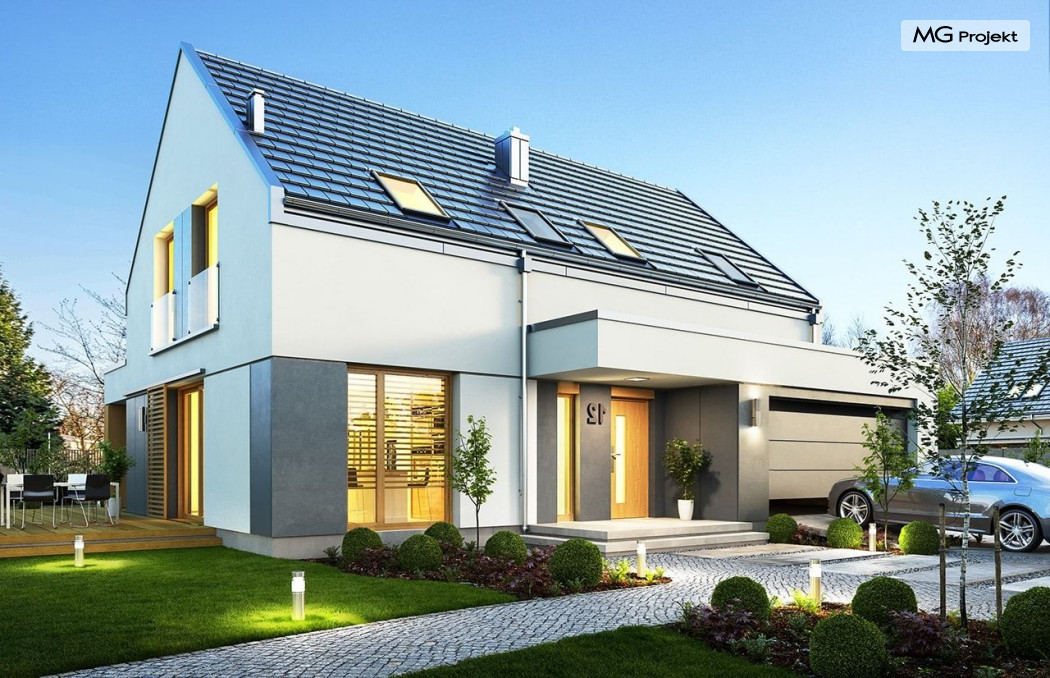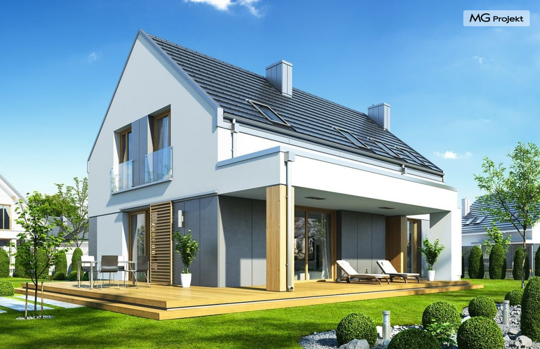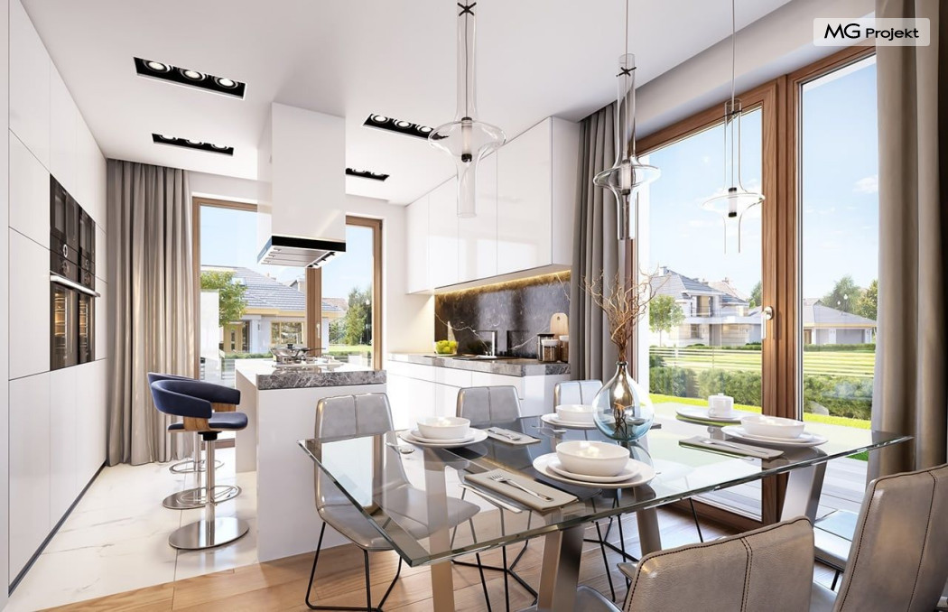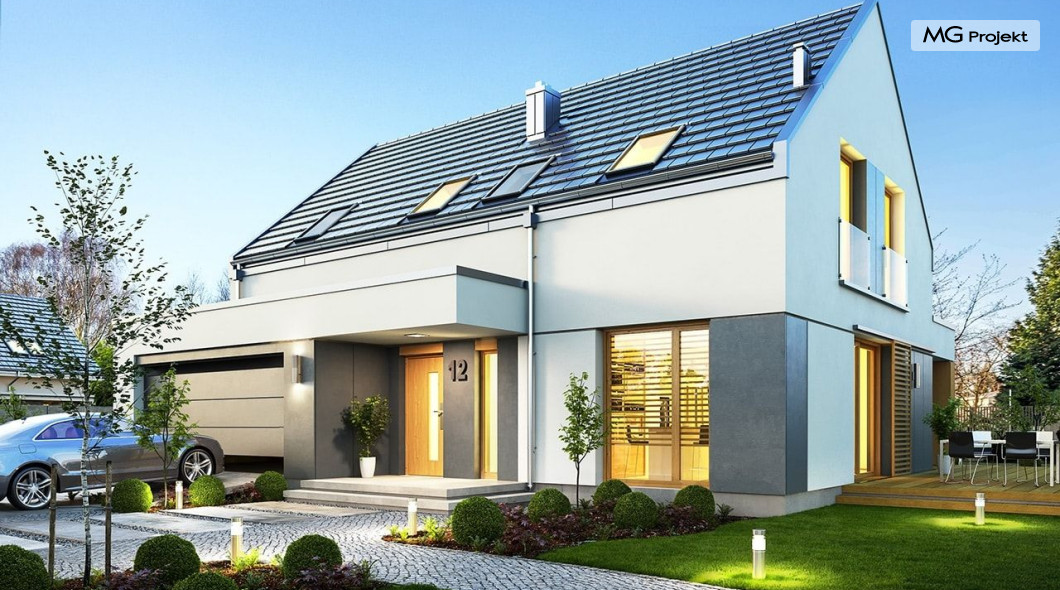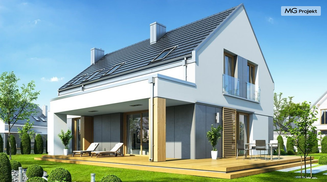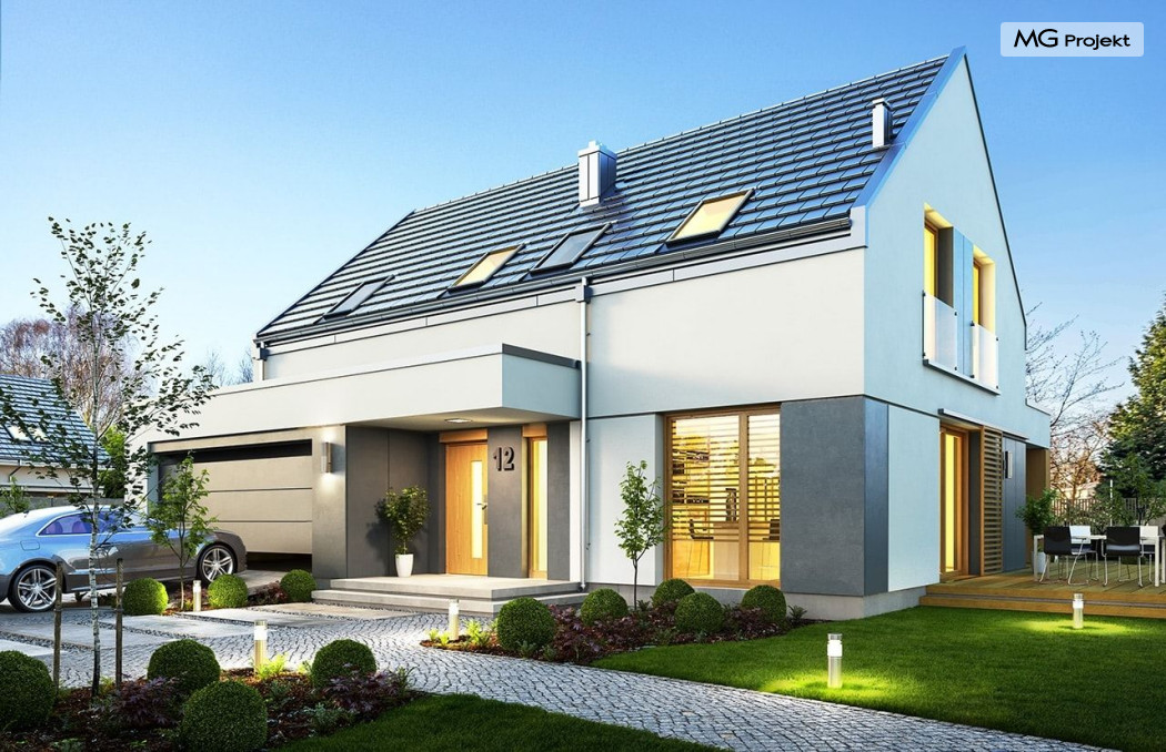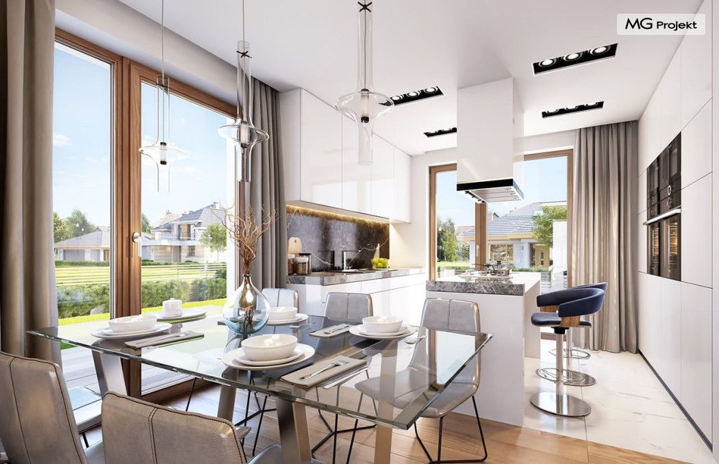 Projekt domu Fokstrot jest kolejną wersją projektu z kolekcji „roztańczonych” domów. Jest to kolejna odsłona popularnego projektu Party, ale w nowocześniejszym ujęciu - domu typu „stodoła”, bez okapów, z parterowymi dobudówkami, z płaskimi daszkami otaczającymi zasadniczą bryłę. Projekt domu Fokstrot jest propozycją dla Klientów lubiących nowoczesną architekturę i życie w takiej oprawie. Główna bryła domu to prostopadłościan przykryty dwuspadowym dachem. Z przodu dom urozmaica wystający garaż i zadaszenie wejścia. Od strony ogrodu natomiast podcień - zadaszenie tarasu. Bryła została podzielona poziomymi pasami. Dolny pas parteru wypełniono dużymi oknami do podłogi i szarymi płytami (z betonu architektonicznego, płyt włókowo-cementowych, lub z tynku o innym kolorze i strukturze imitującego płyty). W ścianach szczytowych poddasza zaprojektowano zestawy okien balkonowych połączonych kontrastującymi środkowymi słupkami. Pozostała cześć elewacji domu jest biała. Dach przykryto płaską grafitową dachówką. W dachu po obu stronach umieszczono rzędy okien połaciowych. Architektura domu jest nowoczesna, prosta, czysta. Budynek doskonale wpasuje się w dowolne otoczenie. Wnętrze : na parterze zaprojektowaliśmy jednoprzestrzenne wnętrze pomieszczeń salonu, kuchni i holu. Kuchnia z wyspą, ścianą w pełnej zabudowie, z pięknym przeszkleniem do podłogi i sąsiadującą spiżarnią będzie doskonałym miejscem do krótkich spotkań domowników. Salon ze ścianą kominkowo-telewizyjną otwiera się szerokimi przeszkleniami na otaczający ogród i częściowo zadaszony taras. Na parterze mamy też dodatkowy pokój, łazienkę z prysznicem i schowkiem porządkowym, dwustanowiskowy garaż i kotłownię. W projekcie domu Fokstrot na poddaszu zaprojektowano trzy sypialnie : apartament rodziców z własną łazienką i garderoba, oraz tarasem nad garażem, oraz dwie sypialnie dziecięce, z wbudowanymi szafami i oddzielną łazienką. Dodatkowo na poddaszu przewidziano też pralnię. Ścianki kolankowe na poddaszu są dość wysokie, więc skosy nie powinny być dużym utrudnieniem. Koszty i eksploatacja : dom ma bardzo prostą konstrukcję. Jego bryła to prostokąt przykryty dwuspadowym dachem. Budynek wg projektu domu Fokstrot będzie niedrogi w budowie, a dzięki energooszczędnym rozwiązaniom i „czystej” bryle - będzie również tani w późniejszej eksploatacji. Propozycja w sam raz dla współczesnej, dynamicznej rodziny, lubiącej nowoczesną architekturę. Zapraszamy do zapoznania się z całą serią "roztańczonych domów": https://www.mgprojekt.com.pl/makarena, https://www.mgprojekt.com.pl/bolero, https://www.mgprojekt.com.pl/lambada, https://www.mgprojekt.com.pl/party, https://www.mgprojekt.com.pl/party-2, https://www.mgprojekt.com.pl/biba, https://www.mgprojekt.com.pl/tango, https://www.mgprojekt.com.pl/salsa, https://www.mgprojekt.com.pl/rumba, https://www.mgprojekt.com.pl/mambo, https://www.mgprojekt.com.pl/mambo, https://www.mgprojekt.com.pl/fokstrot, https://www.mgprojekt.com.pl/samba.