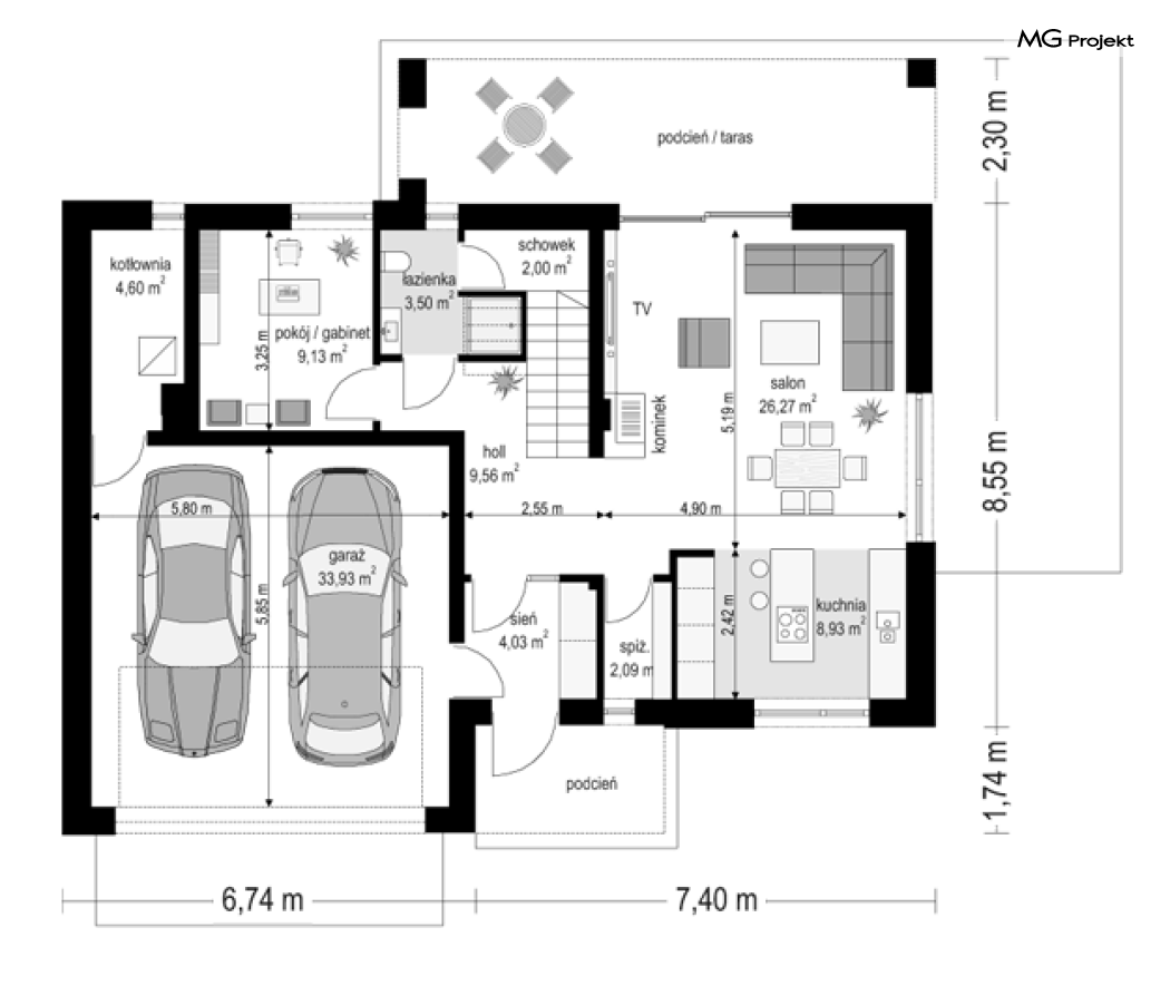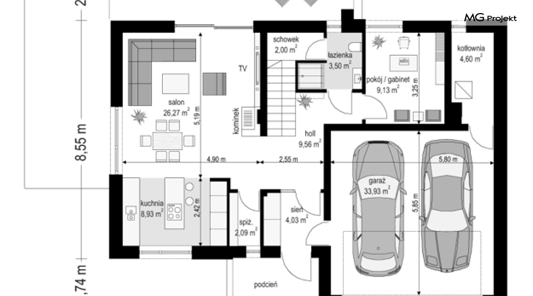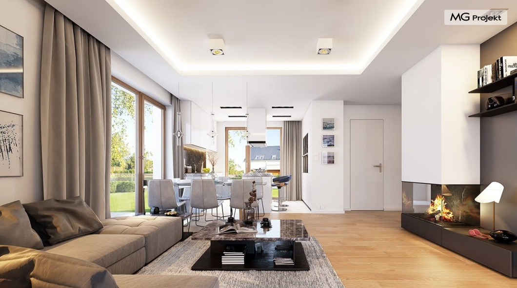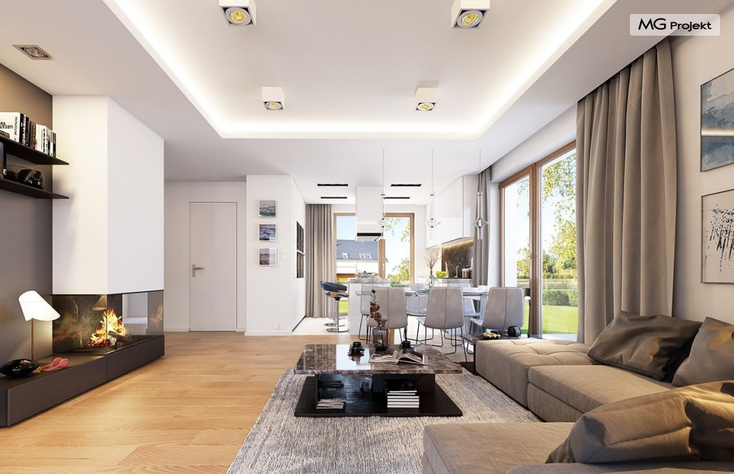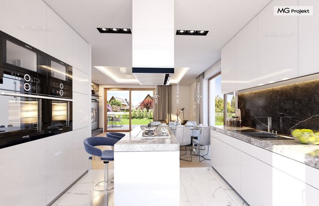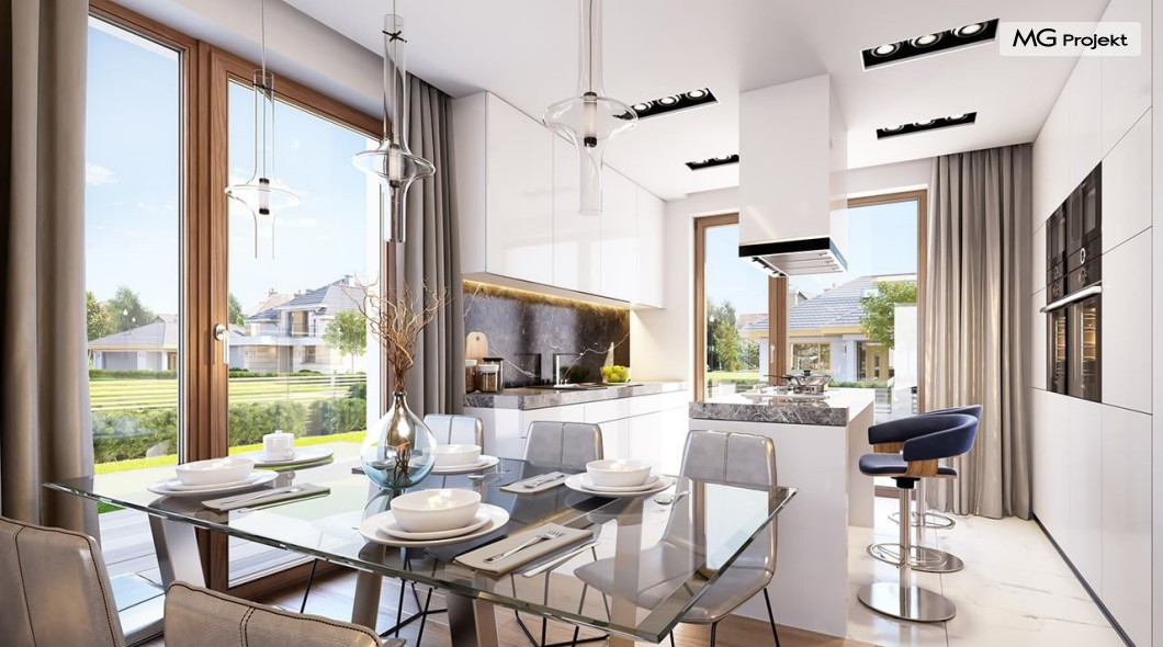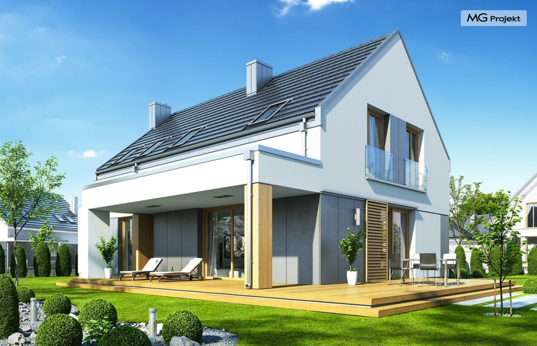 Projekt domu Fokstrot jest kolejną wersją projektu z kolekcji „roztańczonych” domów. Jest to kolejna odsłona popularnego projektu Party, ale w nowocześniejszym ujęciu - domu typu „stodoła”, bez okapów, z parterowymi dobudówkami, z płaskimi daszkami otaczającymi zasadniczą bryłę. Projekt domu Fokstrot jest propozycją dla Klientów lubiących nowoczesną architekturę i życie w takiej oprawie. Główna bryła domu to prostopadłościan przykryty dwuspadowym dachem. Z przodu dom urozmaica wystający garaż i zadaszenie wejścia. Od strony ogrodu natomiast podcień - zadaszenie tarasu. Bryła została podzielona poziomymi pasami. Dolny pas parteru wypełniono dużymi oknami do podłogi i szarymi płytami (z betonu architektonicznego, płyt włókowo-cementowych, lub z tynku o innym kolorze i strukturze imitującego płyty). W ścianach szczytowych poddasza zaprojektowano zestawy okien balkonowych połączonych kontrastującymi środkowymi słupkami. Pozostała cześć elewacji domu jest biała. Dach przykryto płaską grafitową dachówką. W dachu po obu stronach umieszczono rzędy okien połaciowych. Architektura domu jest nowoczesna, prosta, czysta. Budynek doskonale wpasuje się w dowolne otoczenie. Wnętrze : na parterze zaprojektowaliśmy jednoprzestrzenne wnętrze pomieszczeń salonu, kuchni i holu. Kuchnia z wyspą, ścianą w pełnej zabudowie, z pięknym przeszkleniem do podłogi i sąsiadującą spiżarnią będzie doskonałym miejscem do krótkich spotkań domowników. Salon ze ścianą kominkowo-telewizyjną otwiera się szerokimi przeszkleniami na otaczający ogród i częściowo zadaszony taras. Na parterze mamy też dodatkowy pokój, łazienkę z prysznicem i schowkiem porządkowym, dwustanowiskowy garaż i kotłownię. W projekcie domu Fokstrot na poddaszu zaprojektowano trzy sypialnie : apartament rodziców z własną łazienką i garderoba, oraz tarasem nad garażem, oraz dwie sypialnie dziecięce, z wbudowanymi szafami i oddzielną łazienką. Dodatkowo na poddaszu przewidziano też pralnię. Ścianki kolankowe na poddaszu są dość wysokie, więc skosy nie powinny być dużym utrudnieniem. Koszty i eksploatacja : dom ma bardzo prostą konstrukcję. Jego bryła to prostokąt przykryty dwuspadowym dachem. Budynek wg projektu domu Fokstrot będzie niedrogi w budowie, a dzięki energooszczędnym rozwiązaniom i „czystej” bryle - będzie również tani w późniejszej eksploatacji. Propozycja w sam raz dla współczesnej, dynamicznej rodziny, lubiącej nowoczesną architekturę. Zapraszamy do zapoznania się z całą serią "roztańczonych domów": https://www.mgprojekt.com.pl/makarena, https://www.mgprojekt.com.pl/bolero, https://www.mgprojekt.com.pl/lambada, https://www.mgprojekt.com.pl/party, https://www.mgprojekt.com.pl/party-2, https://www.mgprojekt.com.pl/biba, https://www.mgprojekt.com.pl/tango, https://www.mgprojekt.com.pl/salsa, https://www.mgprojekt.com.pl/rumba, https://www.mgprojekt.com.pl/mambo, https://www.mgprojekt.com.pl/mambo, https://www.mgprojekt.com.pl/fokstrot, https://www.mgprojekt.com.pl/samba.