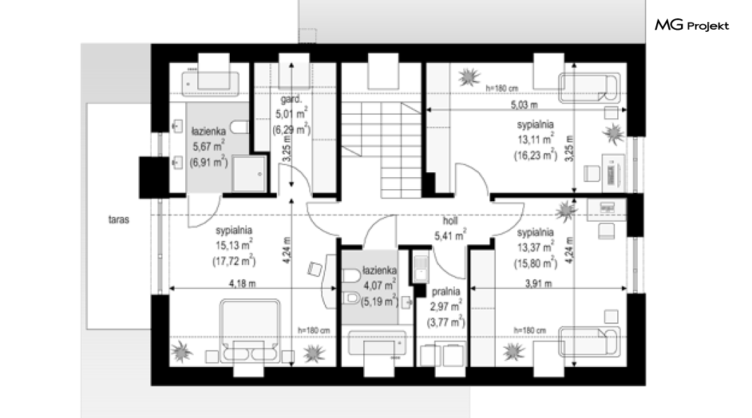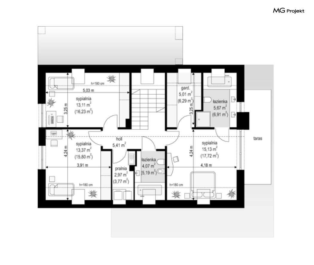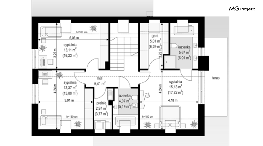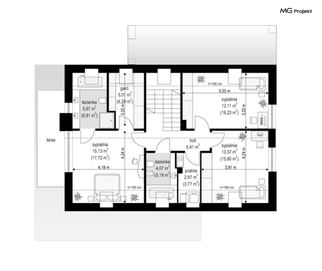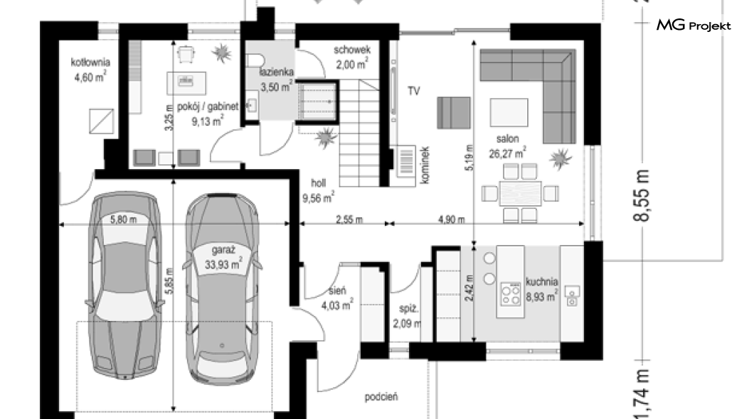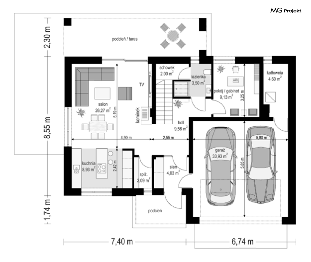 Projekt domu Fokstrot jest kolejną wersją projektu z kolekcji „roztańczonych” domów. Jest to kolejna odsłona popularnego projektu Party, ale w nowocześniejszym ujęciu - domu typu „stodoła”, bez okapów, z parterowymi dobudówkami, z płaskimi daszkami otaczającymi zasadniczą bryłę. Projekt domu Fokstrot jest propozycją dla Klientów lubiących nowoczesną architekturę i życie w takiej oprawie. Główna bryła domu to prostopadłościan przykryty dwuspadowym dachem. Z przodu dom urozmaica wystający garaż i zadaszenie wejścia. Od strony ogrodu natomiast podcień - zadaszenie tarasu. Bryła została podzielona poziomymi pasami. Dolny pas parteru wypełniono dużymi oknami do podłogi i szarymi płytami (z betonu architektonicznego, płyt włókowo-cementowych, lub z tynku o innym kolorze i strukturze imitującego płyty). W ścianach szczytowych poddasza zaprojektowano zestawy okien balkonowych połączonych kontrastującymi środkowymi słupkami. Pozostała cześć elewacji domu jest biała. Dach przykryto płaską grafitową dachówką. W dachu po obu stronach umieszczono rzędy okien połaciowych. Architektura domu jest nowoczesna, prosta, czysta. Budynek doskonale wpasuje się w dowolne otoczenie. Wnętrze : na parterze zaprojektowaliśmy jednoprzestrzenne wnętrze pomieszczeń salonu, kuchni i holu. Kuchnia z wyspą, ścianą w pełnej zabudowie, z pięknym przeszkleniem do podłogi i sąsiadującą spiżarnią będzie doskonałym miejscem do krótkich spotkań domowników. Salon ze ścianą kominkowo-telewizyjną otwiera się szerokimi przeszkleniami na otaczający ogród i częściowo zadaszony taras. Na parterze mamy też dodatkowy pokój, łazienkę z prysznicem i schowkiem porządkowym, dwustanowiskowy garaż i kotłownię. W projekcie domu Fokstrot na poddaszu zaprojektowano trzy sypialnie : apartament rodziców z własną łazienką i garderoba, oraz tarasem nad garażem, oraz dwie sypialnie dziecięce, z wbudowanymi szafami i oddzielną łazienką. Dodatkowo na poddaszu przewidziano też pralnię. Ścianki kolankowe na poddaszu są dość wysokie, więc skosy nie powinny być dużym utrudnieniem. Koszty i eksploatacja : dom ma bardzo prostą konstrukcję. Jego bryła to prostokąt przykryty dwuspadowym dachem. Budynek wg projektu domu Fokstrot będzie niedrogi w budowie, a dzięki energooszczędnym rozwiązaniom i „czystej” bryle - będzie również tani w późniejszej eksploatacji. Propozycja w sam raz dla współczesnej, dynamicznej rodziny, lubiącej nowoczesną architekturę. Zapraszamy do zapoznania się z całą serią "roztańczonych domów": https://www.mgprojekt.com.pl/makarena, https://www.mgprojekt.com.pl/bolero, https://www.mgprojekt.com.pl/lambada, https://www.mgprojekt.com.pl/party, https://www.mgprojekt.com.pl/party-2, https://www.mgprojekt.com.pl/biba, https://www.mgprojekt.com.pl/tango, https://www.mgprojekt.com.pl/salsa, https://www.mgprojekt.com.pl/rumba, https://www.mgprojekt.com.pl/mambo, https://www.mgprojekt.com.pl/mambo, https://www.mgprojekt.com.pl/fokstrot, https://www.mgprojekt.com.pl/samba.
