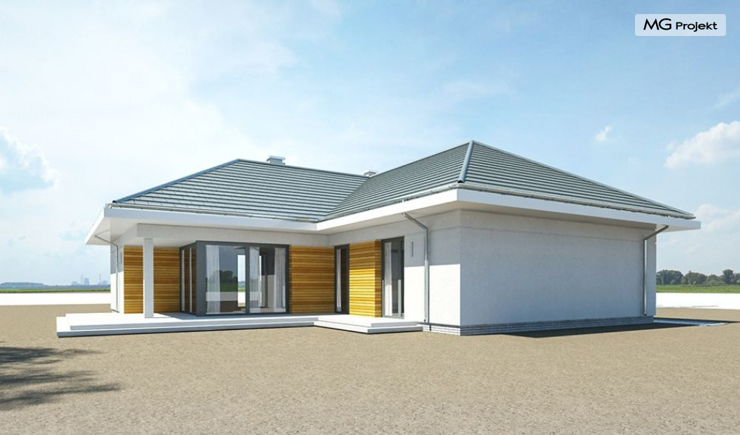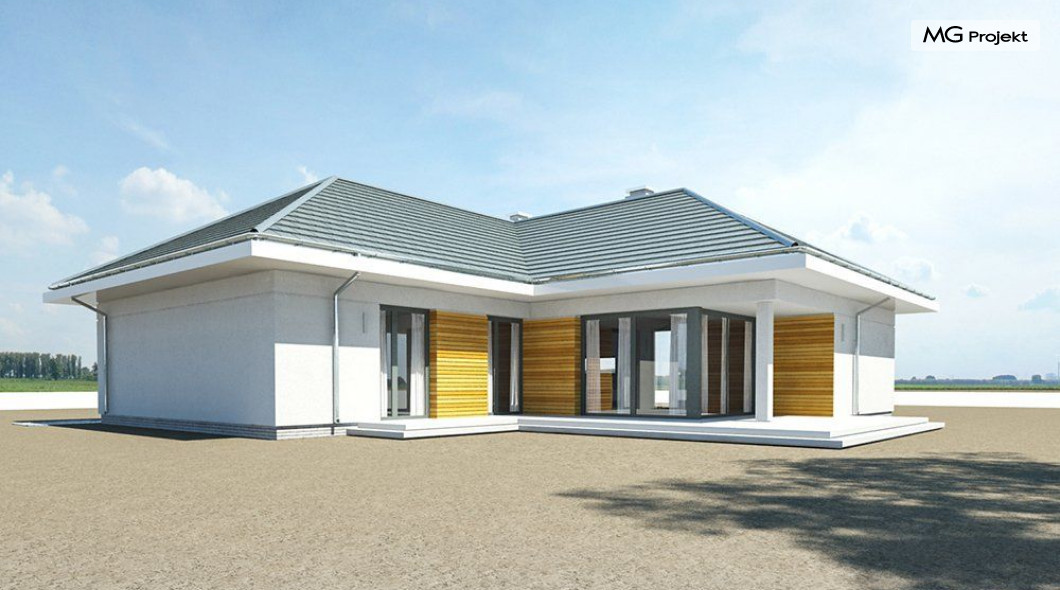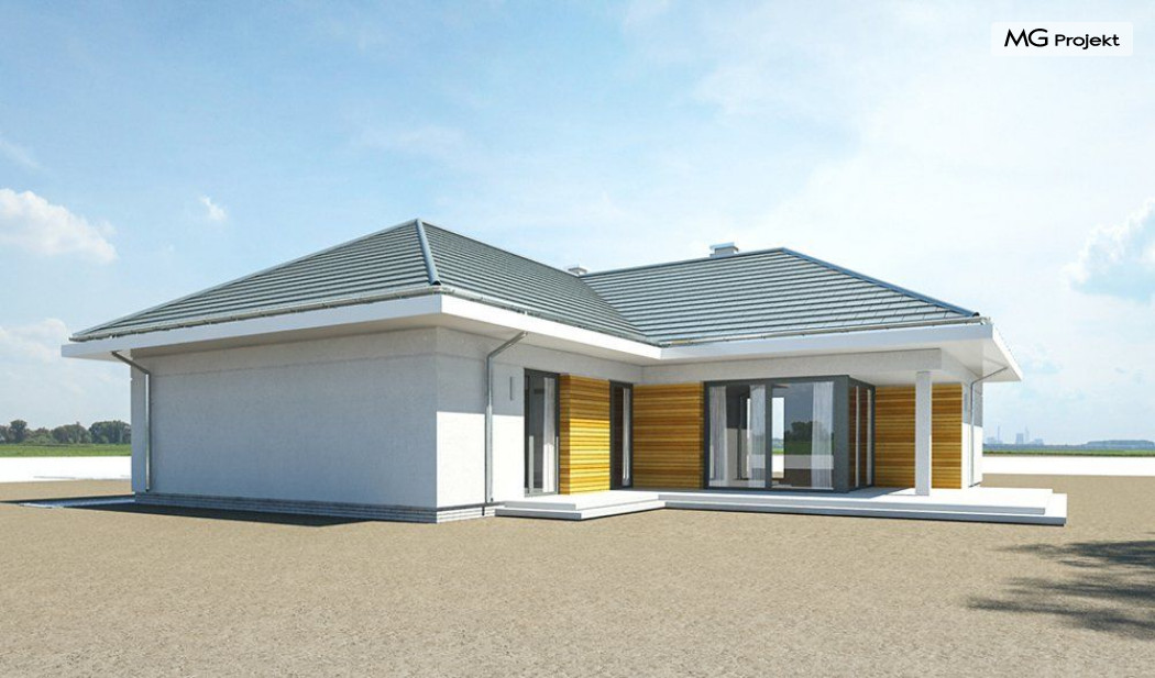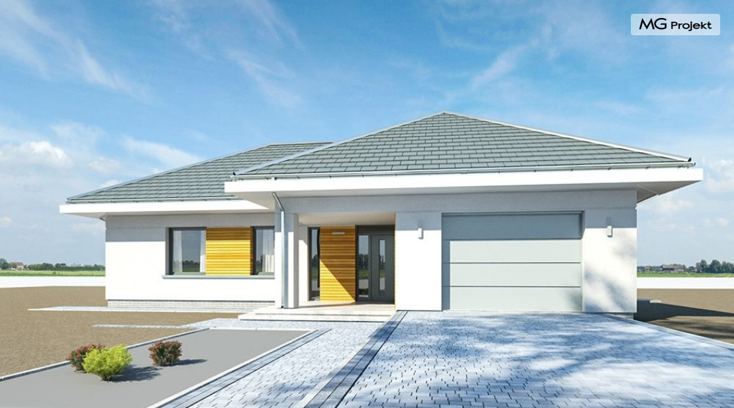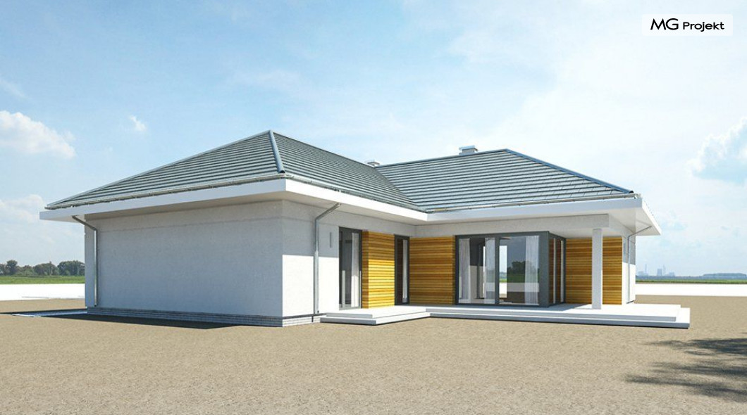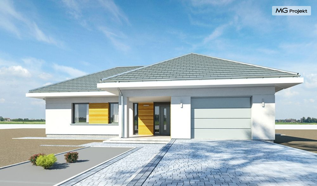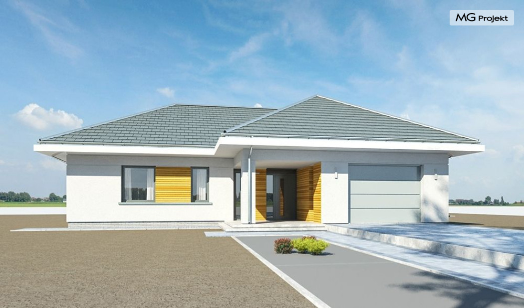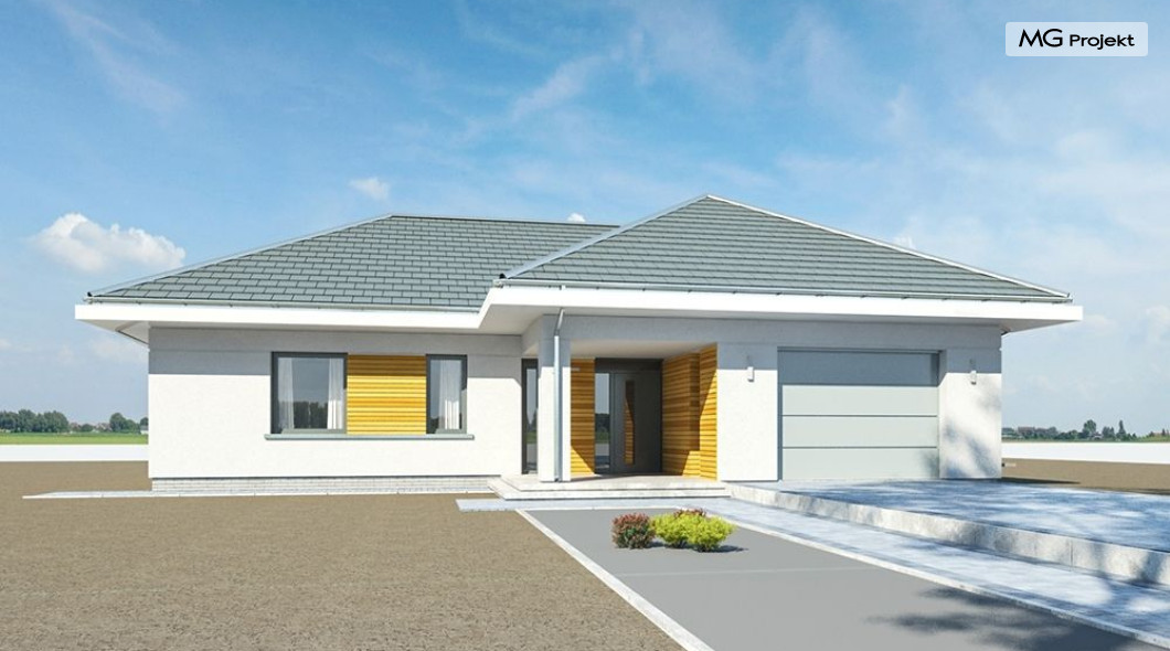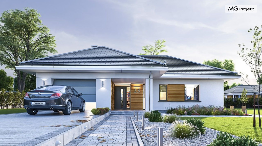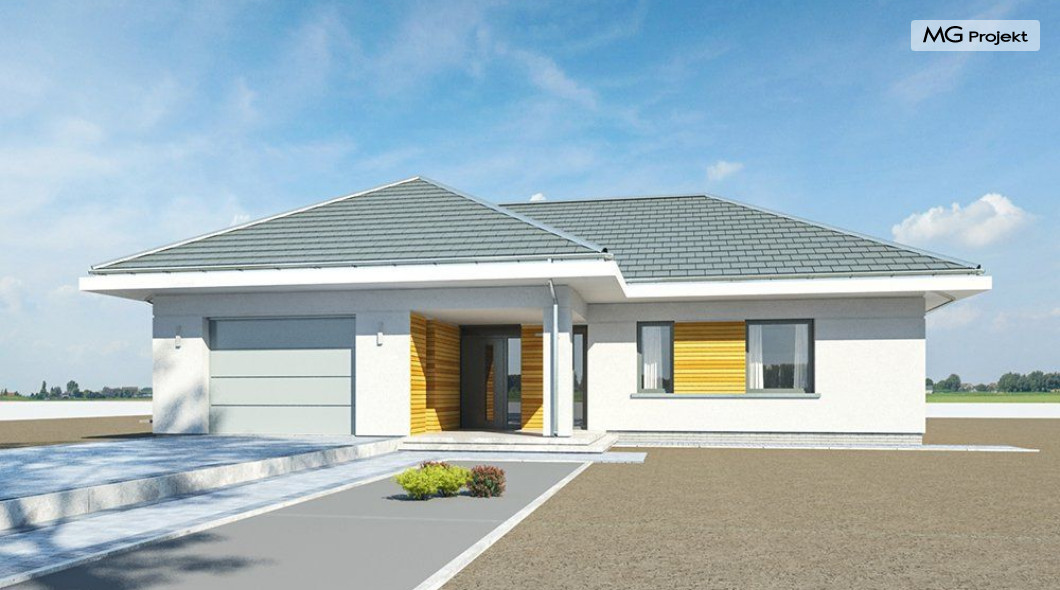 Projekt domu Parterowy to dom jednorodzinny dla czteroosobowej rodziny. Zaprojektowaliśmy już wiele jednokondygnacyjnych domków - ten projekt to nasza obecna odpowiedź na pytanie : jak powinien wyglądać sensowny średniej wielkości domek parterowy dla polskiej rodziny. Bryła domu została zbudowana na planie litery „T”. Dom Parterowy przykryty jest wielospadowym łagodnym dachem. Nowoczesna architektura domu została podkreślona odpowiednimi materiałami wykończeniowymi i kolorystyką. Dom jest nowoczesny, ale też stonowany, bez awangardowej przesady. Dzięki temu architektura domu będzie długo aktualna i nie zestarzeje się łatwo. Szare ramy okien i drzwi, oraz drewniane fragmenty ścian stanowią kontrast do bieli ścian. Całość bryły zwieńczona jest grafitowym dachem z płaskich dachówek. Front domu ozdobiona jest szerokim przeszklonym wejściem z naświetlami. Elewację ogrodową urozmaica narożne przeszklenie salonu połączone z podcieniem nad częścią tarasu. Wnętrze domu to trzy strefy, połączone częścią wejściową : przedsionkiem i holem. Na lewo z przedsionka przechodzimy do strefy gospodarczej domu, z ładnym garażem, kotłownią i strychem nad garażem. Na wprost sieni, przeszklonymi szerokimi drzwiami przechodzimy do holu i dalej do części dziennej, składającej się z salonu, jadalni i kuchni połączonych w jedno wspólne wnętrze, rozdzielone kominkiem. W projekcie domu Parterowy nad pokojem dziennym przewidziano otwarcie przestrzenne aż do dachu, oraz strych – antresolę ze schodkami, z widokiem na salon. Na antresoli można urządzić pokój rekreacyjny, albo gabinet-bibliotekę - wedle fantazji właścicieli. Trzecia część domu to sypialnie. Składa się z sypialni rodziców z garderobą, dwóch sypialni dziecięcych z szafami wbudowanymi, łazienki i oddzielnego wc. Nad sypialniami również znajduje się strych, dostępny z antresoli nad salonem. Projekt domu Parterowy jest nieduży, ale mieści wszystkie funkcje potrzebne do komfortowego życia pełnej rodziny. Bryła domu jest dość prosta. Budynek jest jednokondygnacyjny - nieskomplikowany i niedrogi w budowie i późniejszej eksploatacji. Jeśli macie Państwo w planach dom parterowy - z pewnością warto wziąć pod uwagę wybór tego projektu. Zapraszamy do zapoznania się z pełną ofertą pracowni MG Projekt: Parterowy 2, Parterowy 3, Parterowy 4.