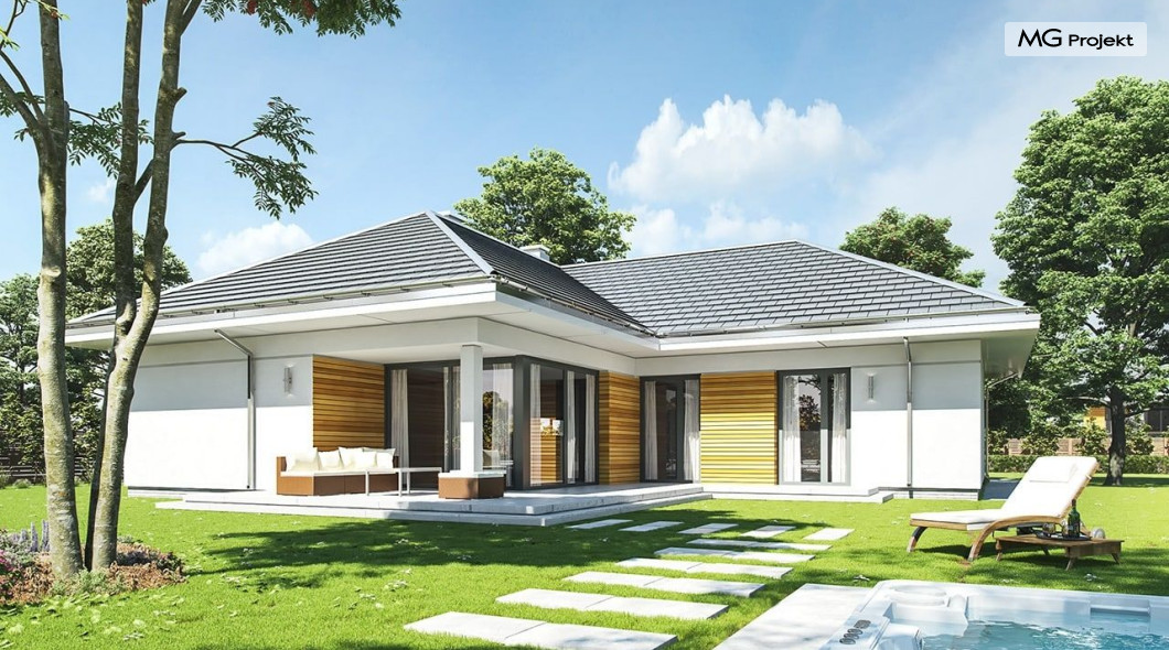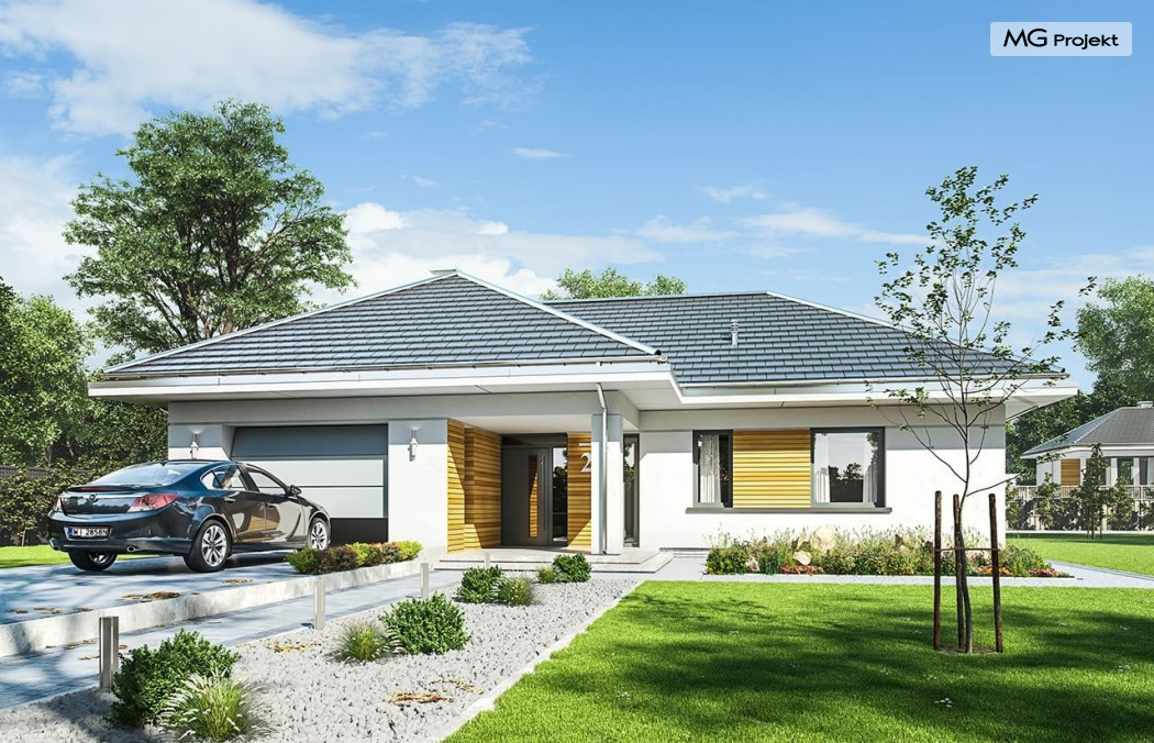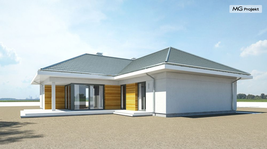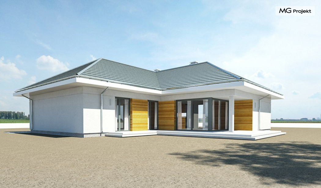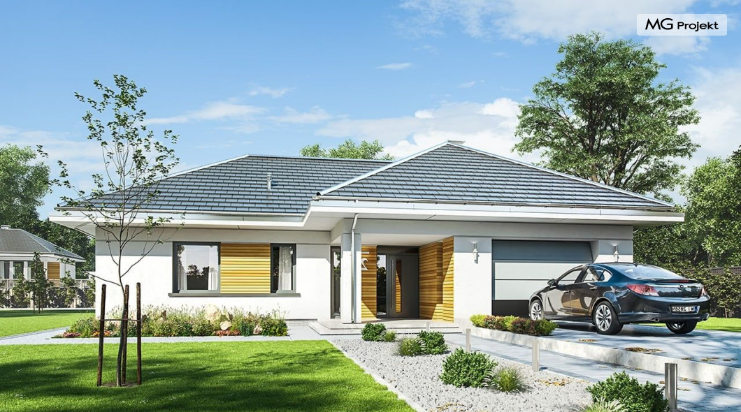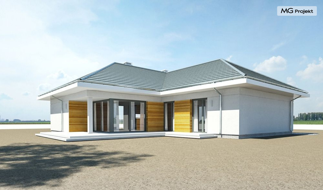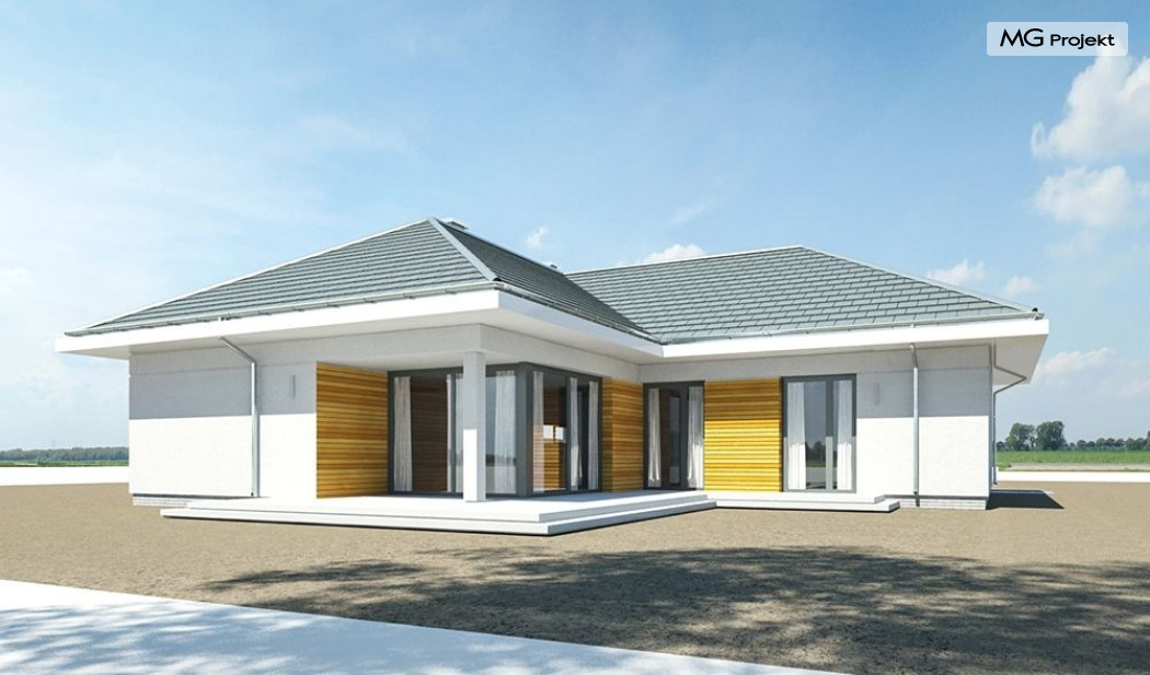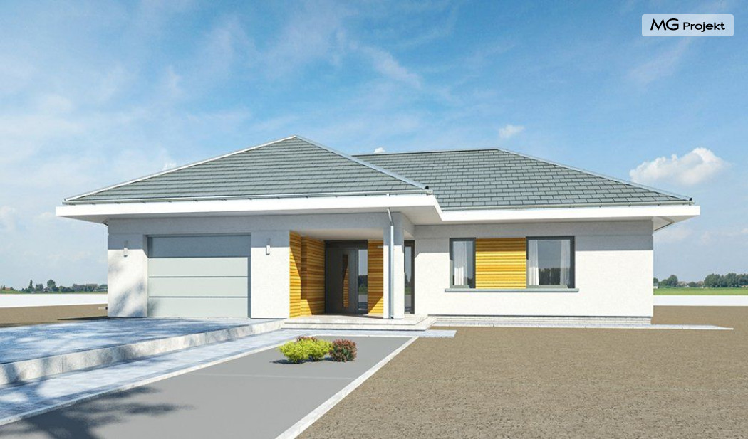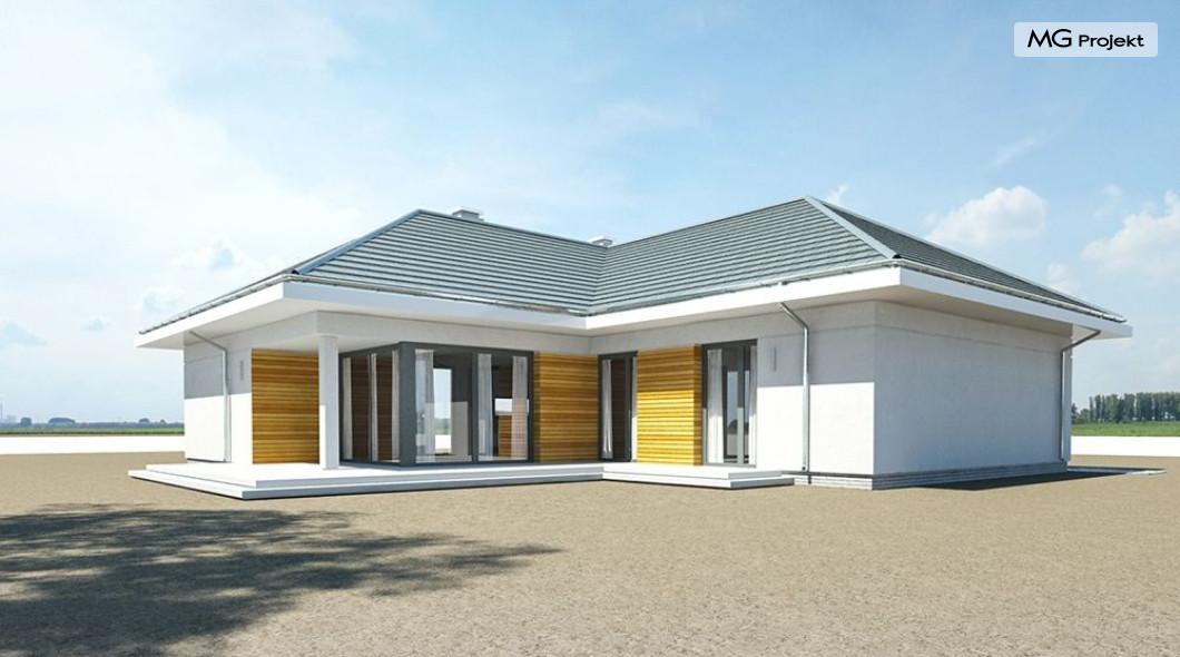 Projekt domu Parterowy to dom jednorodzinny dla czteroosobowej rodziny. Zaprojektowaliśmy już wiele jednokondygnacyjnych domków - ten projekt to nasza obecna odpowiedź na pytanie : jak powinien wyglądać sensowny średniej wielkości domek parterowy dla polskiej rodziny. Bryła domu została zbudowana na planie litery „T”. Dom Parterowy przykryty jest wielospadowym łagodnym dachem. Nowoczesna architektura domu została podkreślona odpowiednimi materiałami wykończeniowymi i kolorystyką. Dom jest nowoczesny, ale też stonowany, bez awangardowej przesady. Dzięki temu architektura domu będzie długo aktualna i nie zestarzeje się łatwo. Szare ramy okien i drzwi, oraz drewniane fragmenty ścian stanowią kontrast do bieli ścian. Całość bryły zwieńczona jest grafitowym dachem z płaskich dachówek. Front domu ozdobiona jest szerokim przeszklonym wejściem z naświetlami. Elewację ogrodową urozmaica narożne przeszklenie salonu połączone z podcieniem nad częścią tarasu. Wnętrze domu to trzy strefy, połączone częścią wejściową : przedsionkiem i holem. Na lewo z przedsionka przechodzimy do strefy gospodarczej domu, z ładnym garażem, kotłownią i strychem nad garażem. Na wprost sieni, przeszklonymi szerokimi drzwiami przechodzimy do holu i dalej do części dziennej, składającej się z salonu, jadalni i kuchni połączonych w jedno wspólne wnętrze, rozdzielone kominkiem. W projekcie domu Parterowy nad pokojem dziennym przewidziano otwarcie przestrzenne aż do dachu, oraz strych – antresolę ze schodkami, z widokiem na salon. Na antresoli można urządzić pokój rekreacyjny, albo gabinet-bibliotekę - wedle fantazji właścicieli. Trzecia część domu to sypialnie. Składa się z sypialni rodziców z garderobą, dwóch sypialni dziecięcych z szafami wbudowanymi, łazienki i oddzielnego wc. Nad sypialniami również znajduje się strych, dostępny z antresoli nad salonem. Projekt domu Parterowy jest nieduży, ale mieści wszystkie funkcje potrzebne do komfortowego życia pełnej rodziny. Bryła domu jest dość prosta. Budynek jest jednokondygnacyjny - nieskomplikowany i niedrogi w budowie i późniejszej eksploatacji. Jeśli macie Państwo w planach dom parterowy - z pewnością warto wziąć pod uwagę wybór tego projektu. Zapraszamy do zapoznania się z pełną ofertą pracowni MG Projekt: Parterowy 2, Parterowy 3, Parterowy 4.