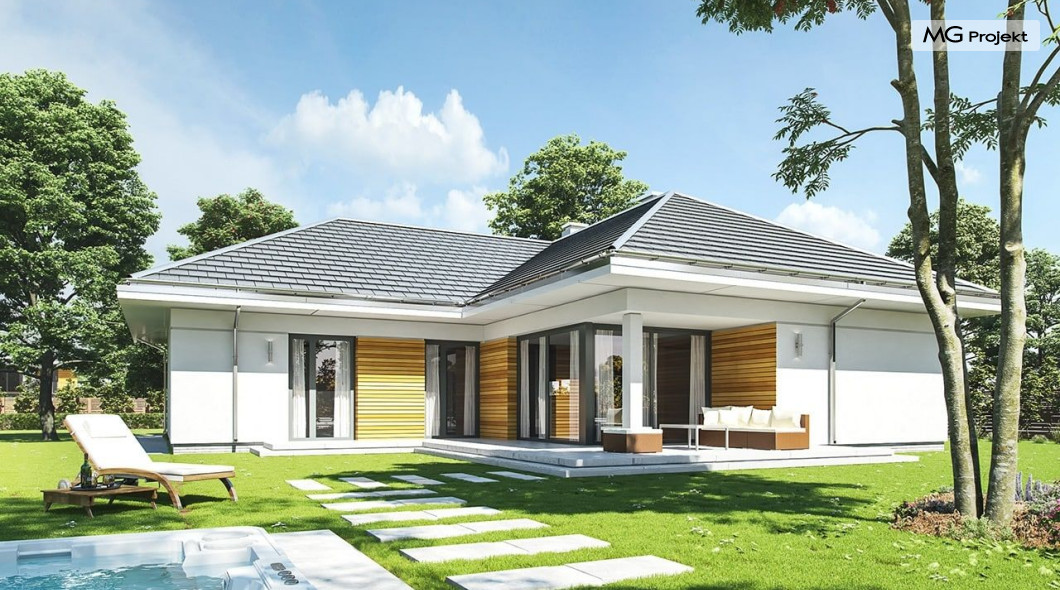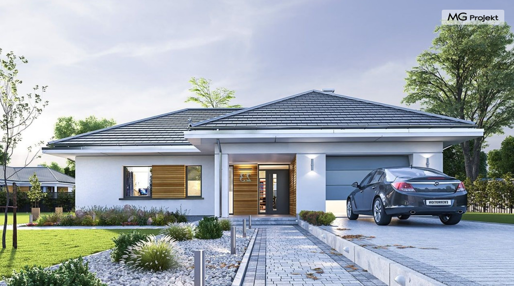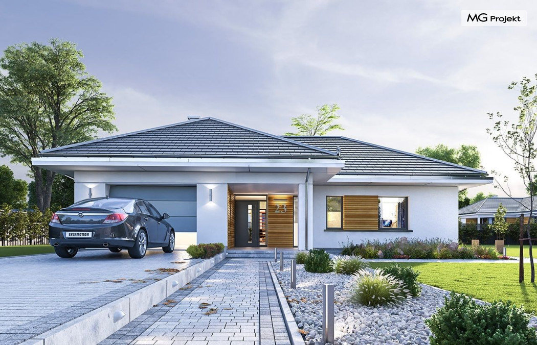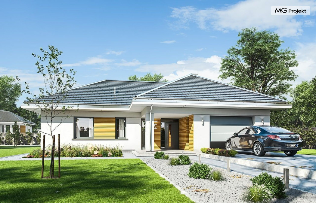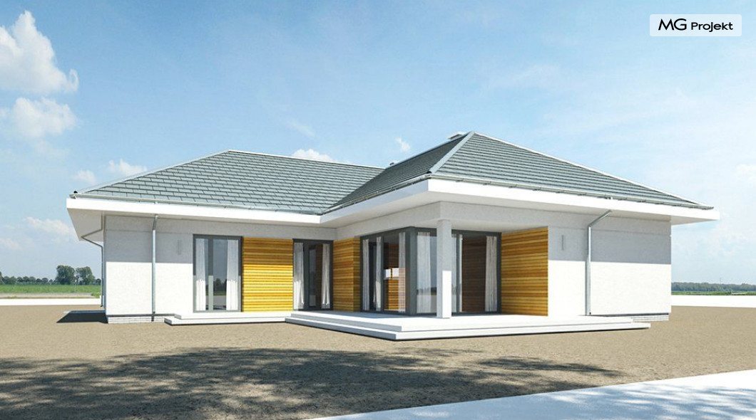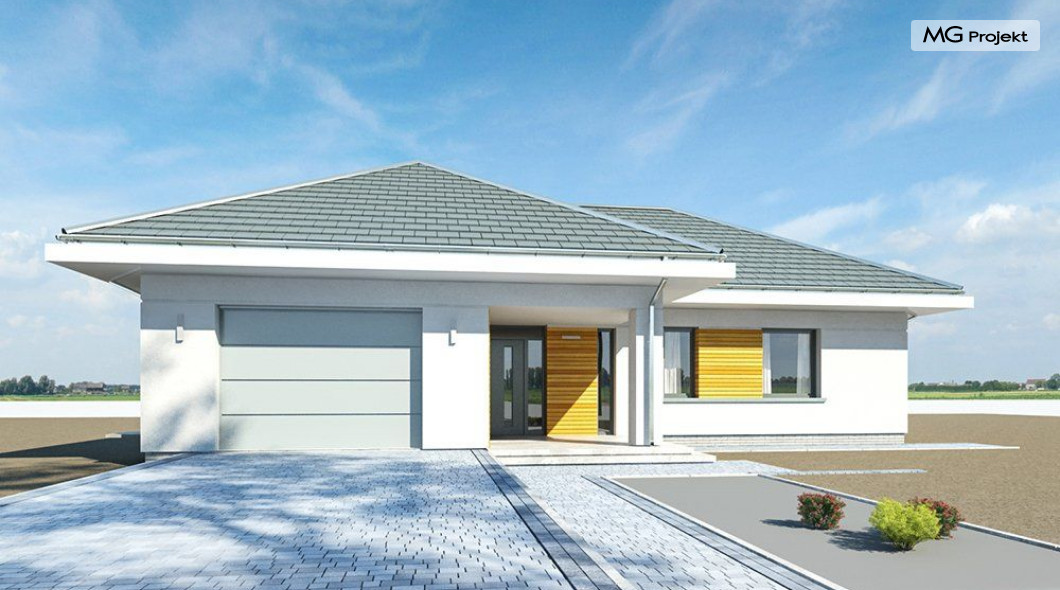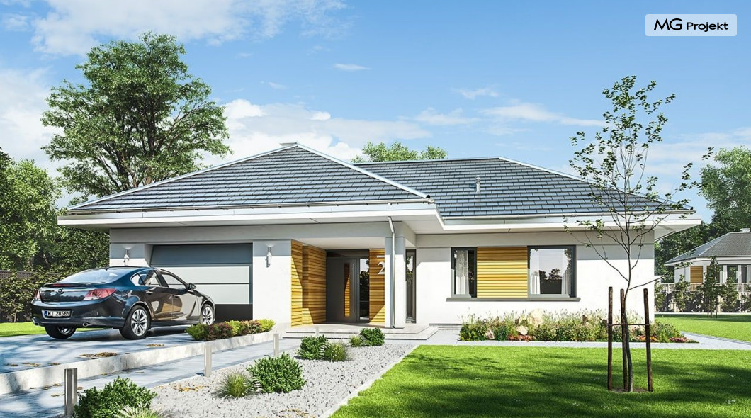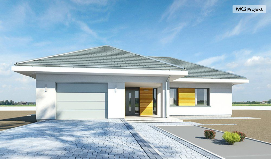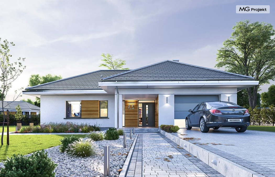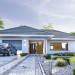 Projekt domu Parterowy to dom jednorodzinny dla czteroosobowej rodziny. Zaprojektowaliśmy już wiele jednokondygnacyjnych domków - ten projekt to nasza obecna odpowiedź na pytanie : jak powinien wyglądać sensowny średniej wielkości domek parterowy dla polskiej rodziny. Bryła domu została zbudowana na planie litery „T”. Dom Parterowy przykryty jest wielospadowym łagodnym dachem. Nowoczesna architektura domu została podkreślona odpowiednimi materiałami wykończeniowymi i kolorystyką. Dom jest nowoczesny, ale też stonowany, bez awangardowej przesady. Dzięki temu architektura domu będzie długo aktualna i nie zestarzeje się łatwo. Szare ramy okien i drzwi, oraz drewniane fragmenty ścian stanowią kontrast do bieli ścian. Całość bryły zwieńczona jest grafitowym dachem z płaskich dachówek. Front domu ozdobiona jest szerokim przeszklonym wejściem z naświetlami. Elewację ogrodową urozmaica narożne przeszklenie salonu połączone z podcieniem nad częścią tarasu. Wnętrze domu to trzy strefy, połączone częścią wejściową : przedsionkiem i holem. Na lewo z przedsionka przechodzimy do strefy gospodarczej domu, z ładnym garażem, kotłownią i strychem nad garażem. Na wprost sieni, przeszklonymi szerokimi drzwiami przechodzimy do holu i dalej do części dziennej, składającej się z salonu, jadalni i kuchni połączonych w jedno wspólne wnętrze, rozdzielone kominkiem. W projekcie domu Parterowy nad pokojem dziennym przewidziano otwarcie przestrzenne aż do dachu, oraz strych – antresolę ze schodkami, z widokiem na salon. Na antresoli można urządzić pokój rekreacyjny, albo gabinet-bibliotekę - wedle fantazji właścicieli. Trzecia część domu to sypialnie. Składa się z sypialni rodziców z garderobą, dwóch sypialni dziecięcych z szafami wbudowanymi, łazienki i oddzielnego wc. Nad sypialniami również znajduje się strych, dostępny z antresoli nad salonem. Projekt domu Parterowy jest nieduży, ale mieści wszystkie funkcje potrzebne do komfortowego życia pełnej rodziny. Bryła domu jest dość prosta. Budynek jest jednokondygnacyjny - nieskomplikowany i niedrogi w budowie i późniejszej eksploatacji. Jeśli macie Państwo w planach dom parterowy - z pewnością warto wziąć pod uwagę wybór tego projektu. Zapraszamy do zapoznania się z pełną ofertą pracowni MG Projekt: Parterowy 2, Parterowy 3, Parterowy 4.