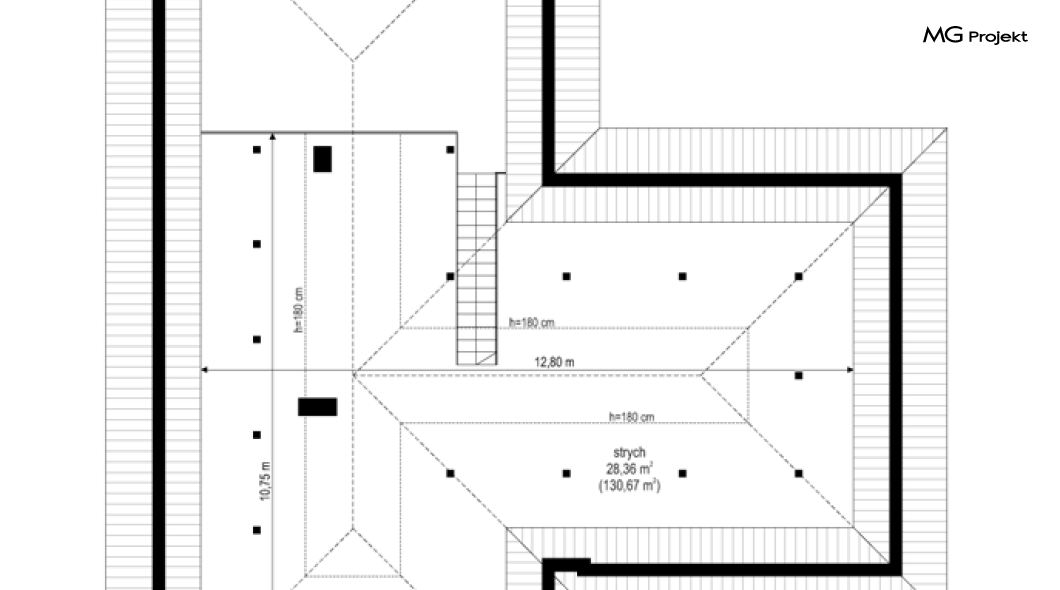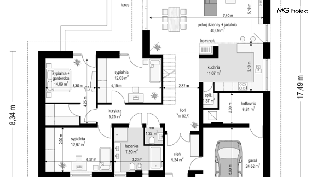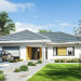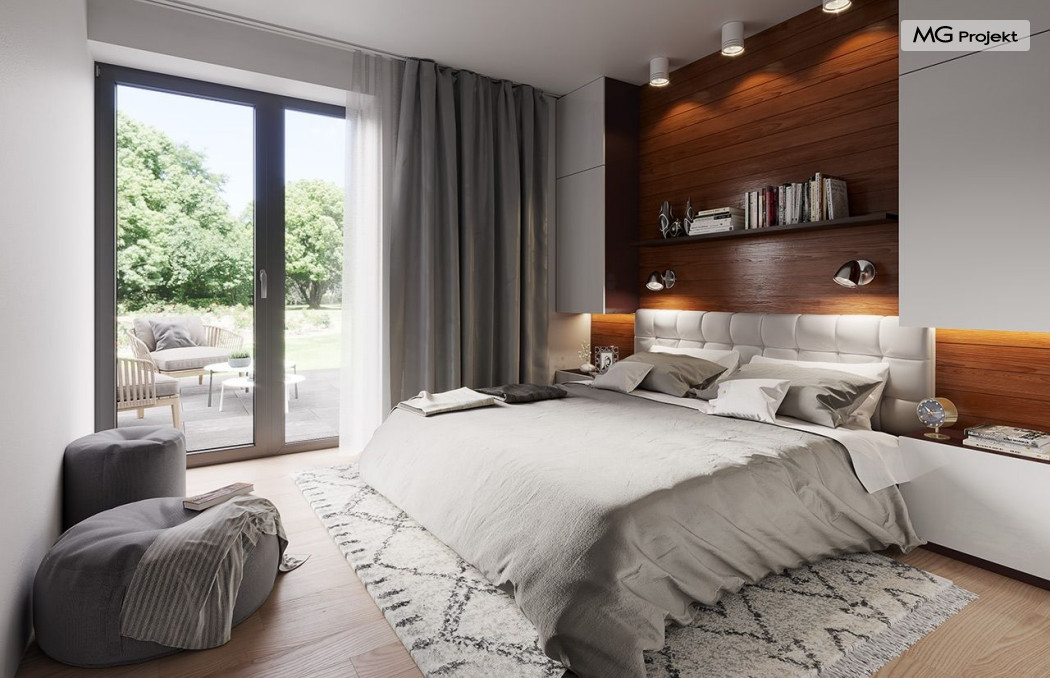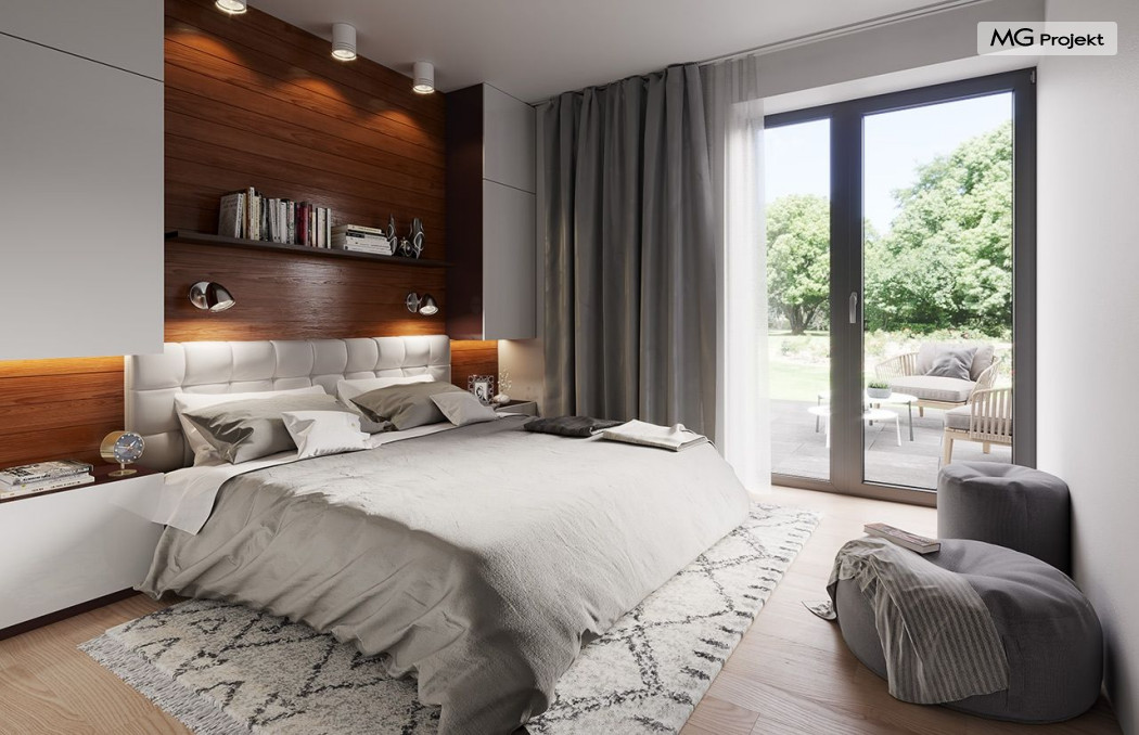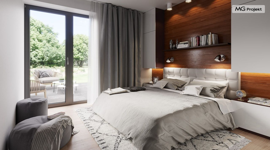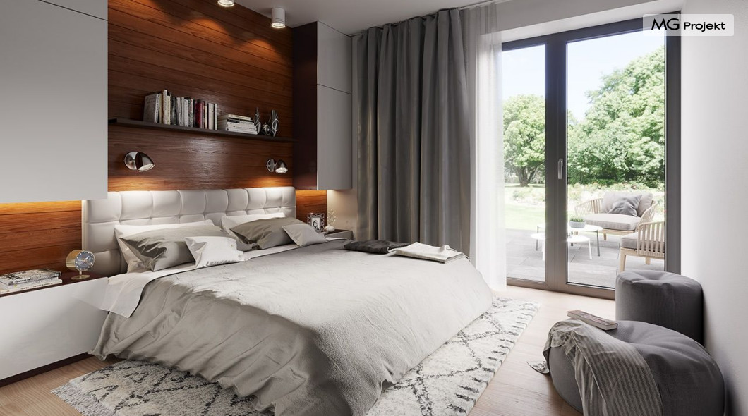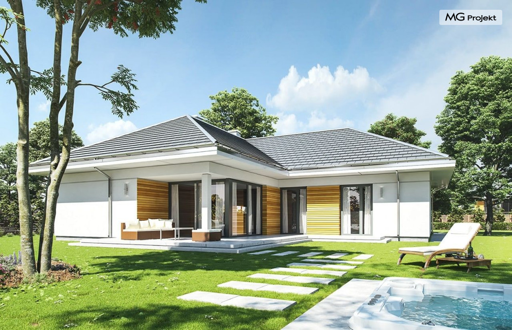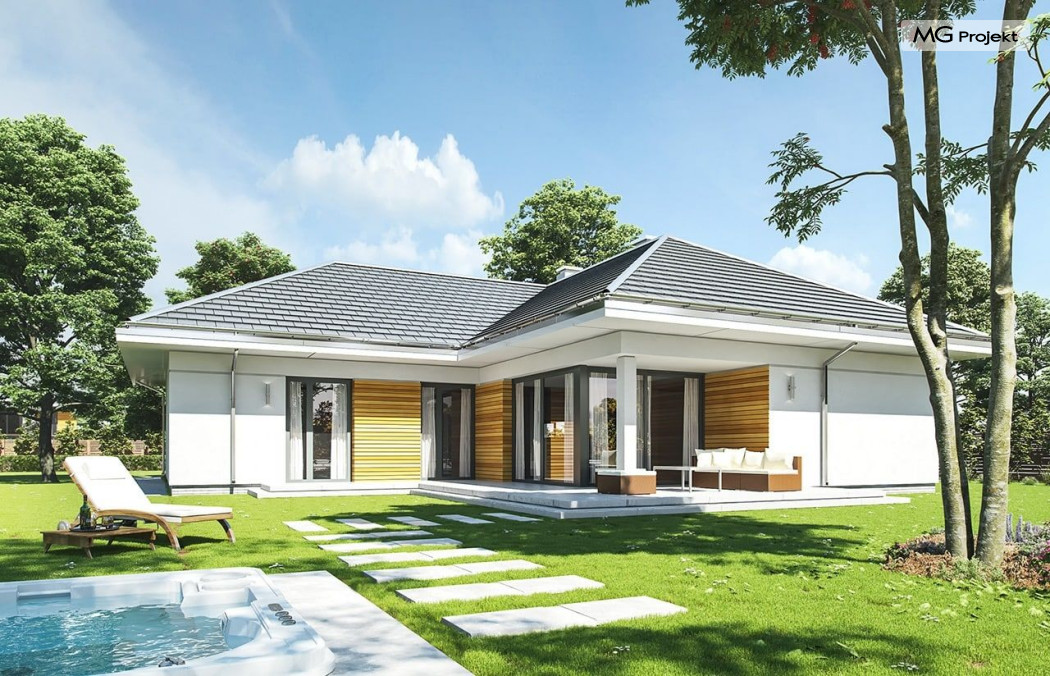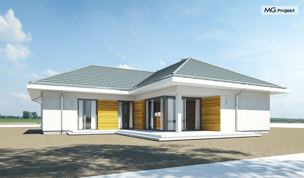 Projekt domu Parterowy to dom jednorodzinny dla czteroosobowej rodziny. Zaprojektowaliśmy już wiele jednokondygnacyjnych domków - ten projekt to nasza obecna odpowiedź na pytanie : jak powinien wyglądać sensowny średniej wielkości domek parterowy dla polskiej rodziny. Bryła domu została zbudowana na planie litery „T”. Dom Parterowy przykryty jest wielospadowym łagodnym dachem. Nowoczesna architektura domu została podkreślona odpowiednimi materiałami wykończeniowymi i kolorystyką. Dom jest nowoczesny, ale też stonowany, bez awangardowej przesady. Dzięki temu architektura domu będzie długo aktualna i nie zestarzeje się łatwo. Szare ramy okien i drzwi, oraz drewniane fragmenty ścian stanowią kontrast do bieli ścian. Całość bryły zwieńczona jest grafitowym dachem z płaskich dachówek. Front domu ozdobiona jest szerokim przeszklonym wejściem z naświetlami. Elewację ogrodową urozmaica narożne przeszklenie salonu połączone z podcieniem nad częścią tarasu. Wnętrze domu to trzy strefy, połączone częścią wejściową : przedsionkiem i holem. Na lewo z przedsionka przechodzimy do strefy gospodarczej domu, z ładnym garażem, kotłownią i strychem nad garażem. Na wprost sieni, przeszklonymi szerokimi drzwiami przechodzimy do holu i dalej do części dziennej, składającej się z salonu, jadalni i kuchni połączonych w jedno wspólne wnętrze, rozdzielone kominkiem. W projekcie domu Parterowy nad pokojem dziennym przewidziano otwarcie przestrzenne aż do dachu, oraz strych – antresolę ze schodkami, z widokiem na salon. Na antresoli można urządzić pokój rekreacyjny, albo gabinet-bibliotekę - wedle fantazji właścicieli. Trzecia część domu to sypialnie. Składa się z sypialni rodziców z garderobą, dwóch sypialni dziecięcych z szafami wbudowanymi, łazienki i oddzielnego wc. Nad sypialniami również znajduje się strych, dostępny z antresoli nad salonem. Projekt domu Parterowy jest nieduży, ale mieści wszystkie funkcje potrzebne do komfortowego życia pełnej rodziny. Bryła domu jest dość prosta. Budynek jest jednokondygnacyjny - nieskomplikowany i niedrogi w budowie i późniejszej eksploatacji. Jeśli macie Państwo w planach dom parterowy - z pewnością warto wziąć pod uwagę wybór tego projektu. Zapraszamy do zapoznania się z pełną ofertą pracowni MG Projekt: Parterowy 2, Parterowy 3, Parterowy 4.