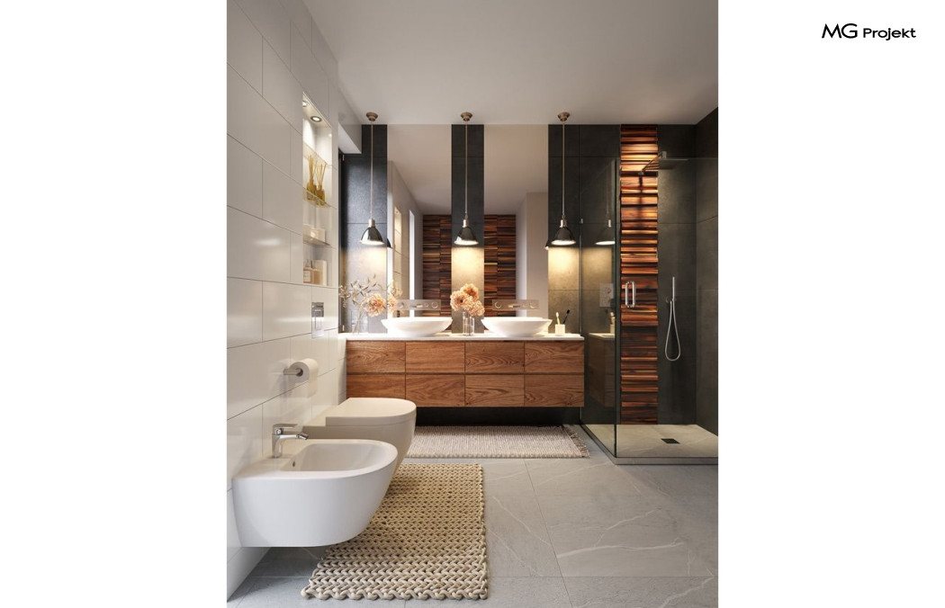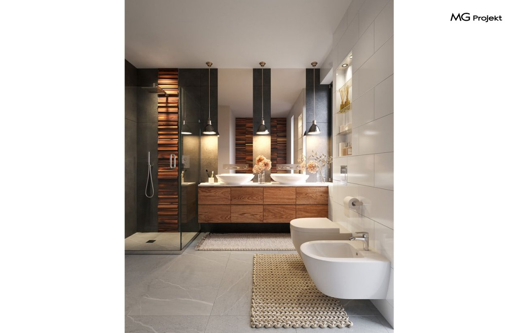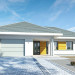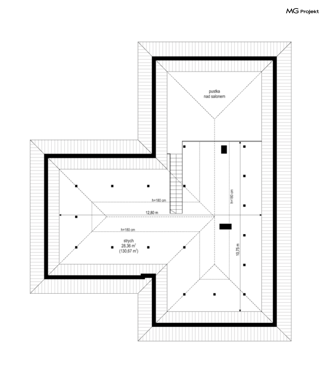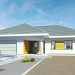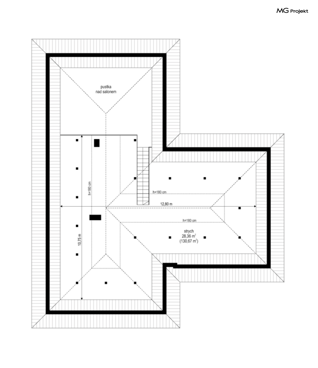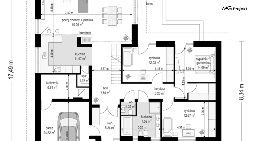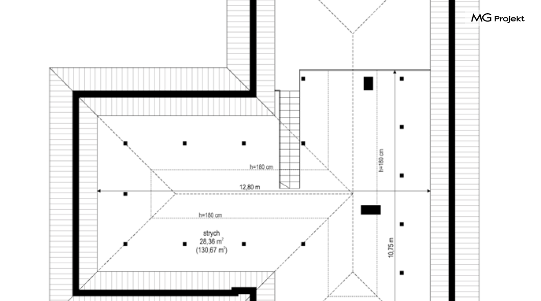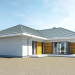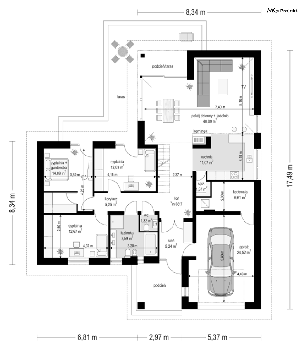Projekt domu Parterowy to dom jednorodzinny dla czteroosobowej rodziny. Zaprojektowaliśmy już wiele jednokondygnacyjnych domków - ten projekt to nasza obecna odpowiedź na pytanie : jak powinien wyglądać sensowny średniej wielkości domek parterowy dla polskiej rodziny. Bryła domu została zbudowana na planie litery „T”. Dom Parterowy przykryty jest wielospadowym łagodnym dachem. Nowoczesna architektura domu została podkreślona odpowiednimi materiałami wykończeniowymi i kolorystyką. Dom jest nowoczesny, ale też stonowany, bez awangardowej przesady. Dzięki temu architektura domu będzie długo aktualna i nie zestarzeje się łatwo. Szare ramy okien i drzwi, oraz drewniane fragmenty ścian stanowią kontrast do bieli ścian. Całość bryły zwieńczona jest grafitowym dachem z płaskich dachówek. Front domu ozdobiona jest szerokim przeszklonym wejściem z naświetlami. Elewację ogrodową urozmaica narożne przeszklenie salonu połączone z podcieniem nad częścią tarasu. Wnętrze domu to trzy strefy, połączone częścią wejściową : przedsionkiem i holem. Na lewo z przedsionka przechodzimy do strefy gospodarczej domu, z ładnym garażem, kotłownią i strychem nad garażem. Na wprost sieni, przeszklonymi szerokimi drzwiami przechodzimy do holu i dalej do części dziennej, składającej się z salonu, jadalni i kuchni połączonych w jedno wspólne wnętrze, rozdzielone kominkiem. W projekcie domu Parterowy nad pokojem dziennym przewidziano otwarcie przestrzenne aż do dachu, oraz strych – antresolę ze schodkami, z widokiem na salon. Na antresoli można urządzić pokój rekreacyjny, albo gabinet-bibliotekę - wedle fantazji właścicieli. Trzecia część domu to sypialnie. Składa się z sypialni rodziców z garderobą, dwóch sypialni dziecięcych z szafami wbudowanymi, łazienki i oddzielnego wc. Nad sypialniami również znajduje się strych, dostępny z antresoli nad salonem. Projekt domu Parterowy jest nieduży, ale mieści wszystkie funkcje potrzebne do komfortowego życia pełnej rodziny. Bryła domu jest dość prosta. Budynek jest jednokondygnacyjny - nieskomplikowany i niedrogi w budowie i późniejszej eksploatacji. Jeśli macie Państwo w planach dom parterowy - z pewnością warto wziąć pod uwagę wybór tego projektu. Zapraszamy do zapoznania się z pełną ofertą pracowni MG Projekt: Parterowy 2, Parterowy 3, Parterowy 4.