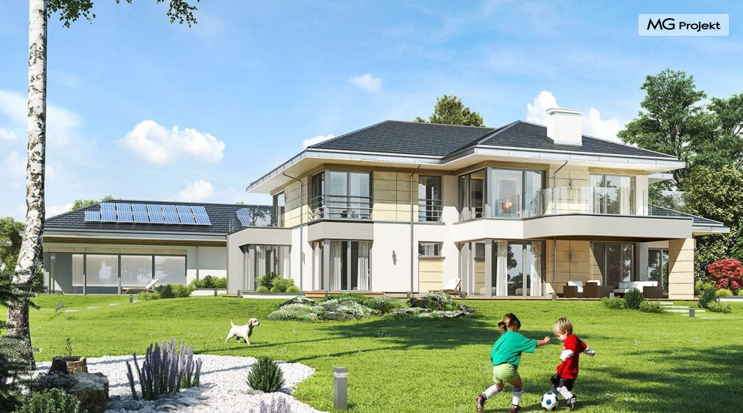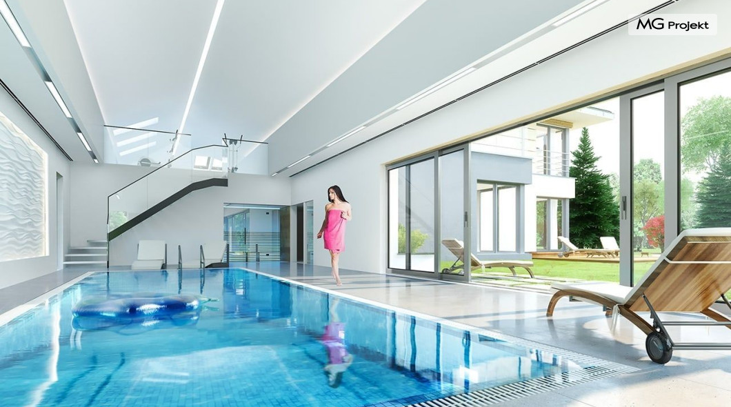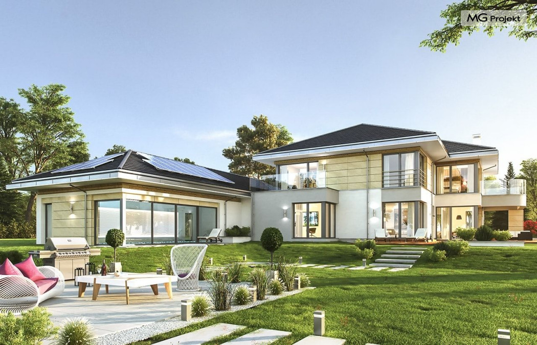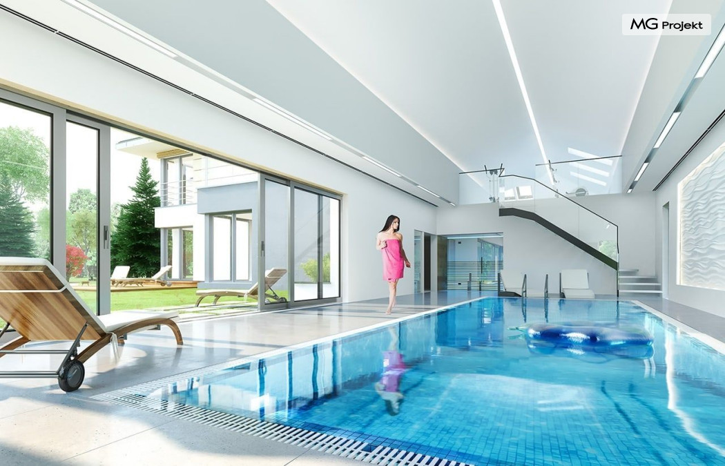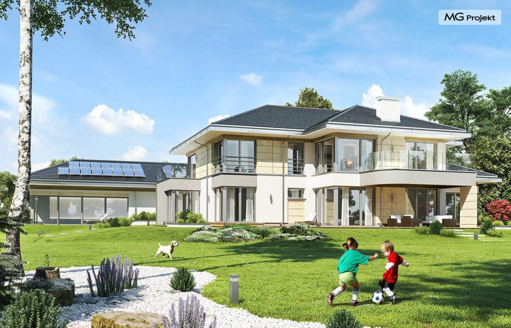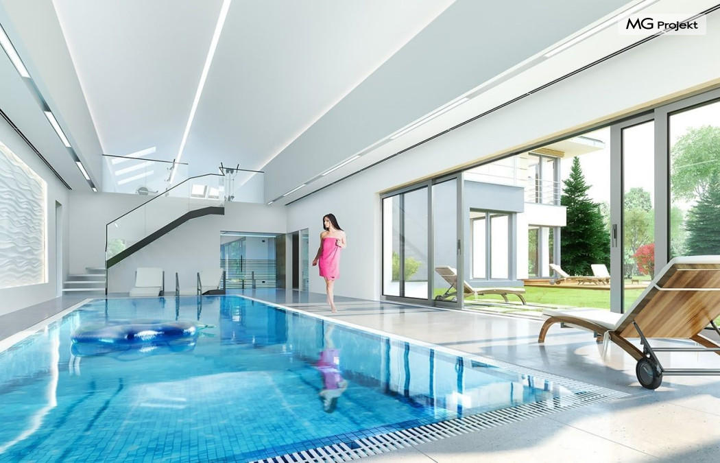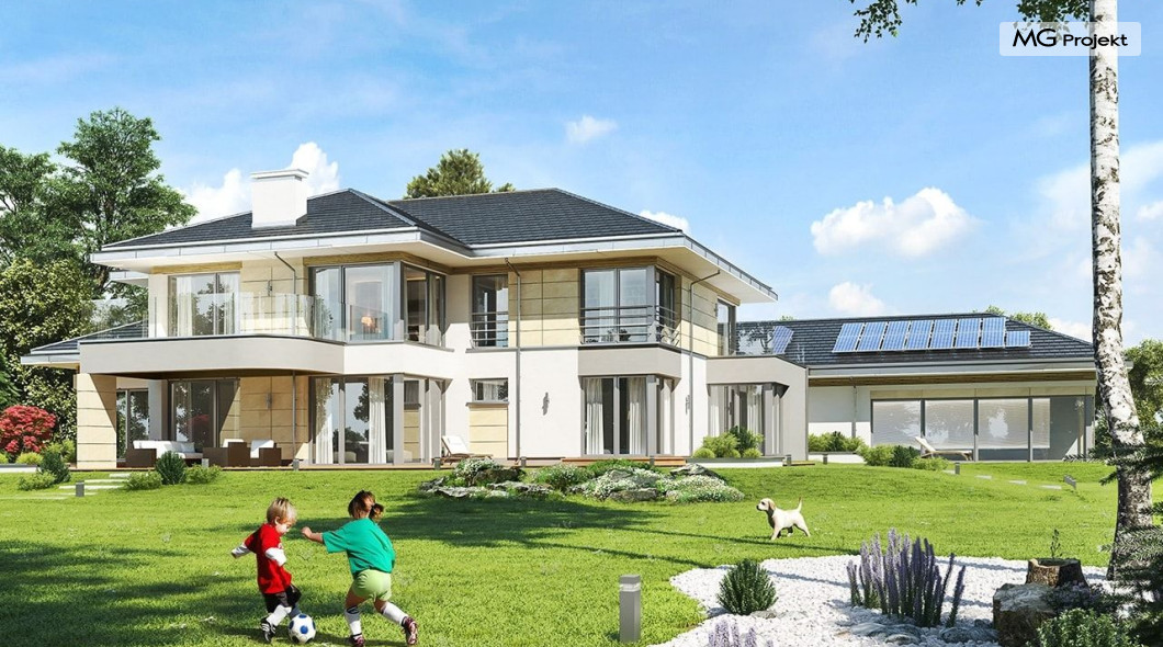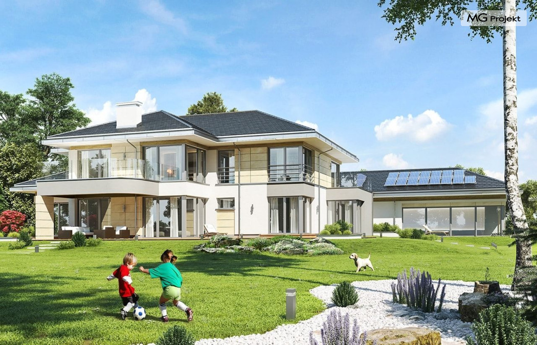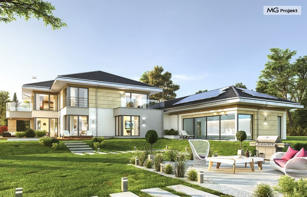 Projekt domu Rezydencja z widokiem to projekt okazałej rezydencji, największego z serii „Domów z widokiem”. Jest to luksusowy, superkomfortowy dom jednorodzinny dla cztero-, a nawet sośmioosobowej rodziny. To piękna, rozłożysta willa z mnóstwem przestrzeni i z częścią rekreacyjno - basenową. Budynek powtarza rozwiązania i detale popularnego i modnego wśród Klientów „Domu z widokiem”, ale jest to wydanie superluksusowe tego projektu. Architektura : rdzeniem domu jest piętrowa dwukondygnacyjna bryła części mieszkalnej. Wokół niej dołączono parterowe części z poddaszami. Od frontu jest to część nad kuchnią i jadalnią, oraz skrzydło garaży i pomieszczeń gospodarczych. Od strony ogrodu natomiast jest to dodatkowe skrzydło zawierające salę basenową, oraz podcienie i tarasy przy salonie. Motywem przewodnim w architekturze rezydencji są duże narożne okna, podział elewacji na poziome pasy wykończone kontrastującymi materiałami, oraz układ łagodnych wielospadowych dachów, przykrywających piętrową i parterowe bryły, tworząc ciekawą kompozycję. Projekt domu Rezydencja z widokiem ma bardzo dużą powierzchnię, jednak dzięki właściwym proporcjom i zróżnicowaniu brył nie przytłacza. Z pewnością robi wrażenie luksusowej rezydencji, ale nie straszy swoją skalą. Do domu wchodzimy przez przeszklony narożnik z szerokimi reprezentacyjnymi drzwiami wejściowymi wprost do przedsionka. Stamtąd przeszklonymi drzwiami do pięknego holu otwierającego się na salon. Jednoprzestrzenne wnętrze holu, salonu, szerokich schodów, jadalni i kuchni tworzą wspólną przestrzeń dzienną domowników. Są jednocześnie doskonałą oprawą dla spotkań w większym i mniejszym gronie gości. Przestronna kuchnia z wyspą i pięknym narożnym oknem będzie z kolei dobrym miejscem do szybkich interakcji między domownikami w biegu dnia. Na parterze obok części dziennej przewidziano miejsce na apartament rodziców, składający się z sypialni, łazienki, dwóch garderób i gabinetu do pracy. Tą część domu można oczywiście dowolnie zaaranżować - według potrzeb inwestorów. Przy wejściu do domu mamy naprawdę duży garaż, oraz dodatkową przestrzeń gospodarczą z pomieszczeniem technicznym na instalacje. Za tą częścią domu znajduje się sala basenowa, z dużą 10-ciometrową niecką, sauną, natryskiem, oraz salką rekreacyjno-sportową na poddaszu-antresoli nad basenem. Wszystkie pokoje mają piękne okna na okalające dom tarasy. Na piętrze zaprojektowano aż pięć pokoi, dwie łazienki i pralnię. Z piętra można też przejść bez problemu do pokoju sportowego. Podziały piętra na pomieszczenia i nadanie pokojom innych funkcji są oczywiście możliwe. Przy monolitycznych żelbetowych stropach domu można właściwie dowolnie przestawiać ścianki działowe - wedle życzenia i wyobraźni właścicieli. Projekt domu Rezydencja z widokiem to z pewnością propozycja dla osób planujących budowę dużego domu. Taka willa to dla wielu osób spełnienie marzeń. Dom nie będzie najtańszy, ale jeśli można sobie na to pozwolić, to czy nie warto czasem podarować sobie „odrobinę” luksusu, po to żeby piękniej żyć i mieszkać ? Zapraszamy !
