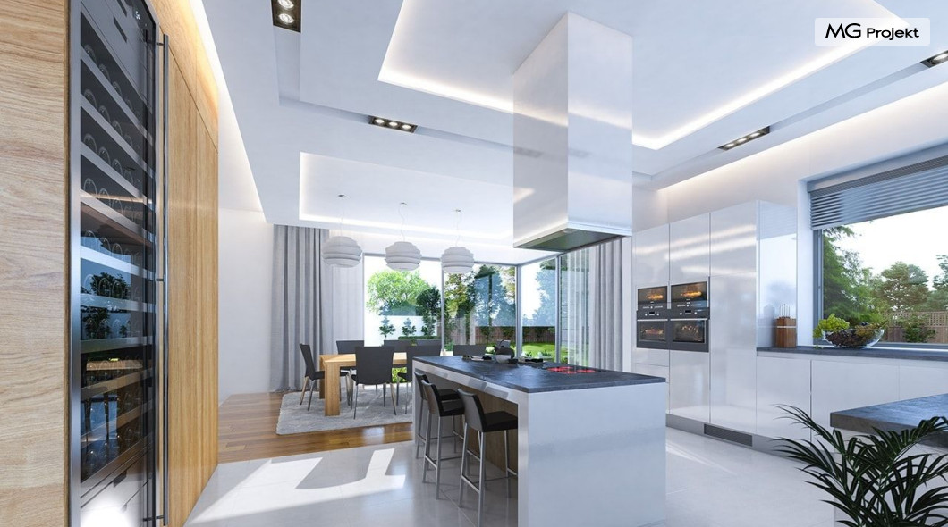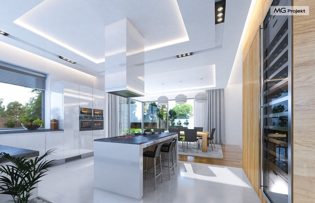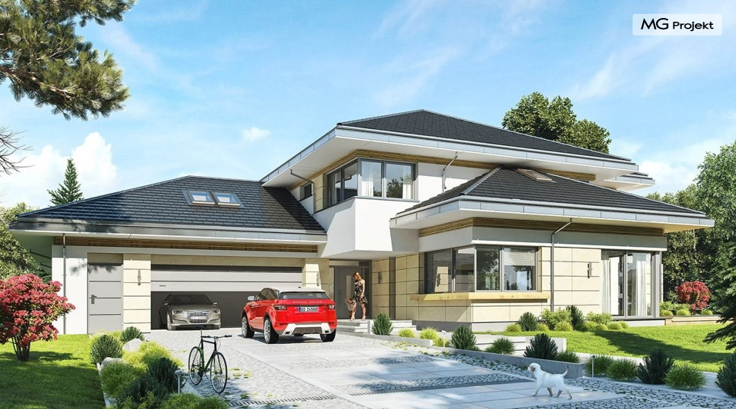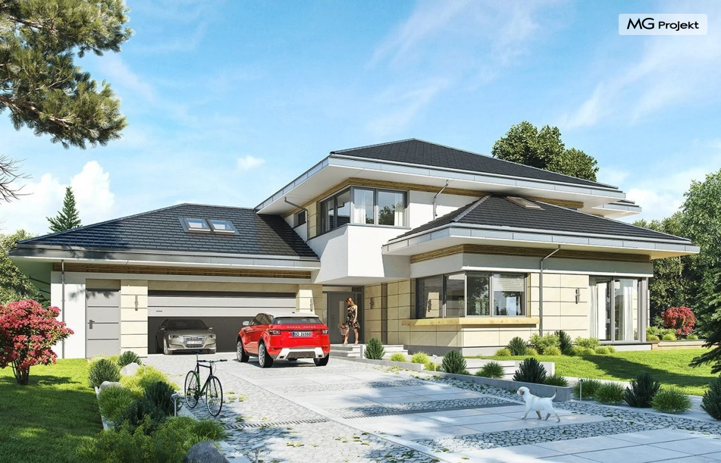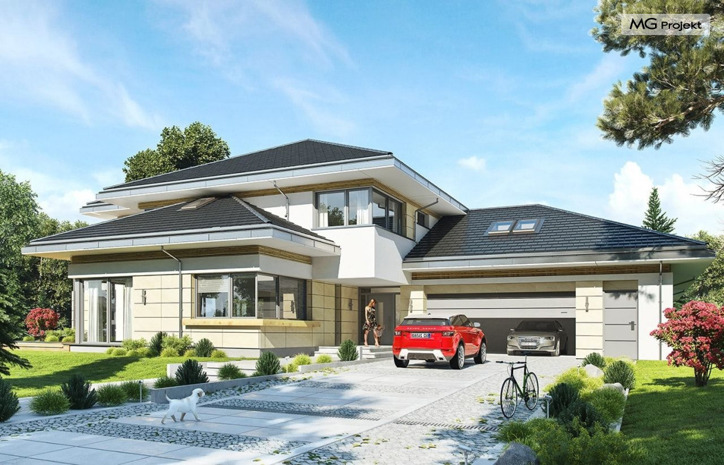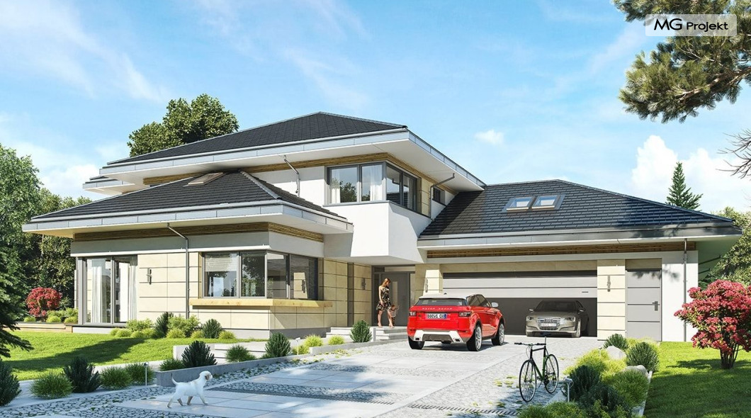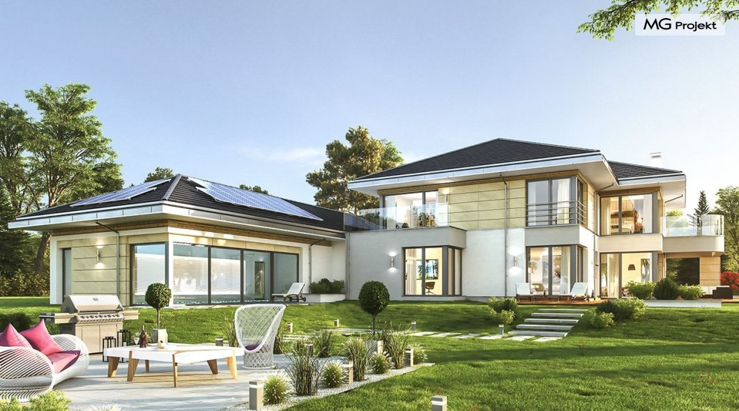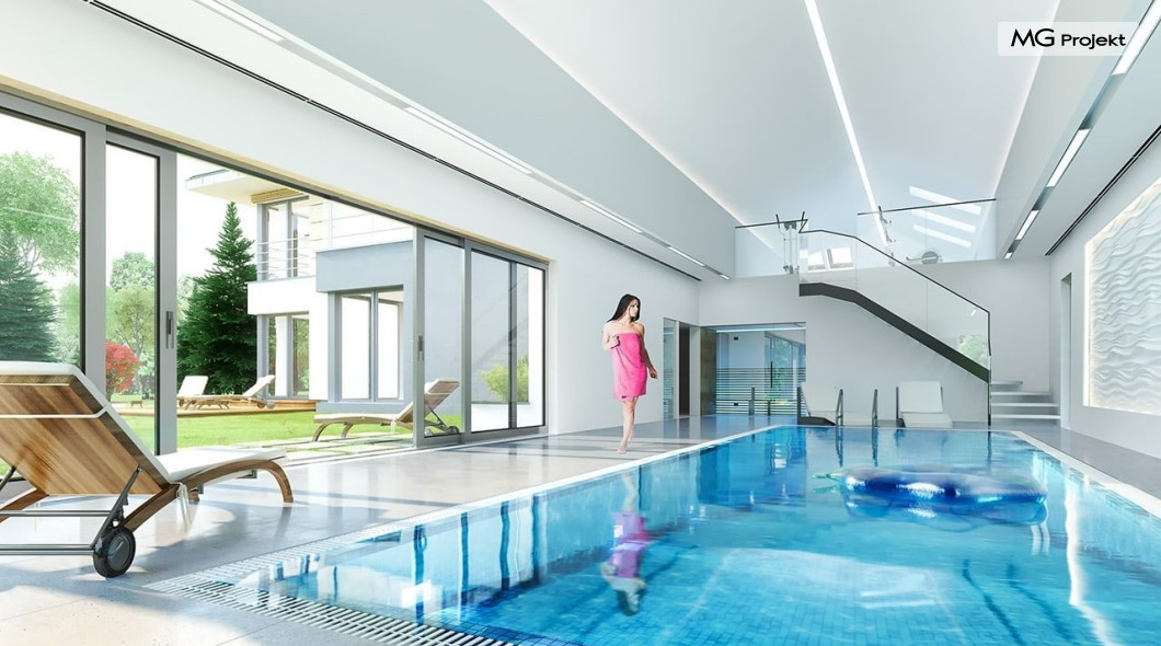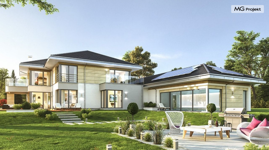 Projekt domu Rezydencja z widokiem to projekt okazałej rezydencji, największego z serii „Domów z widokiem”. Jest to luksusowy, superkomfortowy dom jednorodzinny dla cztero-, a nawet sośmioosobowej rodziny. To piękna, rozłożysta willa z mnóstwem przestrzeni i z częścią rekreacyjno - basenową. Budynek powtarza rozwiązania i detale popularnego i modnego wśród Klientów „Domu z widokiem”, ale jest to wydanie superluksusowe tego projektu. Architektura : rdzeniem domu jest piętrowa dwukondygnacyjna bryła części mieszkalnej. Wokół niej dołączono parterowe części z poddaszami. Od frontu jest to część nad kuchnią i jadalnią, oraz skrzydło garaży i pomieszczeń gospodarczych. Od strony ogrodu natomiast jest to dodatkowe skrzydło zawierające salę basenową, oraz podcienie i tarasy przy salonie. Motywem przewodnim w architekturze rezydencji są duże narożne okna, podział elewacji na poziome pasy wykończone kontrastującymi materiałami, oraz układ łagodnych wielospadowych dachów, przykrywających piętrową i parterowe bryły, tworząc ciekawą kompozycję. Projekt domu Rezydencja z widokiem ma bardzo dużą powierzchnię, jednak dzięki właściwym proporcjom i zróżnicowaniu brył nie przytłacza. Z pewnością robi wrażenie luksusowej rezydencji, ale nie straszy swoją skalą. Do domu wchodzimy przez przeszklony narożnik z szerokimi reprezentacyjnymi drzwiami wejściowymi wprost do przedsionka. Stamtąd przeszklonymi drzwiami do pięknego holu otwierającego się na salon. Jednoprzestrzenne wnętrze holu, salonu, szerokich schodów, jadalni i kuchni tworzą wspólną przestrzeń dzienną domowników. Są jednocześnie doskonałą oprawą dla spotkań w większym i mniejszym gronie gości. Przestronna kuchnia z wyspą i pięknym narożnym oknem będzie z kolei dobrym miejscem do szybkich interakcji między domownikami w biegu dnia. Na parterze obok części dziennej przewidziano miejsce na apartament rodziców, składający się z sypialni, łazienki, dwóch garderób i gabinetu do pracy. Tą część domu można oczywiście dowolnie zaaranżować - według potrzeb inwestorów. Przy wejściu do domu mamy naprawdę duży garaż, oraz dodatkową przestrzeń gospodarczą z pomieszczeniem technicznym na instalacje. Za tą częścią domu znajduje się sala basenowa, z dużą 10-ciometrową niecką, sauną, natryskiem, oraz salką rekreacyjno-sportową na poddaszu-antresoli nad basenem. Wszystkie pokoje mają piękne okna na okalające dom tarasy. Na piętrze zaprojektowano aż pięć pokoi, dwie łazienki i pralnię. Z piętra można też przejść bez problemu do pokoju sportowego. Podziały piętra na pomieszczenia i nadanie pokojom innych funkcji są oczywiście możliwe. Przy monolitycznych żelbetowych stropach domu można właściwie dowolnie przestawiać ścianki działowe - wedle życzenia i wyobraźni właścicieli. Projekt domu Rezydencja z widokiem to z pewnością propozycja dla osób planujących budowę dużego domu. Taka willa to dla wielu osób spełnienie marzeń. Dom nie będzie najtańszy, ale jeśli można sobie na to pozwolić, to czy nie warto czasem podarować sobie „odrobinę” luksusu, po to żeby piękniej żyć i mieszkać ? Zapraszamy !