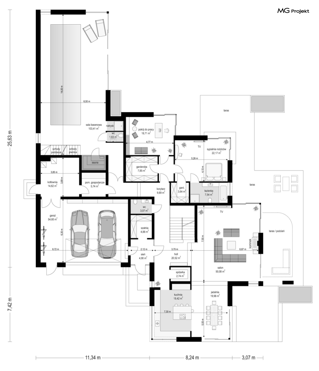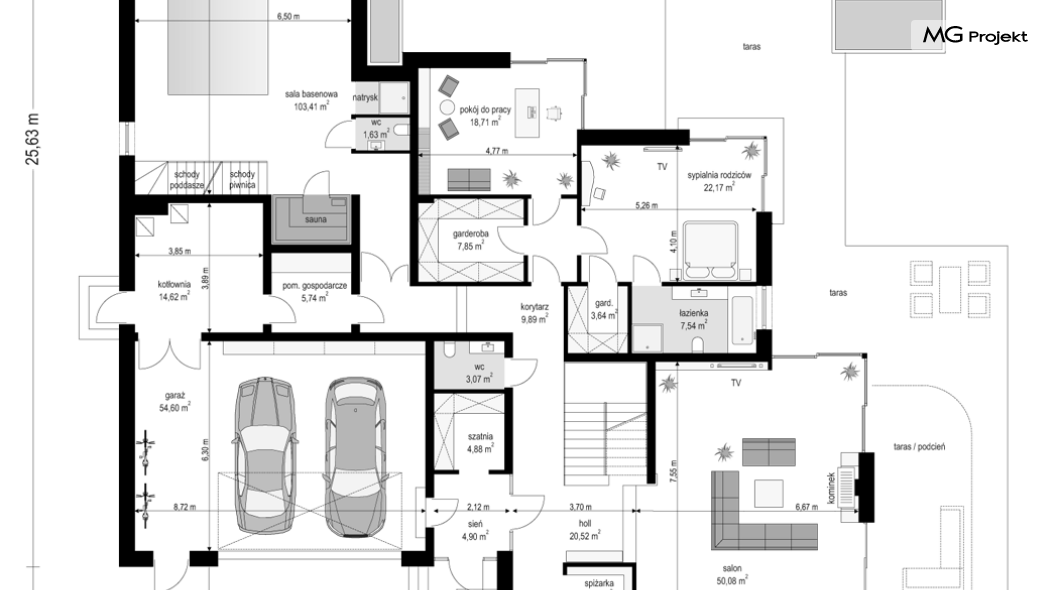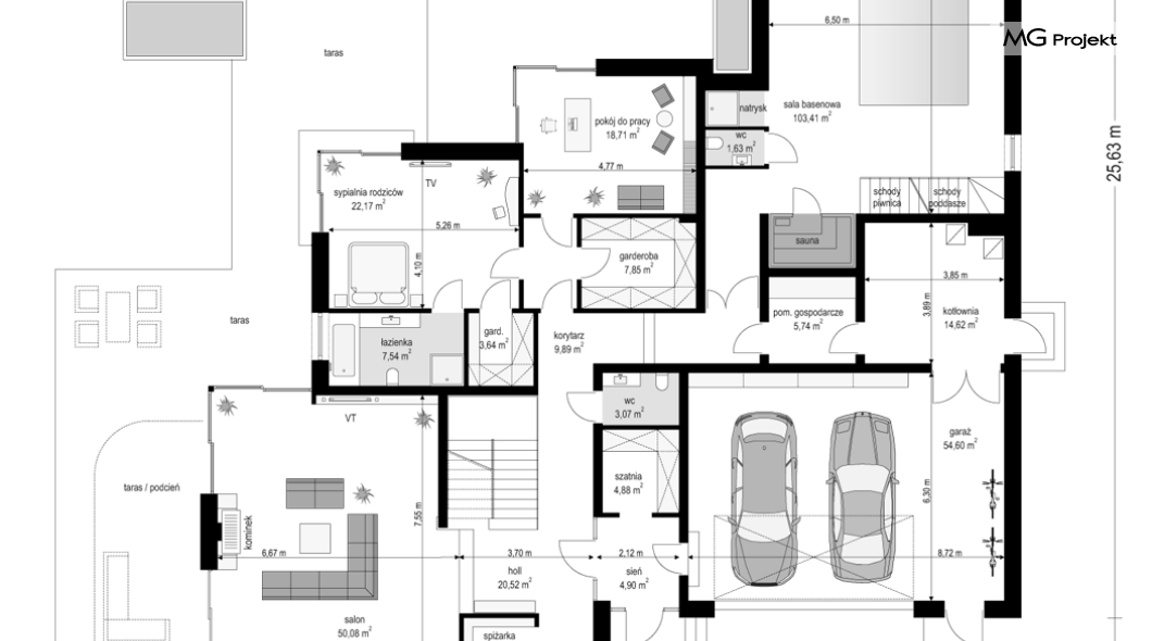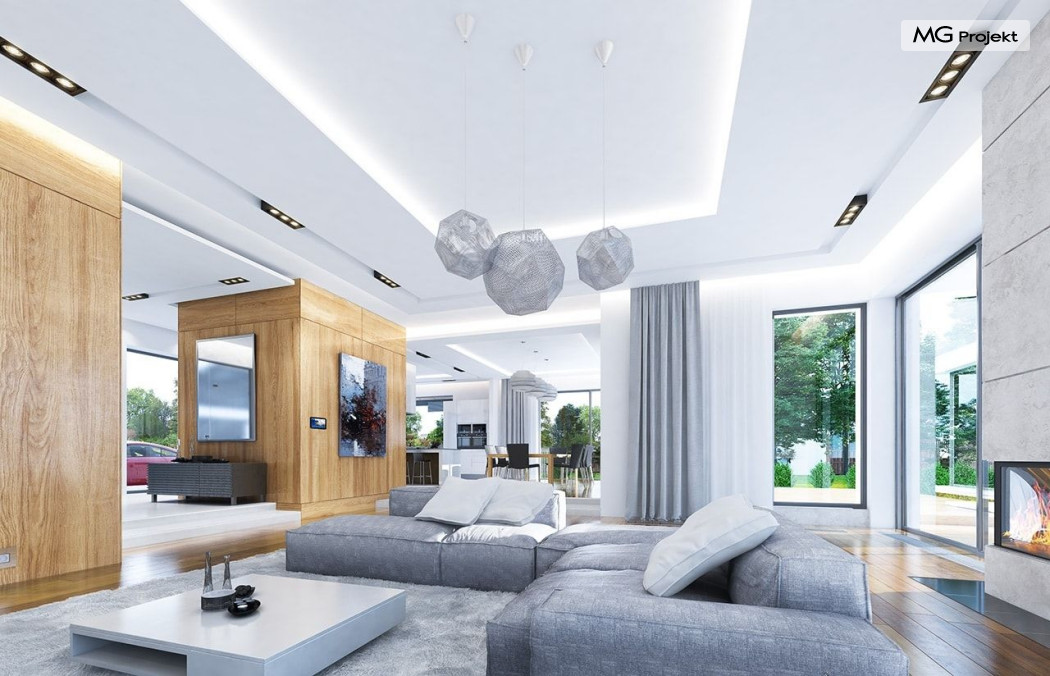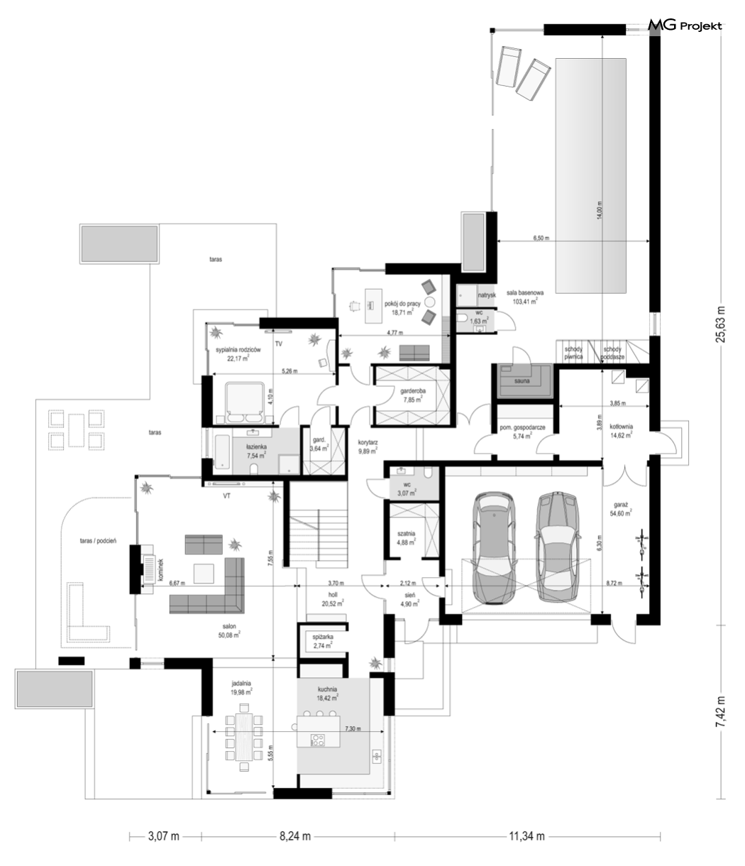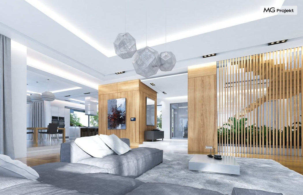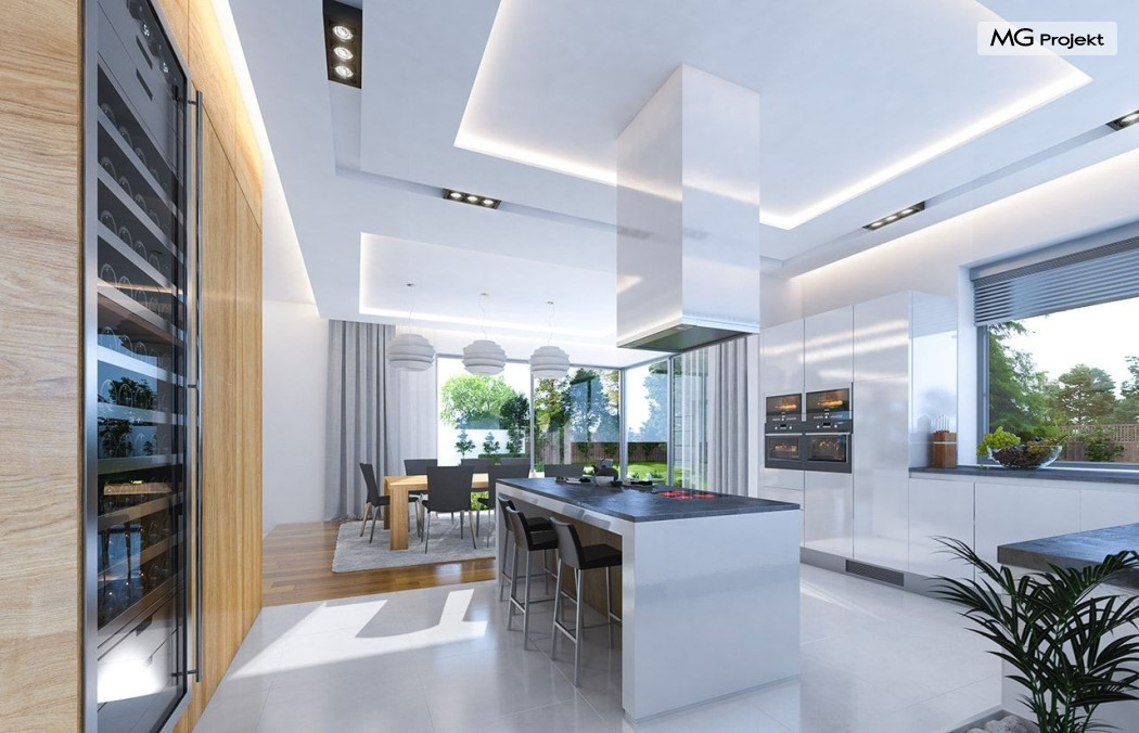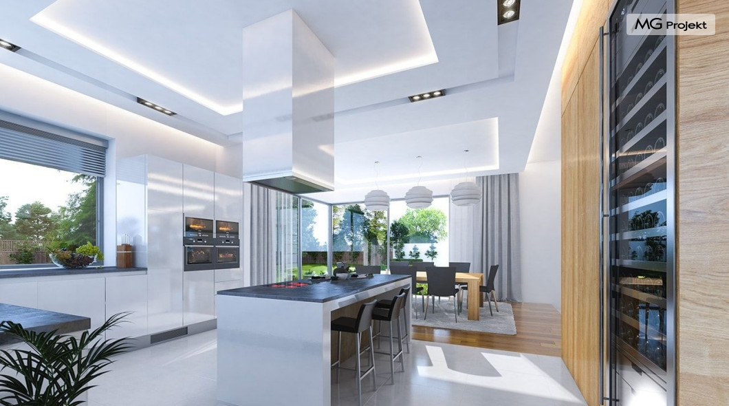 Projekt domu Rezydencja z widokiem to projekt okazałej rezydencji, największego z serii „Domów z widokiem”. Jest to luksusowy, superkomfortowy dom jednorodzinny dla cztero-, a nawet sośmioosobowej rodziny. To piękna, rozłożysta willa z mnóstwem przestrzeni i z częścią rekreacyjno - basenową. Budynek powtarza rozwiązania i detale popularnego i modnego wśród Klientów „Domu z widokiem”, ale jest to wydanie superluksusowe tego projektu. Architektura : rdzeniem domu jest piętrowa dwukondygnacyjna bryła części mieszkalnej. Wokół niej dołączono parterowe części z poddaszami. Od frontu jest to część nad kuchnią i jadalnią, oraz skrzydło garaży i pomieszczeń gospodarczych. Od strony ogrodu natomiast jest to dodatkowe skrzydło zawierające salę basenową, oraz podcienie i tarasy przy salonie. Motywem przewodnim w architekturze rezydencji są duże narożne okna, podział elewacji na poziome pasy wykończone kontrastującymi materiałami, oraz układ łagodnych wielospadowych dachów, przykrywających piętrową i parterowe bryły, tworząc ciekawą kompozycję. Projekt domu Rezydencja z widokiem ma bardzo dużą powierzchnię, jednak dzięki właściwym proporcjom i zróżnicowaniu brył nie przytłacza. Z pewnością robi wrażenie luksusowej rezydencji, ale nie straszy swoją skalą. Do domu wchodzimy przez przeszklony narożnik z szerokimi reprezentacyjnymi drzwiami wejściowymi wprost do przedsionka. Stamtąd przeszklonymi drzwiami do pięknego holu otwierającego się na salon. Jednoprzestrzenne wnętrze holu, salonu, szerokich schodów, jadalni i kuchni tworzą wspólną przestrzeń dzienną domowników. Są jednocześnie doskonałą oprawą dla spotkań w większym i mniejszym gronie gości. Przestronna kuchnia z wyspą i pięknym narożnym oknem będzie z kolei dobrym miejscem do szybkich interakcji między domownikami w biegu dnia. Na parterze obok części dziennej przewidziano miejsce na apartament rodziców, składający się z sypialni, łazienki, dwóch garderób i gabinetu do pracy. Tą część domu można oczywiście dowolnie zaaranżować - według potrzeb inwestorów. Przy wejściu do domu mamy naprawdę duży garaż, oraz dodatkową przestrzeń gospodarczą z pomieszczeniem technicznym na instalacje. Za tą częścią domu znajduje się sala basenowa, z dużą 10-ciometrową niecką, sauną, natryskiem, oraz salką rekreacyjno-sportową na poddaszu-antresoli nad basenem. Wszystkie pokoje mają piękne okna na okalające dom tarasy. Na piętrze zaprojektowano aż pięć pokoi, dwie łazienki i pralnię. Z piętra można też przejść bez problemu do pokoju sportowego. Podziały piętra na pomieszczenia i nadanie pokojom innych funkcji są oczywiście możliwe. Przy monolitycznych żelbetowych stropach domu można właściwie dowolnie przestawiać ścianki działowe - wedle życzenia i wyobraźni właścicieli. Projekt domu Rezydencja z widokiem to z pewnością propozycja dla osób planujących budowę dużego domu. Taka willa to dla wielu osób spełnienie marzeń. Dom nie będzie najtańszy, ale jeśli można sobie na to pozwolić, to czy nie warto czasem podarować sobie „odrobinę” luksusu, po to żeby piękniej żyć i mieszkać ? Zapraszamy !
