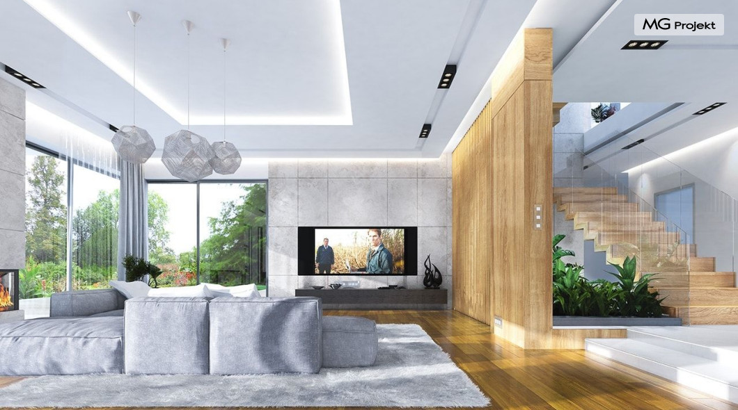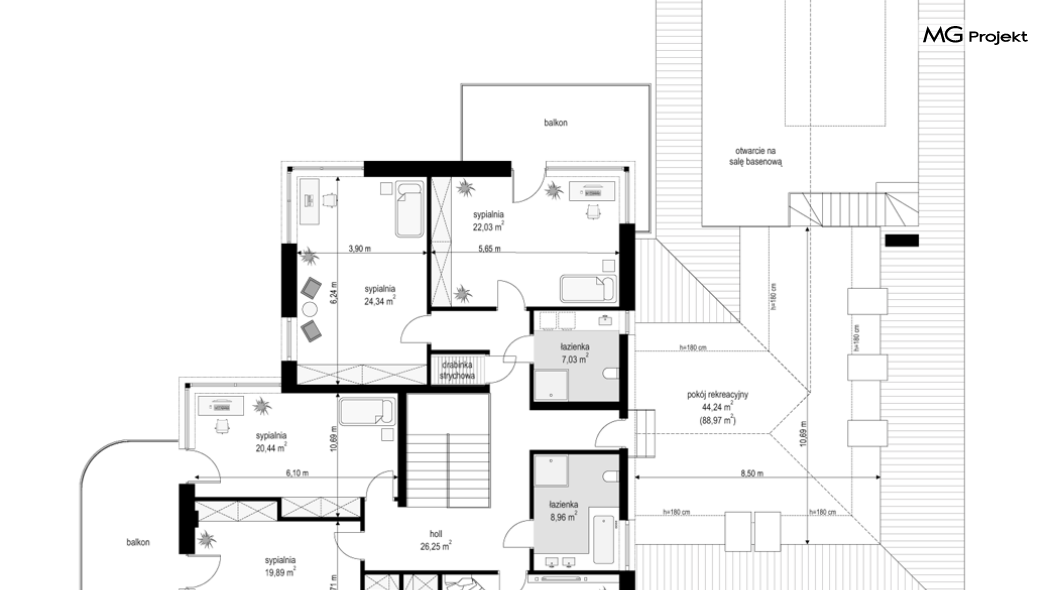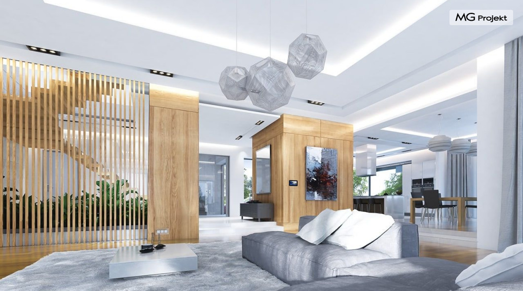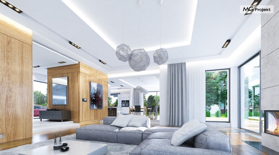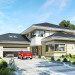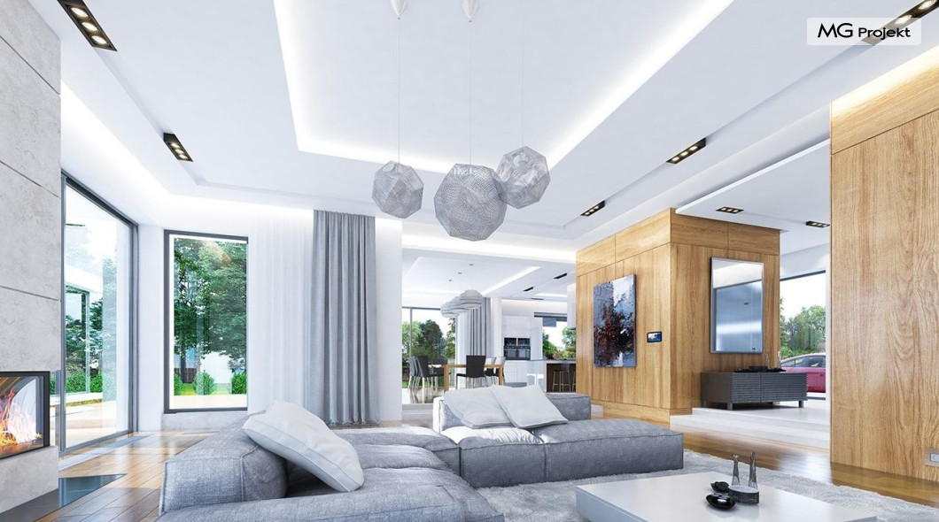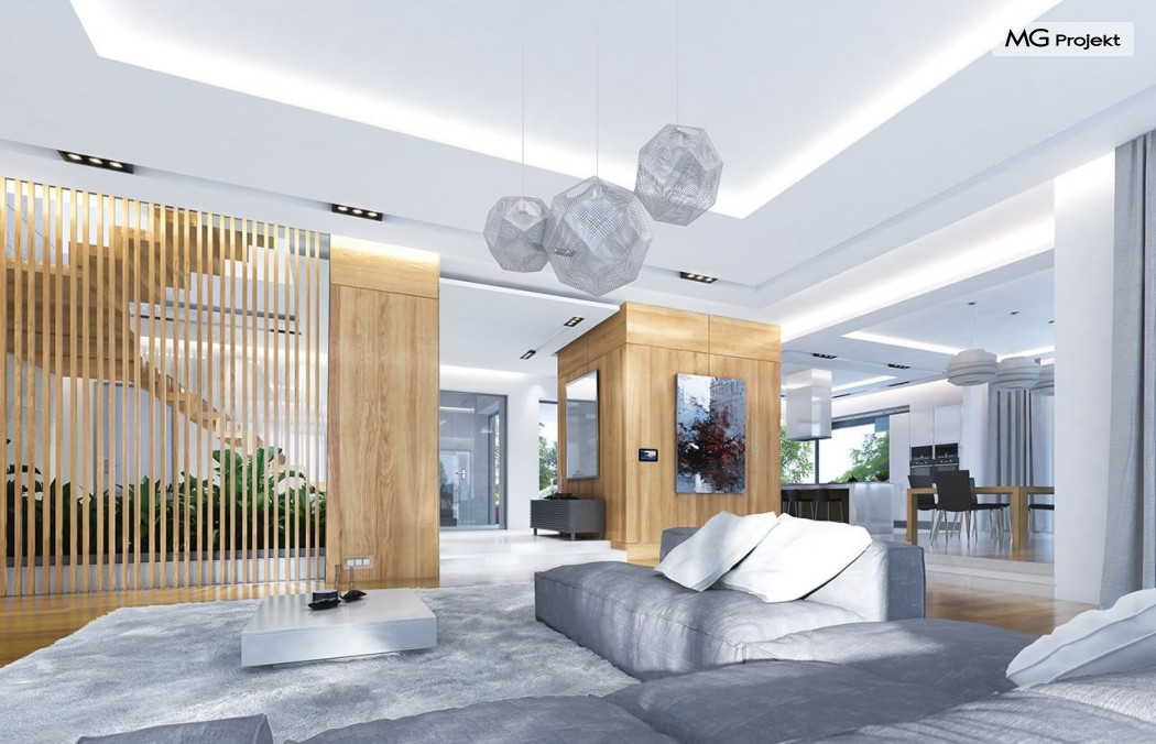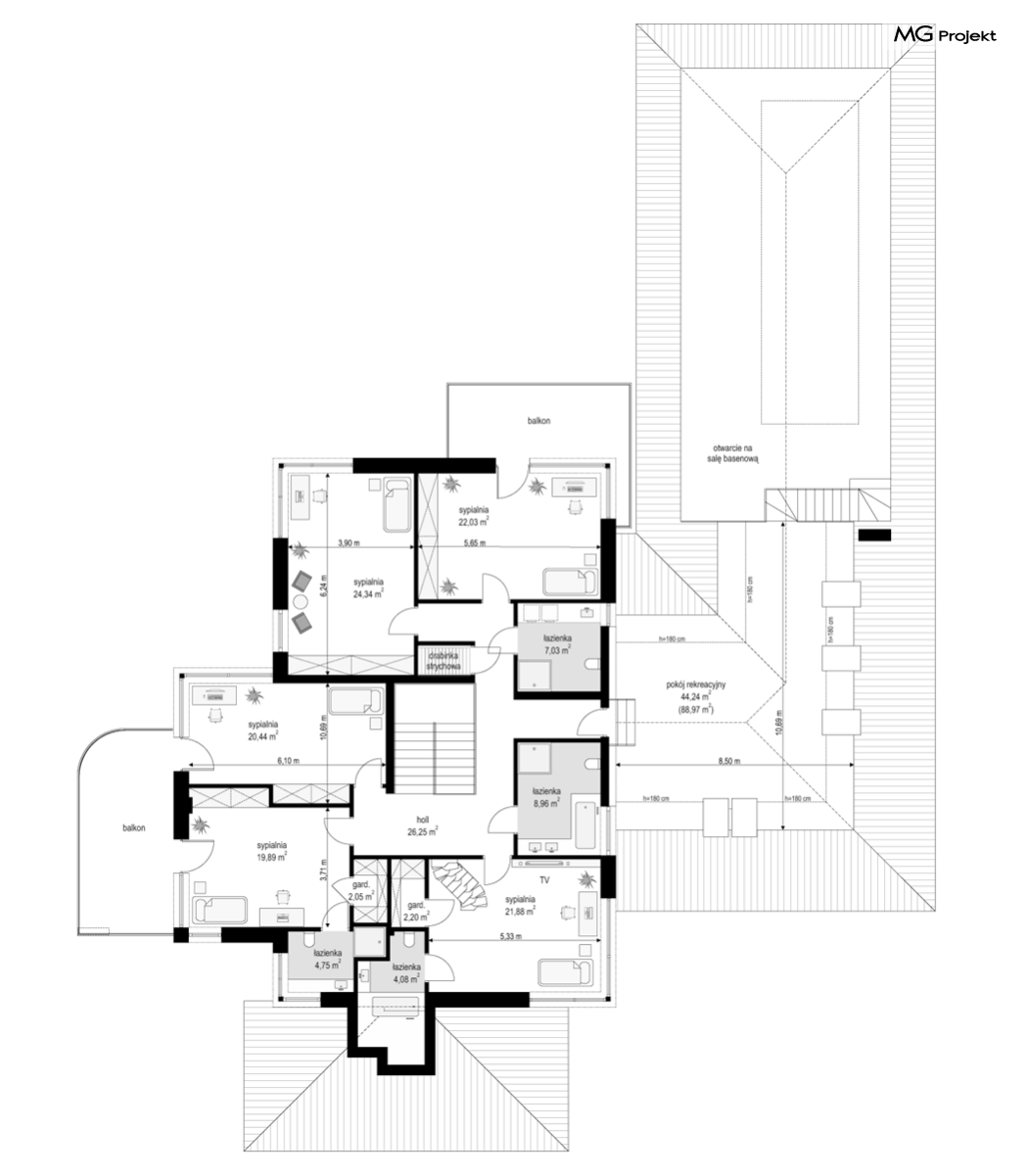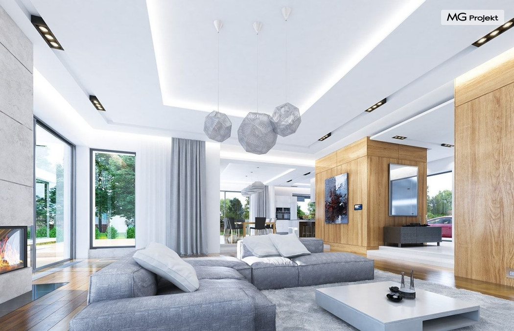 Projekt domu Rezydencja z widokiem to projekt okazałej rezydencji, największego z serii „Domów z widokiem”. Jest to luksusowy, superkomfortowy dom jednorodzinny dla cztero-, a nawet sośmioosobowej rodziny. To piękna, rozłożysta willa z mnóstwem przestrzeni i z częścią rekreacyjno - basenową. Budynek powtarza rozwiązania i detale popularnego i modnego wśród Klientów „Domu z widokiem”, ale jest to wydanie superluksusowe tego projektu. Architektura : rdzeniem domu jest piętrowa dwukondygnacyjna bryła części mieszkalnej. Wokół niej dołączono parterowe części z poddaszami. Od frontu jest to część nad kuchnią i jadalnią, oraz skrzydło garaży i pomieszczeń gospodarczych. Od strony ogrodu natomiast jest to dodatkowe skrzydło zawierające salę basenową, oraz podcienie i tarasy przy salonie. Motywem przewodnim w architekturze rezydencji są duże narożne okna, podział elewacji na poziome pasy wykończone kontrastującymi materiałami, oraz układ łagodnych wielospadowych dachów, przykrywających piętrową i parterowe bryły, tworząc ciekawą kompozycję. Projekt domu Rezydencja z widokiem ma bardzo dużą powierzchnię, jednak dzięki właściwym proporcjom i zróżnicowaniu brył nie przytłacza. Z pewnością robi wrażenie luksusowej rezydencji, ale nie straszy swoją skalą. Do domu wchodzimy przez przeszklony narożnik z szerokimi reprezentacyjnymi drzwiami wejściowymi wprost do przedsionka. Stamtąd przeszklonymi drzwiami do pięknego holu otwierającego się na salon. Jednoprzestrzenne wnętrze holu, salonu, szerokich schodów, jadalni i kuchni tworzą wspólną przestrzeń dzienną domowników. Są jednocześnie doskonałą oprawą dla spotkań w większym i mniejszym gronie gości. Przestronna kuchnia z wyspą i pięknym narożnym oknem będzie z kolei dobrym miejscem do szybkich interakcji między domownikami w biegu dnia. Na parterze obok części dziennej przewidziano miejsce na apartament rodziców, składający się z sypialni, łazienki, dwóch garderób i gabinetu do pracy. Tą część domu można oczywiście dowolnie zaaranżować - według potrzeb inwestorów. Przy wejściu do domu mamy naprawdę duży garaż, oraz dodatkową przestrzeń gospodarczą z pomieszczeniem technicznym na instalacje. Za tą częścią domu znajduje się sala basenowa, z dużą 10-ciometrową niecką, sauną, natryskiem, oraz salką rekreacyjno-sportową na poddaszu-antresoli nad basenem. Wszystkie pokoje mają piękne okna na okalające dom tarasy. Na piętrze zaprojektowano aż pięć pokoi, dwie łazienki i pralnię. Z piętra można też przejść bez problemu do pokoju sportowego. Podziały piętra na pomieszczenia i nadanie pokojom innych funkcji są oczywiście możliwe. Przy monolitycznych żelbetowych stropach domu można właściwie dowolnie przestawiać ścianki działowe - wedle życzenia i wyobraźni właścicieli. Projekt domu Rezydencja z widokiem to z pewnością propozycja dla osób planujących budowę dużego domu. Taka willa to dla wielu osób spełnienie marzeń. Dom nie będzie najtańszy, ale jeśli można sobie na to pozwolić, to czy nie warto czasem podarować sobie „odrobinę” luksusu, po to żeby piękniej żyć i mieszkać ? Zapraszamy !