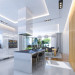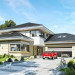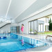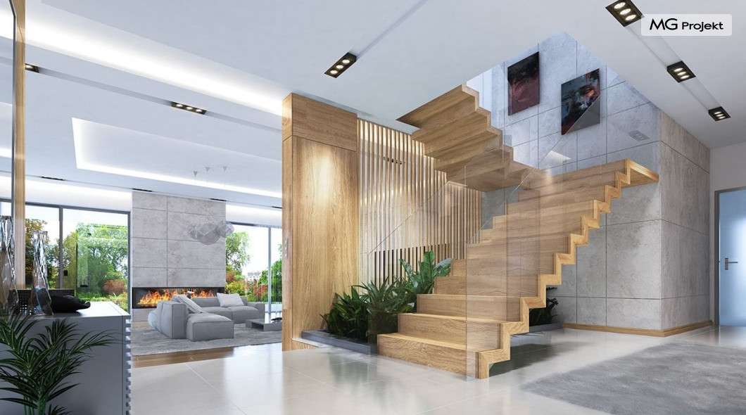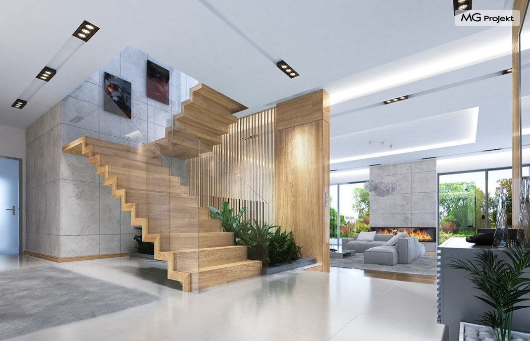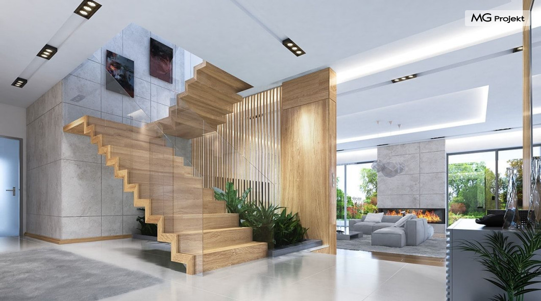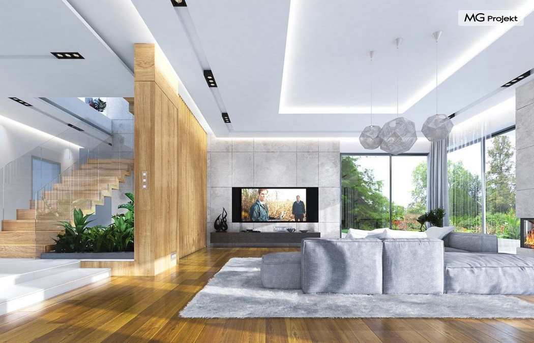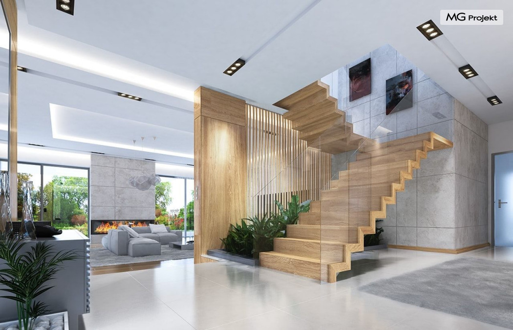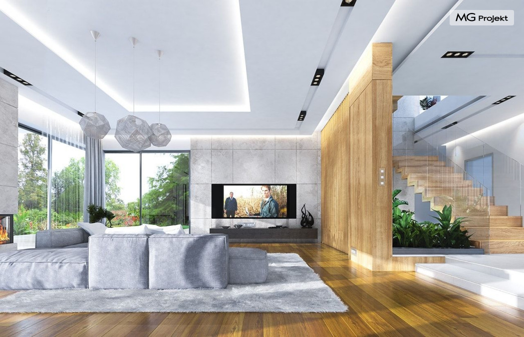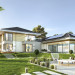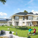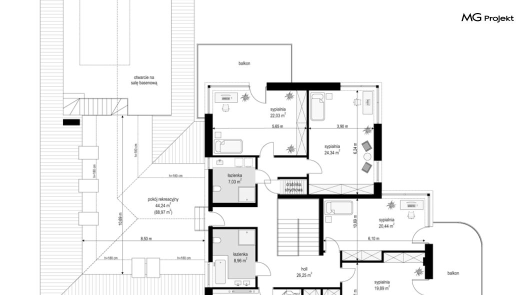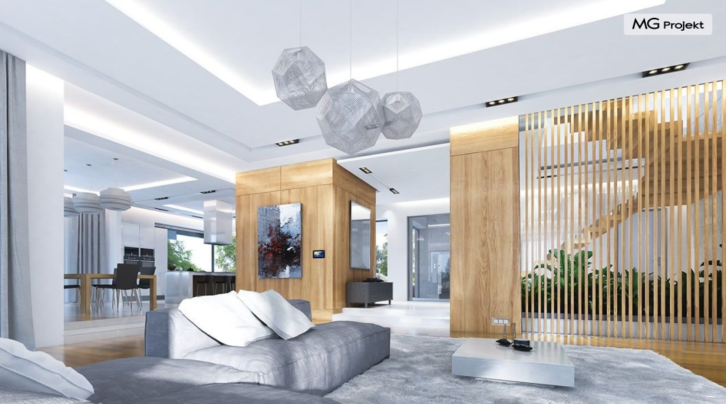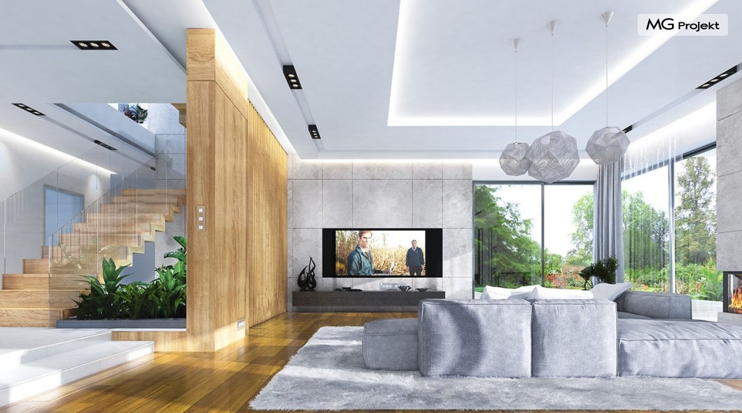 Projekt domu Rezydencja z widokiem to projekt okazałej rezydencji, największego z serii „Domów z widokiem”. Jest to luksusowy, superkomfortowy dom jednorodzinny dla cztero-, a nawet sośmioosobowej rodziny. To piękna, rozłożysta willa z mnóstwem przestrzeni i z częścią rekreacyjno - basenową. Budynek powtarza rozwiązania i detale popularnego i modnego wśród Klientów „Domu z widokiem”, ale jest to wydanie superluksusowe tego projektu. Architektura : rdzeniem domu jest piętrowa dwukondygnacyjna bryła części mieszkalnej. Wokół niej dołączono parterowe części z poddaszami. Od frontu jest to część nad kuchnią i jadalnią, oraz skrzydło garaży i pomieszczeń gospodarczych. Od strony ogrodu natomiast jest to dodatkowe skrzydło zawierające salę basenową, oraz podcienie i tarasy przy salonie. Motywem przewodnim w architekturze rezydencji są duże narożne okna, podział elewacji na poziome pasy wykończone kontrastującymi materiałami, oraz układ łagodnych wielospadowych dachów, przykrywających piętrową i parterowe bryły, tworząc ciekawą kompozycję. Projekt domu Rezydencja z widokiem ma bardzo dużą powierzchnię, jednak dzięki właściwym proporcjom i zróżnicowaniu brył nie przytłacza. Z pewnością robi wrażenie luksusowej rezydencji, ale nie straszy swoją skalą. Do domu wchodzimy przez przeszklony narożnik z szerokimi reprezentacyjnymi drzwiami wejściowymi wprost do przedsionka. Stamtąd przeszklonymi drzwiami do pięknego holu otwierającego się na salon. Jednoprzestrzenne wnętrze holu, salonu, szerokich schodów, jadalni i kuchni tworzą wspólną przestrzeń dzienną domowników. Są jednocześnie doskonałą oprawą dla spotkań w większym i mniejszym gronie gości. Przestronna kuchnia z wyspą i pięknym narożnym oknem będzie z kolei dobrym miejscem do szybkich interakcji między domownikami w biegu dnia. Na parterze obok części dziennej przewidziano miejsce na apartament rodziców, składający się z sypialni, łazienki, dwóch garderób i gabinetu do pracy. Tą część domu można oczywiście dowolnie zaaranżować - według potrzeb inwestorów. Przy wejściu do domu mamy naprawdę duży garaż, oraz dodatkową przestrzeń gospodarczą z pomieszczeniem technicznym na instalacje. Za tą częścią domu znajduje się sala basenowa, z dużą 10-ciometrową niecką, sauną, natryskiem, oraz salką rekreacyjno-sportową na poddaszu-antresoli nad basenem. Wszystkie pokoje mają piękne okna na okalające dom tarasy. Na piętrze zaprojektowano aż pięć pokoi, dwie łazienki i pralnię. Z piętra można też przejść bez problemu do pokoju sportowego. Podziały piętra na pomieszczenia i nadanie pokojom innych funkcji są oczywiście możliwe. Przy monolitycznych żelbetowych stropach domu można właściwie dowolnie przestawiać ścianki działowe - wedle życzenia i wyobraźni właścicieli. Projekt domu Rezydencja z widokiem to z pewnością propozycja dla osób planujących budowę dużego domu. Taka willa to dla wielu osób spełnienie marzeń. Dom nie będzie najtańszy, ale jeśli można sobie na to pozwolić, to czy nie warto czasem podarować sobie „odrobinę” luksusu, po to żeby piękniej żyć i mieszkać ? Zapraszamy !