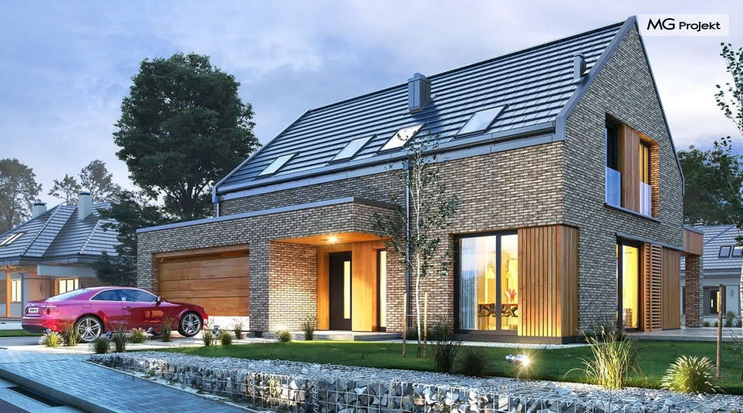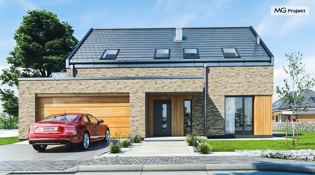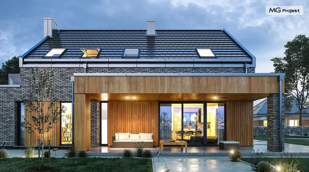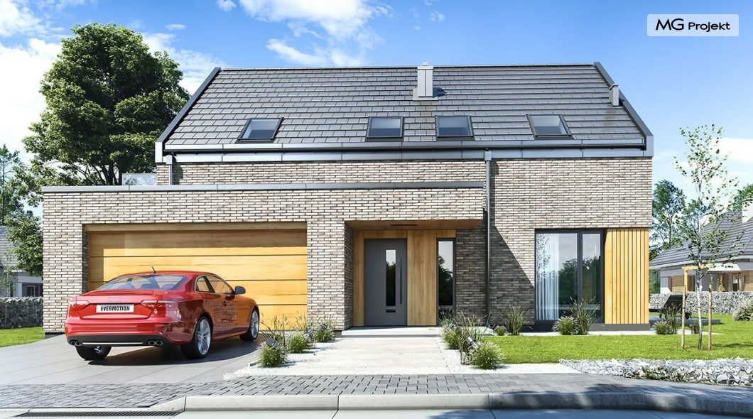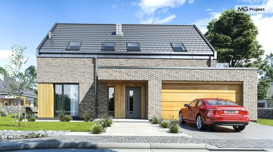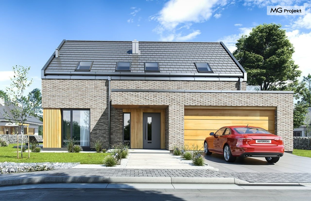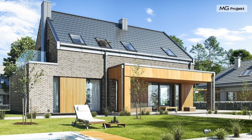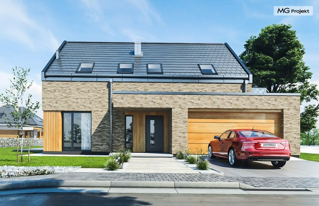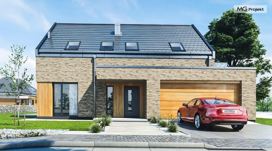 Projekt domu Rumba jest nową wersją projektu należącego do grupy z serii domów wywodzących się z projektu „Party”, które razem tworzą kolekcję „roztańczonych” domów. Projekt domu Rumba zaprojektowany został na podobnym do wymienionych domów planie funkcjonalnym, ale jego stylistyka jest zupełnie inna, oryginalna. Cała bryła budynku wykończona jest jednym materiałem - wszystkie ściany obłożone są płytkami klinkierowymi. Otwory okienne poszerzone dodatkowymi okładzinami z drewna tworzą wycięcia w tej jednolitej ceglanej bryle. Dwuspadowy dach z płaskiej dachówki pozbawiony okapów stanowi zamknięcie kompozycji. Projekt domu Rumba jest nowoczesny, oryginalny i z pewnością będzie się wyróżniał na tle dziesiątków podobnych do siebie domów – dachowców. Jednocześnie zastosowane materiały wykończeniowe przywołują na myśl : elegancję, porządne wykonanie, trwałość i długowieczność budynku. Taki efekt udało się uzyskać mimo wcale nie wysokich kosztów budowy domu. Projekt domu Rumba ma bardzo prostą bryłę i konstrukcję - będzie łatwa i stosunkowo tania w budowie. Wnętrze domu : na parterze zaprojektowano otwartą przestrzeń dzienną połączonych pomieszczeń salonu, holu i kuchni. Kuchnia z wyspą, ścianą w pełnej zabudowie AGD, z frontowym oknem sięgającym podłogi będzie ozdobą przestrzeni dziennej. Salon z szeroką ścianą kominkowo-telewizyjną otwiera się dużymi przeszkleniami na otaczający ogród i częściowo zadaszony taras. Pozostałe pomieszczenia parteru to pokój (gabinet lub dodatkowa sypialnia), łazienka z natryskiem i schowkiem porządkowym pod podestem schodów, spiżarnia między kuchnią a przedsionkiem, oraz podwójny garaż i kotłownia. Na poddaszu z kolei mamy trzy sypialnie, w tym : apartament rodziców z łazienką, garderobą i własnym tarasem, oraz dwie sypialnie dzieci z wbudowanymi szafami, osobną łazienką i pralnią. Na w sumie niewielkiej powierzchni domu udało się zaprojektować bardzo komfortowe wnętrze do życia dla 4-6cioosobowej rodziny. Projekt domu Rumba to doskonała propozycja dla odważnych Inwestorów, pragnących się w mądry sposób wyróżniać. Konsekwentnie zrealizowany projekt będzie atrakcją wśród okolicznej zabudowy i z pewnością nikt nie przejdzie obojętnie koło takiej perełki. Zapraszamy do zapoznania się z całą serią "roztańczonych domów": https://www.mgprojekt.com.pl/makarena, https://www.mgprojekt.com.pl/bolero, https://www.mgprojekt.com.pl/lambada, https://www.mgprojekt.com.pl/party, https://www.mgprojekt.com.pl/party-2, https://www.mgprojekt.com.pl/biba, https://www.mgprojekt.com.pl/tango, https://www.mgprojekt.com.pl/salsa, https://www.mgprojekt.com.pl/rumba, https://www.mgprojekt.com.pl/mambo, https://www.mgprojekt.com.pl/mambo, https://www.mgprojekt.com.pl/fokstrot, https://www.mgprojekt.com.pl/samba.