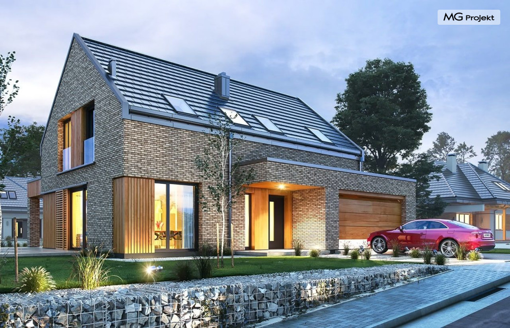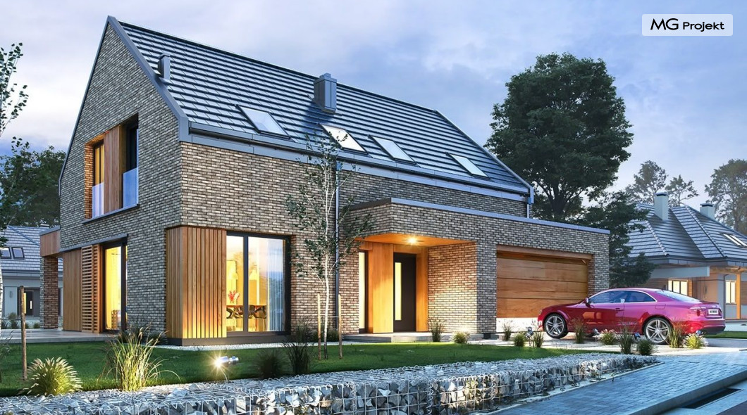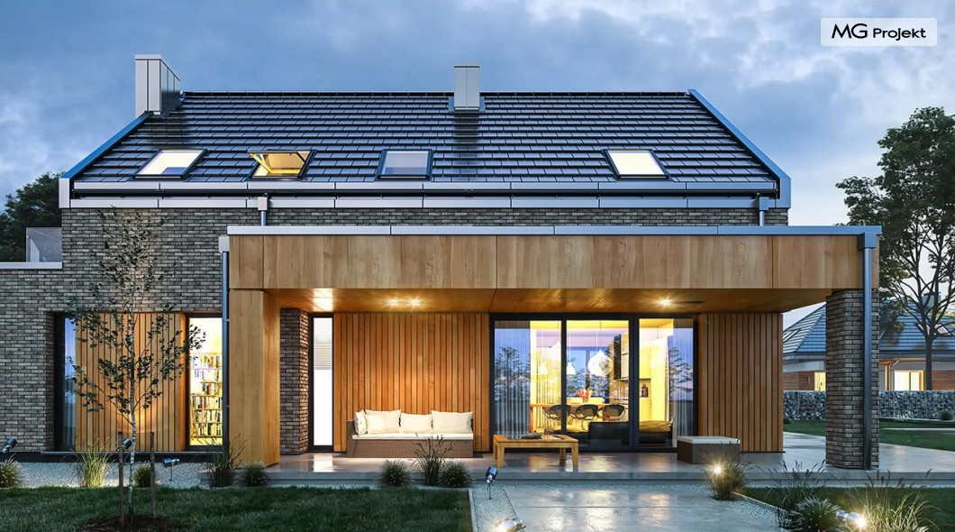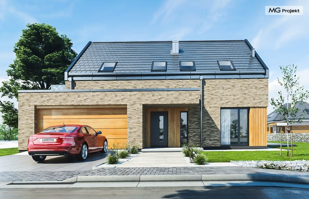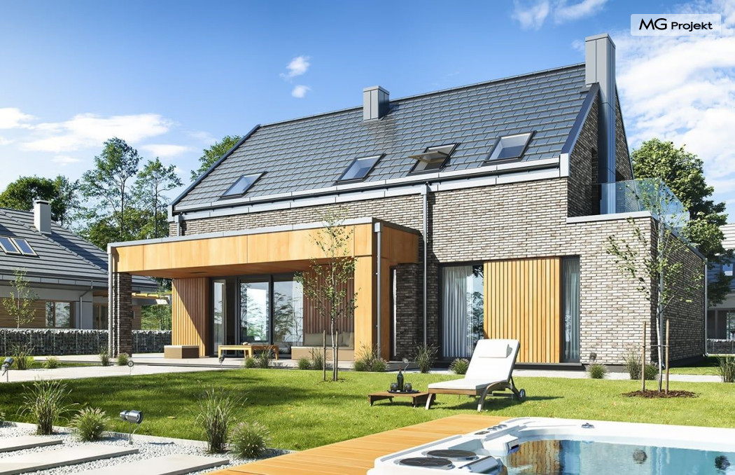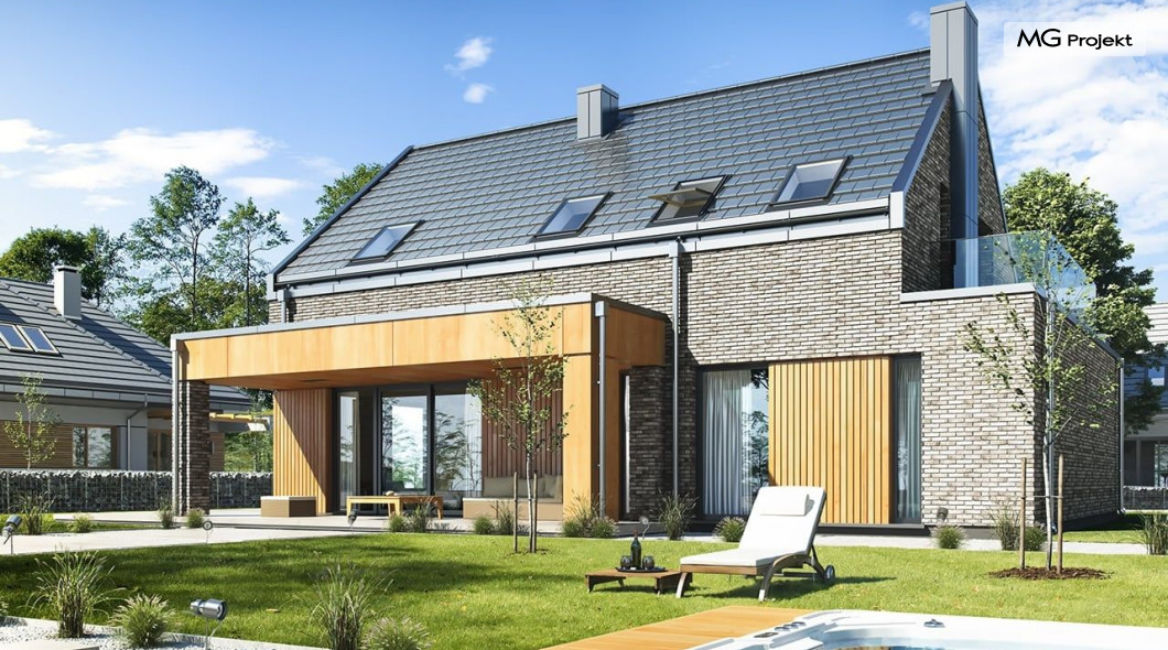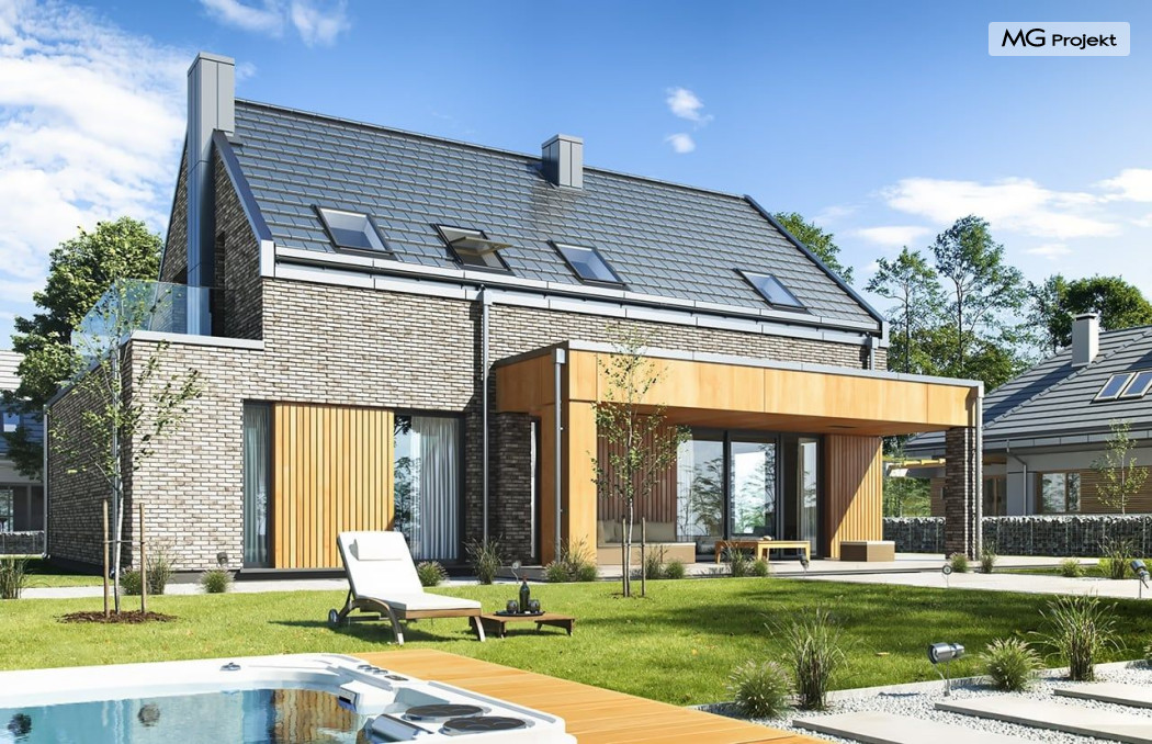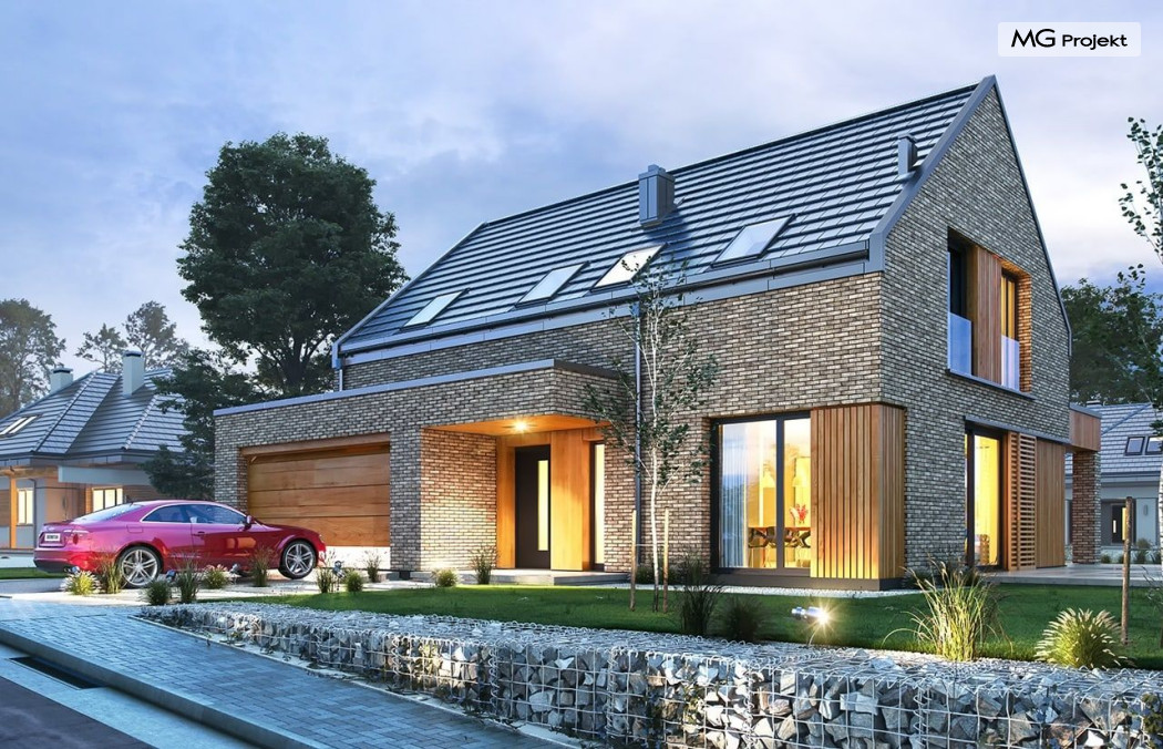Projekt domu Rumba jest nową wersją projektu należącego do grupy z serii domów wywodzących się z projektu „Party”, które razem tworzą kolekcję „roztańczonych” domów. Projekt domu Rumba zaprojektowany został na podobnym do wymienionych domów planie funkcjonalnym, ale jego stylistyka jest zupełnie inna, oryginalna. Cała bryła budynku wykończona jest jednym materiałem - wszystkie ściany obłożone są płytkami klinkierowymi. Otwory okienne poszerzone dodatkowymi okładzinami z drewna tworzą wycięcia w tej jednolitej ceglanej bryle. Dwuspadowy dach z płaskiej dachówki pozbawiony okapów stanowi zamknięcie kompozycji. Projekt domu Rumba jest nowoczesny, oryginalny i z pewnością będzie się wyróżniał na tle dziesiątków podobnych do siebie domów – dachowców. Jednocześnie zastosowane materiały wykończeniowe przywołują na myśl : elegancję, porządne wykonanie, trwałość i długowieczność budynku. Taki efekt udało się uzyskać mimo wcale nie wysokich kosztów budowy domu. Projekt domu Rumba ma bardzo prostą bryłę i konstrukcję - będzie łatwa i stosunkowo tania w budowie. Wnętrze domu : na parterze zaprojektowano otwartą przestrzeń dzienną połączonych pomieszczeń salonu, holu i kuchni. Kuchnia z wyspą, ścianą w pełnej zabudowie AGD, z frontowym oknem sięgającym podłogi będzie ozdobą przestrzeni dziennej. Salon z szeroką ścianą kominkowo-telewizyjną otwiera się dużymi przeszkleniami na otaczający ogród i częściowo zadaszony taras. Pozostałe pomieszczenia parteru to pokój (gabinet lub dodatkowa sypialnia), łazienka z natryskiem i schowkiem porządkowym pod podestem schodów, spiżarnia między kuchnią a przedsionkiem, oraz podwójny garaż i kotłownia. Na poddaszu z kolei mamy trzy sypialnie, w tym : apartament rodziców z łazienką, garderobą i własnym tarasem, oraz dwie sypialnie dzieci z wbudowanymi szafami, osobną łazienką i pralnią. Na w sumie niewielkiej powierzchni domu udało się zaprojektować bardzo komfortowe wnętrze do życia dla 4-6cioosobowej rodziny. Projekt domu Rumba to doskonała propozycja dla odważnych Inwestorów, pragnących się w mądry sposób wyróżniać. Konsekwentnie zrealizowany projekt będzie atrakcją wśród okolicznej zabudowy i z pewnością nikt nie przejdzie obojętnie koło takiej perełki. Zapraszamy do zapoznania się z całą serią "roztańczonych domów": https://www.mgprojekt.com.pl/makarena, https://www.mgprojekt.com.pl/bolero, https://www.mgprojekt.com.pl/lambada, https://www.mgprojekt.com.pl/party, https://www.mgprojekt.com.pl/party-2, https://www.mgprojekt.com.pl/biba, https://www.mgprojekt.com.pl/tango, https://www.mgprojekt.com.pl/salsa, https://www.mgprojekt.com.pl/rumba, https://www.mgprojekt.com.pl/mambo, https://www.mgprojekt.com.pl/mambo, https://www.mgprojekt.com.pl/fokstrot, https://www.mgprojekt.com.pl/samba.