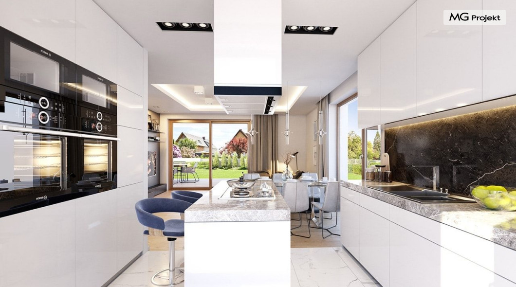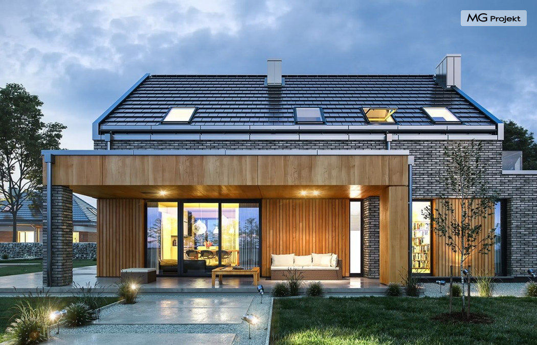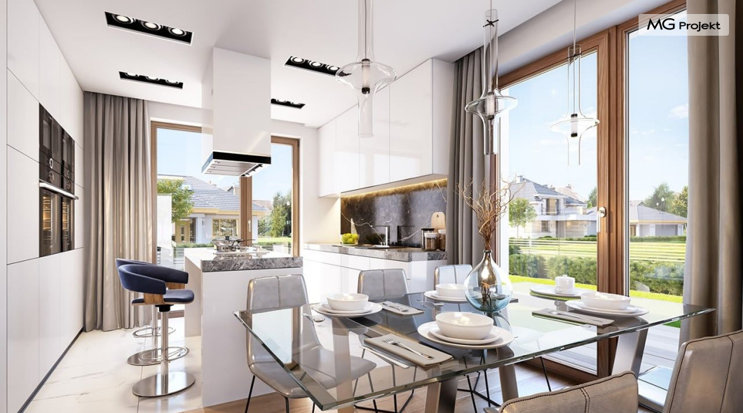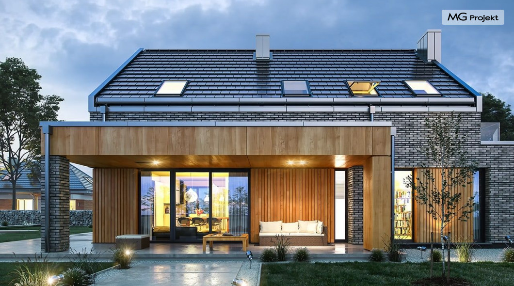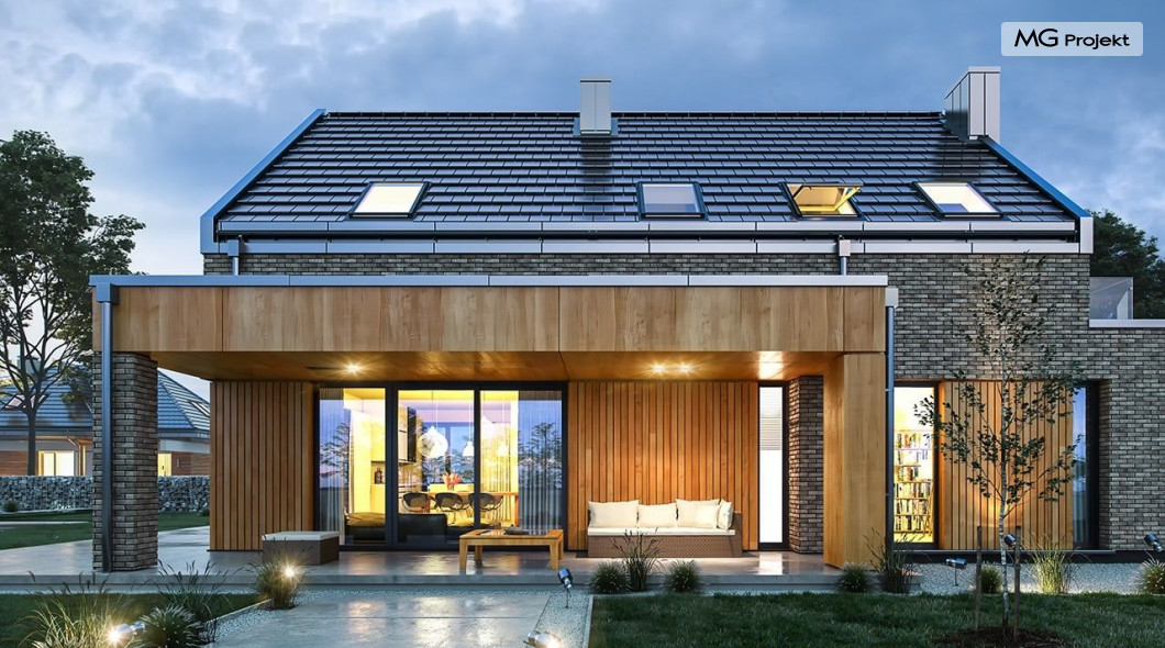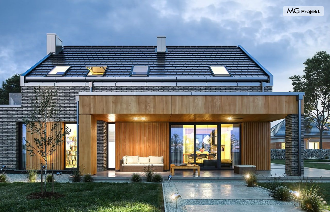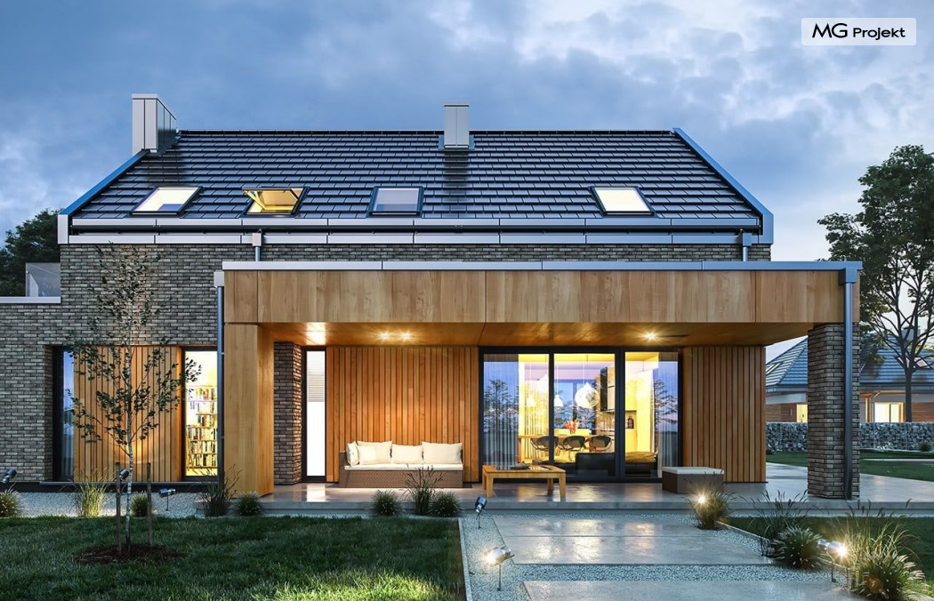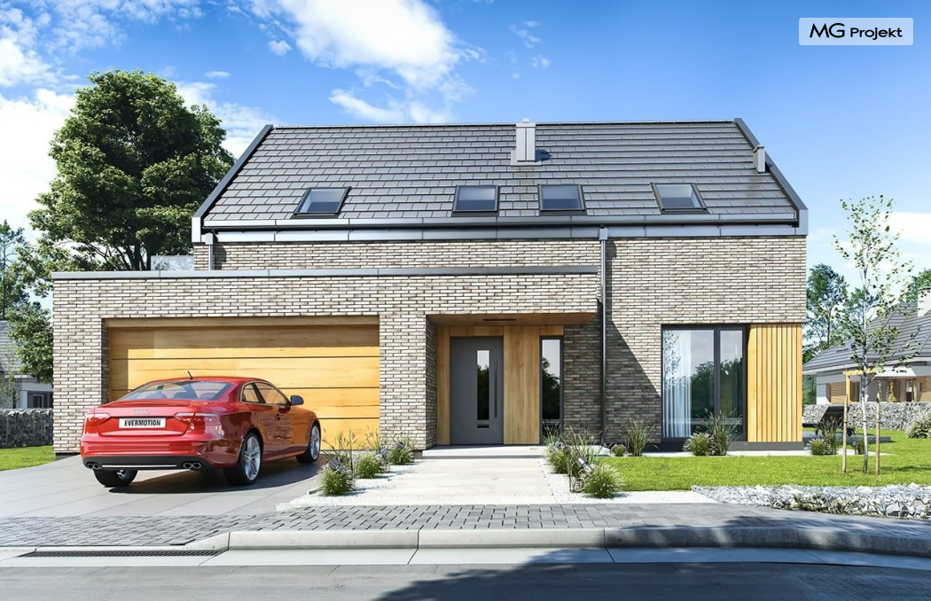 Projekt domu Rumba jest nową wersją projektu należącego do grupy z serii domów wywodzących się z projektu „Party”, które razem tworzą kolekcję „roztańczonych” domów. Projekt domu Rumba zaprojektowany został na podobnym do wymienionych domów planie funkcjonalnym, ale jego stylistyka jest zupełnie inna, oryginalna. Cała bryła budynku wykończona jest jednym materiałem - wszystkie ściany obłożone są płytkami klinkierowymi. Otwory okienne poszerzone dodatkowymi okładzinami z drewna tworzą wycięcia w tej jednolitej ceglanej bryle. Dwuspadowy dach z płaskiej dachówki pozbawiony okapów stanowi zamknięcie kompozycji. Projekt domu Rumba jest nowoczesny, oryginalny i z pewnością będzie się wyróżniał na tle dziesiątków podobnych do siebie domów – dachowców. Jednocześnie zastosowane materiały wykończeniowe przywołują na myśl : elegancję, porządne wykonanie, trwałość i długowieczność budynku. Taki efekt udało się uzyskać mimo wcale nie wysokich kosztów budowy domu. Projekt domu Rumba ma bardzo prostą bryłę i konstrukcję - będzie łatwa i stosunkowo tania w budowie. Wnętrze domu : na parterze zaprojektowano otwartą przestrzeń dzienną połączonych pomieszczeń salonu, holu i kuchni. Kuchnia z wyspą, ścianą w pełnej zabudowie AGD, z frontowym oknem sięgającym podłogi będzie ozdobą przestrzeni dziennej. Salon z szeroką ścianą kominkowo-telewizyjną otwiera się dużymi przeszkleniami na otaczający ogród i częściowo zadaszony taras. Pozostałe pomieszczenia parteru to pokój (gabinet lub dodatkowa sypialnia), łazienka z natryskiem i schowkiem porządkowym pod podestem schodów, spiżarnia między kuchnią a przedsionkiem, oraz podwójny garaż i kotłownia. Na poddaszu z kolei mamy trzy sypialnie, w tym : apartament rodziców z łazienką, garderobą i własnym tarasem, oraz dwie sypialnie dzieci z wbudowanymi szafami, osobną łazienką i pralnią. Na w sumie niewielkiej powierzchni domu udało się zaprojektować bardzo komfortowe wnętrze do życia dla 4-6cioosobowej rodziny. Projekt domu Rumba to doskonała propozycja dla odważnych Inwestorów, pragnących się w mądry sposób wyróżniać. Konsekwentnie zrealizowany projekt będzie atrakcją wśród okolicznej zabudowy i z pewnością nikt nie przejdzie obojętnie koło takiej perełki. Zapraszamy do zapoznania się z całą serią "roztańczonych domów": https://www.mgprojekt.com.pl/makarena, https://www.mgprojekt.com.pl/bolero, https://www.mgprojekt.com.pl/lambada, https://www.mgprojekt.com.pl/party, https://www.mgprojekt.com.pl/party-2, https://www.mgprojekt.com.pl/biba, https://www.mgprojekt.com.pl/tango, https://www.mgprojekt.com.pl/salsa, https://www.mgprojekt.com.pl/rumba, https://www.mgprojekt.com.pl/mambo, https://www.mgprojekt.com.pl/mambo, https://www.mgprojekt.com.pl/fokstrot, https://www.mgprojekt.com.pl/samba.
