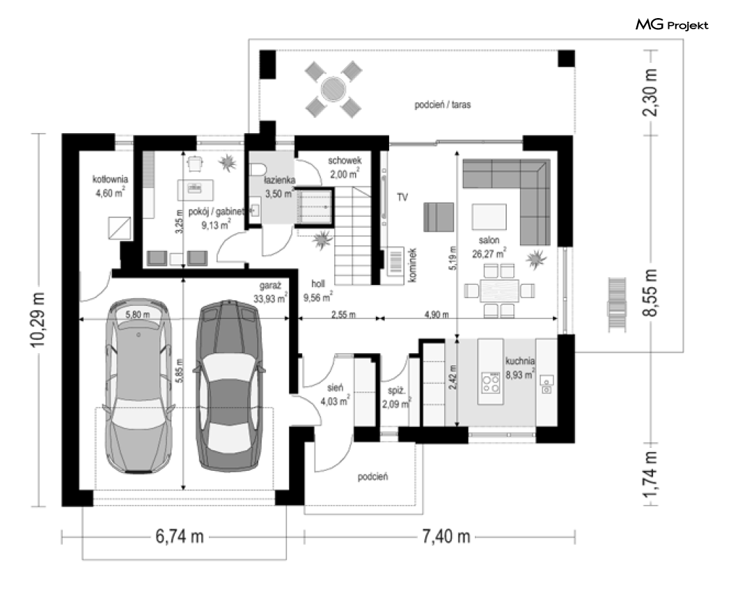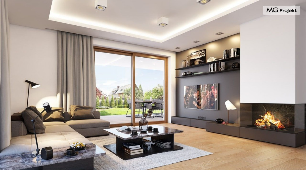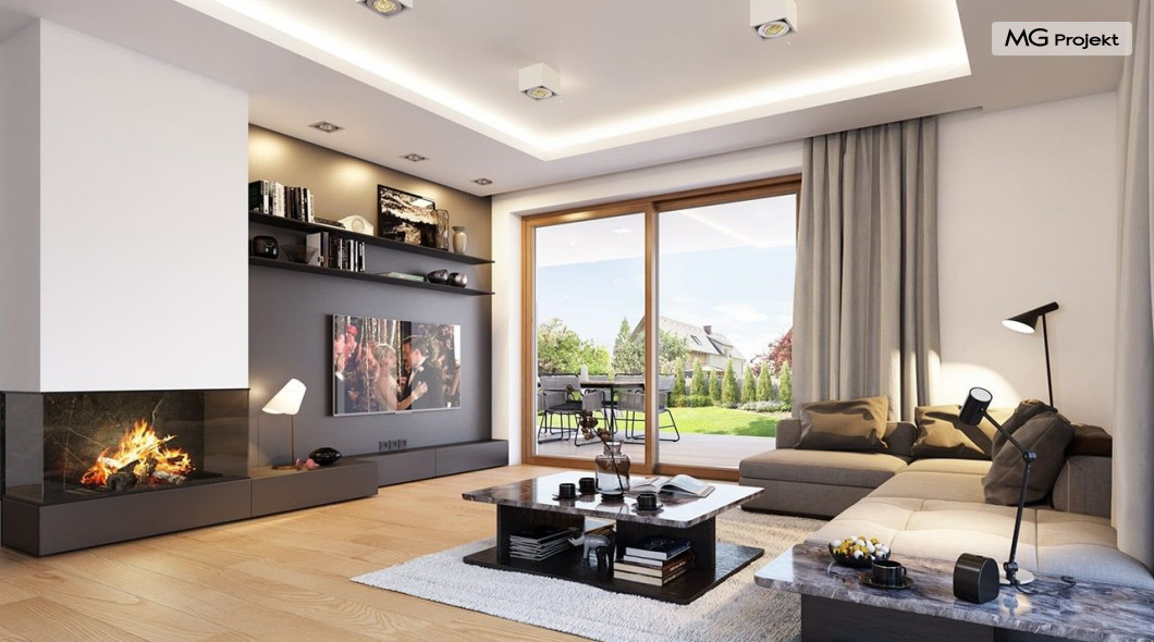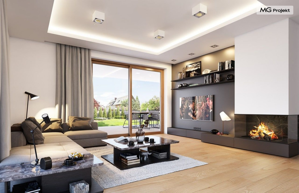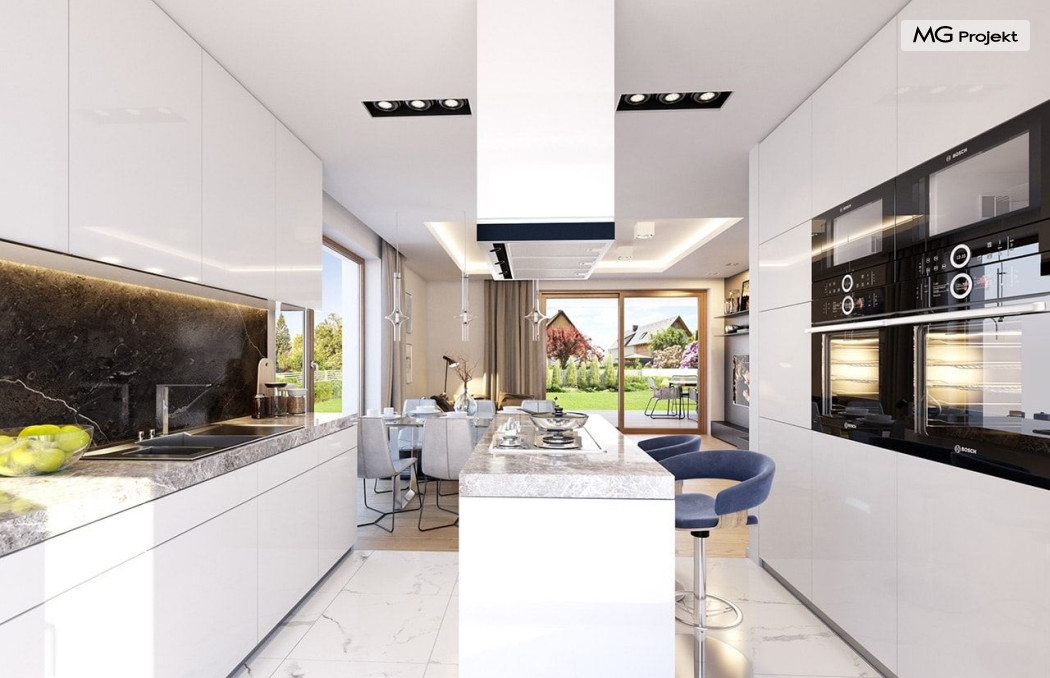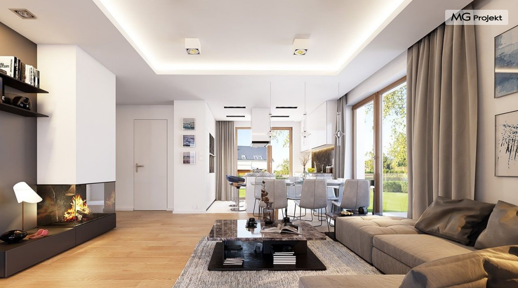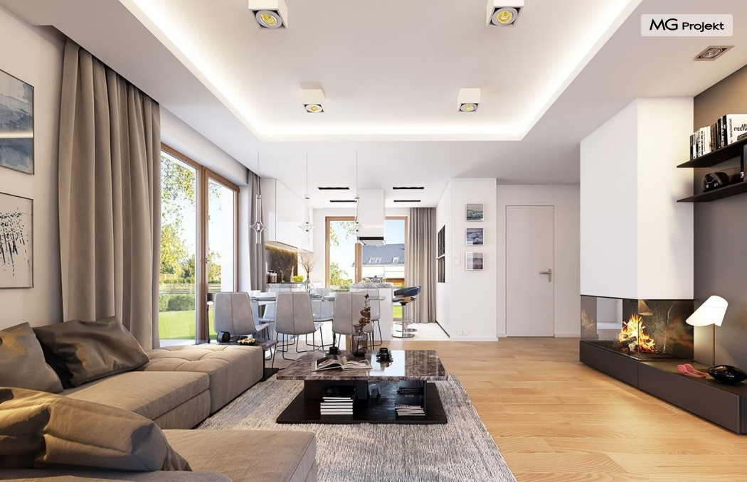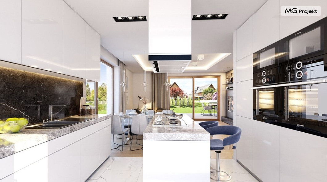 Projekt domu Rumba jest nową wersją projektu należącego do grupy z serii domów wywodzących się z projektu „Party”, które razem tworzą kolekcję „roztańczonych” domów. Projekt domu Rumba zaprojektowany został na podobnym do wymienionych domów planie funkcjonalnym, ale jego stylistyka jest zupełnie inna, oryginalna. Cała bryła budynku wykończona jest jednym materiałem - wszystkie ściany obłożone są płytkami klinkierowymi. Otwory okienne poszerzone dodatkowymi okładzinami z drewna tworzą wycięcia w tej jednolitej ceglanej bryle. Dwuspadowy dach z płaskiej dachówki pozbawiony okapów stanowi zamknięcie kompozycji. Projekt domu Rumba jest nowoczesny, oryginalny i z pewnością będzie się wyróżniał na tle dziesiątków podobnych do siebie domów – dachowców. Jednocześnie zastosowane materiały wykończeniowe przywołują na myśl : elegancję, porządne wykonanie, trwałość i długowieczność budynku. Taki efekt udało się uzyskać mimo wcale nie wysokich kosztów budowy domu. Projekt domu Rumba ma bardzo prostą bryłę i konstrukcję - będzie łatwa i stosunkowo tania w budowie. Wnętrze domu : na parterze zaprojektowano otwartą przestrzeń dzienną połączonych pomieszczeń salonu, holu i kuchni. Kuchnia z wyspą, ścianą w pełnej zabudowie AGD, z frontowym oknem sięgającym podłogi będzie ozdobą przestrzeni dziennej. Salon z szeroką ścianą kominkowo-telewizyjną otwiera się dużymi przeszkleniami na otaczający ogród i częściowo zadaszony taras. Pozostałe pomieszczenia parteru to pokój (gabinet lub dodatkowa sypialnia), łazienka z natryskiem i schowkiem porządkowym pod podestem schodów, spiżarnia między kuchnią a przedsionkiem, oraz podwójny garaż i kotłownia. Na poddaszu z kolei mamy trzy sypialnie, w tym : apartament rodziców z łazienką, garderobą i własnym tarasem, oraz dwie sypialnie dzieci z wbudowanymi szafami, osobną łazienką i pralnią. Na w sumie niewielkiej powierzchni domu udało się zaprojektować bardzo komfortowe wnętrze do życia dla 4-6cioosobowej rodziny. Projekt domu Rumba to doskonała propozycja dla odważnych Inwestorów, pragnących się w mądry sposób wyróżniać. Konsekwentnie zrealizowany projekt będzie atrakcją wśród okolicznej zabudowy i z pewnością nikt nie przejdzie obojętnie koło takiej perełki. Zapraszamy do zapoznania się z całą serią "roztańczonych domów": https://www.mgprojekt.com.pl/makarena, https://www.mgprojekt.com.pl/bolero, https://www.mgprojekt.com.pl/lambada, https://www.mgprojekt.com.pl/party, https://www.mgprojekt.com.pl/party-2, https://www.mgprojekt.com.pl/biba, https://www.mgprojekt.com.pl/tango, https://www.mgprojekt.com.pl/salsa, https://www.mgprojekt.com.pl/rumba, https://www.mgprojekt.com.pl/mambo, https://www.mgprojekt.com.pl/mambo, https://www.mgprojekt.com.pl/fokstrot, https://www.mgprojekt.com.pl/samba.