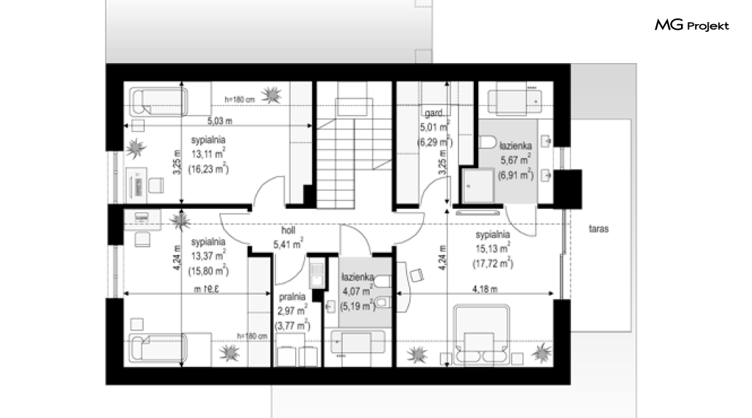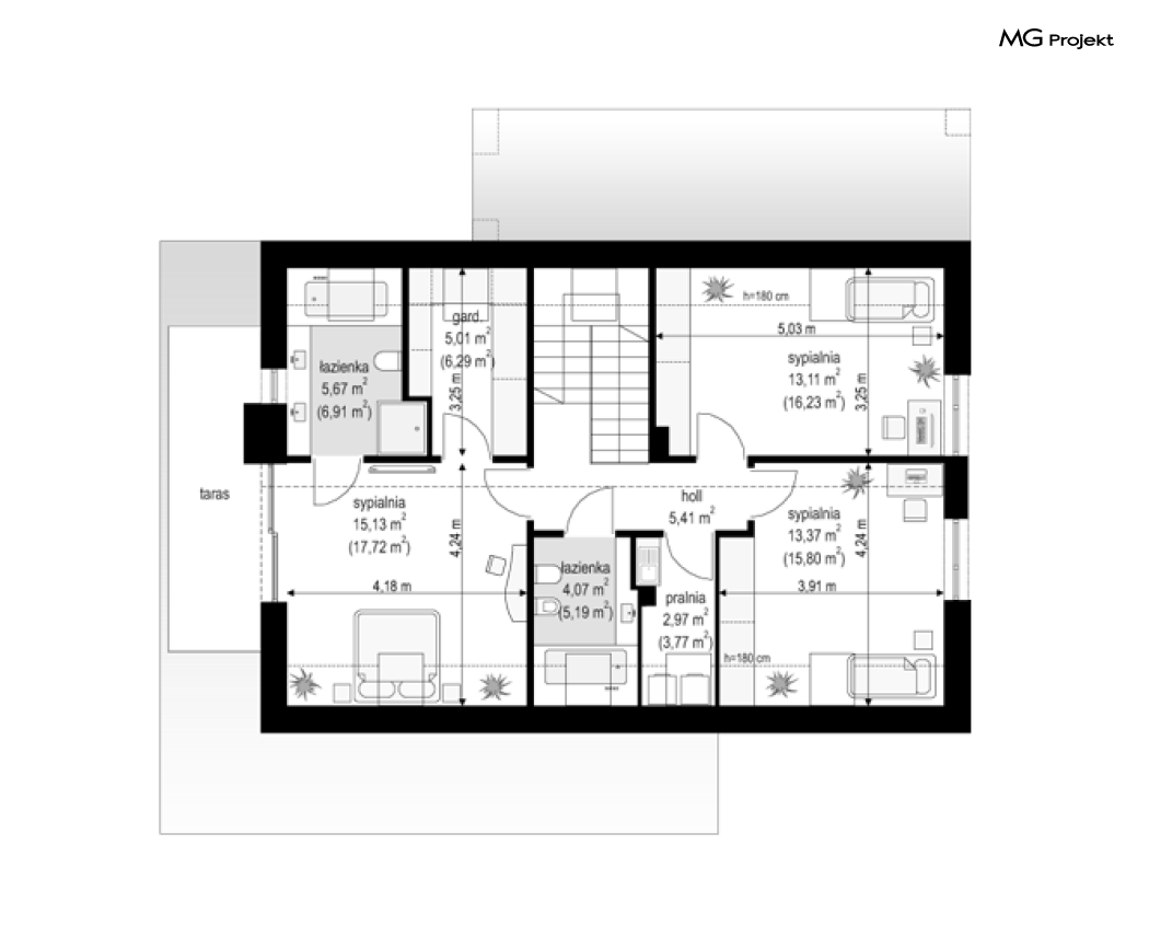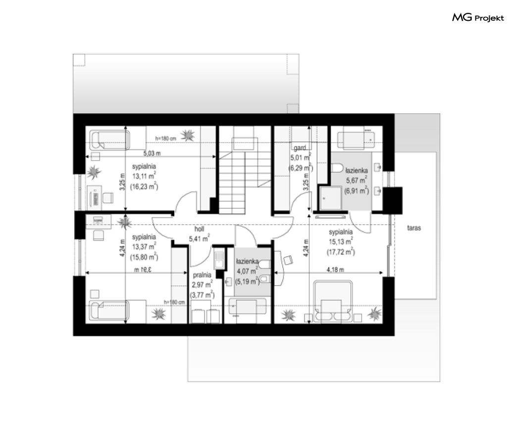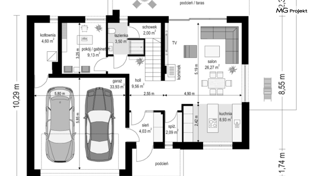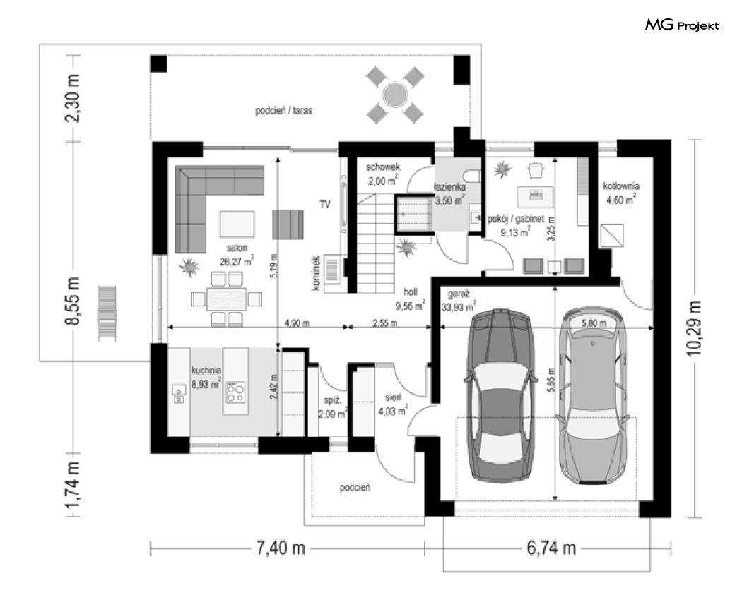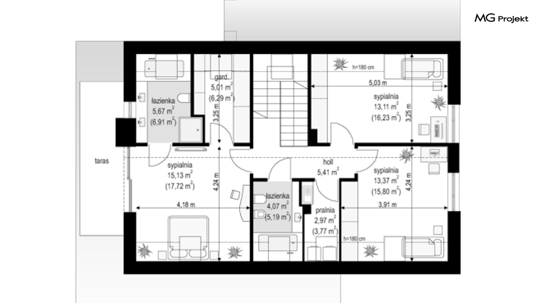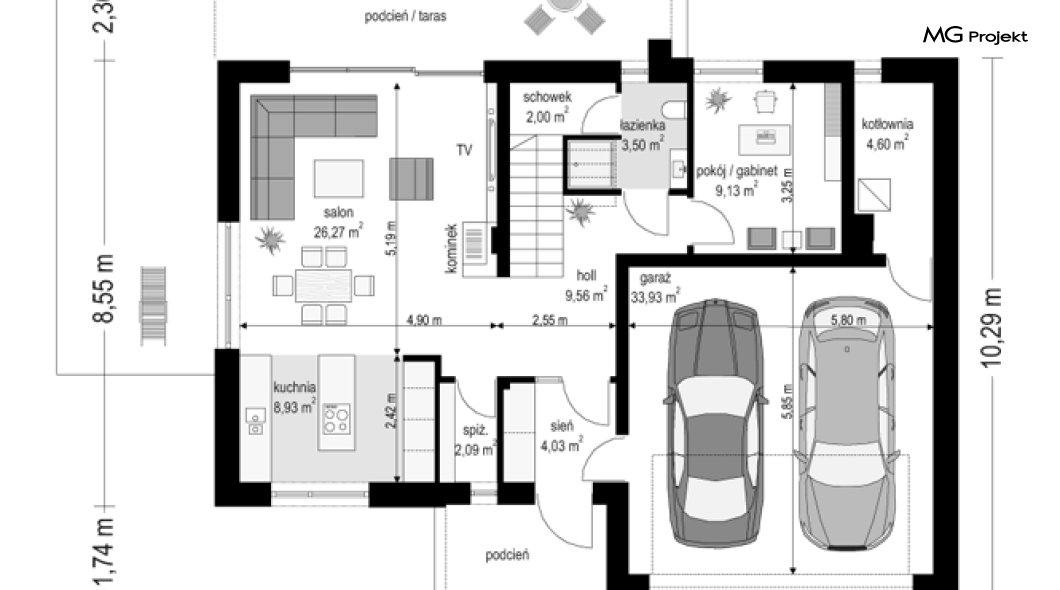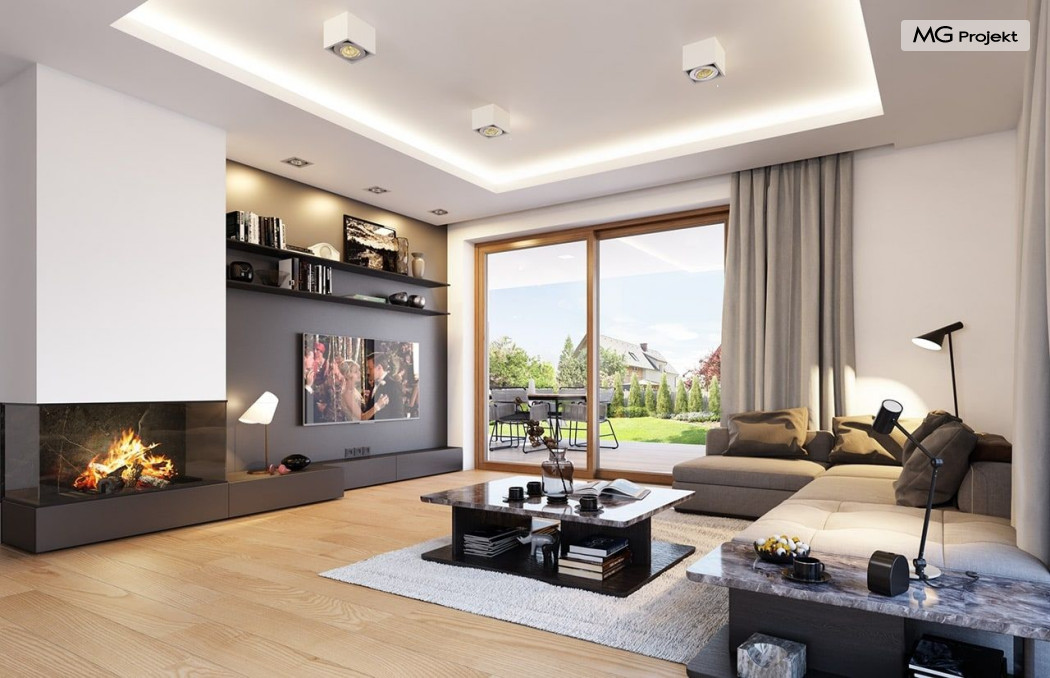 Projekt domu Rumba jest nową wersją projektu należącego do grupy z serii domów wywodzących się z projektu „Party”, które razem tworzą kolekcję „roztańczonych” domów. Projekt domu Rumba zaprojektowany został na podobnym do wymienionych domów planie funkcjonalnym, ale jego stylistyka jest zupełnie inna, oryginalna. Cała bryła budynku wykończona jest jednym materiałem - wszystkie ściany obłożone są płytkami klinkierowymi. Otwory okienne poszerzone dodatkowymi okładzinami z drewna tworzą wycięcia w tej jednolitej ceglanej bryle. Dwuspadowy dach z płaskiej dachówki pozbawiony okapów stanowi zamknięcie kompozycji. Projekt domu Rumba jest nowoczesny, oryginalny i z pewnością będzie się wyróżniał na tle dziesiątków podobnych do siebie domów – dachowców. Jednocześnie zastosowane materiały wykończeniowe przywołują na myśl : elegancję, porządne wykonanie, trwałość i długowieczność budynku. Taki efekt udało się uzyskać mimo wcale nie wysokich kosztów budowy domu. Projekt domu Rumba ma bardzo prostą bryłę i konstrukcję - będzie łatwa i stosunkowo tania w budowie. Wnętrze domu : na parterze zaprojektowano otwartą przestrzeń dzienną połączonych pomieszczeń salonu, holu i kuchni. Kuchnia z wyspą, ścianą w pełnej zabudowie AGD, z frontowym oknem sięgającym podłogi będzie ozdobą przestrzeni dziennej. Salon z szeroką ścianą kominkowo-telewizyjną otwiera się dużymi przeszkleniami na otaczający ogród i częściowo zadaszony taras. Pozostałe pomieszczenia parteru to pokój (gabinet lub dodatkowa sypialnia), łazienka z natryskiem i schowkiem porządkowym pod podestem schodów, spiżarnia między kuchnią a przedsionkiem, oraz podwójny garaż i kotłownia. Na poddaszu z kolei mamy trzy sypialnie, w tym : apartament rodziców z łazienką, garderobą i własnym tarasem, oraz dwie sypialnie dzieci z wbudowanymi szafami, osobną łazienką i pralnią. Na w sumie niewielkiej powierzchni domu udało się zaprojektować bardzo komfortowe wnętrze do życia dla 4-6cioosobowej rodziny. Projekt domu Rumba to doskonała propozycja dla odważnych Inwestorów, pragnących się w mądry sposób wyróżniać. Konsekwentnie zrealizowany projekt będzie atrakcją wśród okolicznej zabudowy i z pewnością nikt nie przejdzie obojętnie koło takiej perełki. Zapraszamy do zapoznania się z całą serią "roztańczonych domów": https://www.mgprojekt.com.pl/makarena, https://www.mgprojekt.com.pl/bolero, https://www.mgprojekt.com.pl/lambada, https://www.mgprojekt.com.pl/party, https://www.mgprojekt.com.pl/party-2, https://www.mgprojekt.com.pl/biba, https://www.mgprojekt.com.pl/tango, https://www.mgprojekt.com.pl/salsa, https://www.mgprojekt.com.pl/rumba, https://www.mgprojekt.com.pl/mambo, https://www.mgprojekt.com.pl/mambo, https://www.mgprojekt.com.pl/fokstrot, https://www.mgprojekt.com.pl/samba.