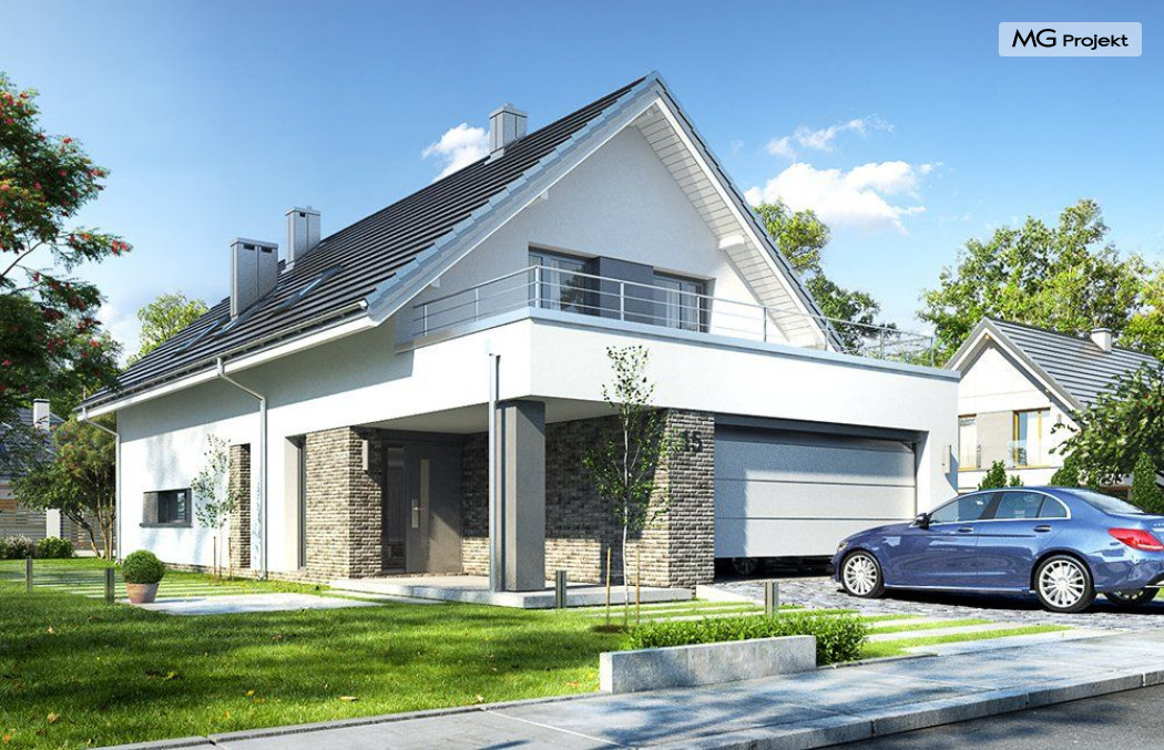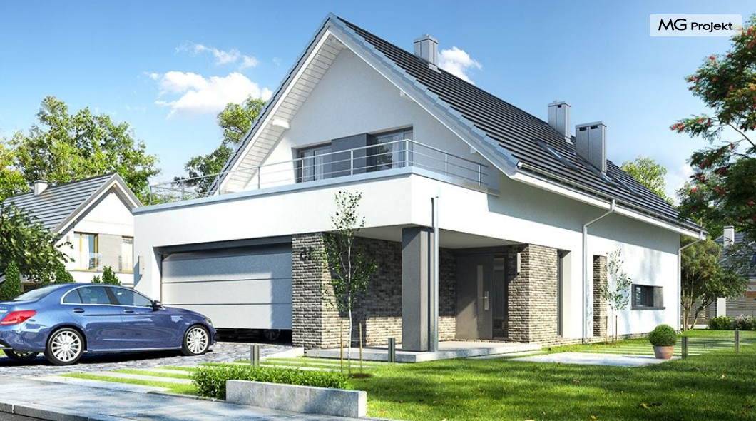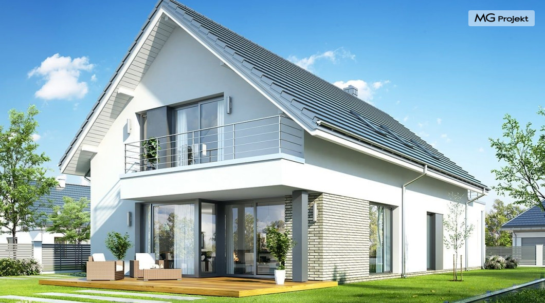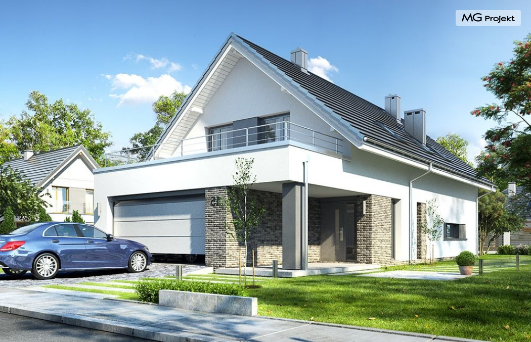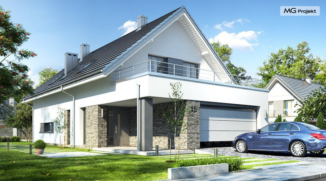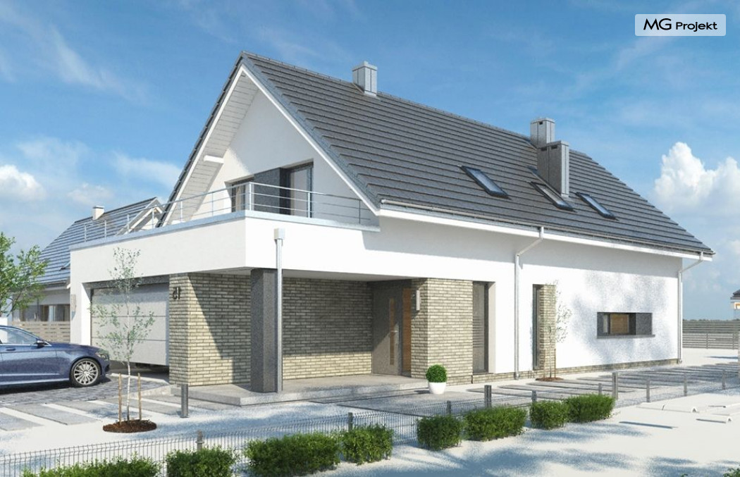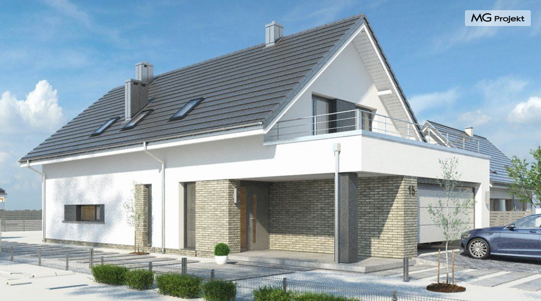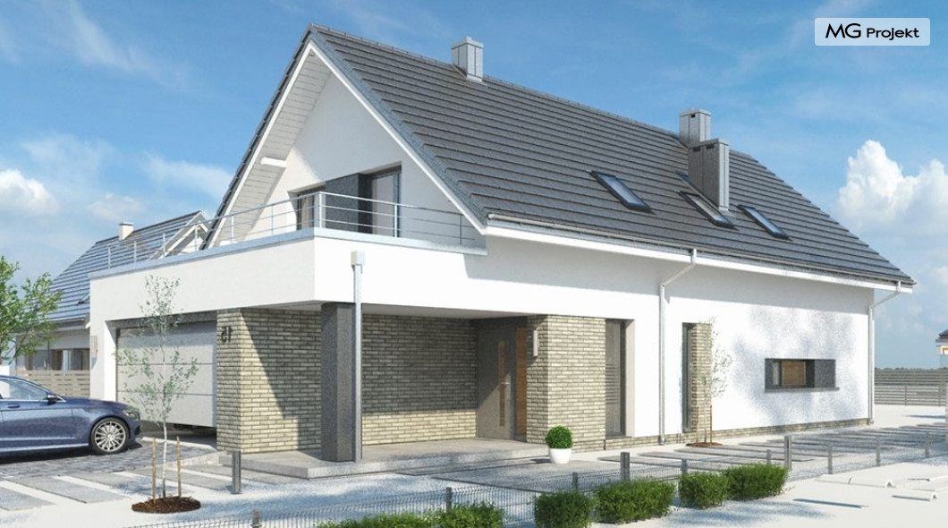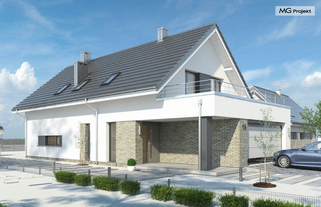 Projekt domu Salsa to jeden z projektów z serii domów wywodzących się z projektu „Party”. Salsa to dom jednorodzinny przeznaczony dla cztero-sześcioosobowej rodziny. Dom parterowy z poddaszem użytkowym, o prostej bryle przykrytej dwuspadowym dachem, z wystającą nieco poza główną bryłę parterową częścią garażu. Projekt przeznaczony jest na wąską działkę, która nie pozwala na budowę budynku o szerokiej elewacji frontowej. Minimalna szerokość działki to 16,9 metrów, ale zamieniając w jednej z bocznych elewacji okna na luksfery możemy posadowić dom na działce o szerokości poniżej 16-tu metrów (nawet na działce o szerokości 14,6 m - jeśli jest zgoda na zbliżenie się ścianą bez okien na 1,5 m od granicy). Prosta spokojna bryła domu połączona z nowoczesną formą i zastosowanymi materiałami daje atrakcyjną sylwetkę „Salsy”. Front domu ozdabia duży podcień wejściowy, z reprezentacyjnymi drzwiami. Od strony ogrodu mamy z kolei częściowo zadaszony taras, piękne przeszklone otwarcie przestrzeni dziennej na ogród, oraz taras –balkon poddasza. Nowoczesna stonowana kolorystyka domu pozwoli „Salsie” właściwie wkomponować się w dowolne sąsiedztwo. Wnętrze domu zaprojektowano sytuując garaż obok wejścia, od frontu. Z sieni przechodzimy szerokimi szklanymi drzwiami do holu. Hol ma bardzo poręczną wnękę z dużą szafą przy przedsionku. Z holu otwiera się nam piękny widok na salon z pustką nad częścią jego powierzchni i nad schodami będącymi ozdobą wnętrza. Obok mamy bardzo praktyczną kuchnią typu „wagon”, oraz przestronny aneks jadalny. Salon i jadalnia łączą się przeszklonymi drzwiami z tarasem i ogrodem. Z holu możemy dostać się jeszcze do dodatkowego pokoju (np. gabinet), oraz wc. Na poddaszu mamy piękny holl - antresolę, widoczną z salonu na dole. Antresola stanowi most łączący apartament rodziców (z sypialnią, bardzo ładną garderobą, łazienką i balkonem-tarasem ogrodowym), z częścią poddasza przeznaczoną na dwie sypialnie dzieci, łazienkę i pralnię. Sypialnie dziecięce również mają wyjście na drugi balkon-taras. Dom ma prostą bryłę, nowoczesną architekturę, piękne wnętrze z pustką nad salonem - no i przede wszystkim jest to doskonały projekt na wąską działkę. Do tego projekt domu Salsa ma prostą konstrukcję - będzie niedrogi w budowie i późniejszym utrzymaniu. Wąska działka nie musi być wcale wadą - wystarczy zdecydować się na właściwy projekt - oczywiście najlepsza jest Salsa :) Zapraszamy do zapoznania się z całą serią "roztańczonych domów": https://www.mgprojekt.com.pl/makarena, https://www.mgprojekt.com.pl/bolero, https://www.mgprojekt.com.pl/lambada, https://www.mgprojekt.com.pl/party, https://www.mgprojekt.com.pl/party-2, https://www.mgprojekt.com.pl/biba, https://www.mgprojekt.com.pl/tango, https://www.mgprojekt.com.pl/salsa, https://www.mgprojekt.com.pl/rumba, https://www.mgprojekt.com.pl/mambo, https://www.mgprojekt.com.pl/mambo, https://www.mgprojekt.com.pl/fokstrot, https://www.mgprojekt.com.pl/samba.