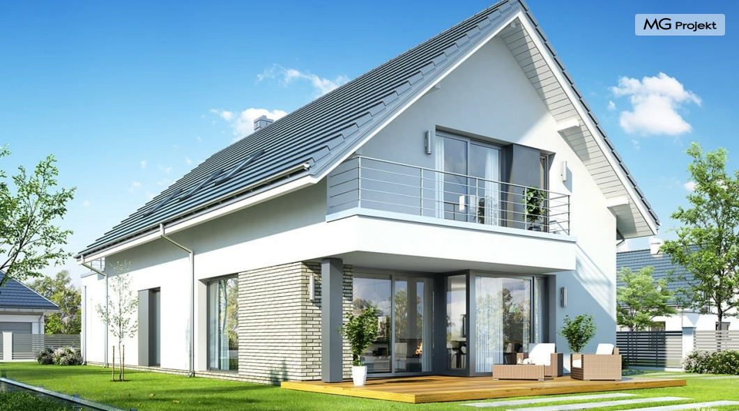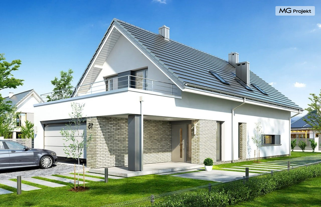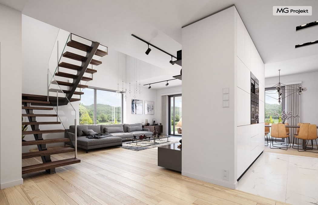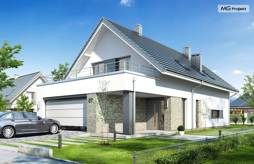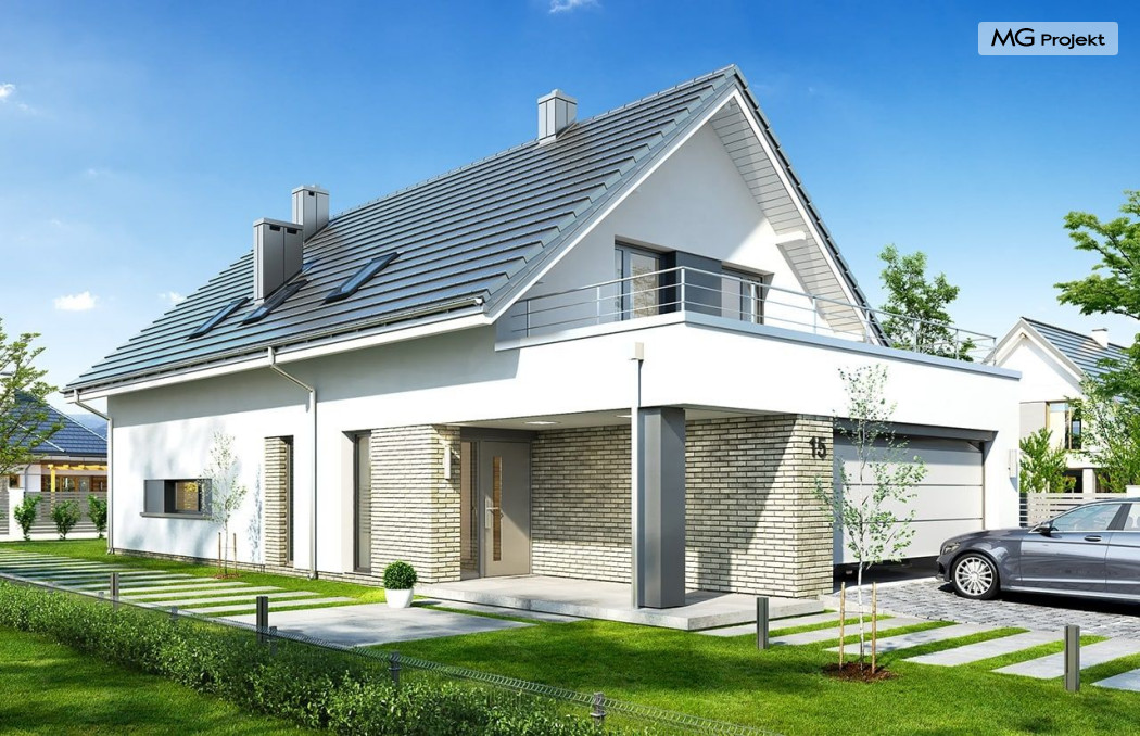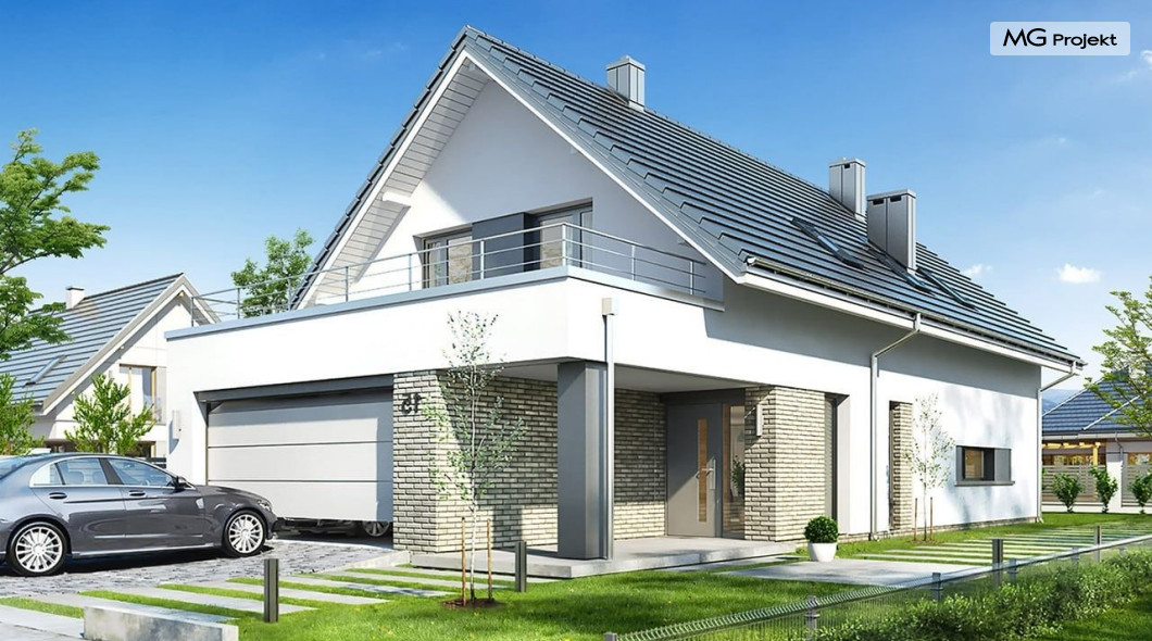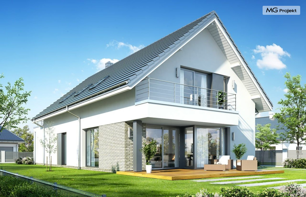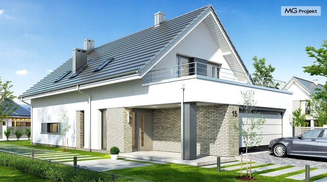 Projekt domu Salsa to jeden z projektów z serii domów wywodzących się z projektu „Party”. Salsa to dom jednorodzinny przeznaczony dla cztero-sześcioosobowej rodziny. Dom parterowy z poddaszem użytkowym, o prostej bryle przykrytej dwuspadowym dachem, z wystającą nieco poza główną bryłę parterową częścią garażu. Projekt przeznaczony jest na wąską działkę, która nie pozwala na budowę budynku o szerokiej elewacji frontowej. Minimalna szerokość działki to 16,9 metrów, ale zamieniając w jednej z bocznych elewacji okna na luksfery możemy posadowić dom na działce o szerokości poniżej 16-tu metrów (nawet na działce o szerokości 14,6 m - jeśli jest zgoda na zbliżenie się ścianą bez okien na 1,5 m od granicy). Prosta spokojna bryła domu połączona z nowoczesną formą i zastosowanymi materiałami daje atrakcyjną sylwetkę „Salsy”. Front domu ozdabia duży podcień wejściowy, z reprezentacyjnymi drzwiami. Od strony ogrodu mamy z kolei częściowo zadaszony taras, piękne przeszklone otwarcie przestrzeni dziennej na ogród, oraz taras –balkon poddasza. Nowoczesna stonowana kolorystyka domu pozwoli „Salsie” właściwie wkomponować się w dowolne sąsiedztwo. Wnętrze domu zaprojektowano sytuując garaż obok wejścia, od frontu. Z sieni przechodzimy szerokimi szklanymi drzwiami do holu. Hol ma bardzo poręczną wnękę z dużą szafą przy przedsionku. Z holu otwiera się nam piękny widok na salon z pustką nad częścią jego powierzchni i nad schodami będącymi ozdobą wnętrza. Obok mamy bardzo praktyczną kuchnią typu „wagon”, oraz przestronny aneks jadalny. Salon i jadalnia łączą się przeszklonymi drzwiami z tarasem i ogrodem. Z holu możemy dostać się jeszcze do dodatkowego pokoju (np. gabinet), oraz wc. Na poddaszu mamy piękny holl - antresolę, widoczną z salonu na dole. Antresola stanowi most łączący apartament rodziców (z sypialnią, bardzo ładną garderobą, łazienką i balkonem-tarasem ogrodowym), z częścią poddasza przeznaczoną na dwie sypialnie dzieci, łazienkę i pralnię. Sypialnie dziecięce również mają wyjście na drugi balkon-taras. Dom ma prostą bryłę, nowoczesną architekturę, piękne wnętrze z pustką nad salonem - no i przede wszystkim jest to doskonały projekt na wąską działkę. Do tego projekt domu Salsa ma prostą konstrukcję - będzie niedrogi w budowie i późniejszym utrzymaniu. Wąska działka nie musi być wcale wadą - wystarczy zdecydować się na właściwy projekt - oczywiście najlepsza jest Salsa :) Zapraszamy do zapoznania się z całą serią "roztańczonych domów": https://www.mgprojekt.com.pl/makarena, https://www.mgprojekt.com.pl/bolero, https://www.mgprojekt.com.pl/lambada, https://www.mgprojekt.com.pl/party, https://www.mgprojekt.com.pl/party-2, https://www.mgprojekt.com.pl/biba, https://www.mgprojekt.com.pl/tango, https://www.mgprojekt.com.pl/salsa, https://www.mgprojekt.com.pl/rumba, https://www.mgprojekt.com.pl/mambo, https://www.mgprojekt.com.pl/mambo, https://www.mgprojekt.com.pl/fokstrot, https://www.mgprojekt.com.pl/samba.