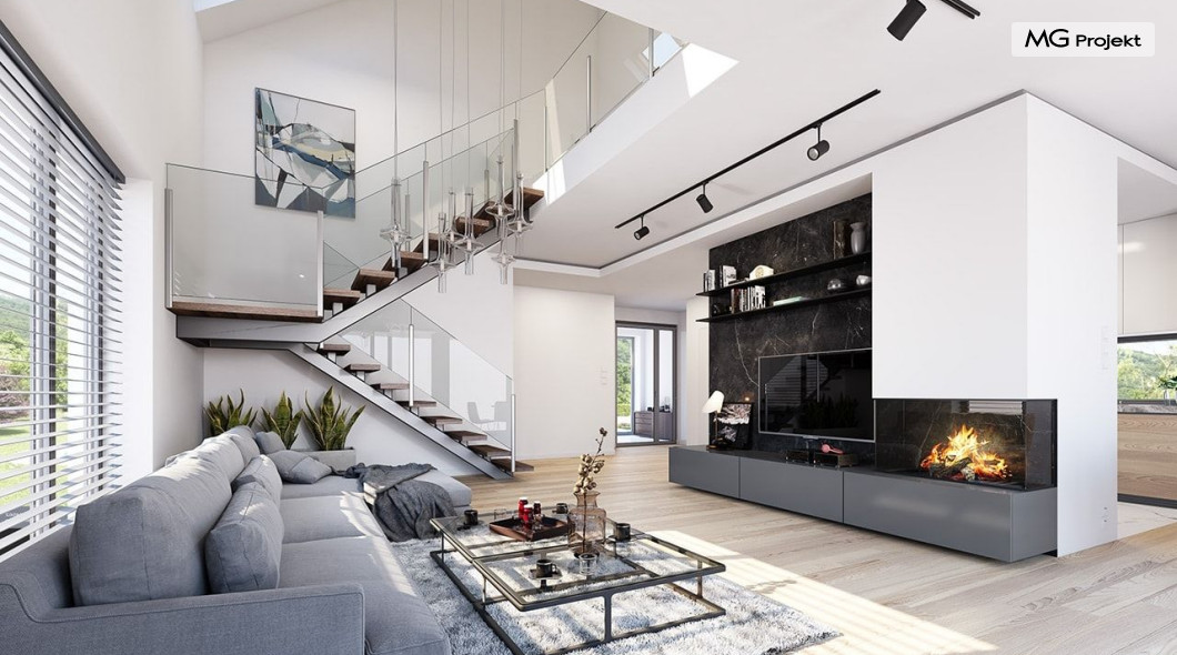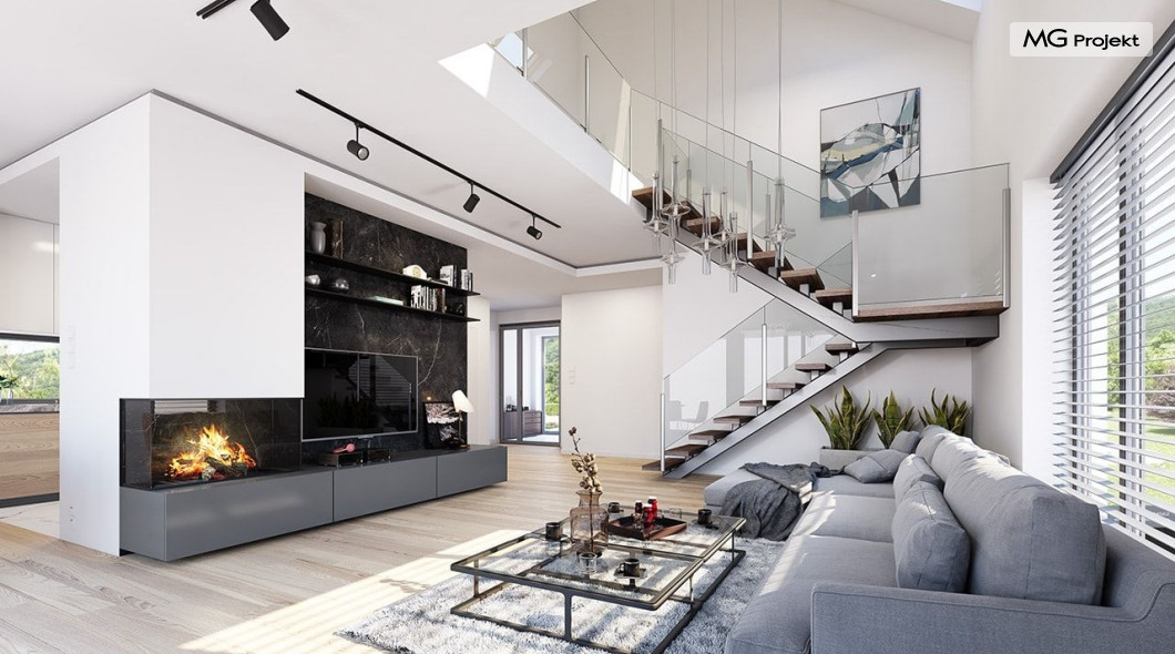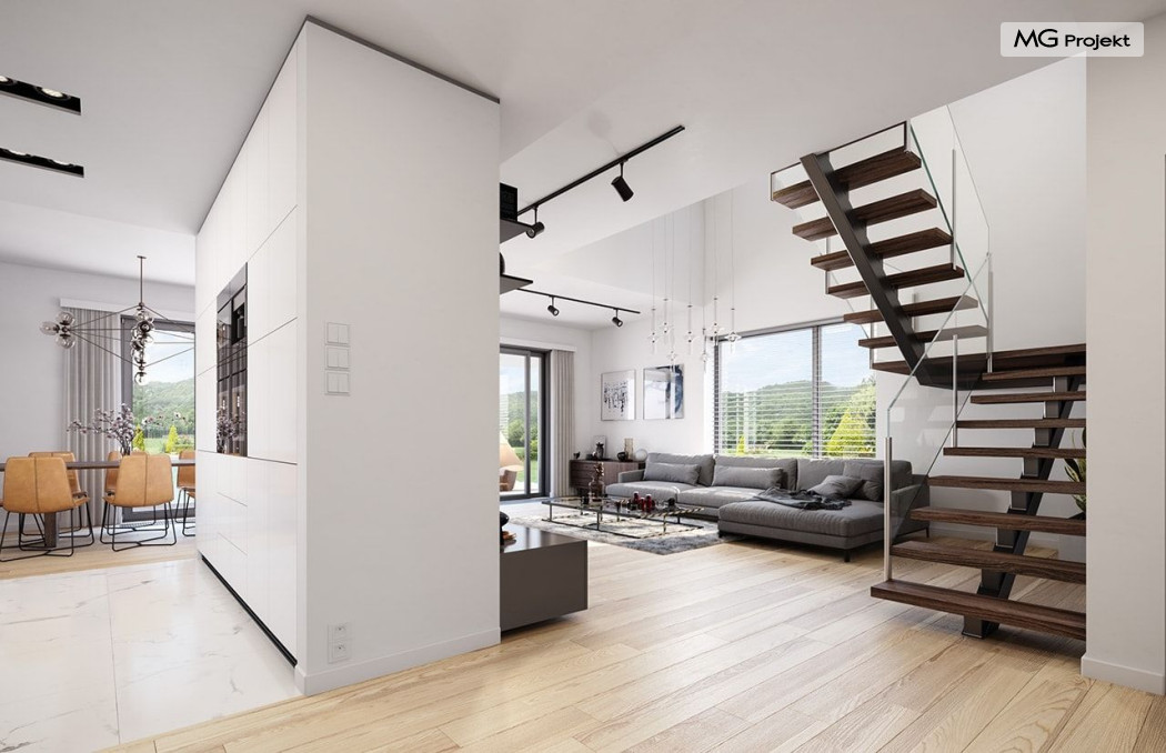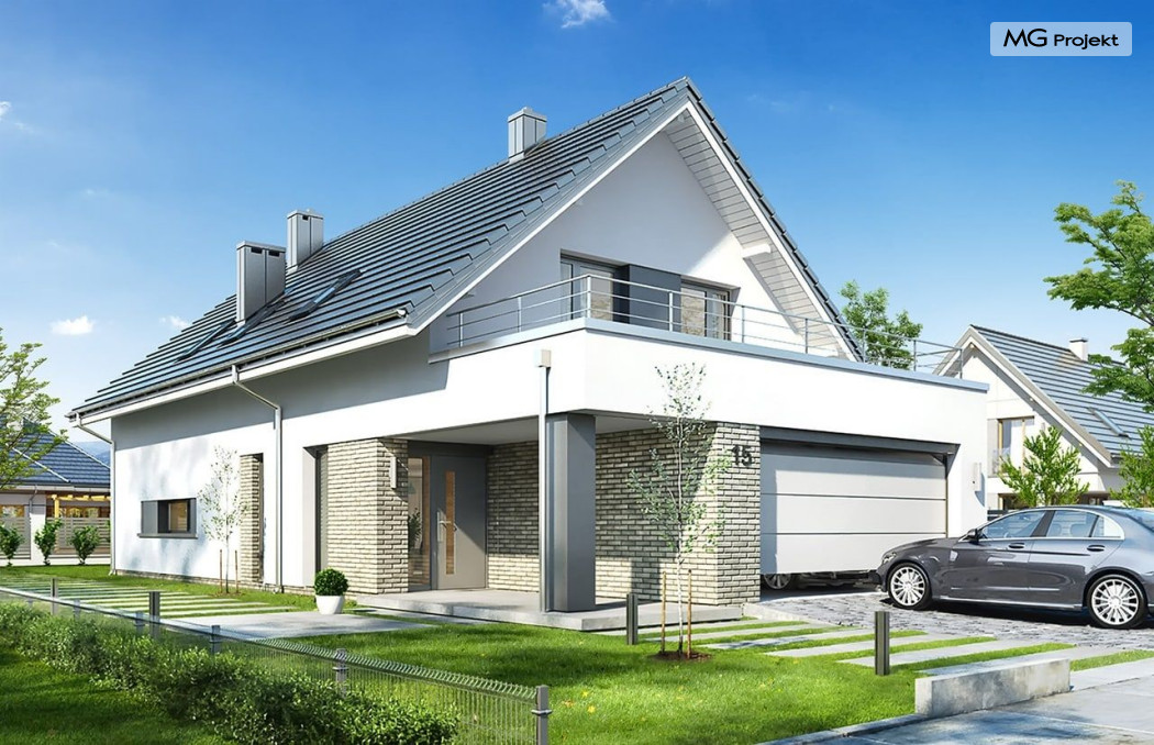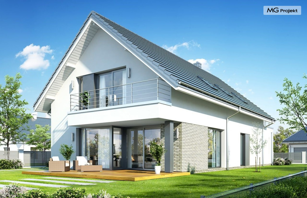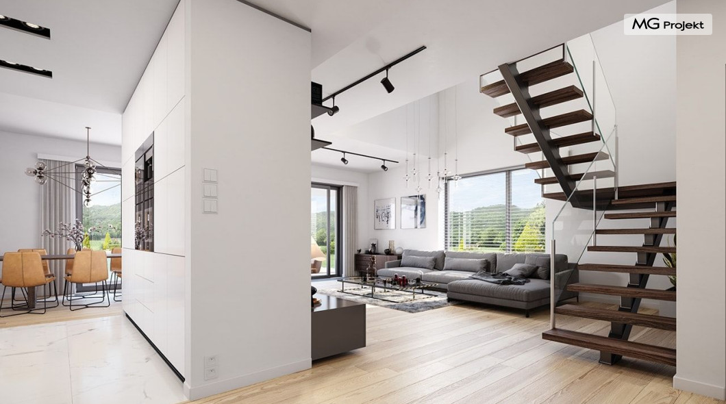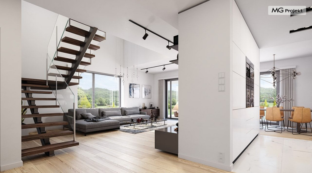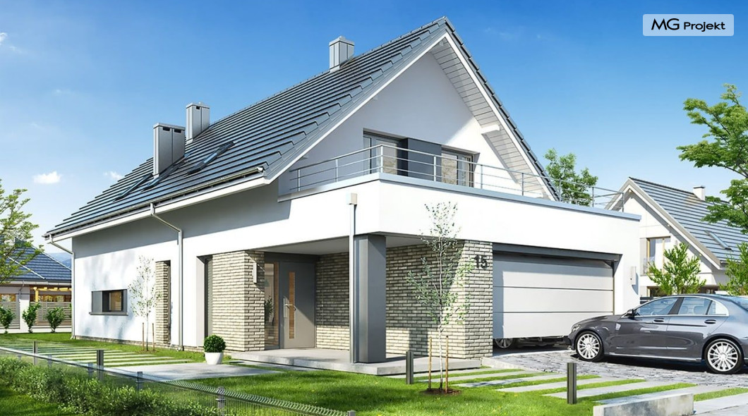 Projekt domu Salsa to jeden z projektów z serii domów wywodzących się z projektu „Party”. Salsa to dom jednorodzinny przeznaczony dla cztero-sześcioosobowej rodziny. Dom parterowy z poddaszem użytkowym, o prostej bryle przykrytej dwuspadowym dachem, z wystającą nieco poza główną bryłę parterową częścią garażu. Projekt przeznaczony jest na wąską działkę, która nie pozwala na budowę budynku o szerokiej elewacji frontowej. Minimalna szerokość działki to 16,9 metrów, ale zamieniając w jednej z bocznych elewacji okna na luksfery możemy posadowić dom na działce o szerokości poniżej 16-tu metrów (nawet na działce o szerokości 14,6 m - jeśli jest zgoda na zbliżenie się ścianą bez okien na 1,5 m od granicy). Prosta spokojna bryła domu połączona z nowoczesną formą i zastosowanymi materiałami daje atrakcyjną sylwetkę „Salsy”. Front domu ozdabia duży podcień wejściowy, z reprezentacyjnymi drzwiami. Od strony ogrodu mamy z kolei częściowo zadaszony taras, piękne przeszklone otwarcie przestrzeni dziennej na ogród, oraz taras –balkon poddasza. Nowoczesna stonowana kolorystyka domu pozwoli „Salsie” właściwie wkomponować się w dowolne sąsiedztwo. Wnętrze domu zaprojektowano sytuując garaż obok wejścia, od frontu. Z sieni przechodzimy szerokimi szklanymi drzwiami do holu. Hol ma bardzo poręczną wnękę z dużą szafą przy przedsionku. Z holu otwiera się nam piękny widok na salon z pustką nad częścią jego powierzchni i nad schodami będącymi ozdobą wnętrza. Obok mamy bardzo praktyczną kuchnią typu „wagon”, oraz przestronny aneks jadalny. Salon i jadalnia łączą się przeszklonymi drzwiami z tarasem i ogrodem. Z holu możemy dostać się jeszcze do dodatkowego pokoju (np. gabinet), oraz wc. Na poddaszu mamy piękny holl - antresolę, widoczną z salonu na dole. Antresola stanowi most łączący apartament rodziców (z sypialnią, bardzo ładną garderobą, łazienką i balkonem-tarasem ogrodowym), z częścią poddasza przeznaczoną na dwie sypialnie dzieci, łazienkę i pralnię. Sypialnie dziecięce również mają wyjście na drugi balkon-taras. Dom ma prostą bryłę, nowoczesną architekturę, piękne wnętrze z pustką nad salonem - no i przede wszystkim jest to doskonały projekt na wąską działkę. Do tego projekt domu Salsa ma prostą konstrukcję - będzie niedrogi w budowie i późniejszym utrzymaniu. Wąska działka nie musi być wcale wadą - wystarczy zdecydować się na właściwy projekt - oczywiście najlepsza jest Salsa :) Zapraszamy do zapoznania się z całą serią "roztańczonych domów": https://www.mgprojekt.com.pl/makarena, https://www.mgprojekt.com.pl/bolero, https://www.mgprojekt.com.pl/lambada, https://www.mgprojekt.com.pl/party, https://www.mgprojekt.com.pl/party-2, https://www.mgprojekt.com.pl/biba, https://www.mgprojekt.com.pl/tango, https://www.mgprojekt.com.pl/salsa, https://www.mgprojekt.com.pl/rumba, https://www.mgprojekt.com.pl/mambo, https://www.mgprojekt.com.pl/mambo, https://www.mgprojekt.com.pl/fokstrot, https://www.mgprojekt.com.pl/samba.
