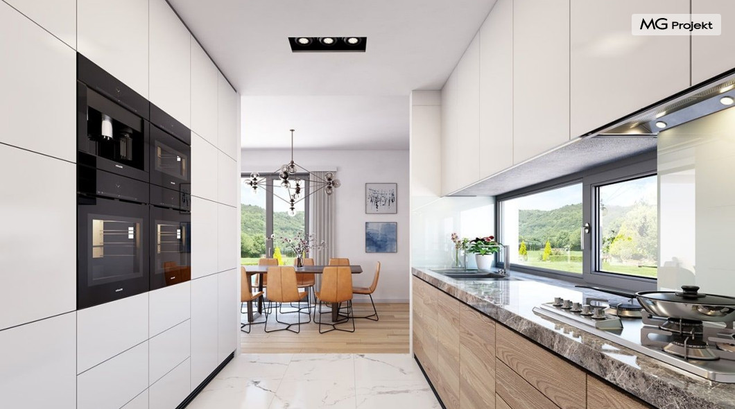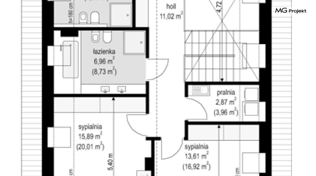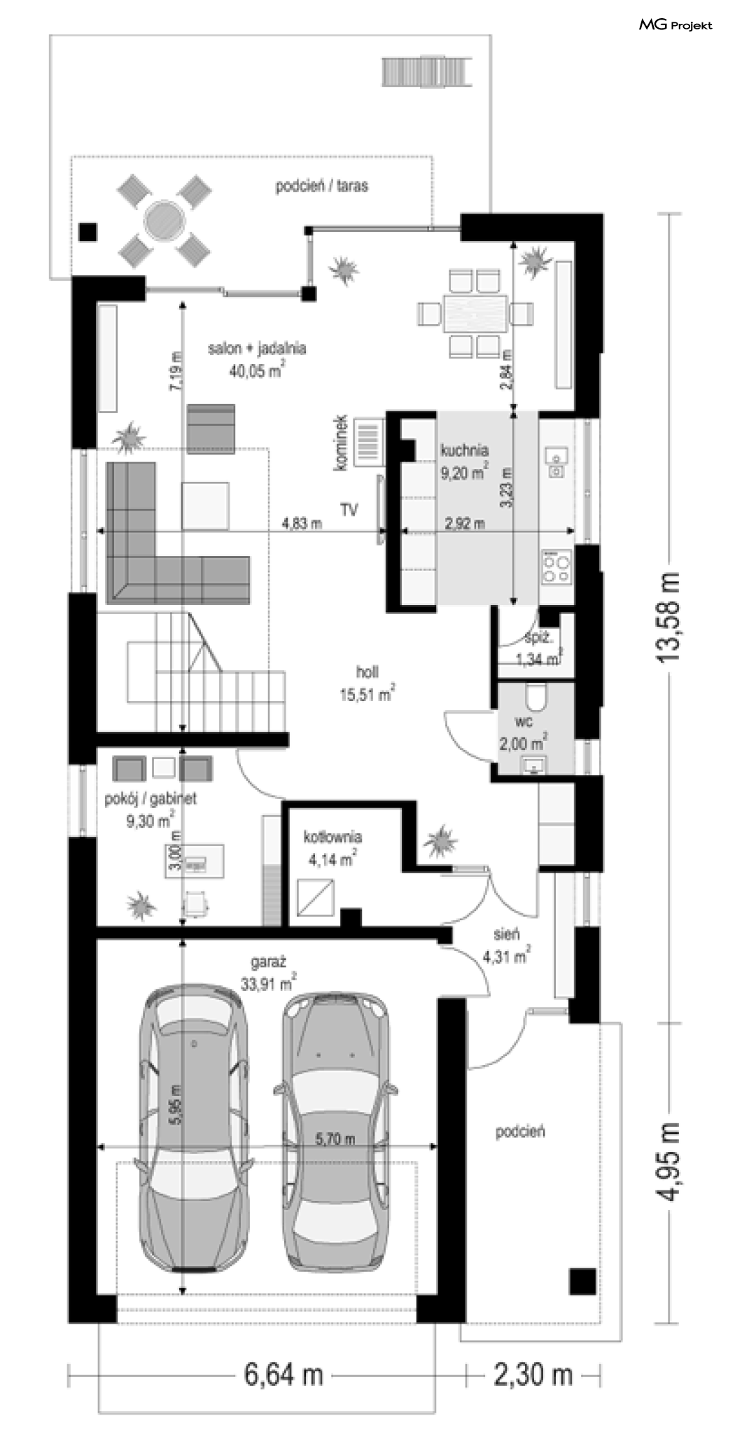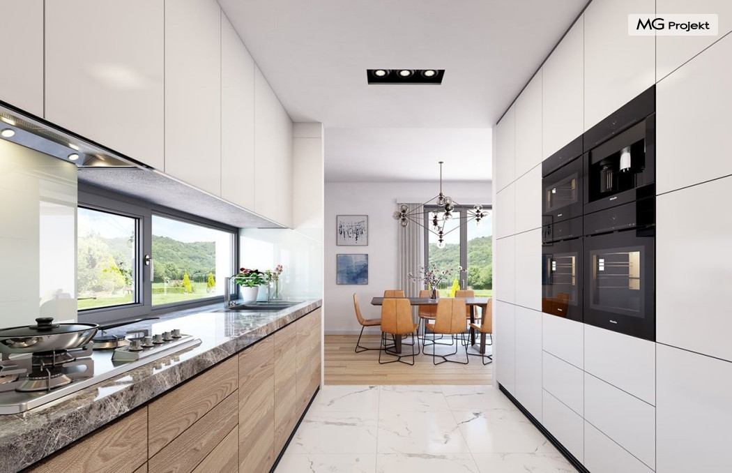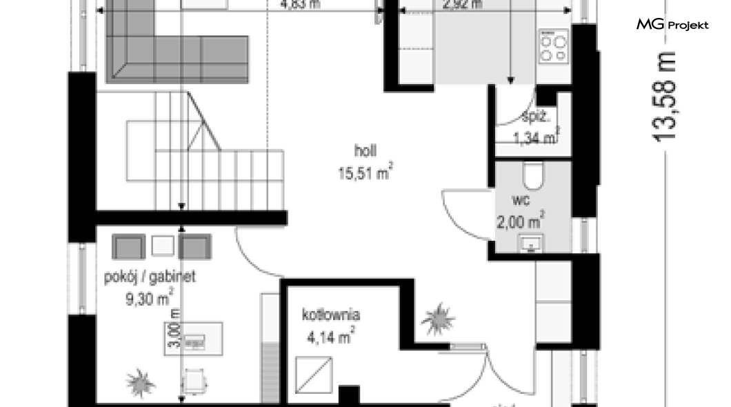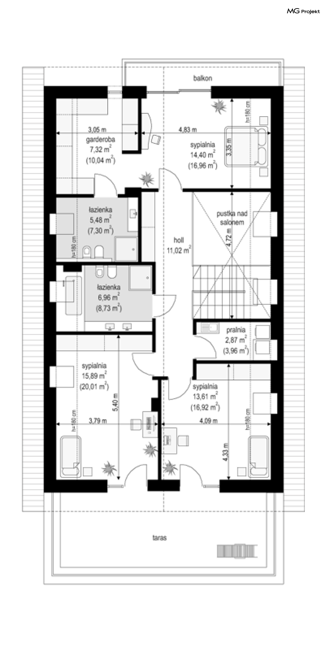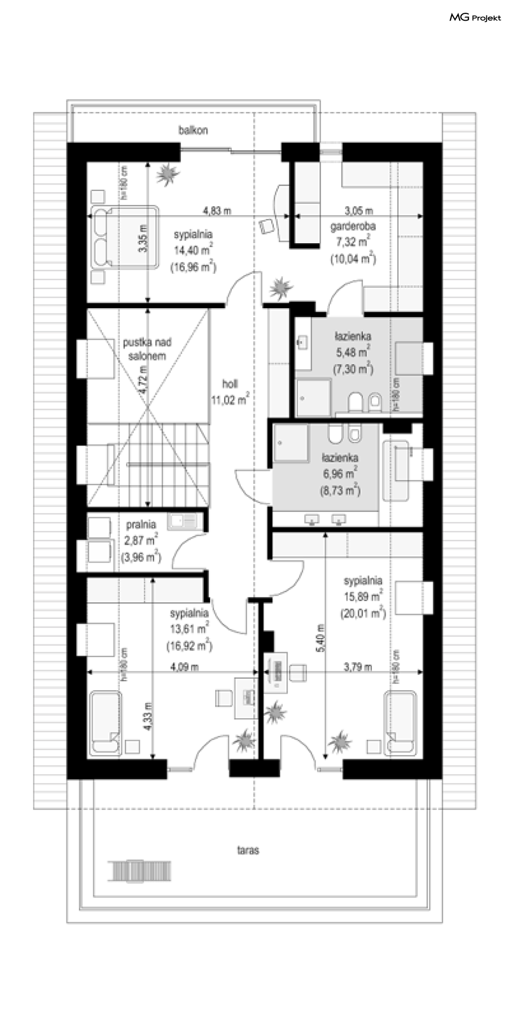 Projekt domu Salsa to jeden z projektów z serii domów wywodzących się z projektu „Party”. Salsa to dom jednorodzinny przeznaczony dla cztero-sześcioosobowej rodziny. Dom parterowy z poddaszem użytkowym, o prostej bryle przykrytej dwuspadowym dachem, z wystającą nieco poza główną bryłę parterową częścią garażu. Projekt przeznaczony jest na wąską działkę, która nie pozwala na budowę budynku o szerokiej elewacji frontowej. Minimalna szerokość działki to 16,9 metrów, ale zamieniając w jednej z bocznych elewacji okna na luksfery możemy posadowić dom na działce o szerokości poniżej 16-tu metrów (nawet na działce o szerokości 14,6 m - jeśli jest zgoda na zbliżenie się ścianą bez okien na 1,5 m od granicy). Prosta spokojna bryła domu połączona z nowoczesną formą i zastosowanymi materiałami daje atrakcyjną sylwetkę „Salsy”. Front domu ozdabia duży podcień wejściowy, z reprezentacyjnymi drzwiami. Od strony ogrodu mamy z kolei częściowo zadaszony taras, piękne przeszklone otwarcie przestrzeni dziennej na ogród, oraz taras –balkon poddasza. Nowoczesna stonowana kolorystyka domu pozwoli „Salsie” właściwie wkomponować się w dowolne sąsiedztwo. Wnętrze domu zaprojektowano sytuując garaż obok wejścia, od frontu. Z sieni przechodzimy szerokimi szklanymi drzwiami do holu. Hol ma bardzo poręczną wnękę z dużą szafą przy przedsionku. Z holu otwiera się nam piękny widok na salon z pustką nad częścią jego powierzchni i nad schodami będącymi ozdobą wnętrza. Obok mamy bardzo praktyczną kuchnią typu „wagon”, oraz przestronny aneks jadalny. Salon i jadalnia łączą się przeszklonymi drzwiami z tarasem i ogrodem. Z holu możemy dostać się jeszcze do dodatkowego pokoju (np. gabinet), oraz wc. Na poddaszu mamy piękny holl - antresolę, widoczną z salonu na dole. Antresola stanowi most łączący apartament rodziców (z sypialnią, bardzo ładną garderobą, łazienką i balkonem-tarasem ogrodowym), z częścią poddasza przeznaczoną na dwie sypialnie dzieci, łazienkę i pralnię. Sypialnie dziecięce również mają wyjście na drugi balkon-taras. Dom ma prostą bryłę, nowoczesną architekturę, piękne wnętrze z pustką nad salonem - no i przede wszystkim jest to doskonały projekt na wąską działkę. Do tego projekt domu Salsa ma prostą konstrukcję - będzie niedrogi w budowie i późniejszym utrzymaniu. Wąska działka nie musi być wcale wadą - wystarczy zdecydować się na właściwy projekt - oczywiście najlepsza jest Salsa :) Zapraszamy do zapoznania się z całą serią "roztańczonych domów": https://www.mgprojekt.com.pl/makarena, https://www.mgprojekt.com.pl/bolero, https://www.mgprojekt.com.pl/lambada, https://www.mgprojekt.com.pl/party, https://www.mgprojekt.com.pl/party-2, https://www.mgprojekt.com.pl/biba, https://www.mgprojekt.com.pl/tango, https://www.mgprojekt.com.pl/salsa, https://www.mgprojekt.com.pl/rumba, https://www.mgprojekt.com.pl/mambo, https://www.mgprojekt.com.pl/mambo, https://www.mgprojekt.com.pl/fokstrot, https://www.mgprojekt.com.pl/samba.