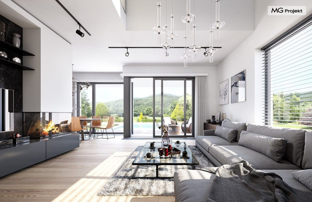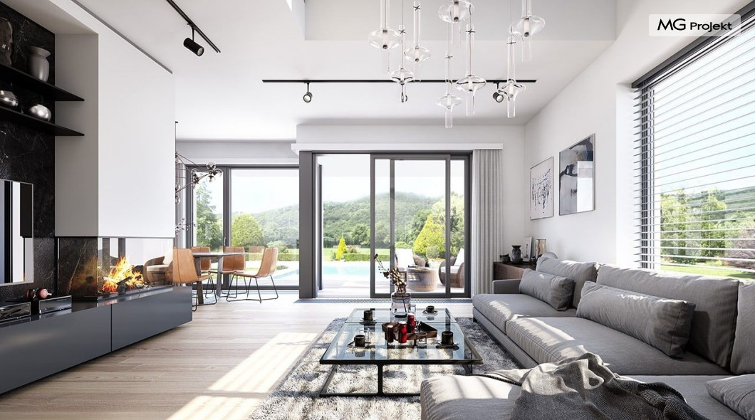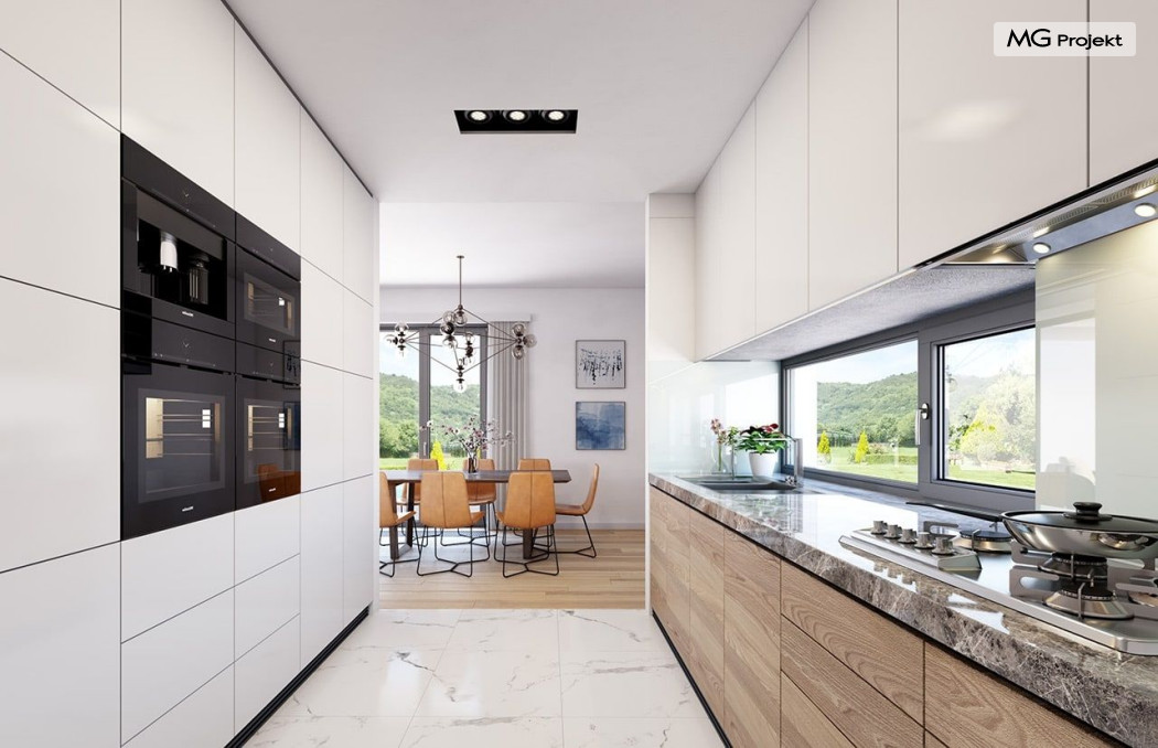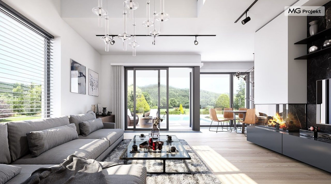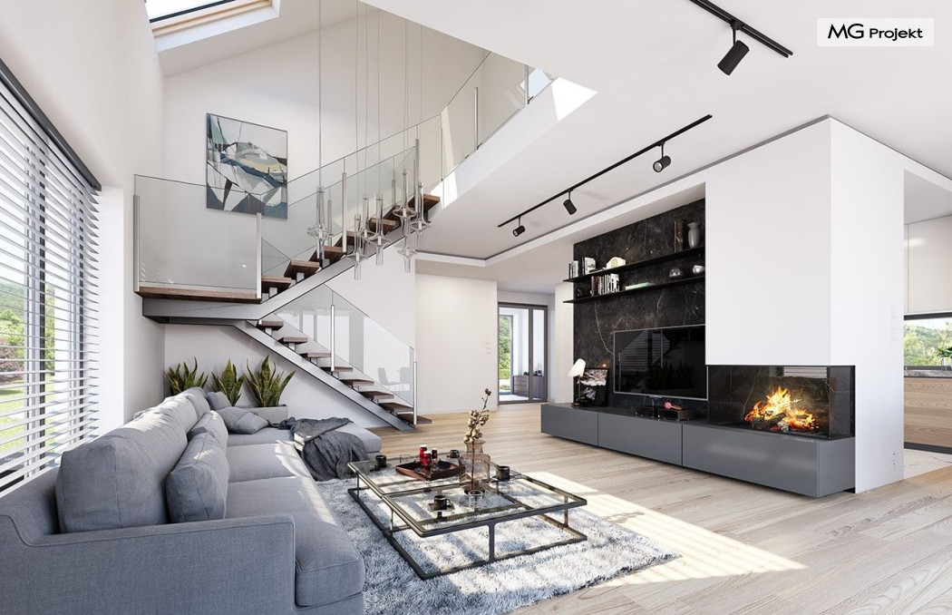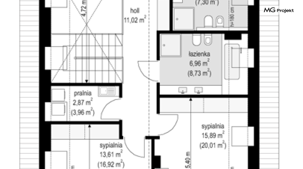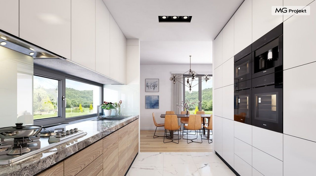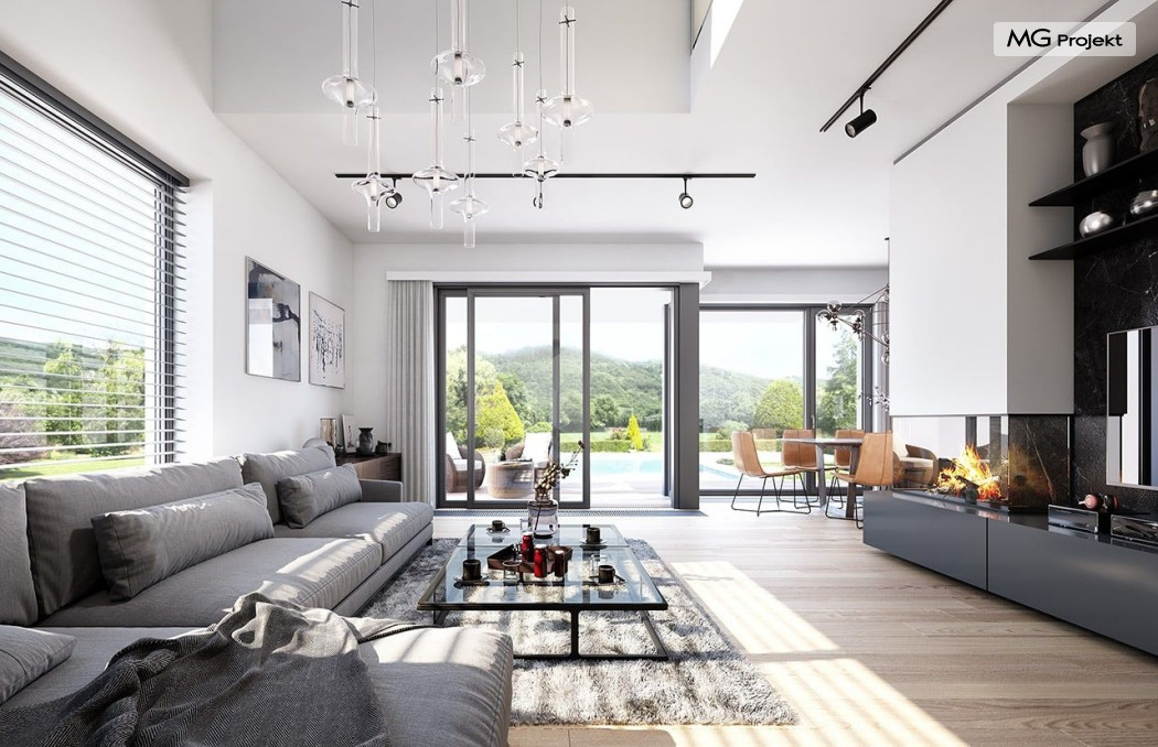 Projekt domu Salsa to jeden z projektów z serii domów wywodzących się z projektu „Party”. Salsa to dom jednorodzinny przeznaczony dla cztero-sześcioosobowej rodziny. Dom parterowy z poddaszem użytkowym, o prostej bryle przykrytej dwuspadowym dachem, z wystającą nieco poza główną bryłę parterową częścią garażu. Projekt przeznaczony jest na wąską działkę, która nie pozwala na budowę budynku o szerokiej elewacji frontowej. Minimalna szerokość działki to 16,9 metrów, ale zamieniając w jednej z bocznych elewacji okna na luksfery możemy posadowić dom na działce o szerokości poniżej 16-tu metrów (nawet na działce o szerokości 14,6 m - jeśli jest zgoda na zbliżenie się ścianą bez okien na 1,5 m od granicy). Prosta spokojna bryła domu połączona z nowoczesną formą i zastosowanymi materiałami daje atrakcyjną sylwetkę „Salsy”. Front domu ozdabia duży podcień wejściowy, z reprezentacyjnymi drzwiami. Od strony ogrodu mamy z kolei częściowo zadaszony taras, piękne przeszklone otwarcie przestrzeni dziennej na ogród, oraz taras –balkon poddasza. Nowoczesna stonowana kolorystyka domu pozwoli „Salsie” właściwie wkomponować się w dowolne sąsiedztwo. Wnętrze domu zaprojektowano sytuując garaż obok wejścia, od frontu. Z sieni przechodzimy szerokimi szklanymi drzwiami do holu. Hol ma bardzo poręczną wnękę z dużą szafą przy przedsionku. Z holu otwiera się nam piękny widok na salon z pustką nad częścią jego powierzchni i nad schodami będącymi ozdobą wnętrza. Obok mamy bardzo praktyczną kuchnią typu „wagon”, oraz przestronny aneks jadalny. Salon i jadalnia łączą się przeszklonymi drzwiami z tarasem i ogrodem. Z holu możemy dostać się jeszcze do dodatkowego pokoju (np. gabinet), oraz wc. Na poddaszu mamy piękny holl - antresolę, widoczną z salonu na dole. Antresola stanowi most łączący apartament rodziców (z sypialnią, bardzo ładną garderobą, łazienką i balkonem-tarasem ogrodowym), z częścią poddasza przeznaczoną na dwie sypialnie dzieci, łazienkę i pralnię. Sypialnie dziecięce również mają wyjście na drugi balkon-taras. Dom ma prostą bryłę, nowoczesną architekturę, piękne wnętrze z pustką nad salonem - no i przede wszystkim jest to doskonały projekt na wąską działkę. Do tego projekt domu Salsa ma prostą konstrukcję - będzie niedrogi w budowie i późniejszym utrzymaniu. Wąska działka nie musi być wcale wadą - wystarczy zdecydować się na właściwy projekt - oczywiście najlepsza jest Salsa :) Zapraszamy do zapoznania się z całą serią "roztańczonych domów": https://www.mgprojekt.com.pl/makarena, https://www.mgprojekt.com.pl/bolero, https://www.mgprojekt.com.pl/lambada, https://www.mgprojekt.com.pl/party, https://www.mgprojekt.com.pl/party-2, https://www.mgprojekt.com.pl/biba, https://www.mgprojekt.com.pl/tango, https://www.mgprojekt.com.pl/salsa, https://www.mgprojekt.com.pl/rumba, https://www.mgprojekt.com.pl/mambo, https://www.mgprojekt.com.pl/mambo, https://www.mgprojekt.com.pl/fokstrot, https://www.mgprojekt.com.pl/samba.